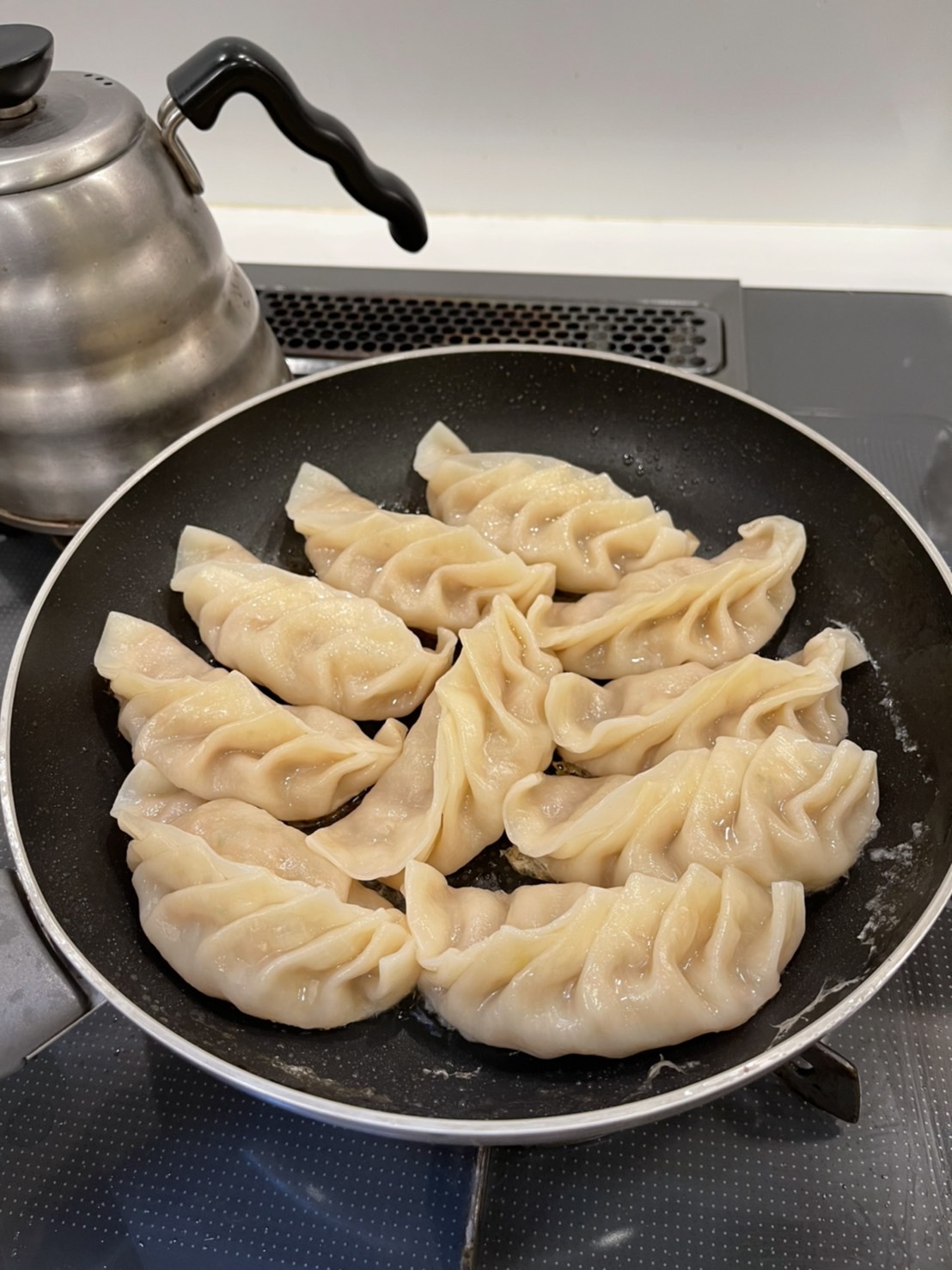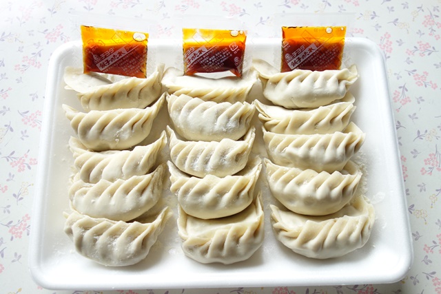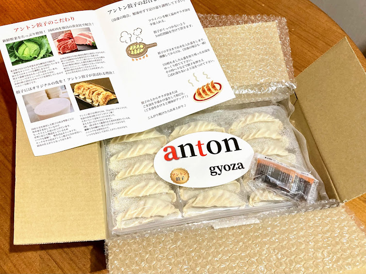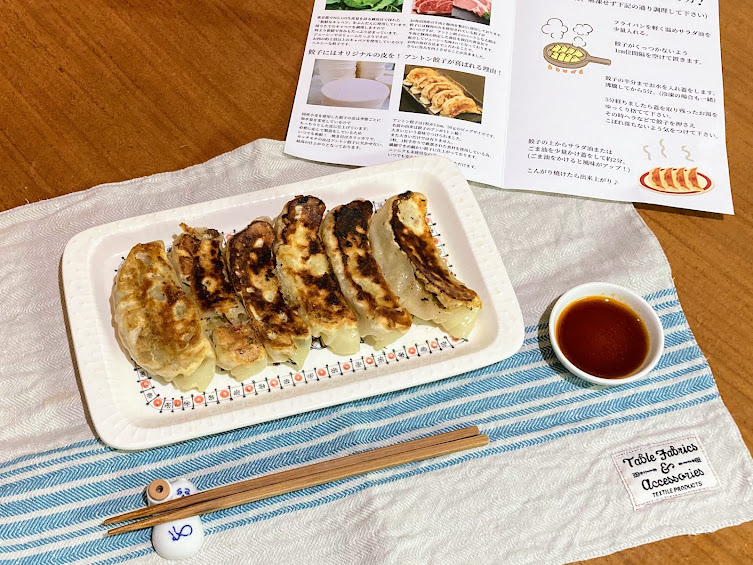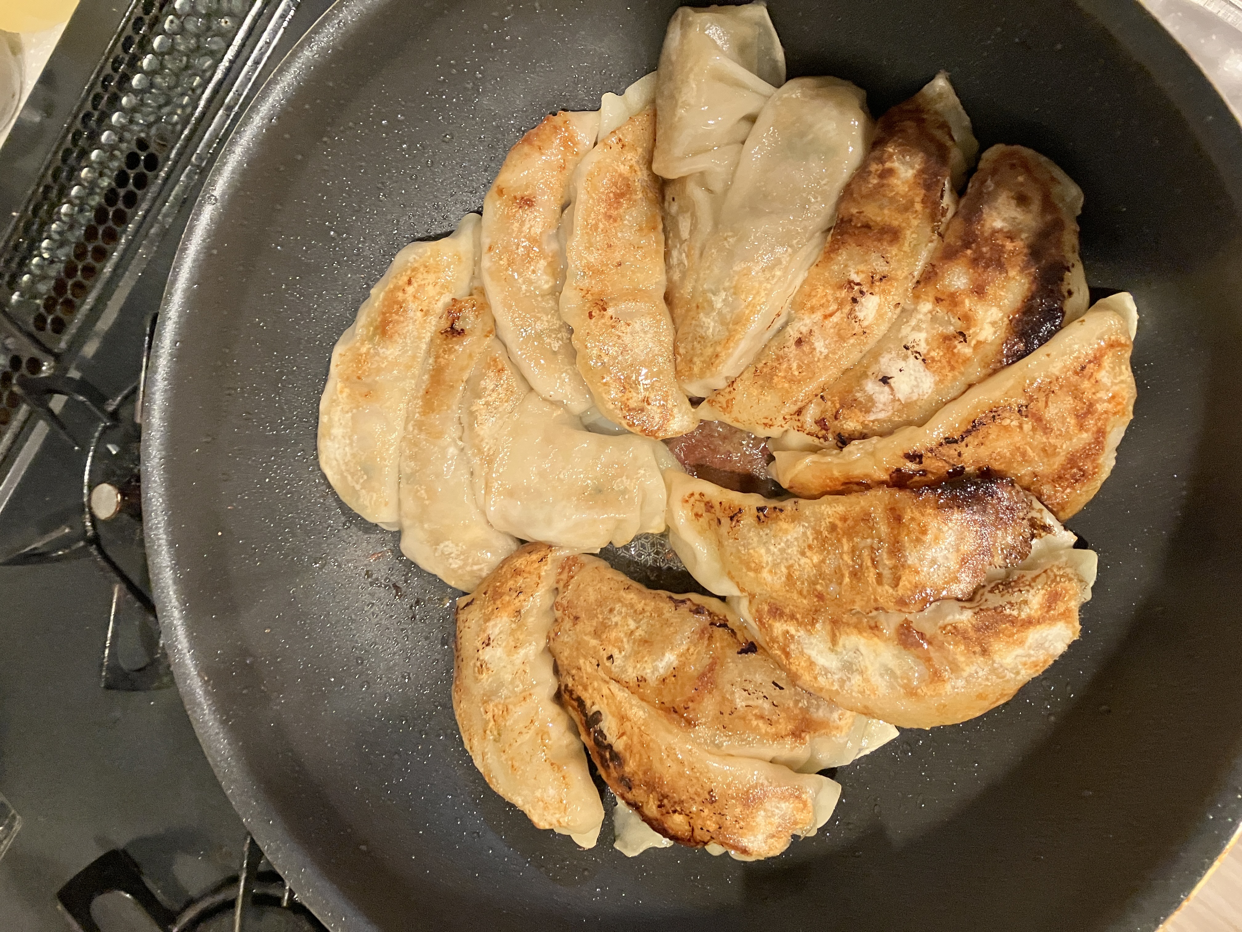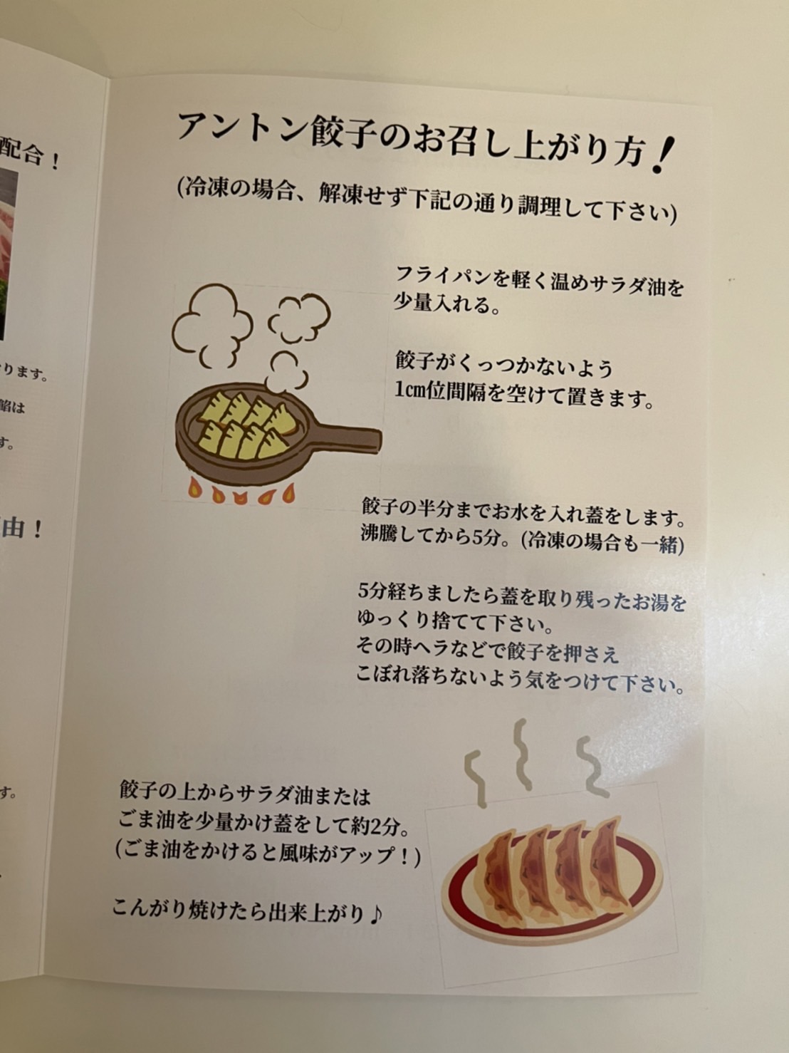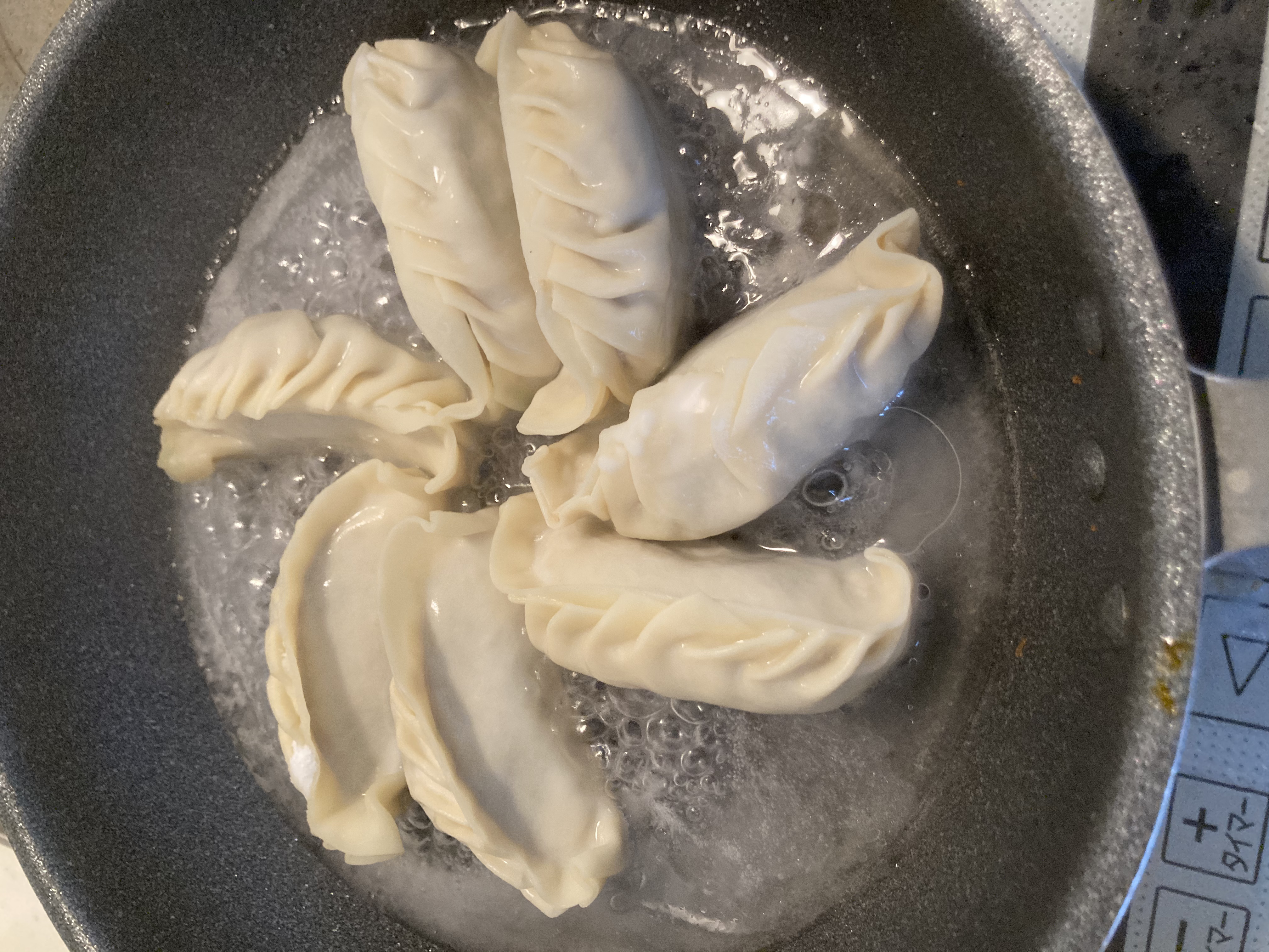 まずは鍋に油をすこし、冷凍されたままのアントン餃子を並べて、餃子の半分が浸るくらいの水を入れて加熱→湯を捨てて一気に焼き上げます。タレ付属だから、焼いたらすぐ食べられる!