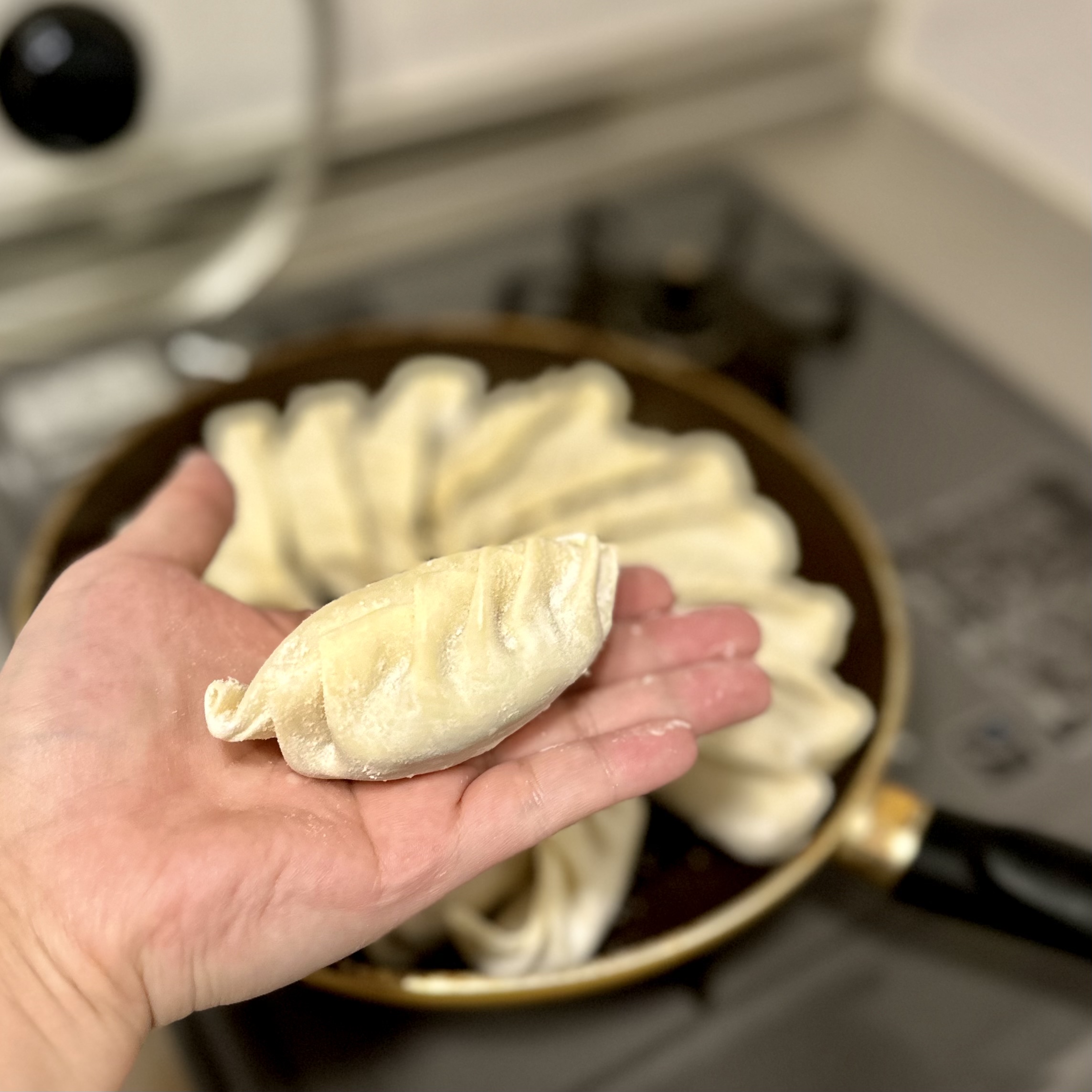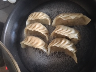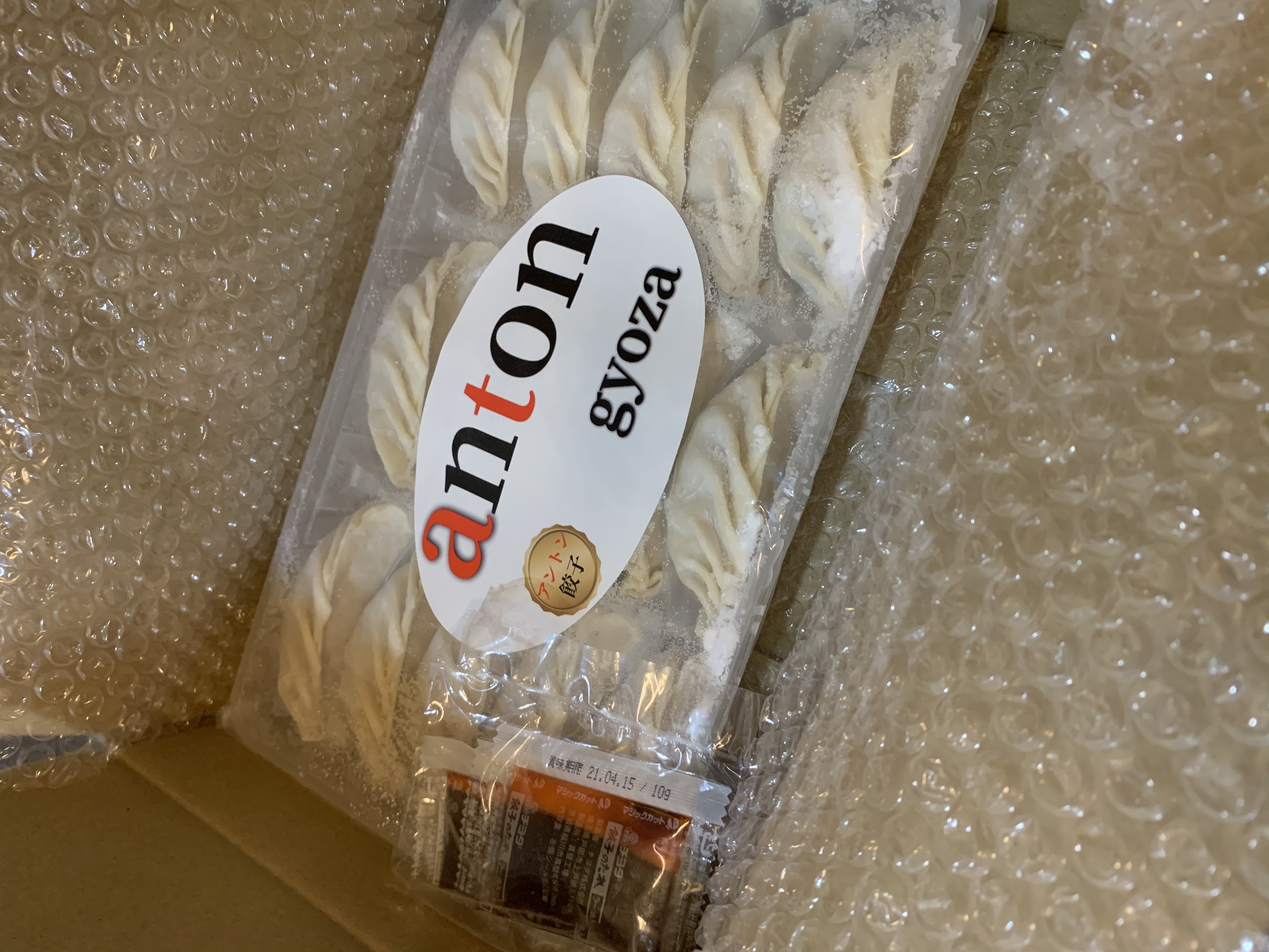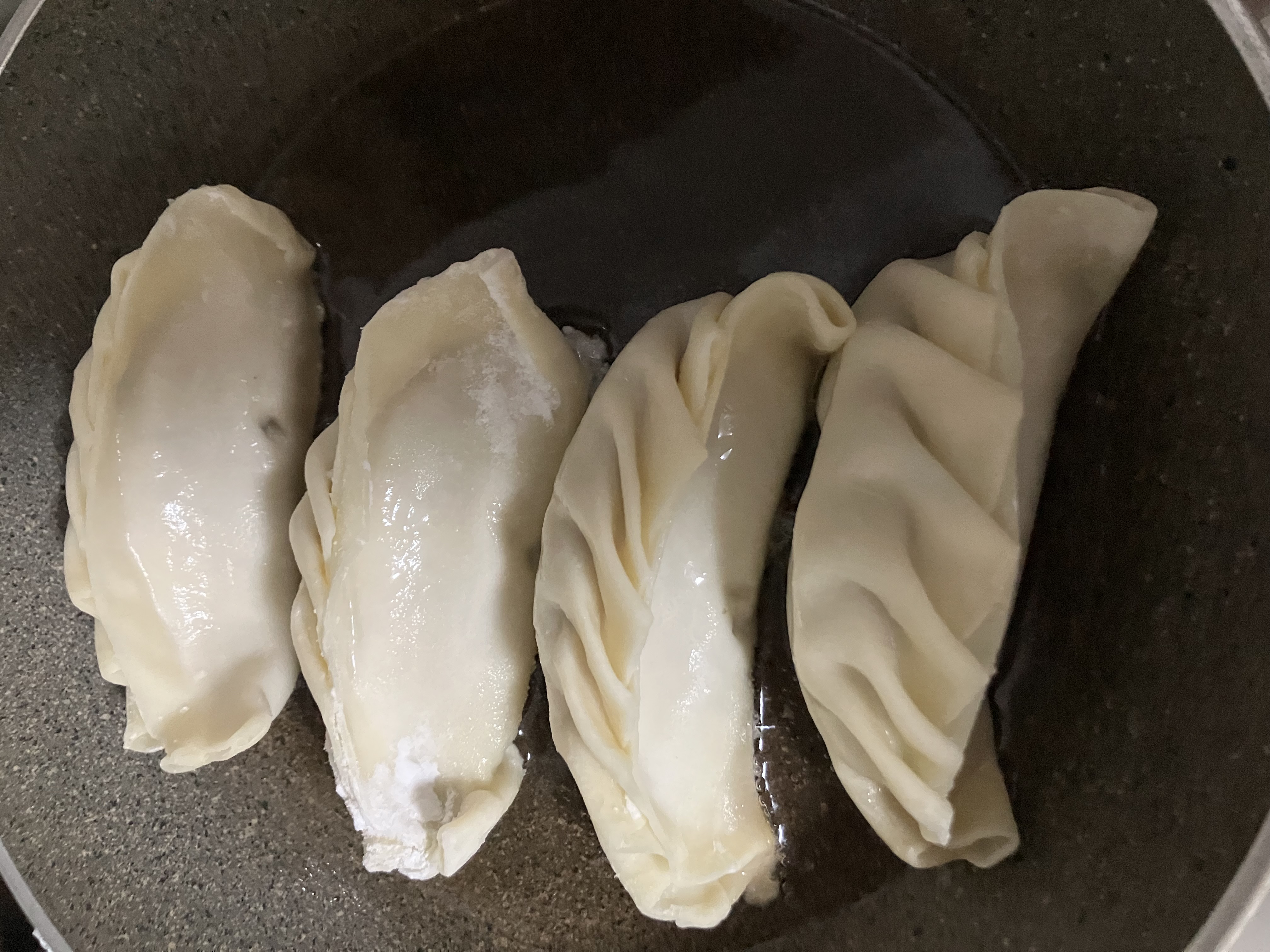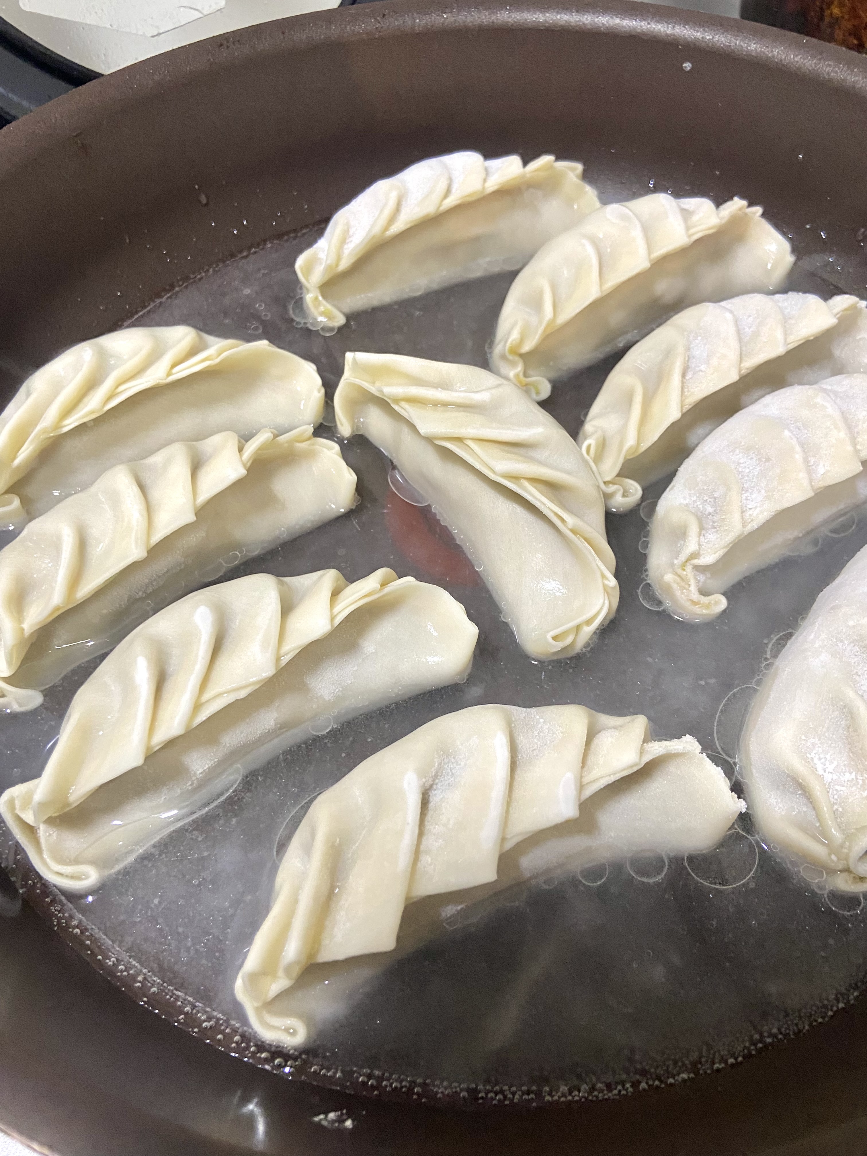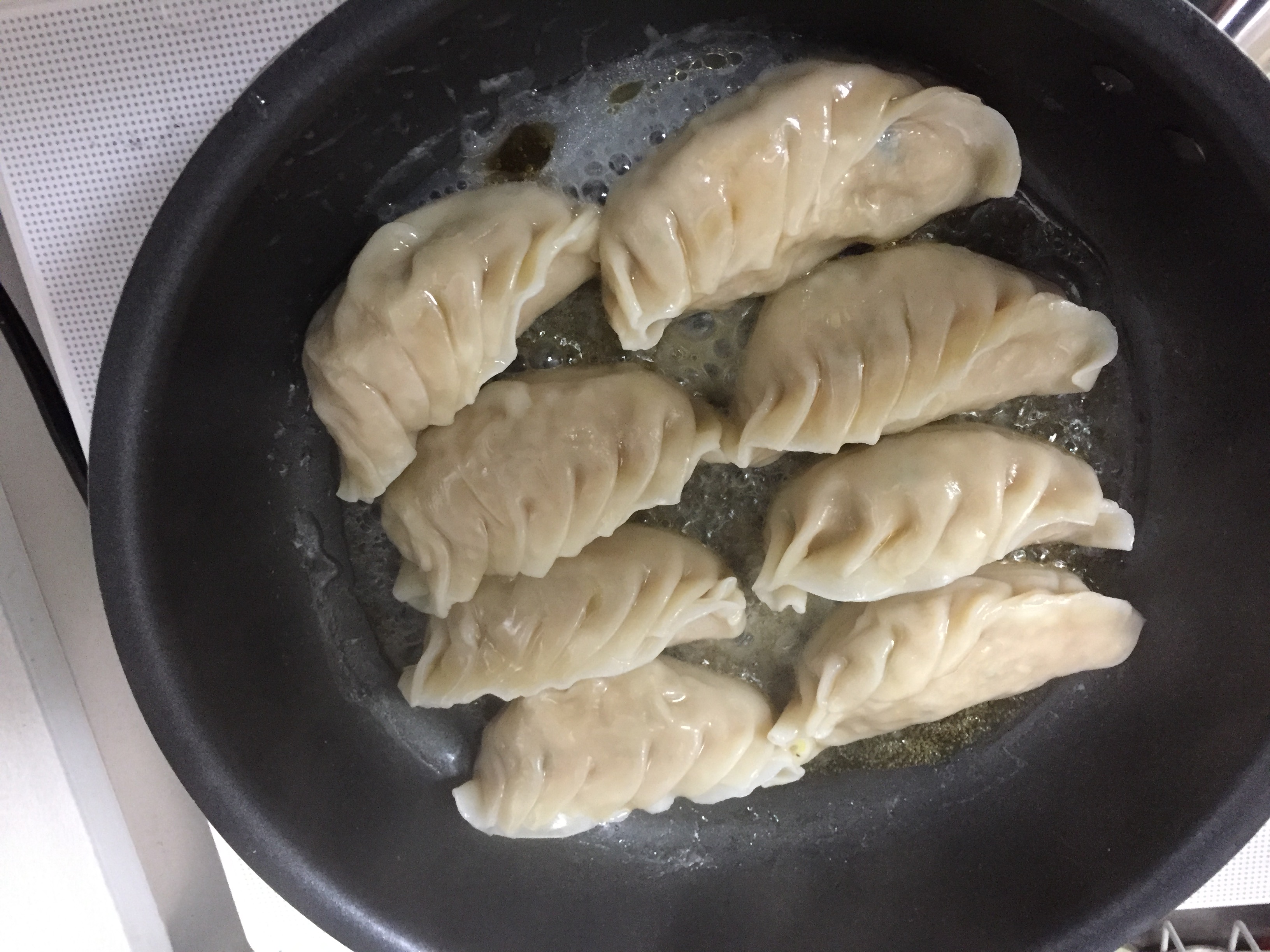 まずは鍋に油をすこし、冷凍されたままのアントン餃子を並べて、餃子の半分が浸るくらいの水を入れて加熱→湯を捨てて一気に焼き上げます。タレ付属だから、焼いたらすぐ食べられる!