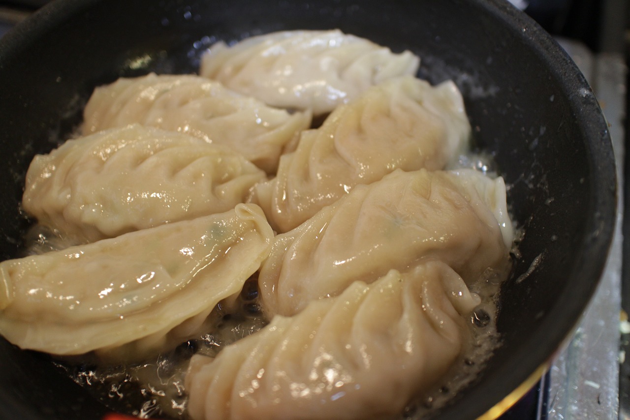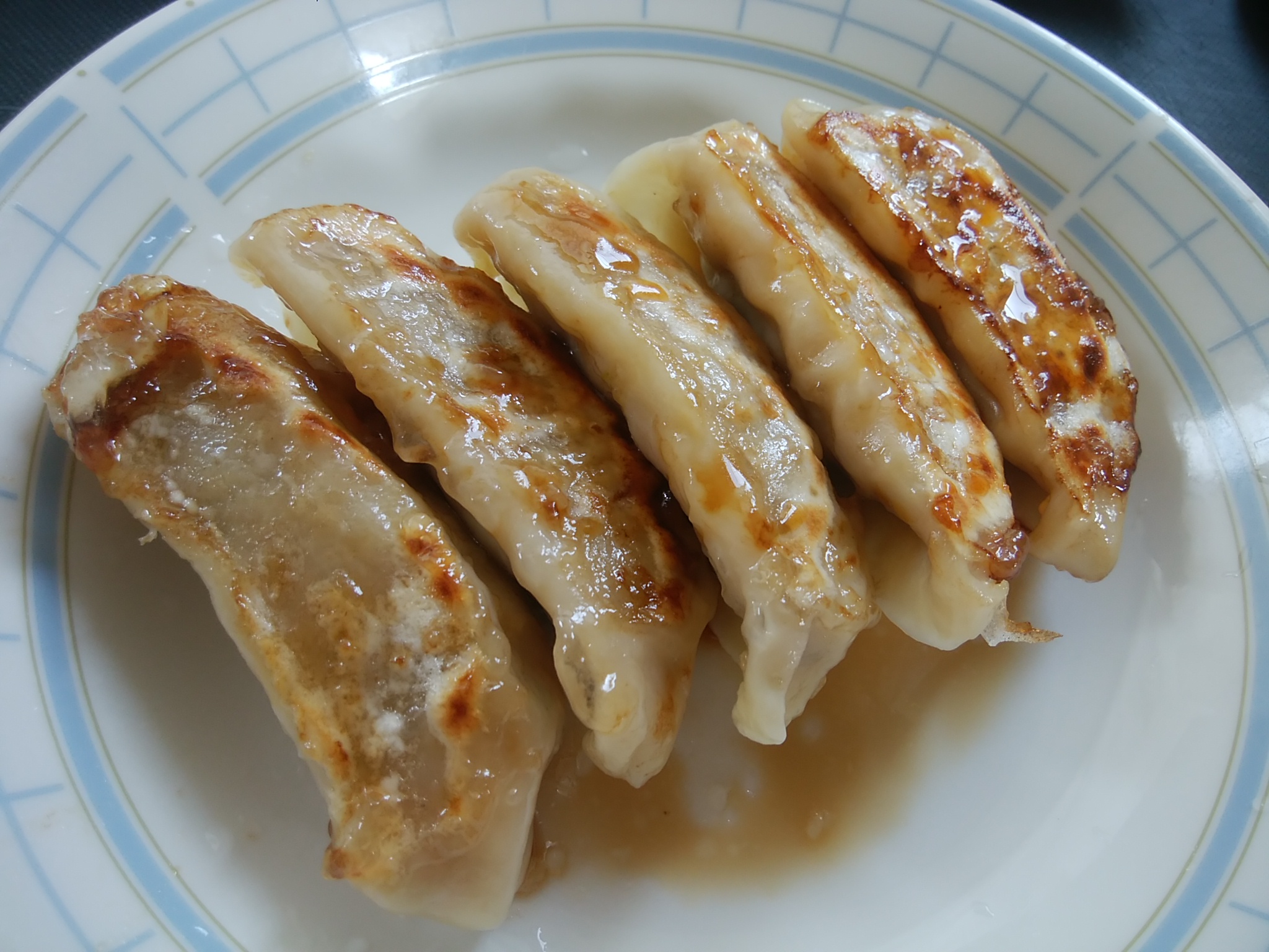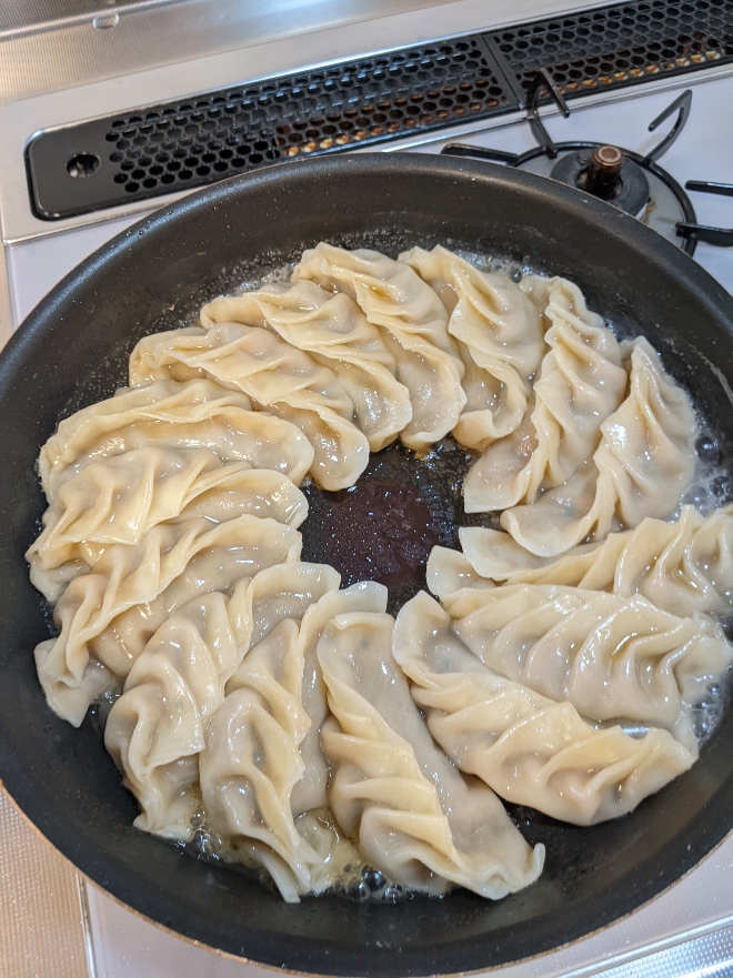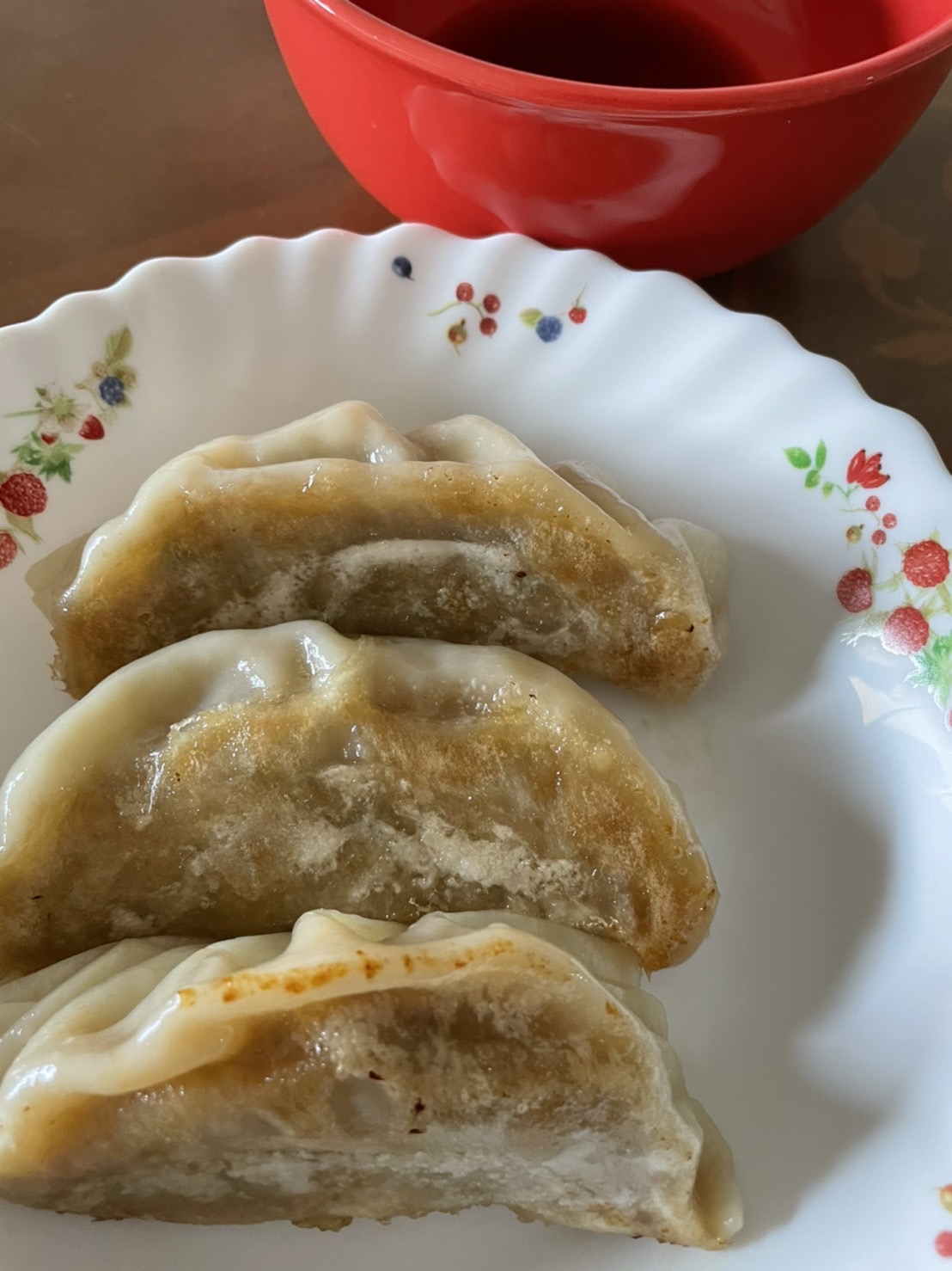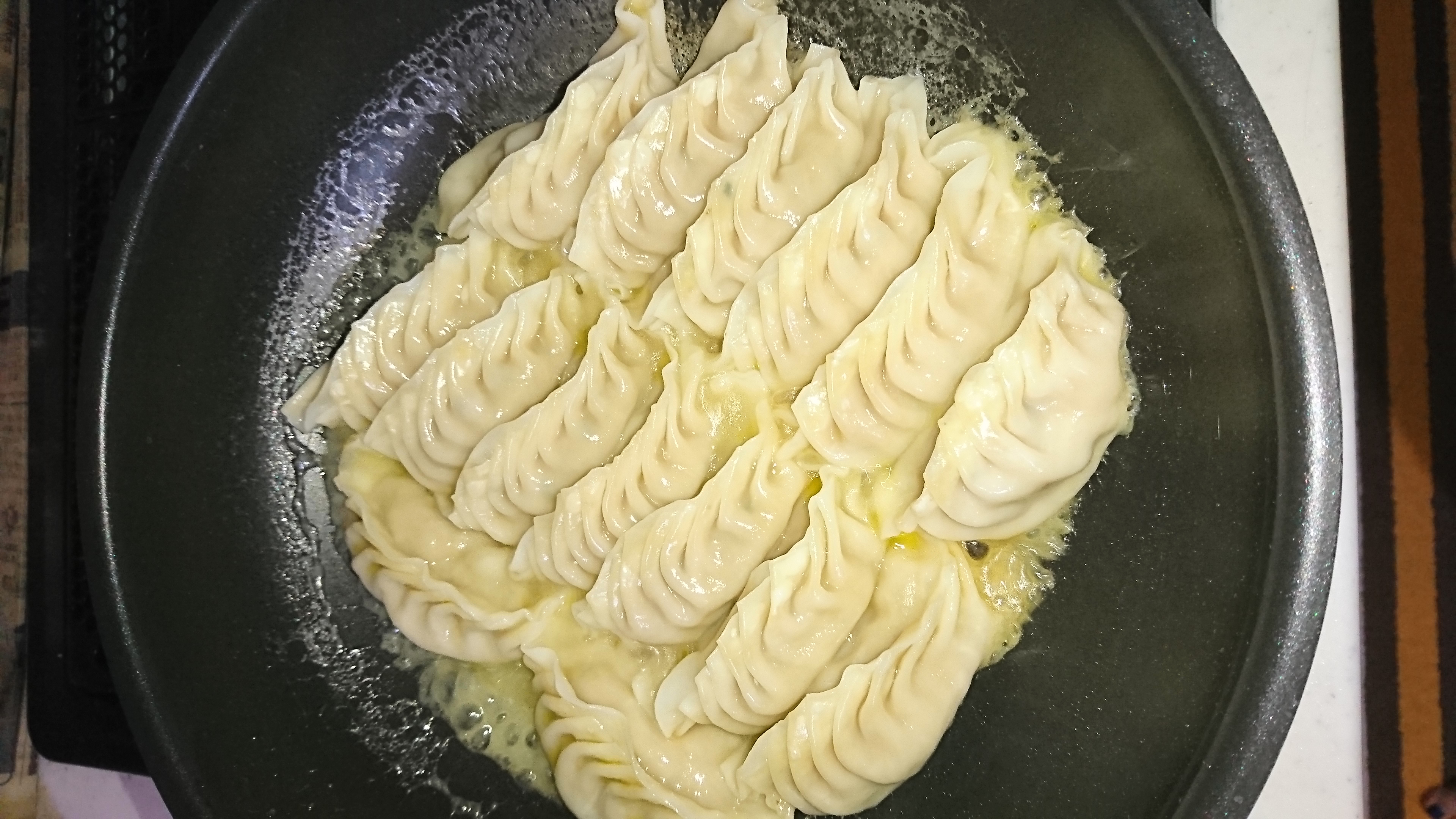 まずは鍋に油をすこし、冷凍されたままのアントン餃子を並べて、餃子の半分が浸るくらいの水を入れて加熱→湯を捨てて一気に焼き上げます。タレ付属だから、焼いたらすぐ食べられる!