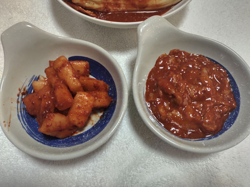 (サキイカ)→正直サキイカのキムチを食べた事が無かったのでどんな味わいなのかと恐る恐る食べてみました。特製ヤンニョムが良く絡んで、今回の他のキムチと比べて一番甘味を感じました。サキイカの旨みとヤンニョムの旨みの相乗効果で止まらない美味しさです。