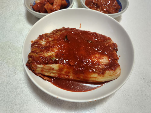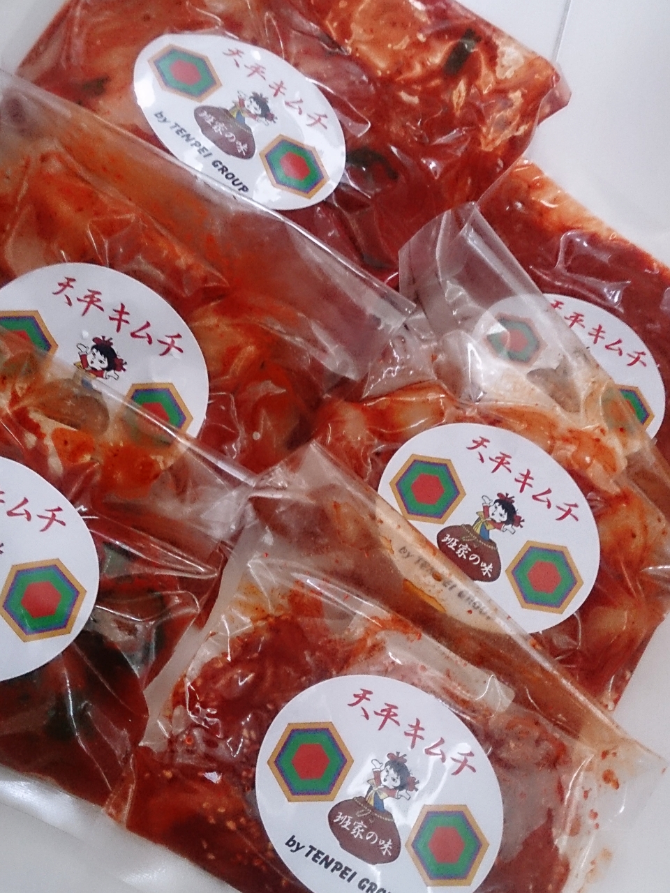 白菜キムチ→大きいので自分の好きなサイズにカットできる。辛さは少なく、スーパーで売っている市販のキムチとはいい意味で別物。