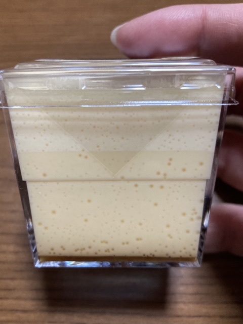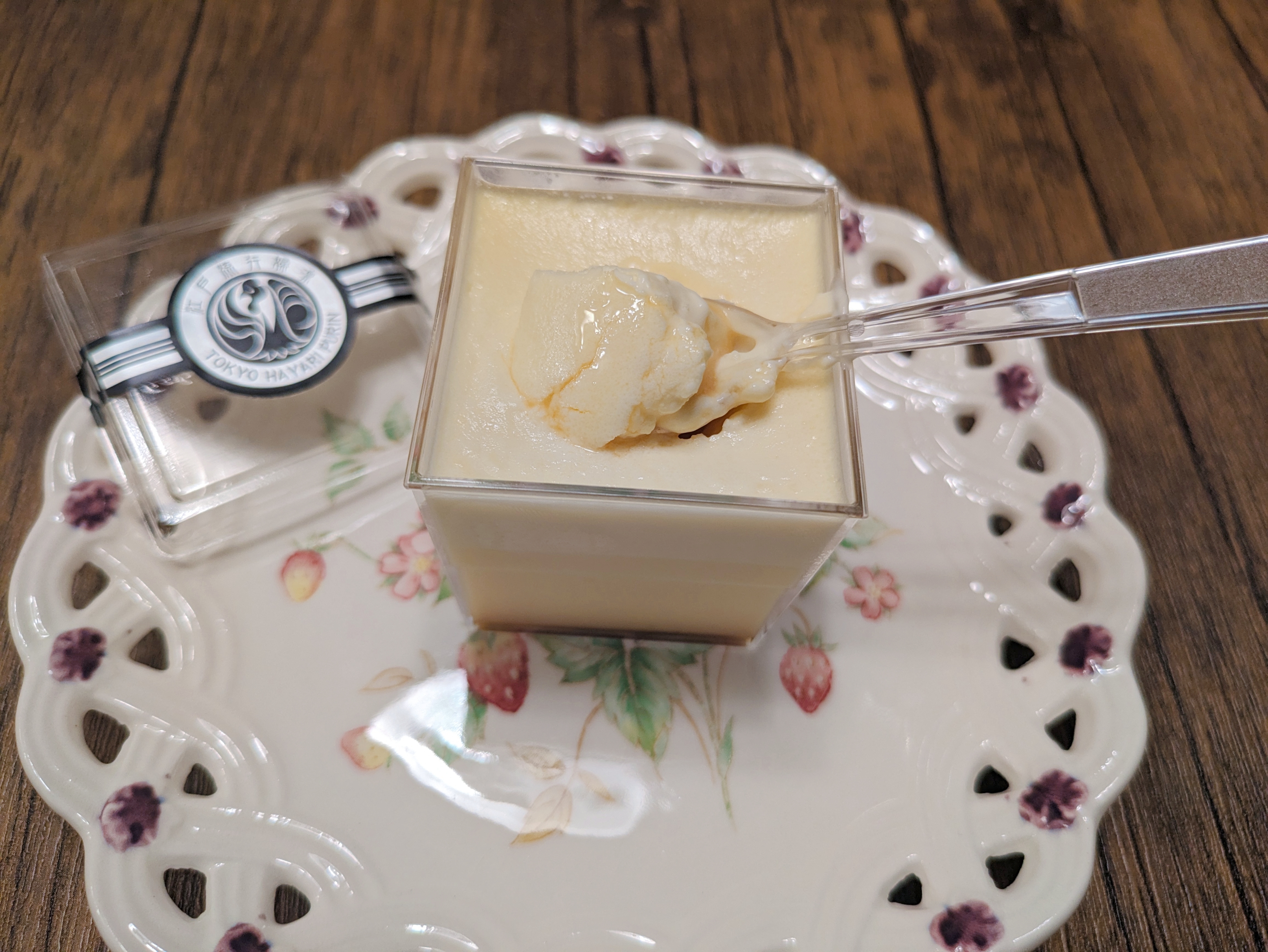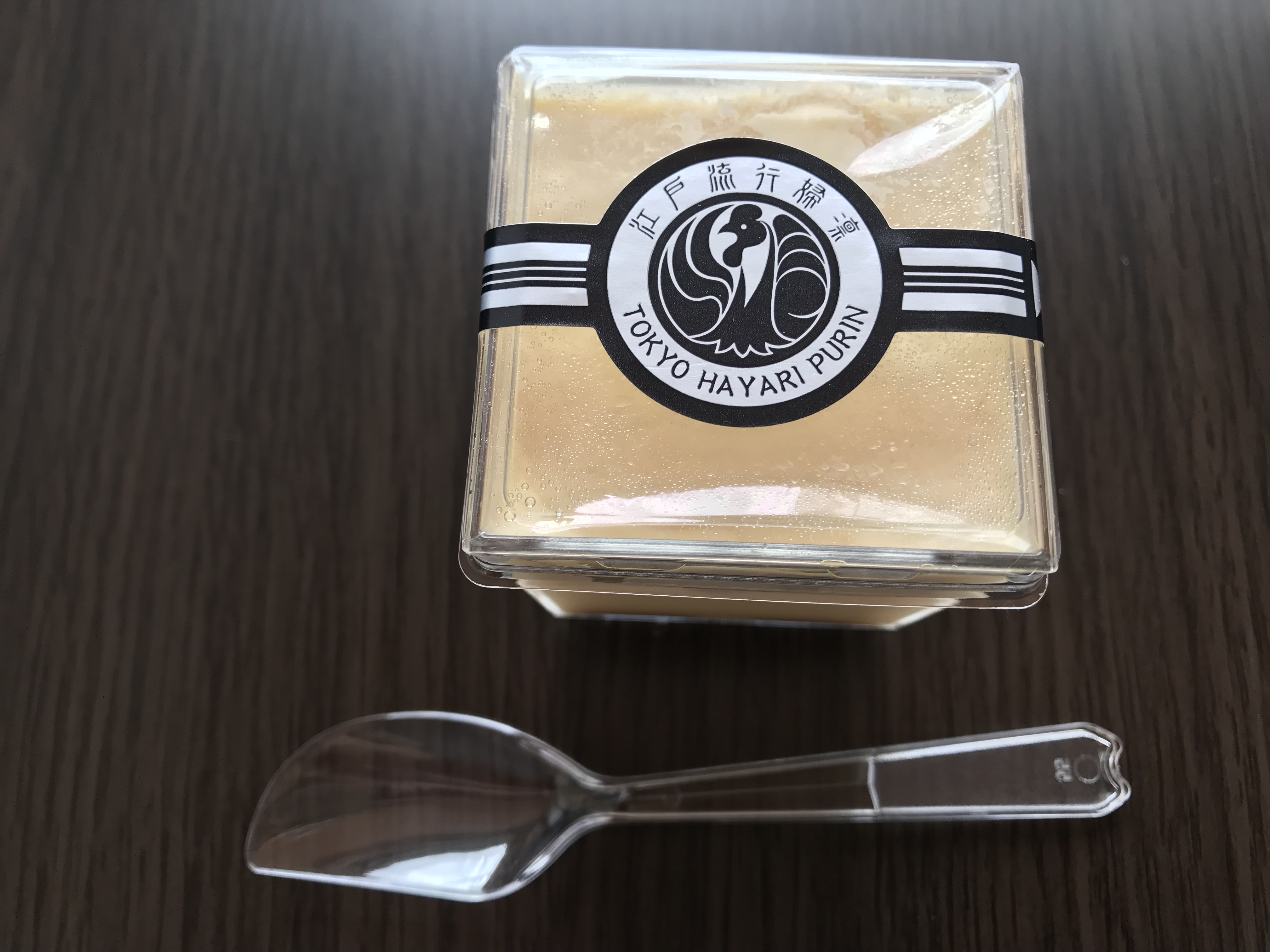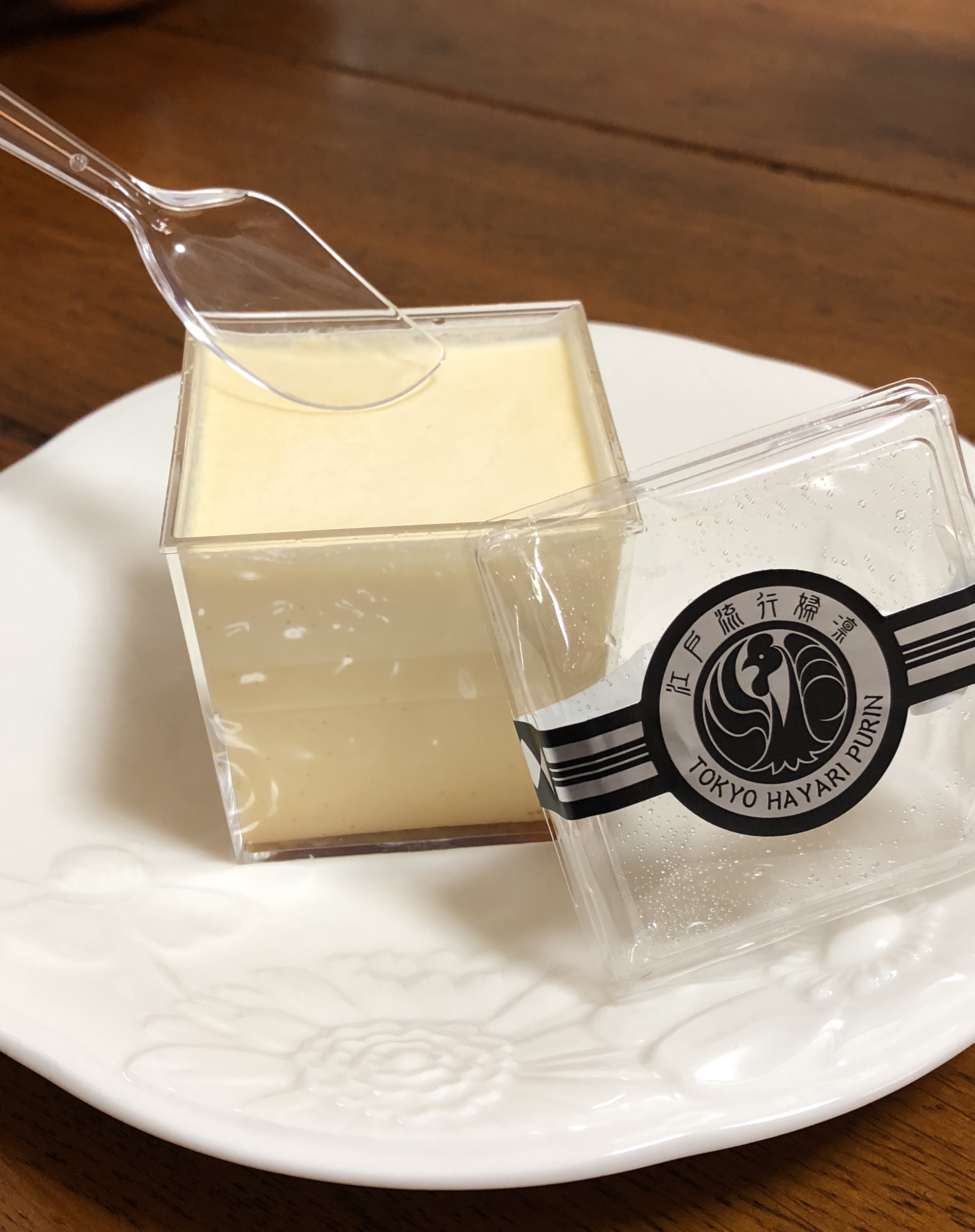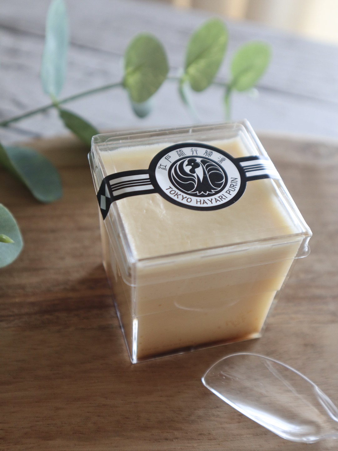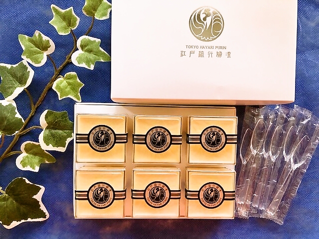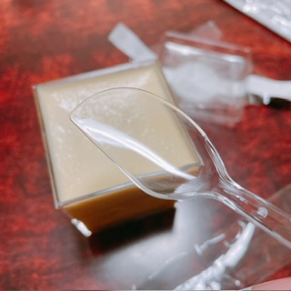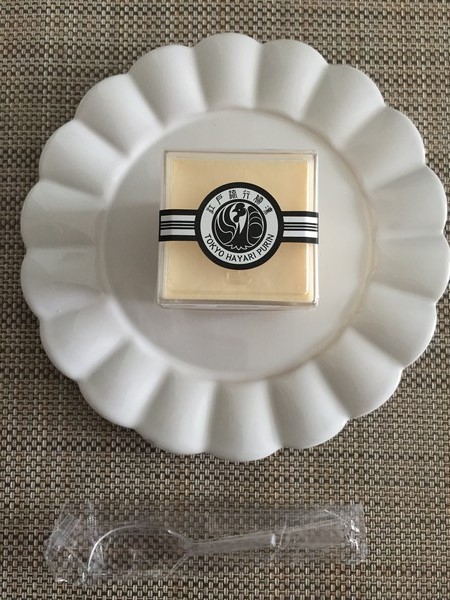 この江戸流行婦凛ならではの四角いプラ容器がとても素敵です。付属のスプーンはリーフ型スプーンと言って、このプリンの四角い容器の特殊な形の角までしっかりすくって食べられる仕様になっています。