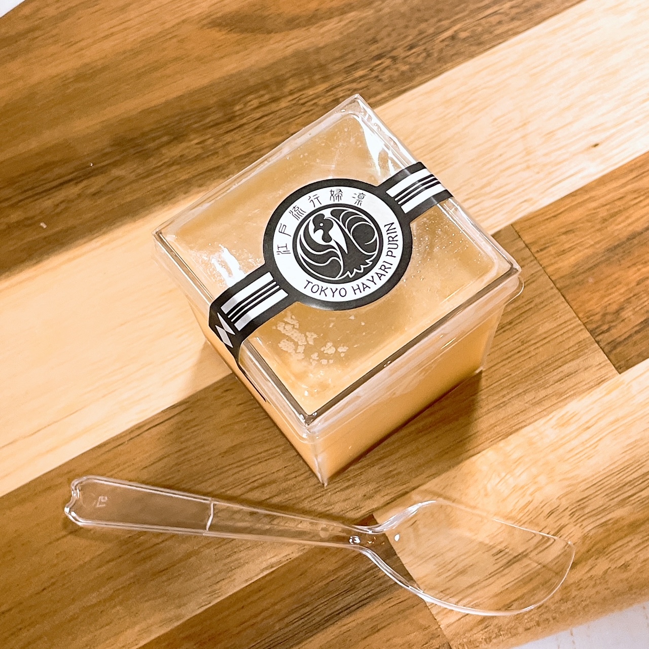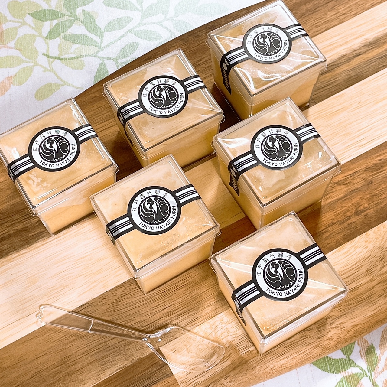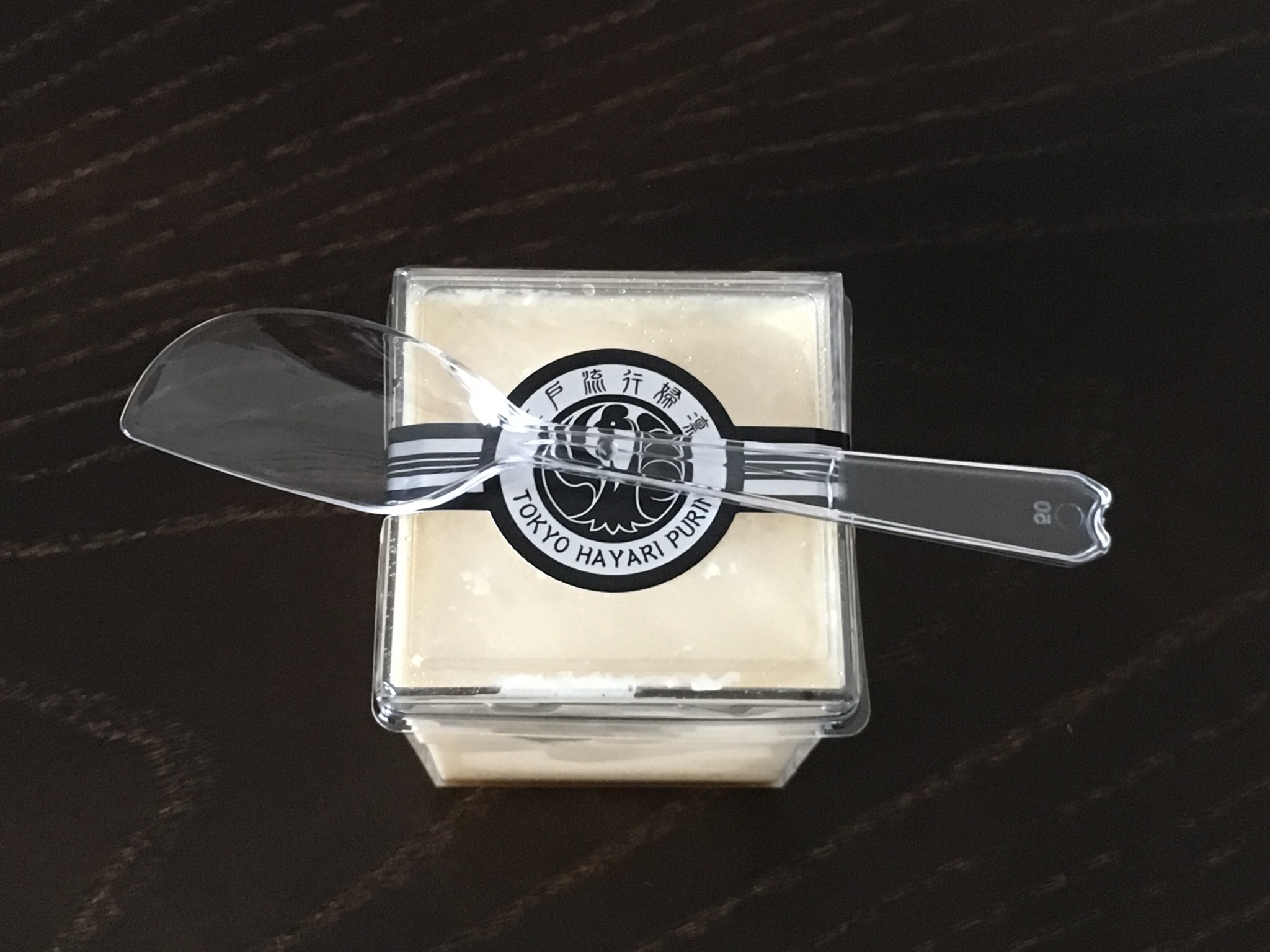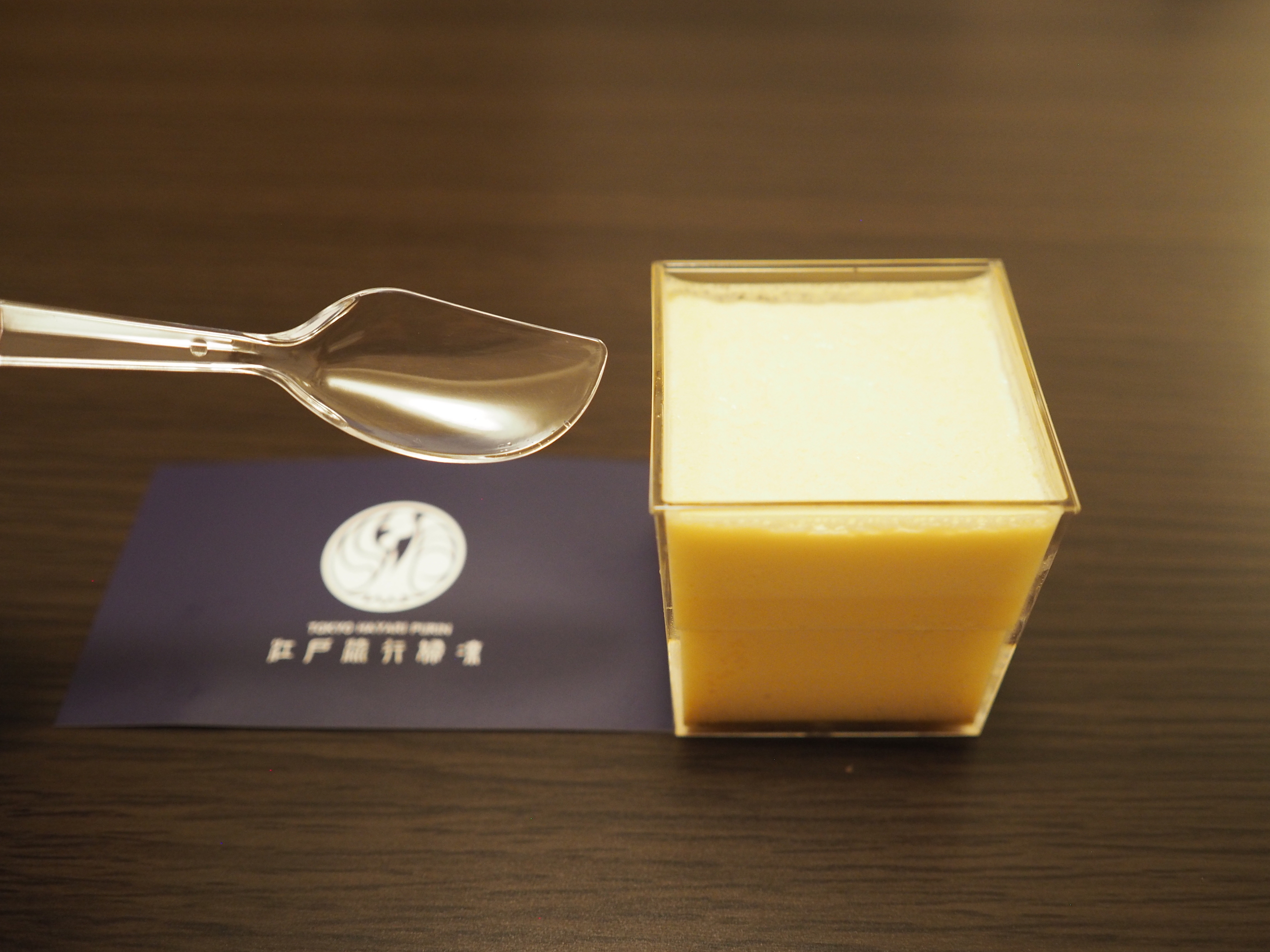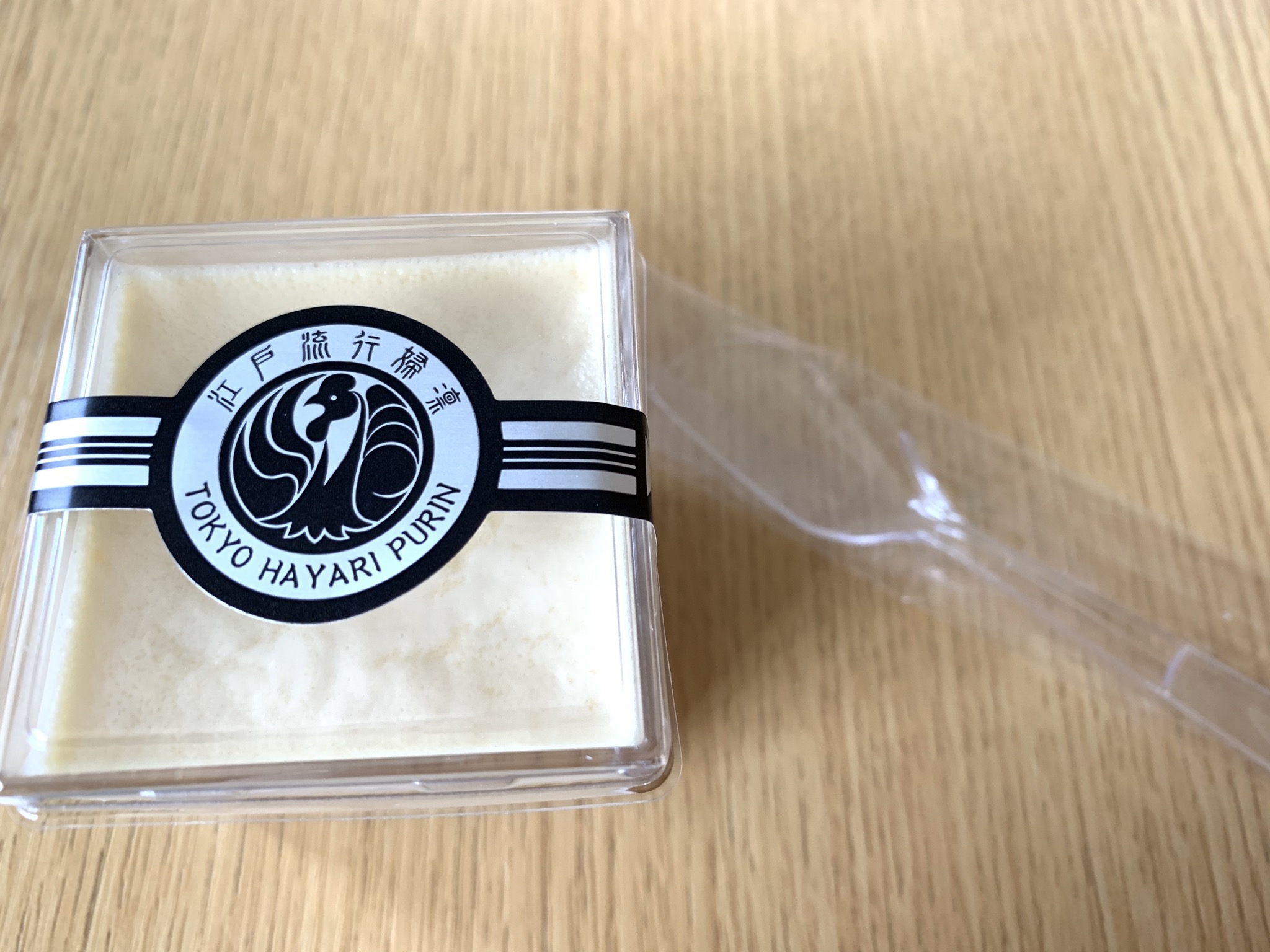 この江戸流行婦凛ならではの四角いプラ容器がとても素敵です。付属のスプーンはリーフ型スプーンと言って、このプリンの四角い容器の特殊な形の角までしっかりすくって食べられる仕様になっています。