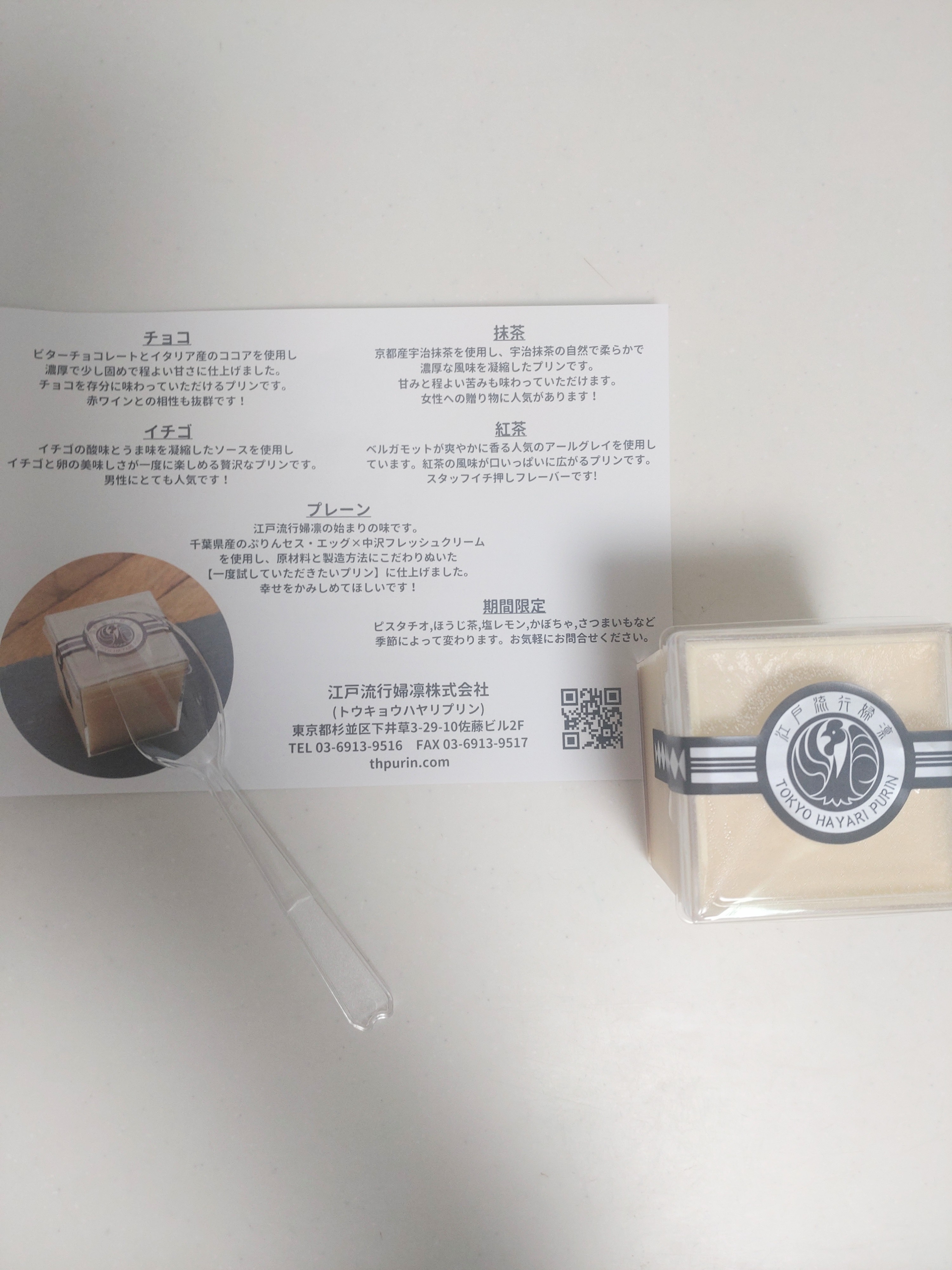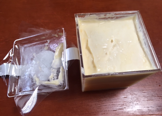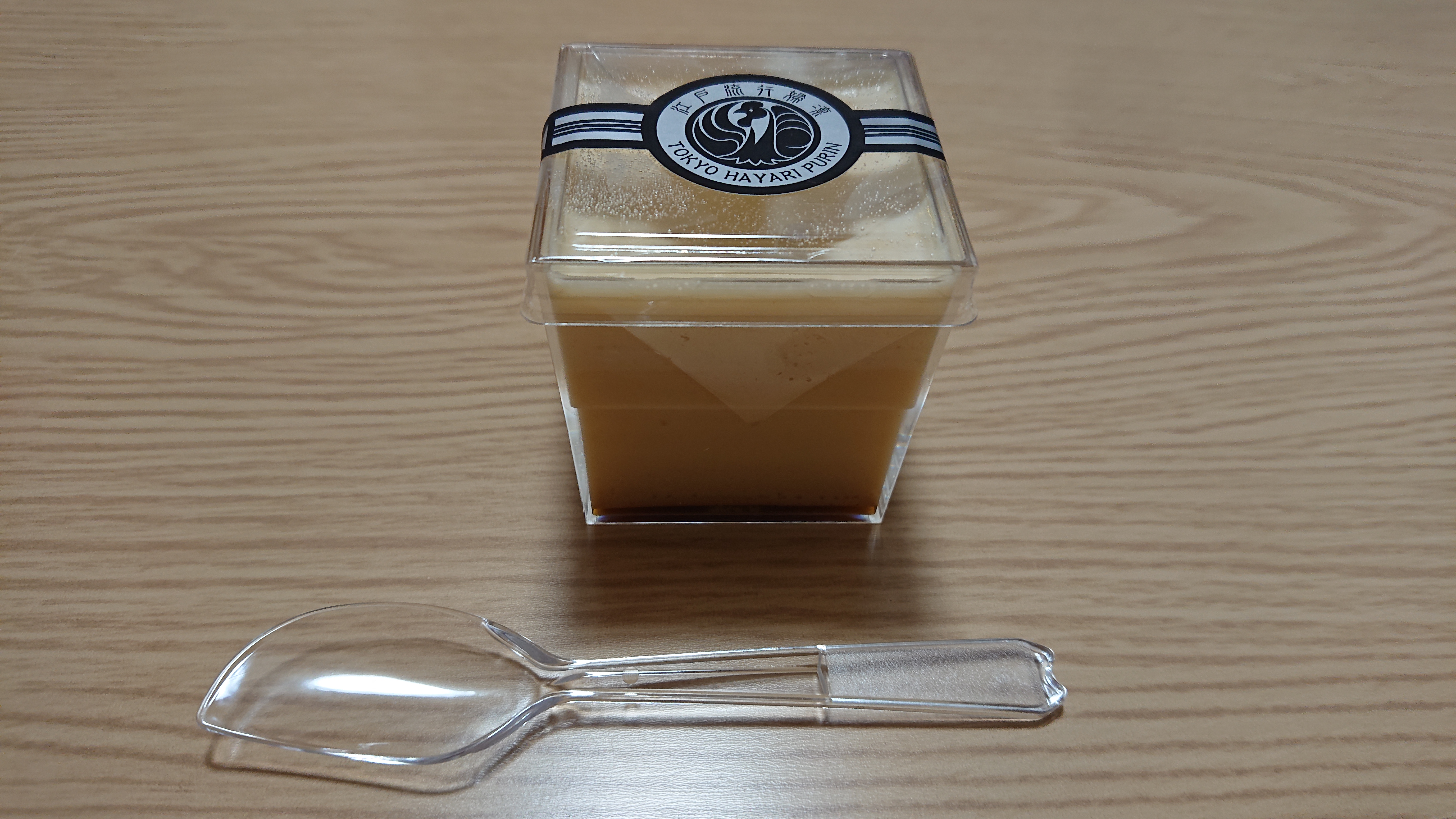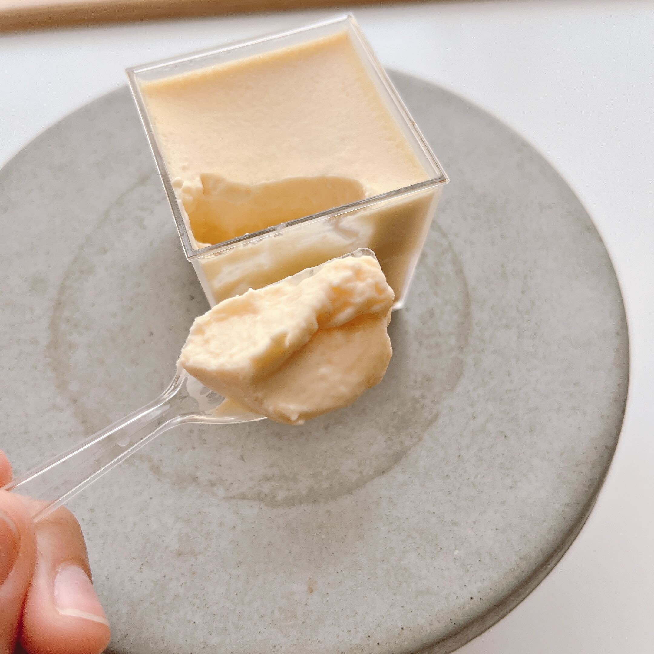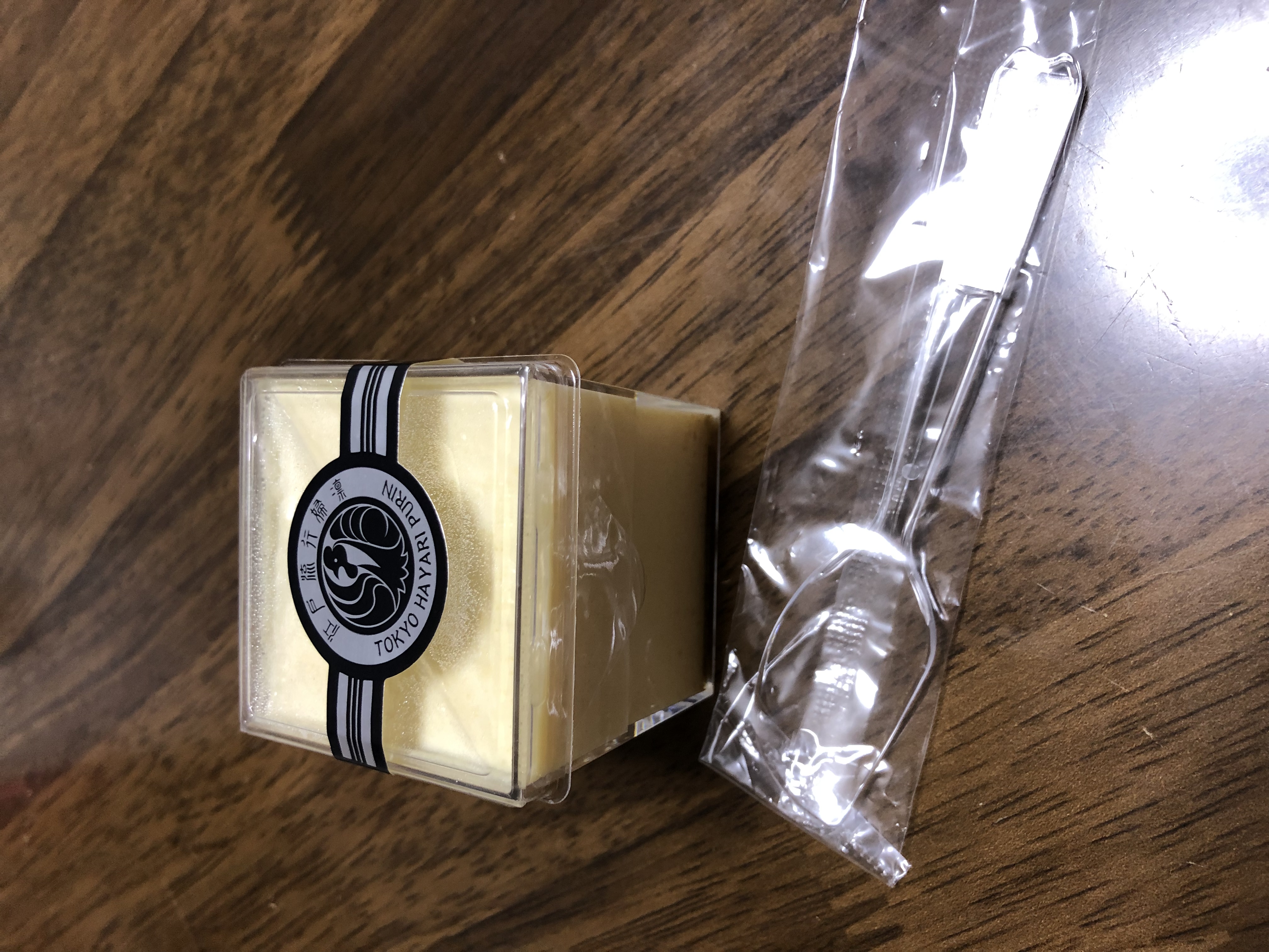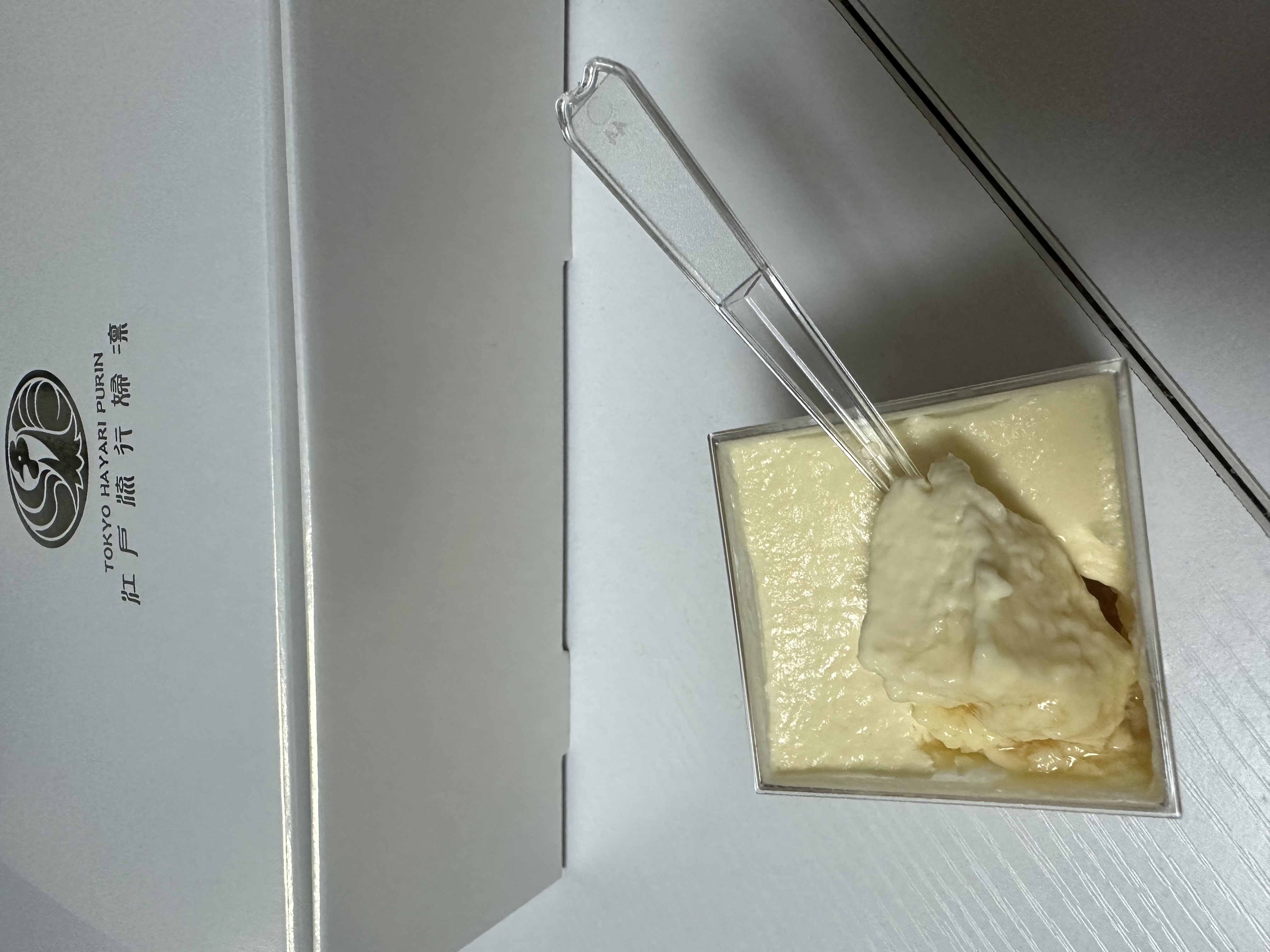 この江戸流行婦凛ならではの四角いプラ容器がとても素敵です。付属のスプーンはリーフ型スプーンと言って、このプリンの四角い容器の特殊な形の角までしっかりすくって食べられる仕様になっています。