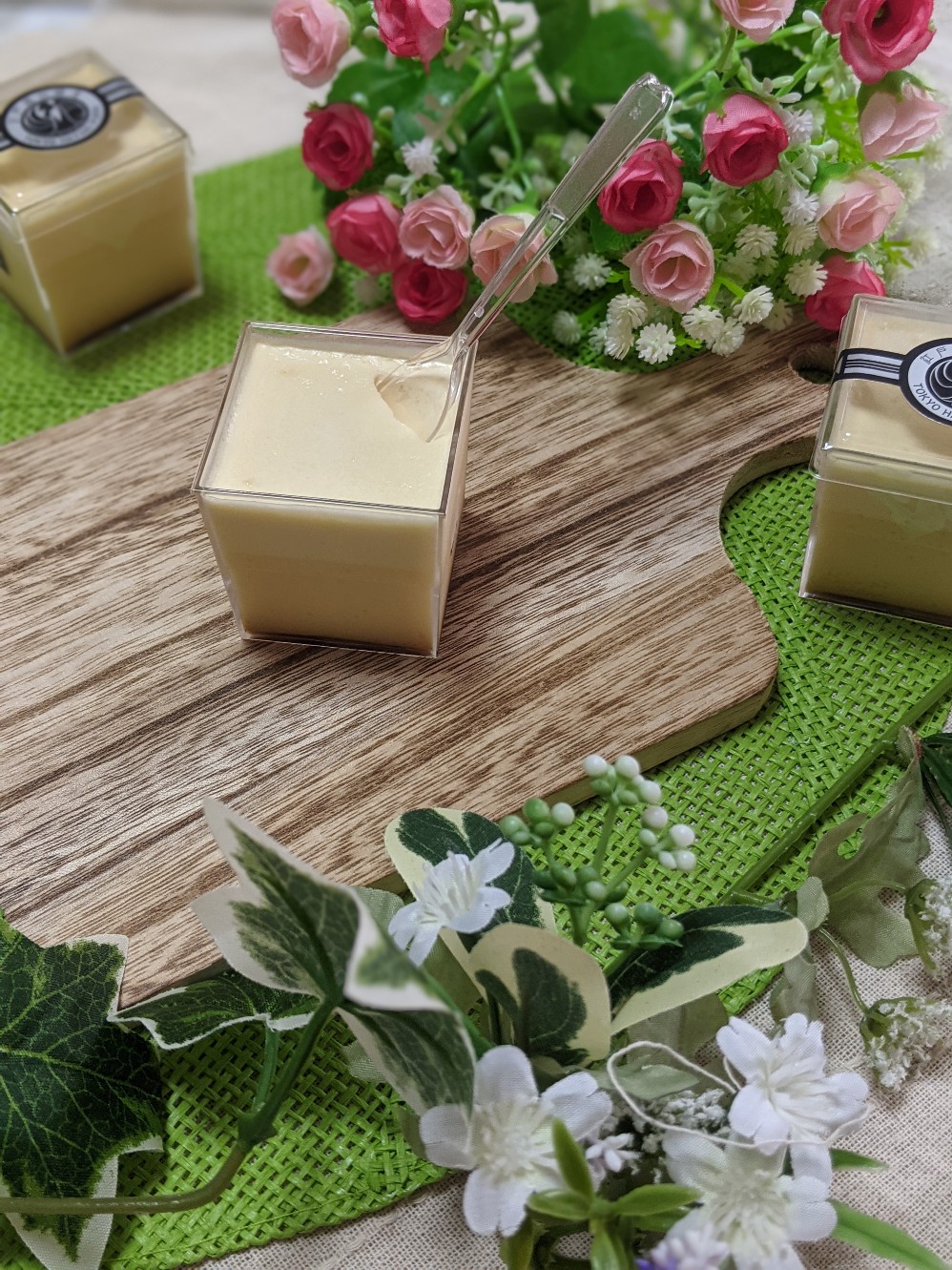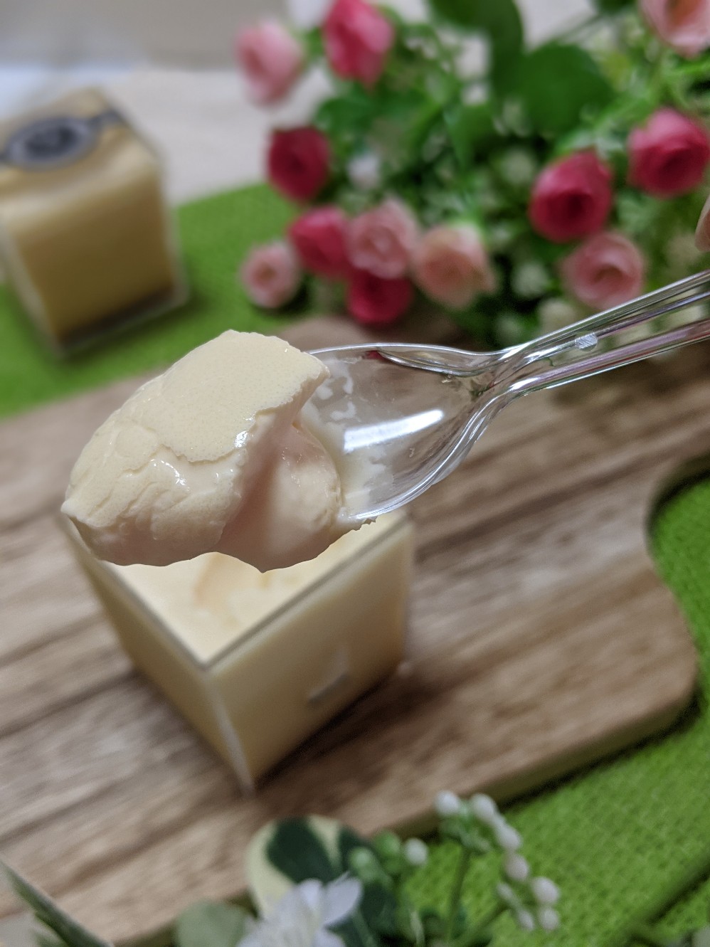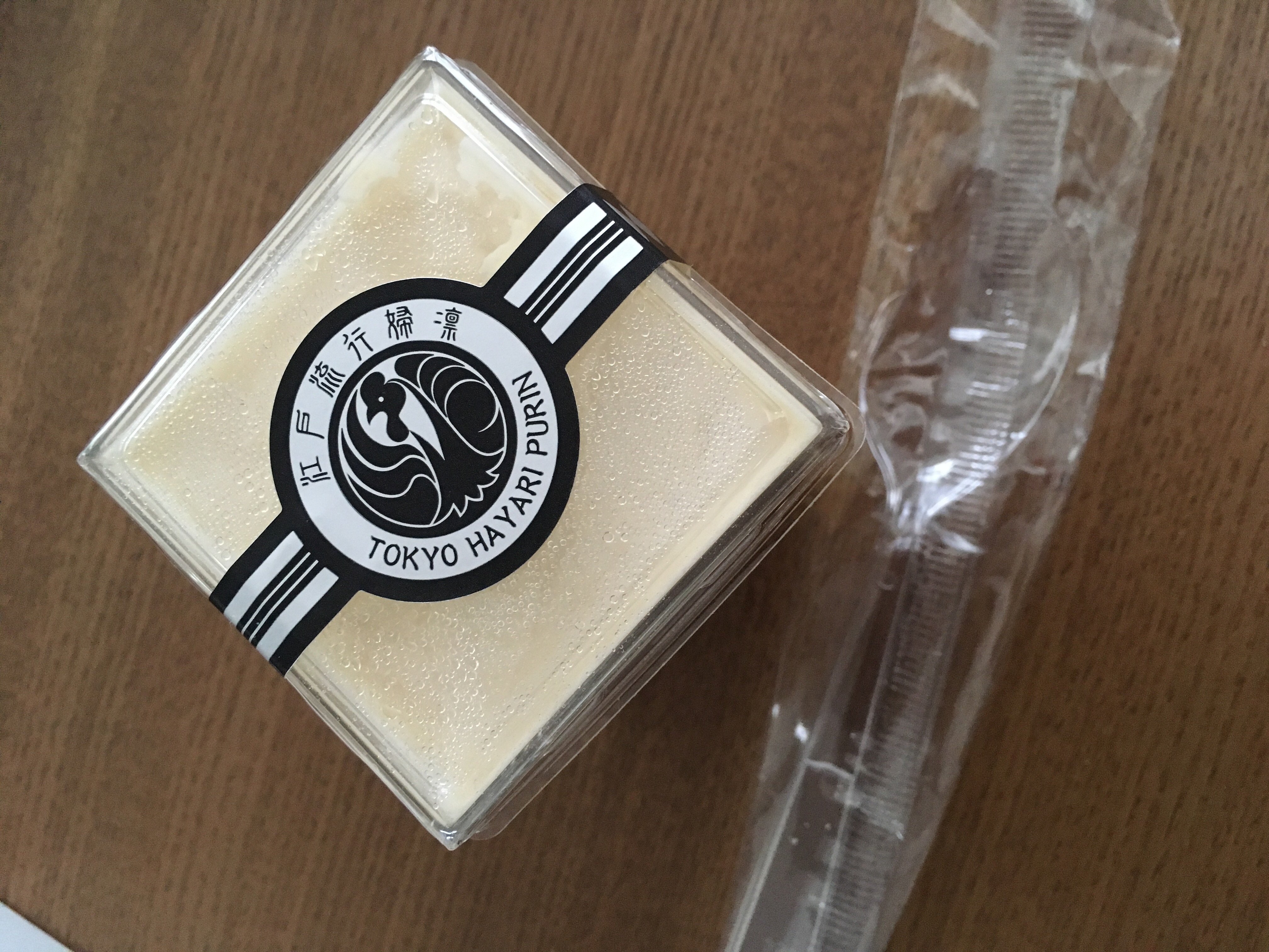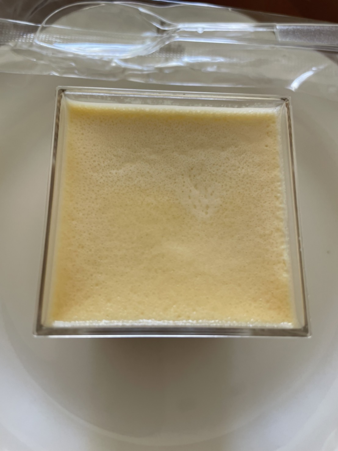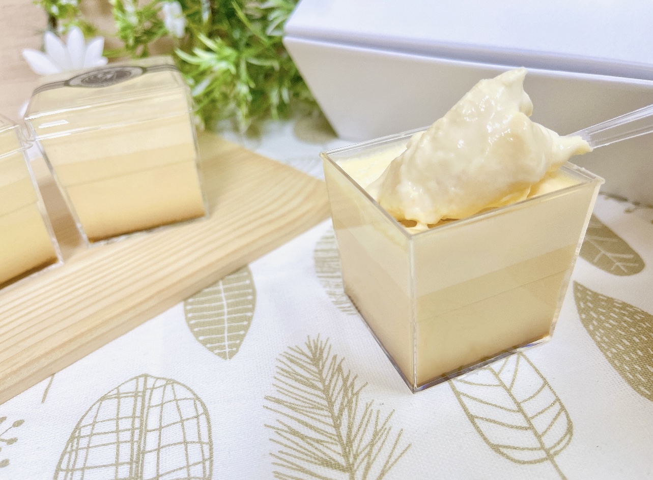この江戸流行婦凛ならではの四角いプラ容器がとても素敵です。付属のスプーンはリーフ型スプーンと言って、このプリンの四角い容器の特殊な形の角までしっかりすくって食べられる仕様になっています。