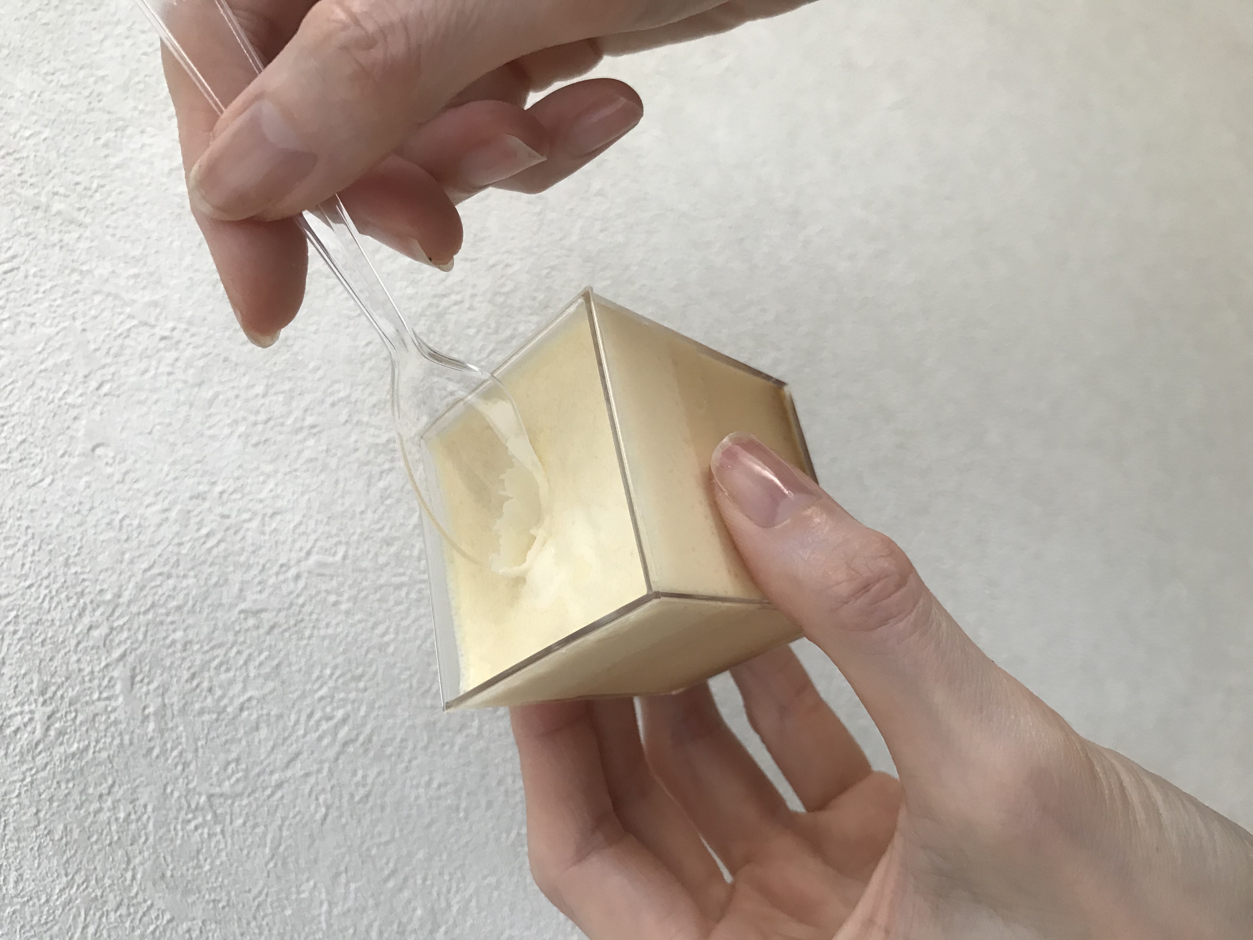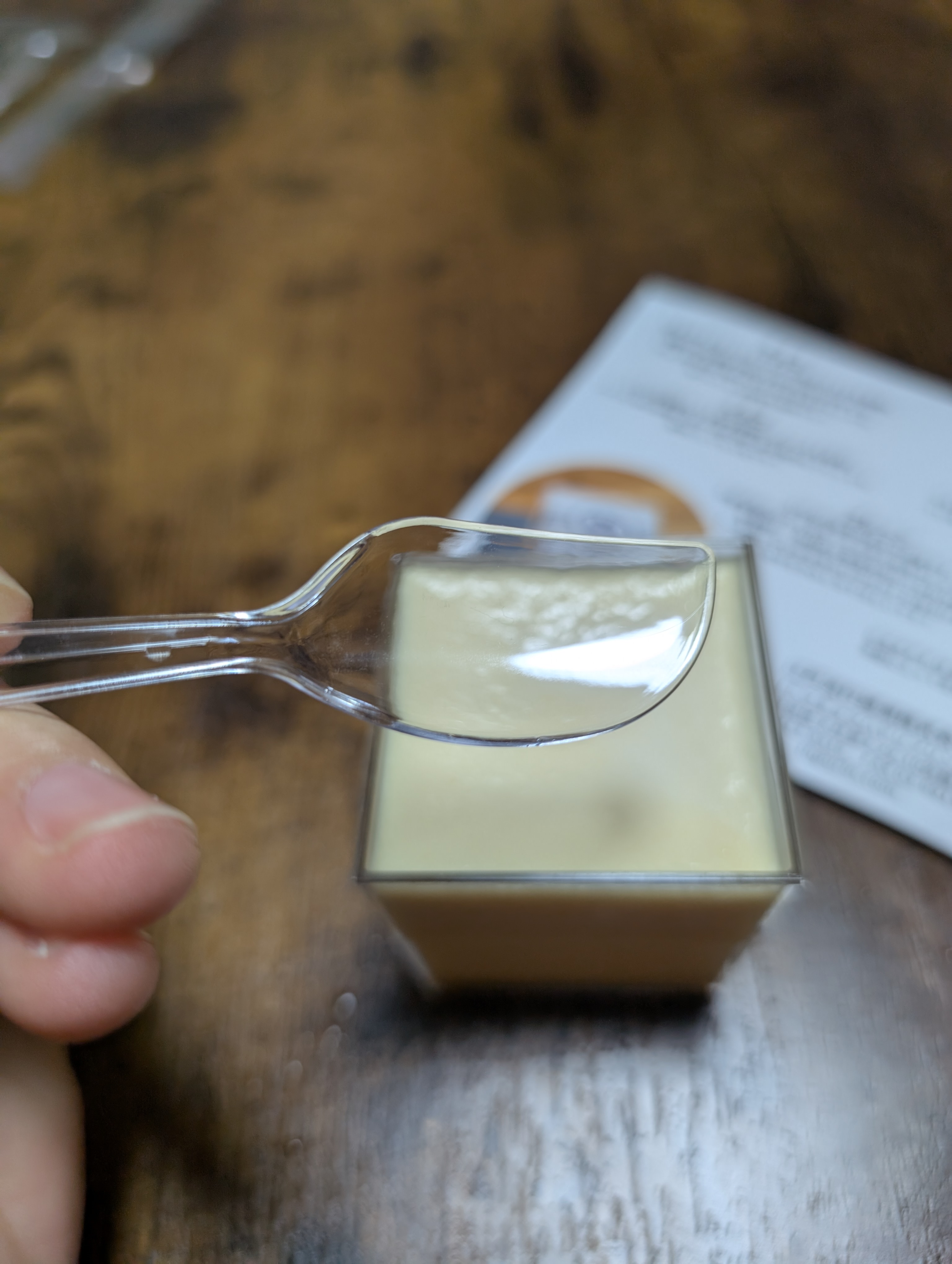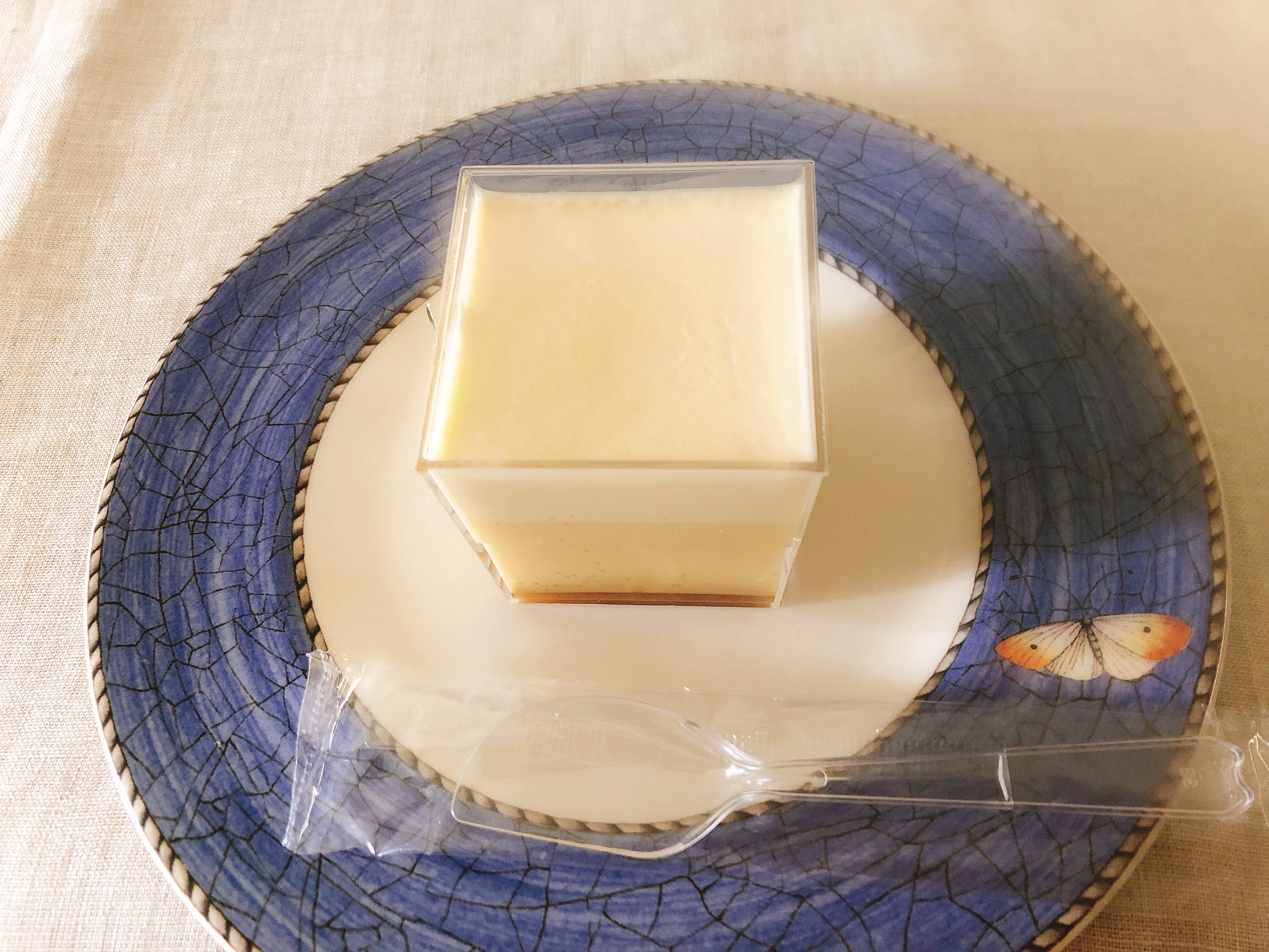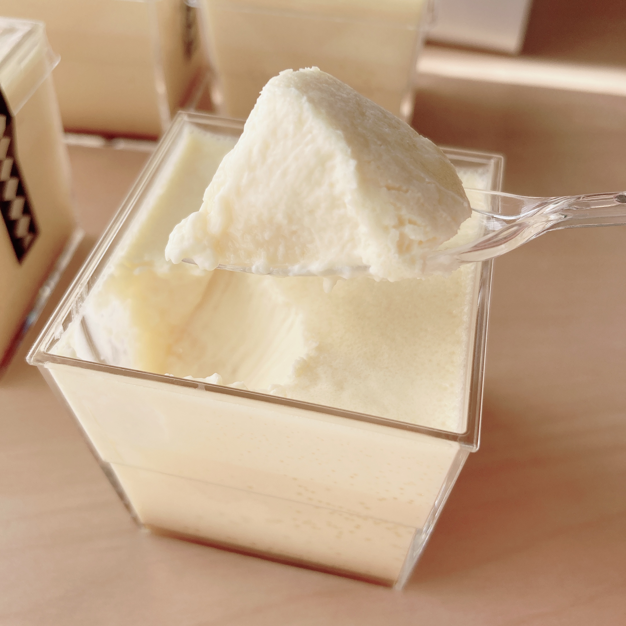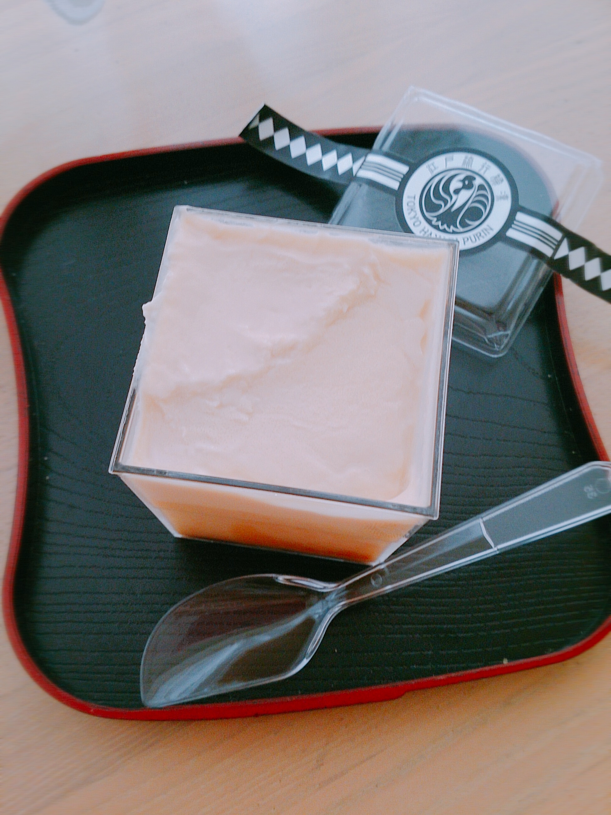 この江戸流行婦凛ならではの四角いプラ容器がとても素敵です。付属のスプーンはリーフ型スプーンと言って、このプリンの四角い容器の特殊な形の角までしっかりすくって食べられる仕様になっています。