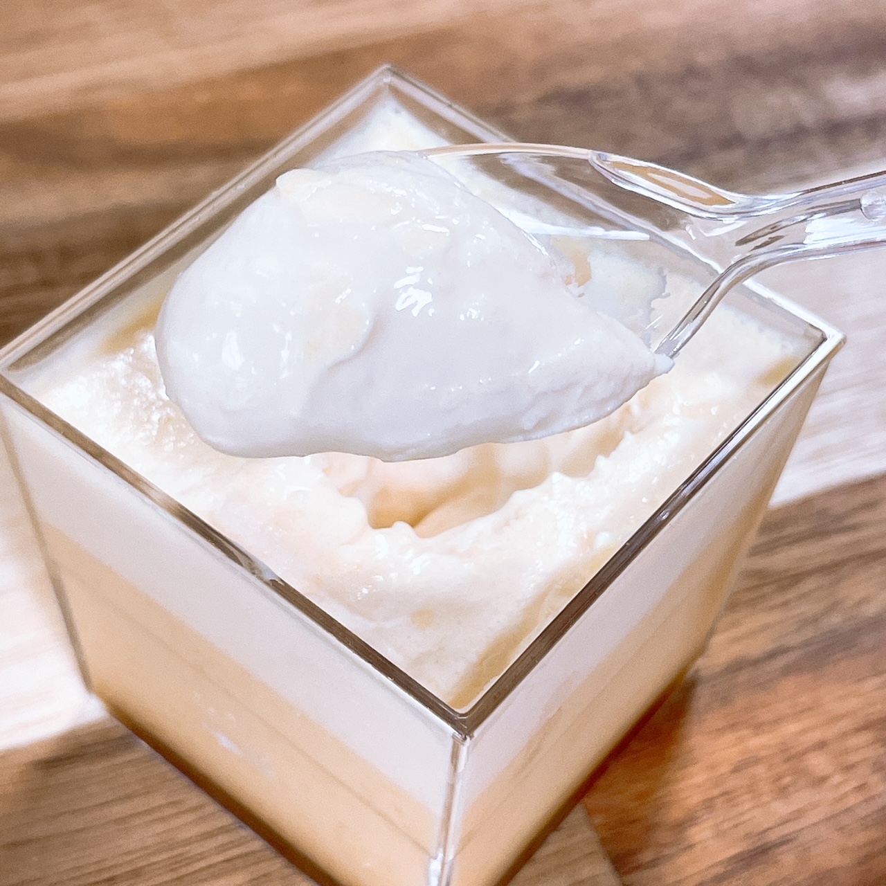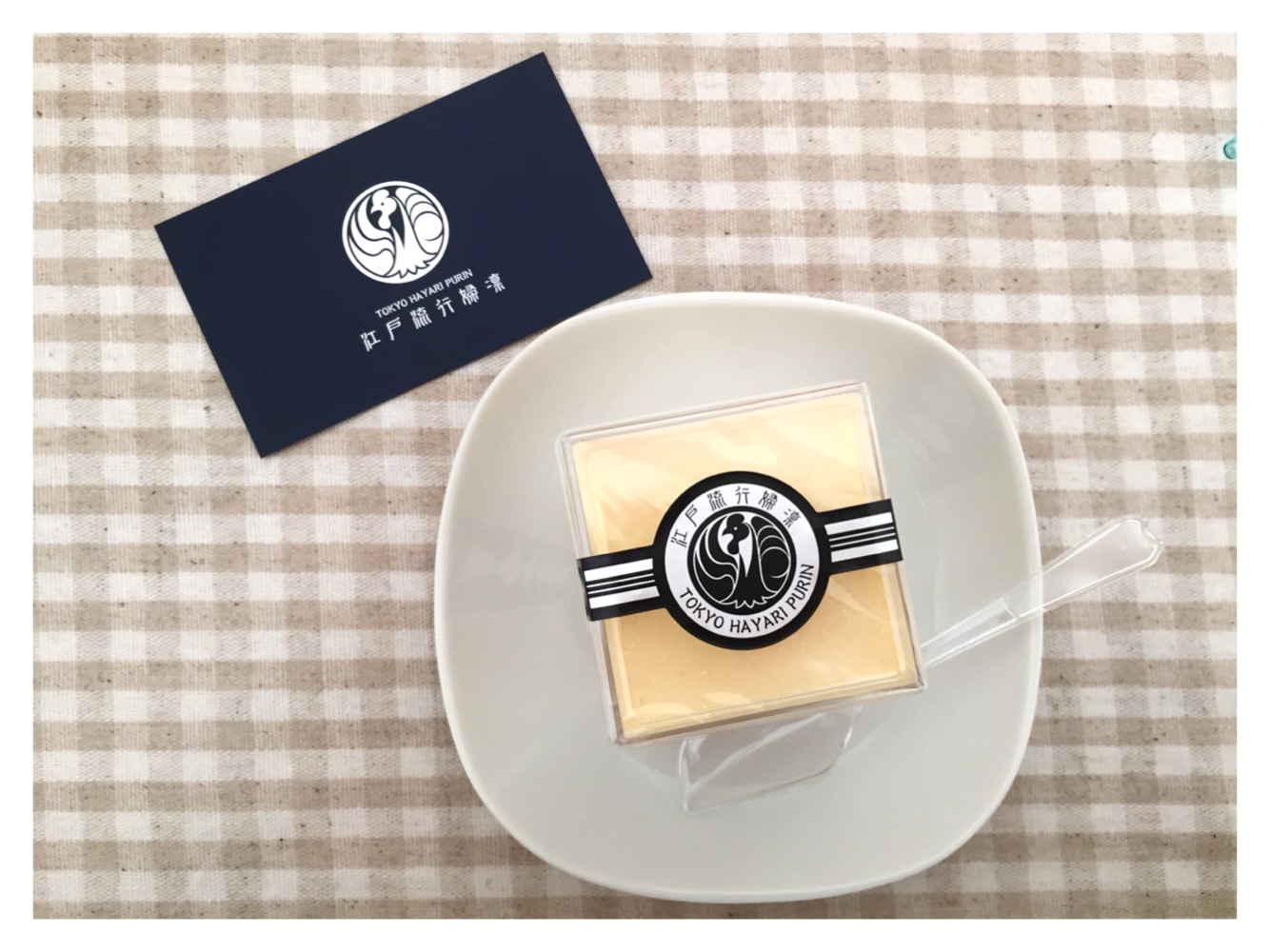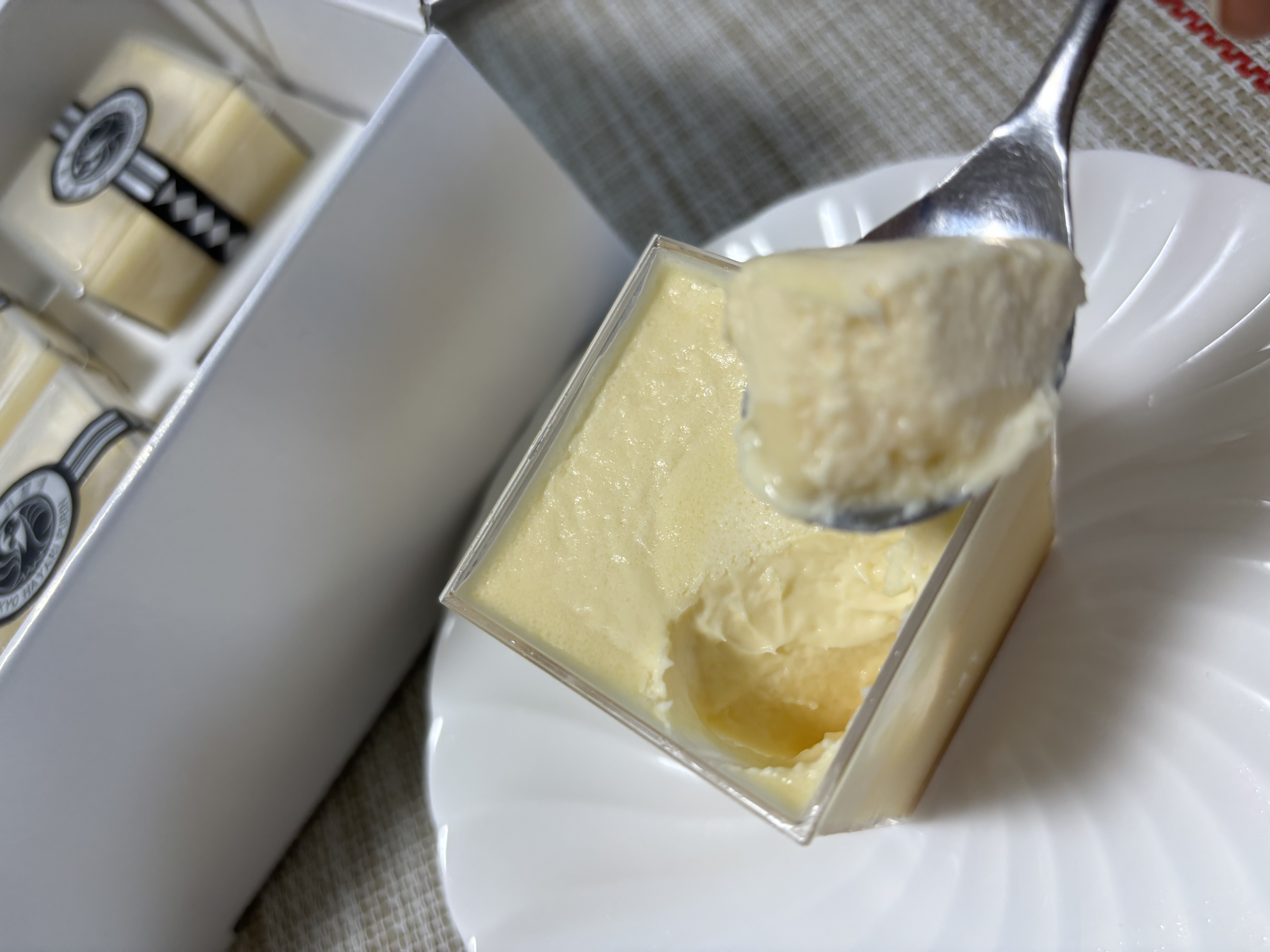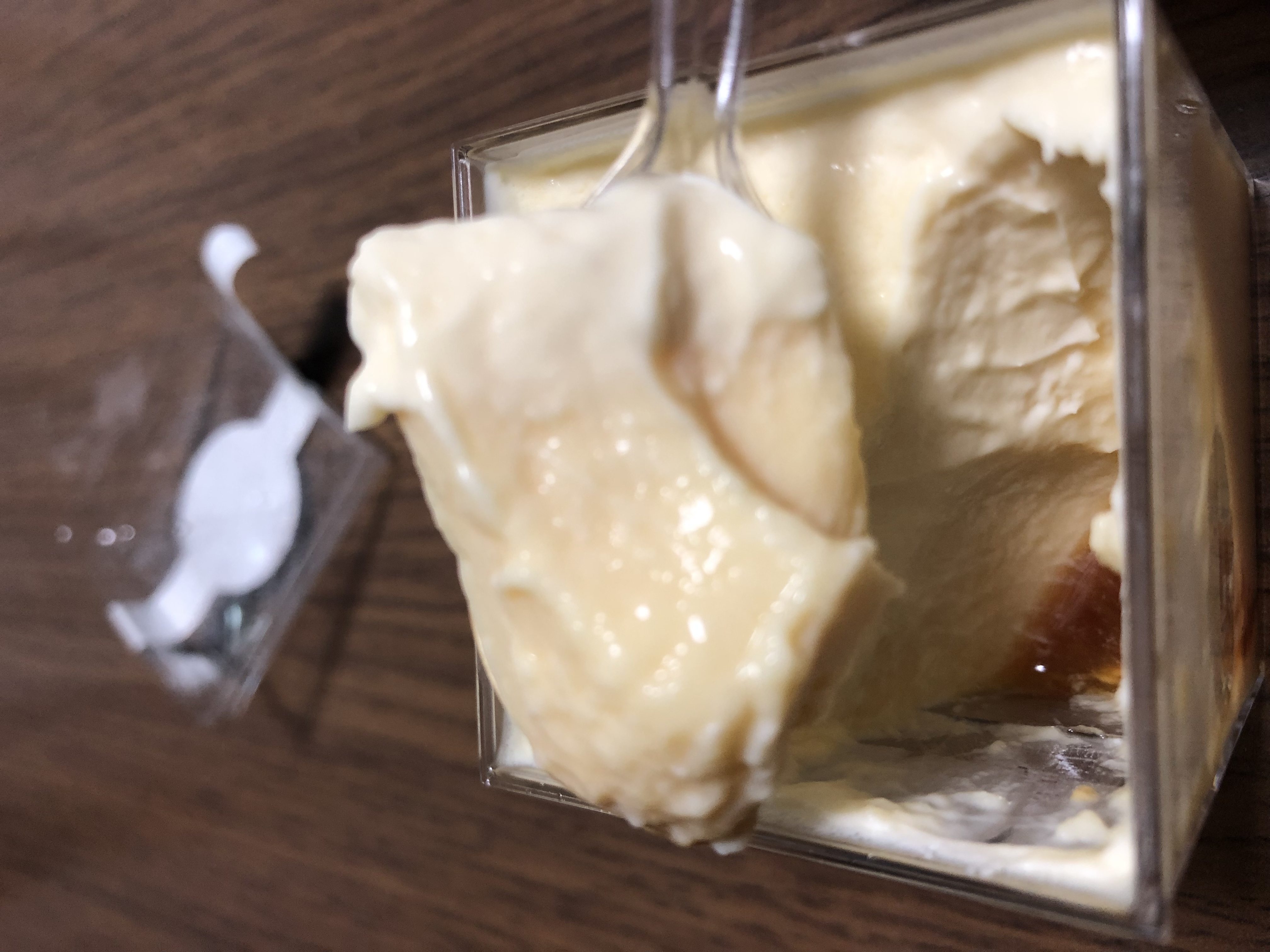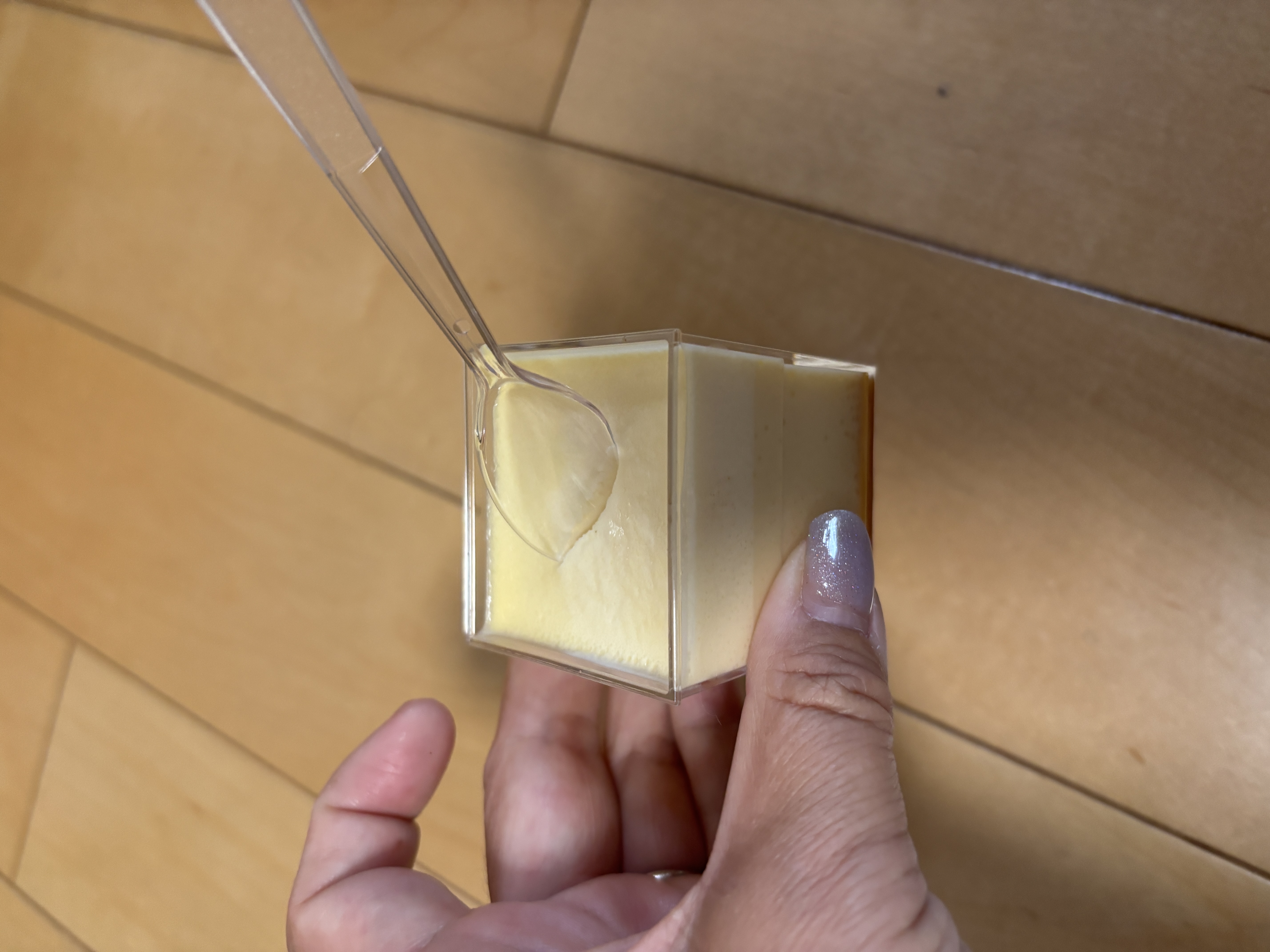 この江戸流行婦凛ならではの四角いプラ容器がとても素敵です。付属のスプーンはリーフ型スプーンと言って、このプリンの四角い容器の特殊な形の角までしっかりすくって食べられる仕様になっています。
