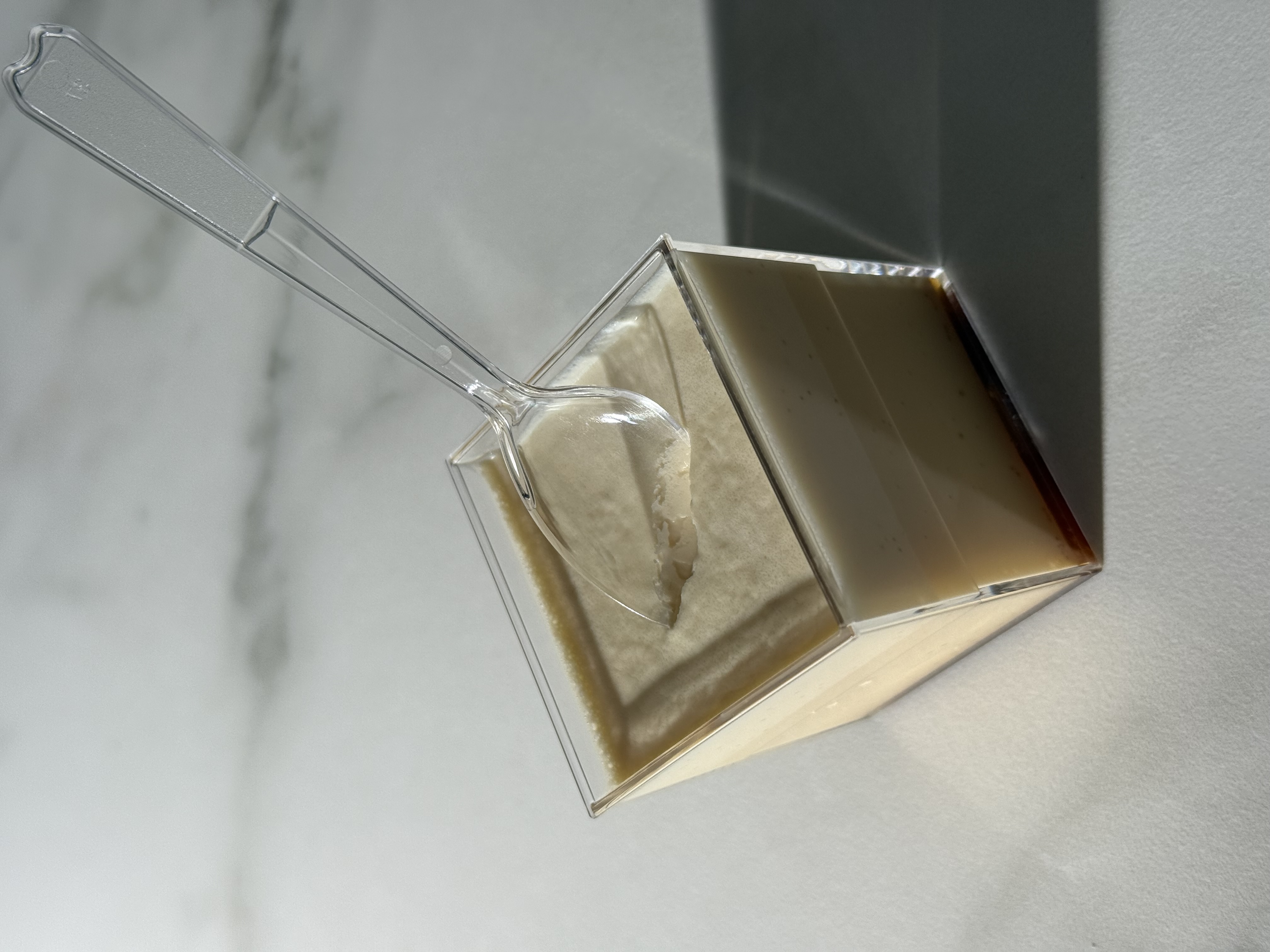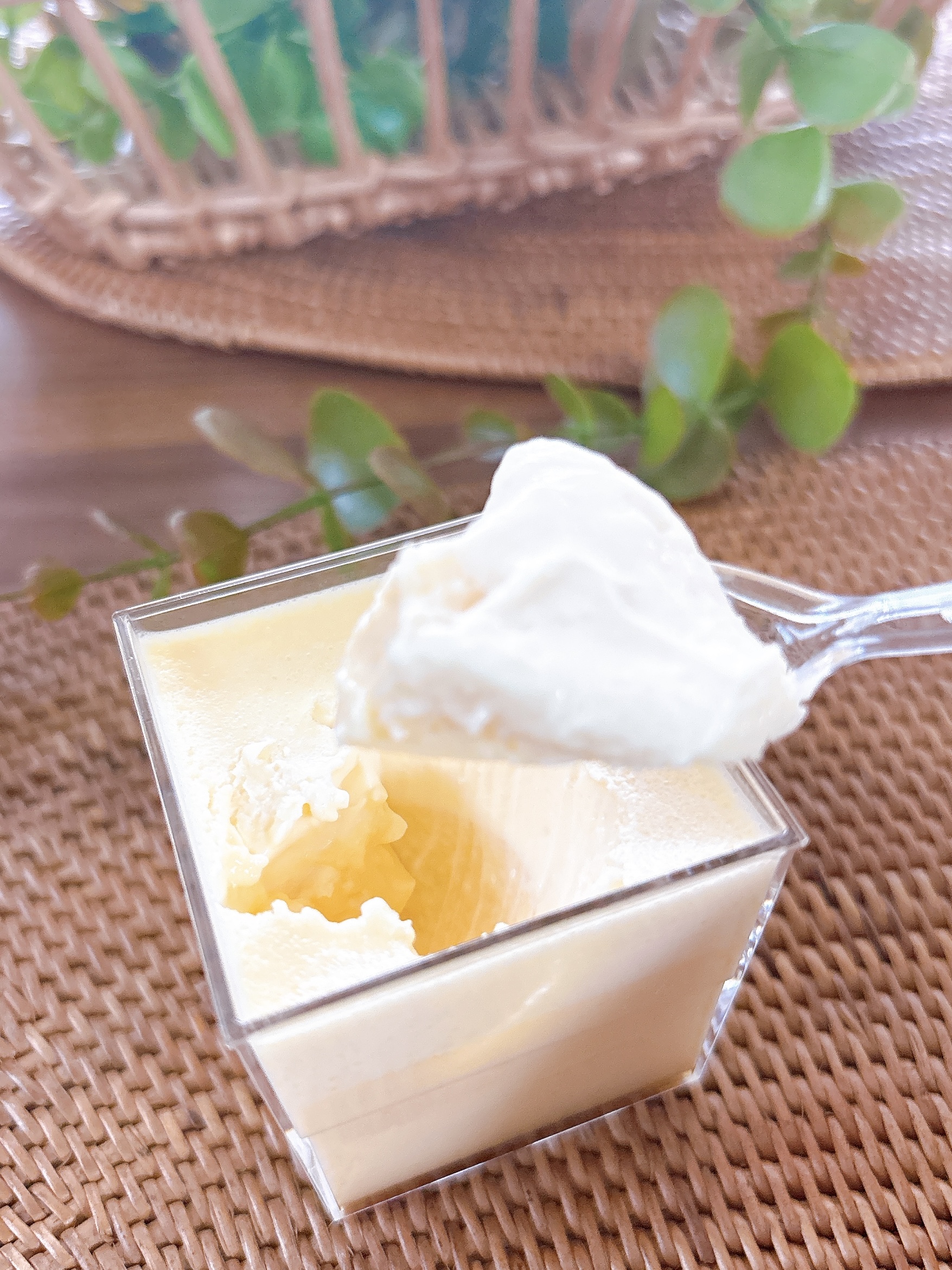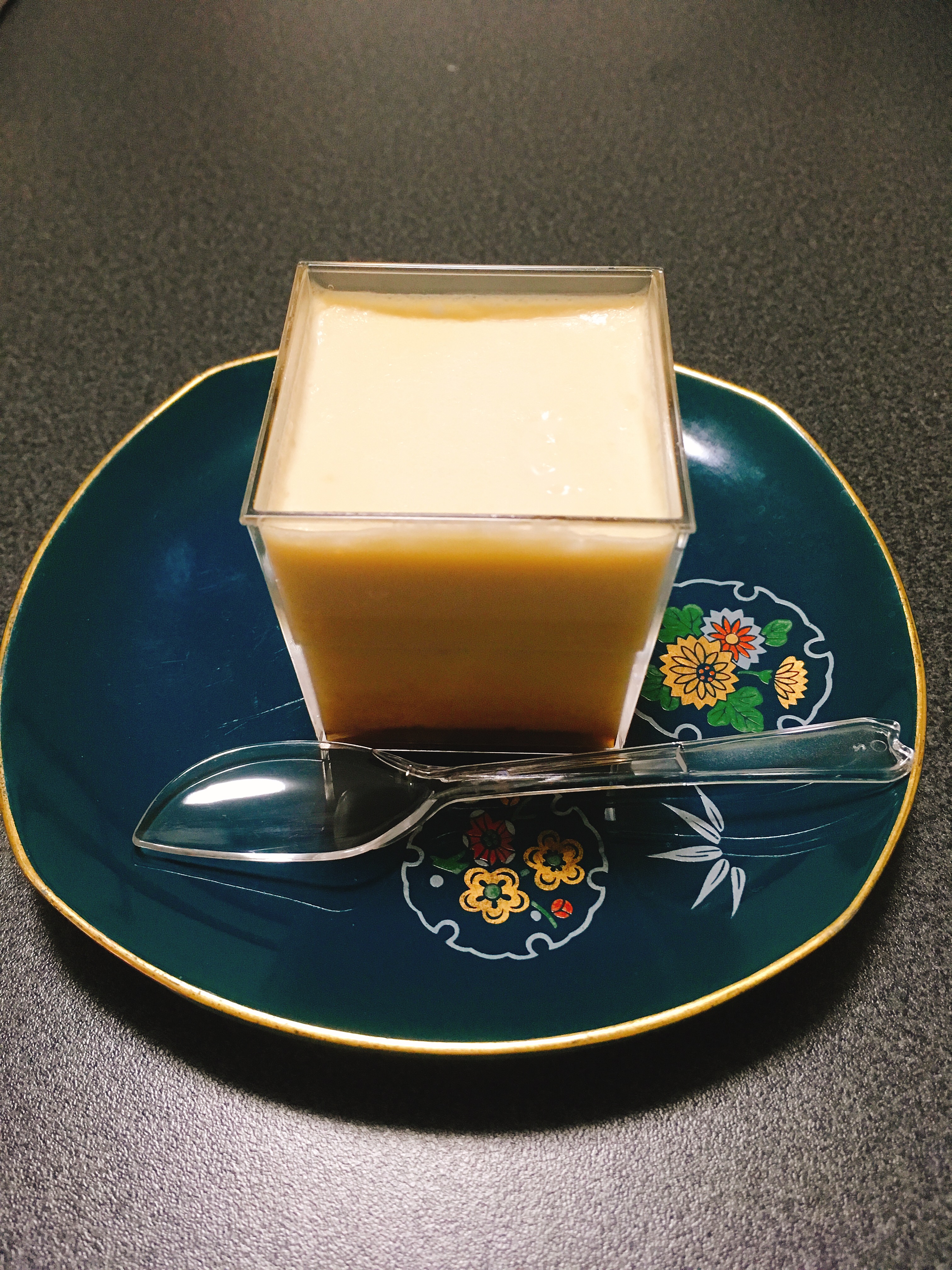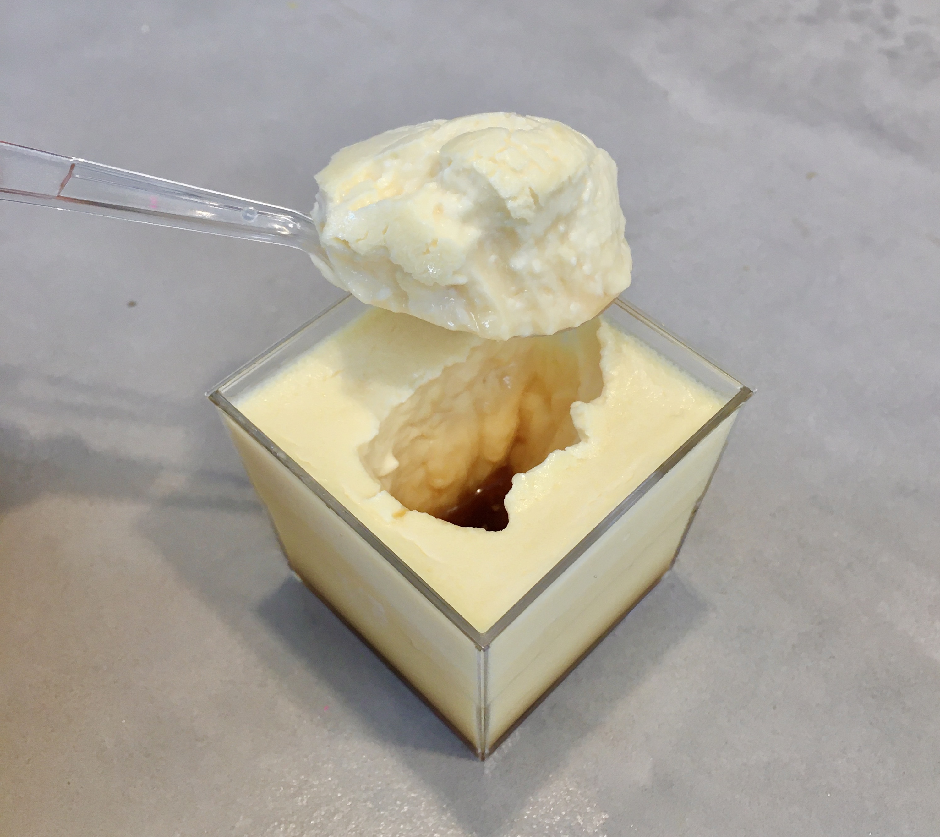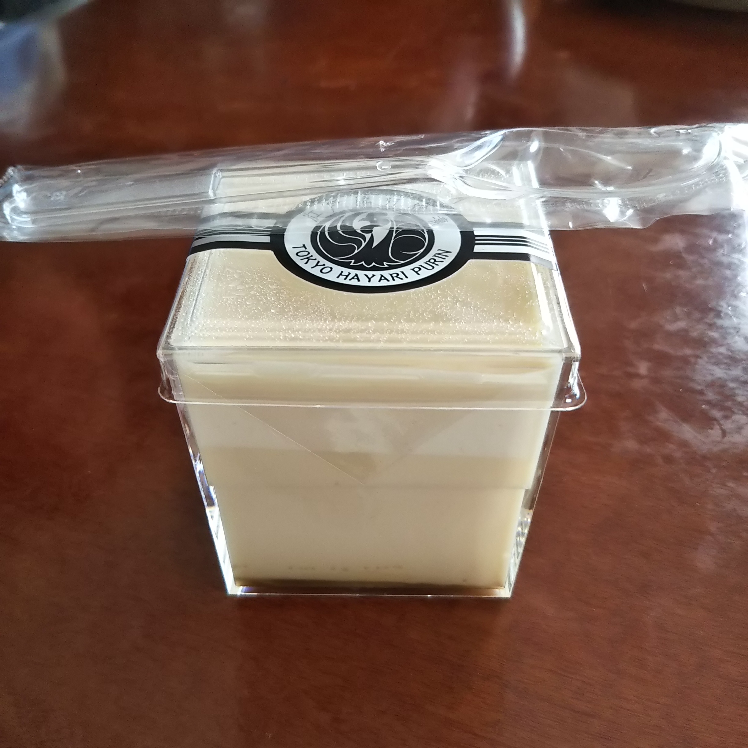 この江戸流行婦凛ならではの四角いプラ容器がとても素敵です。付属のスプーンはリーフ型スプーンと言って、このプリンの四角い容器の特殊な形の角までしっかりすくって食べられる仕様になっています。