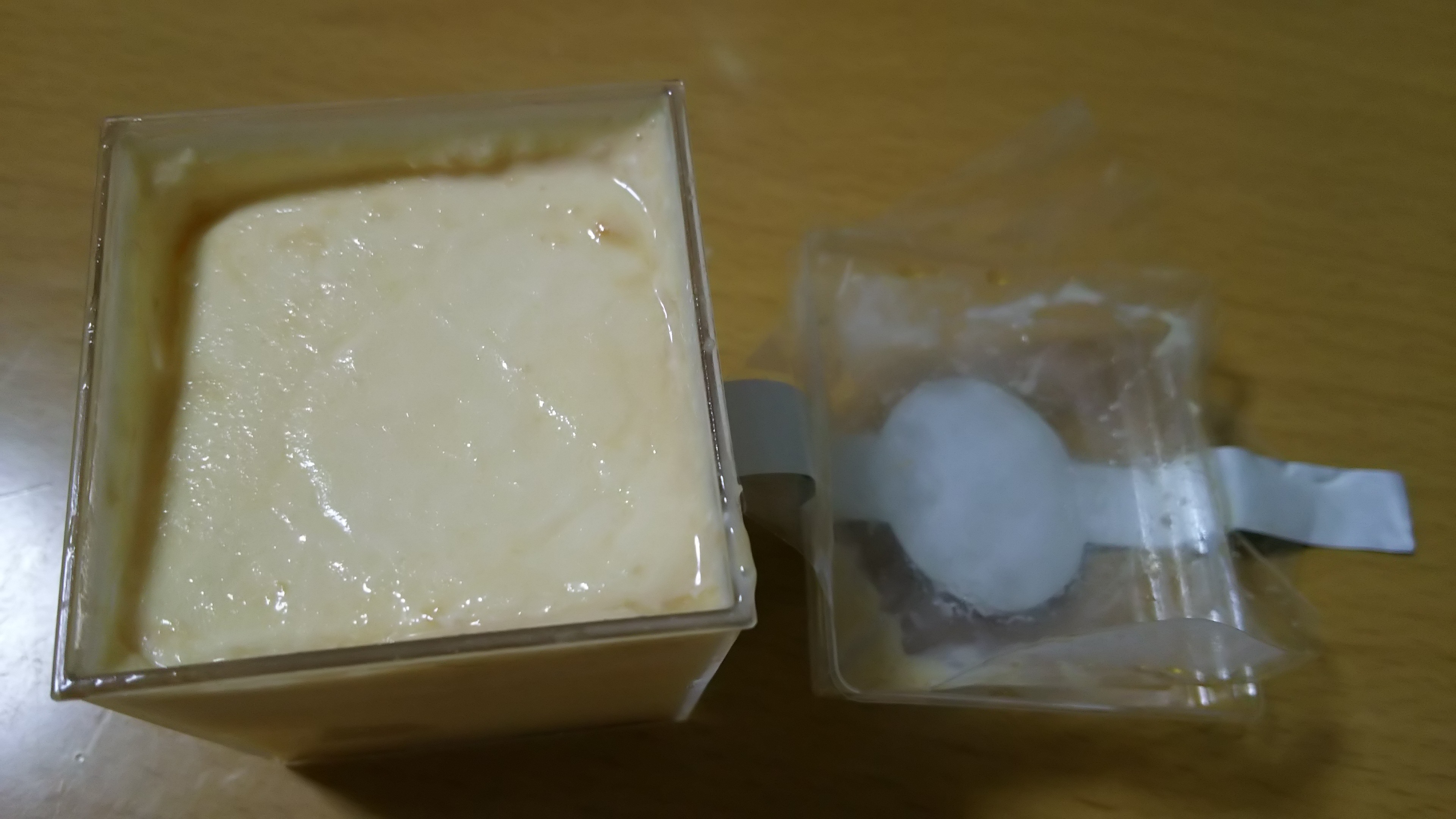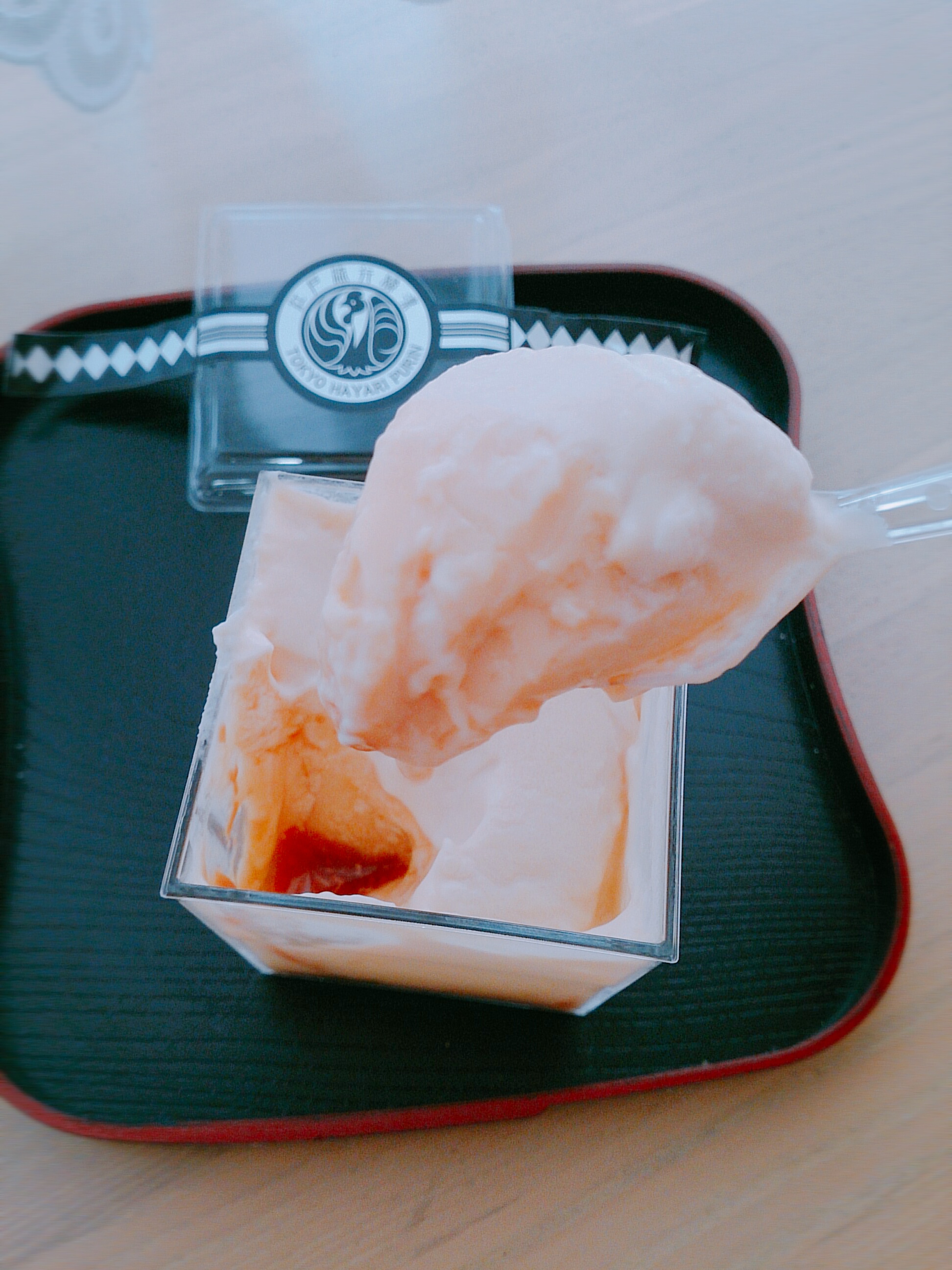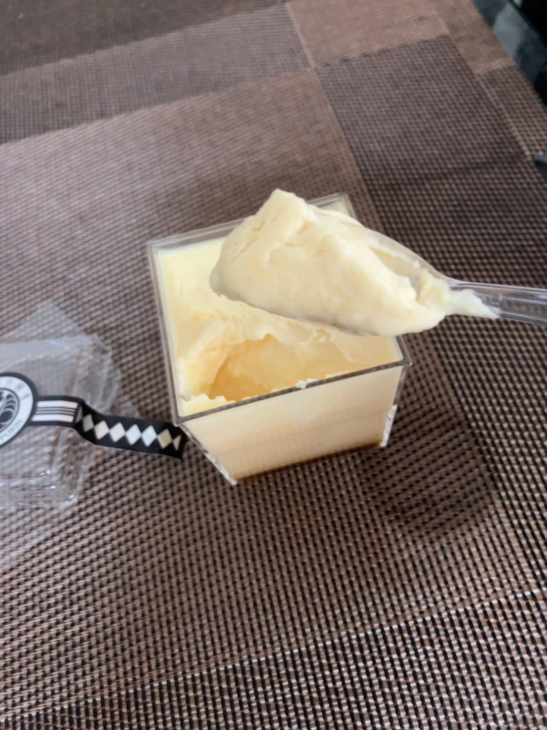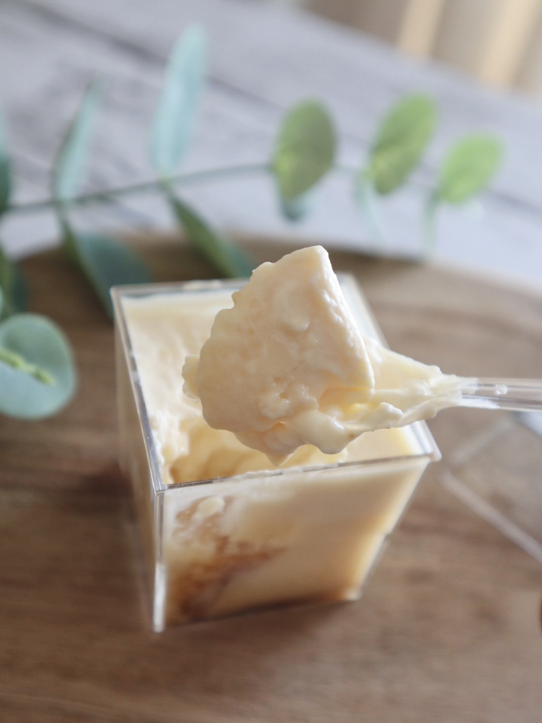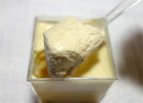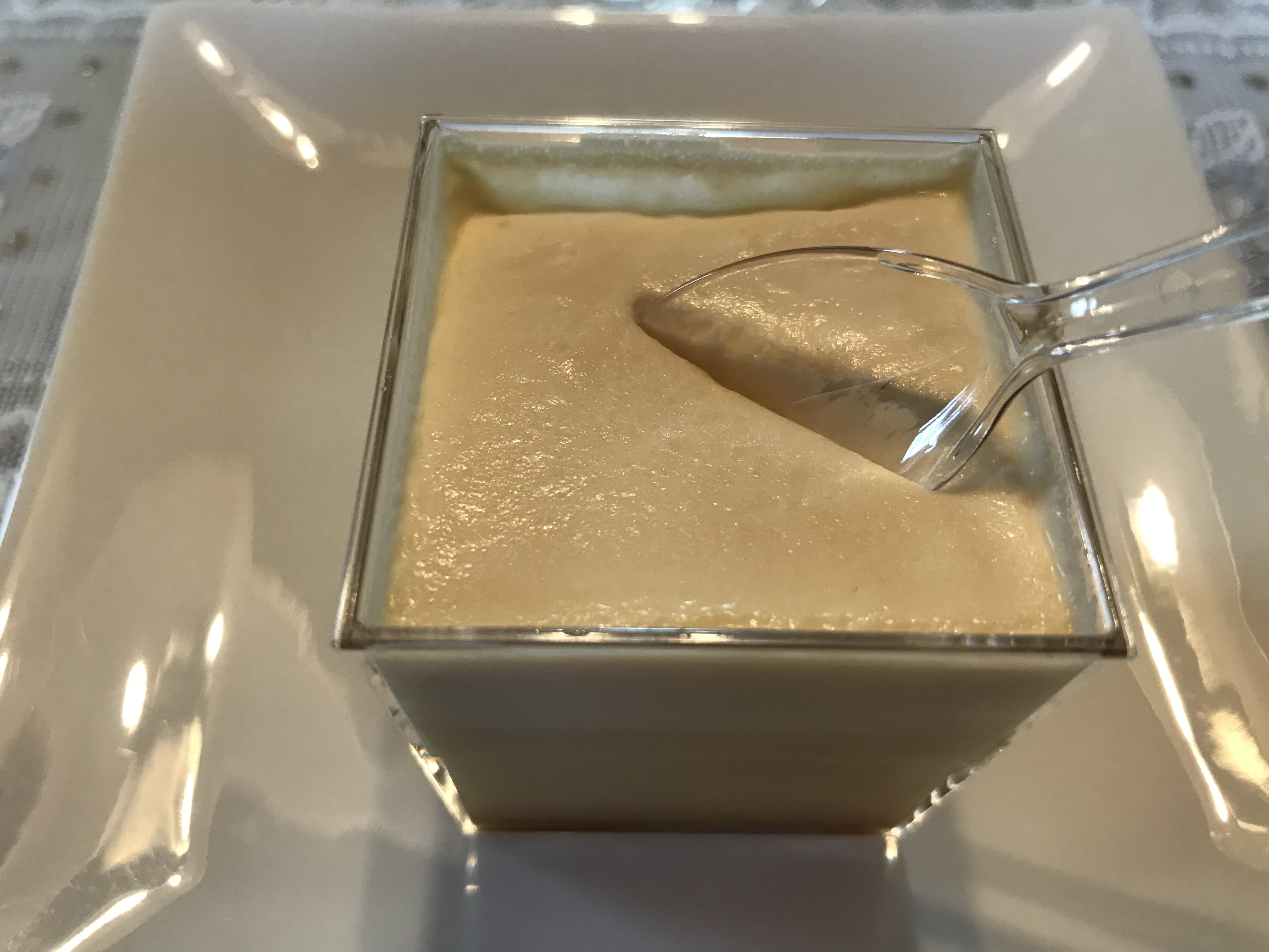 この江戸流行婦凛ならではの四角いプラ容器がとても素敵です。付属のスプーンはリーフ型スプーンと言って、このプリンの四角い容器の特殊な形の角までしっかりすくって食べられる仕様になっています。