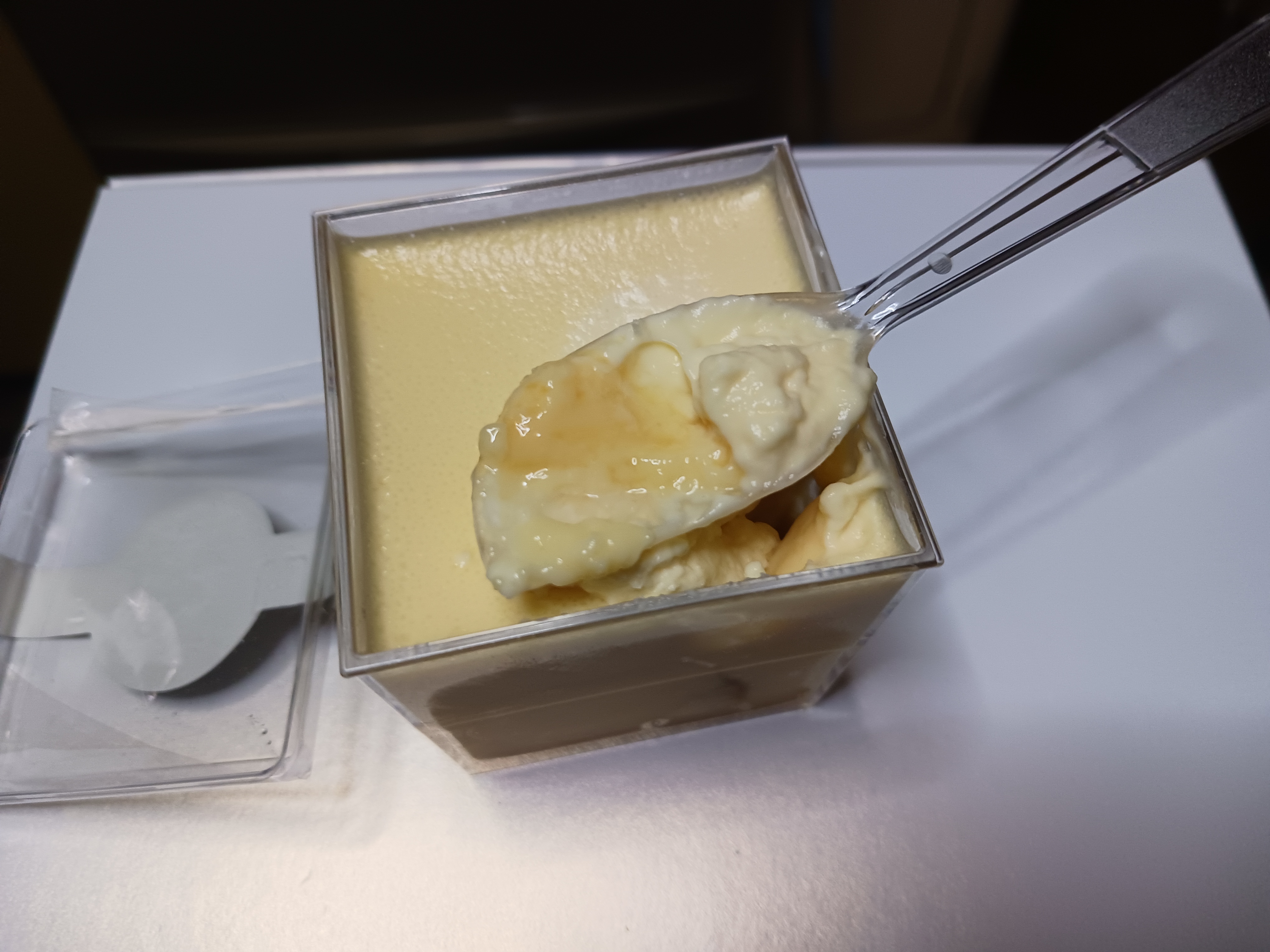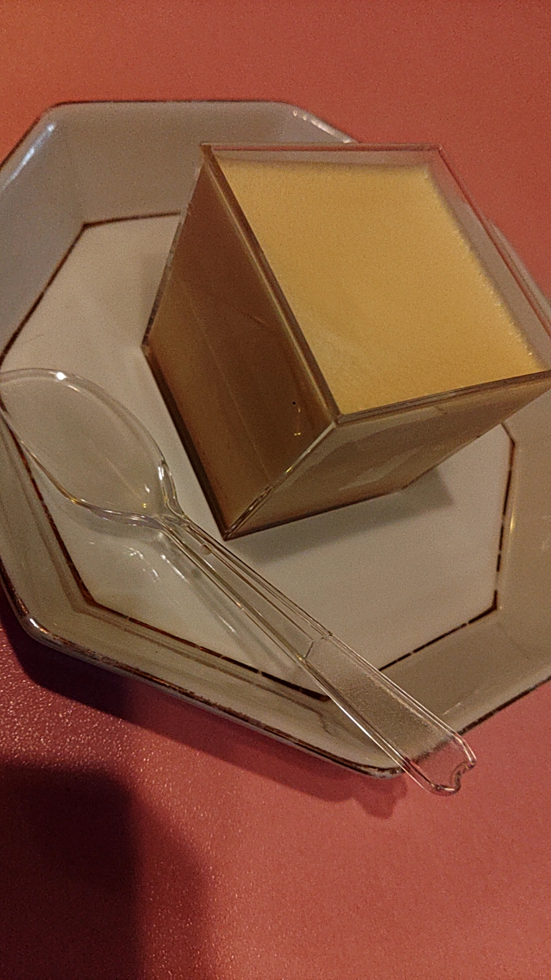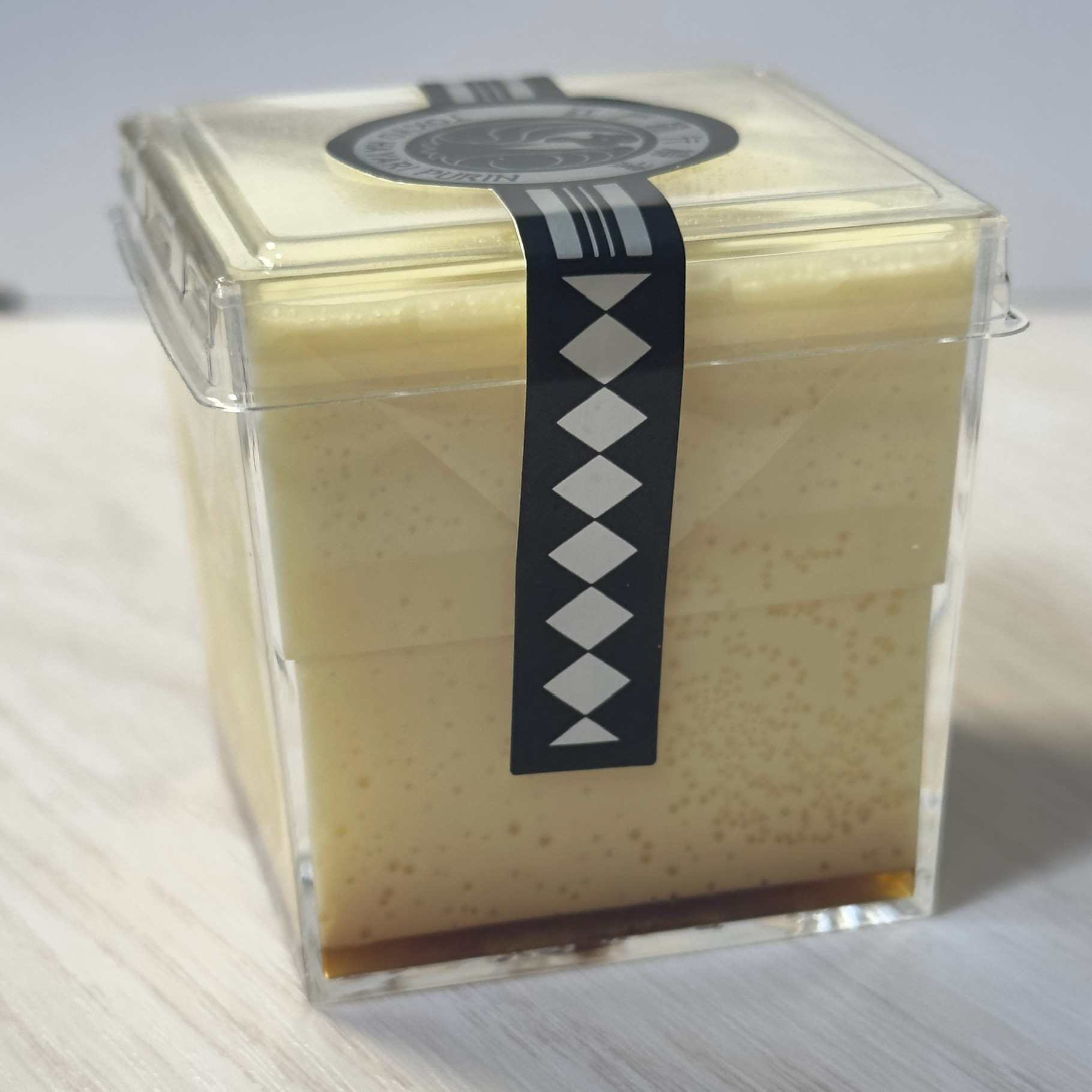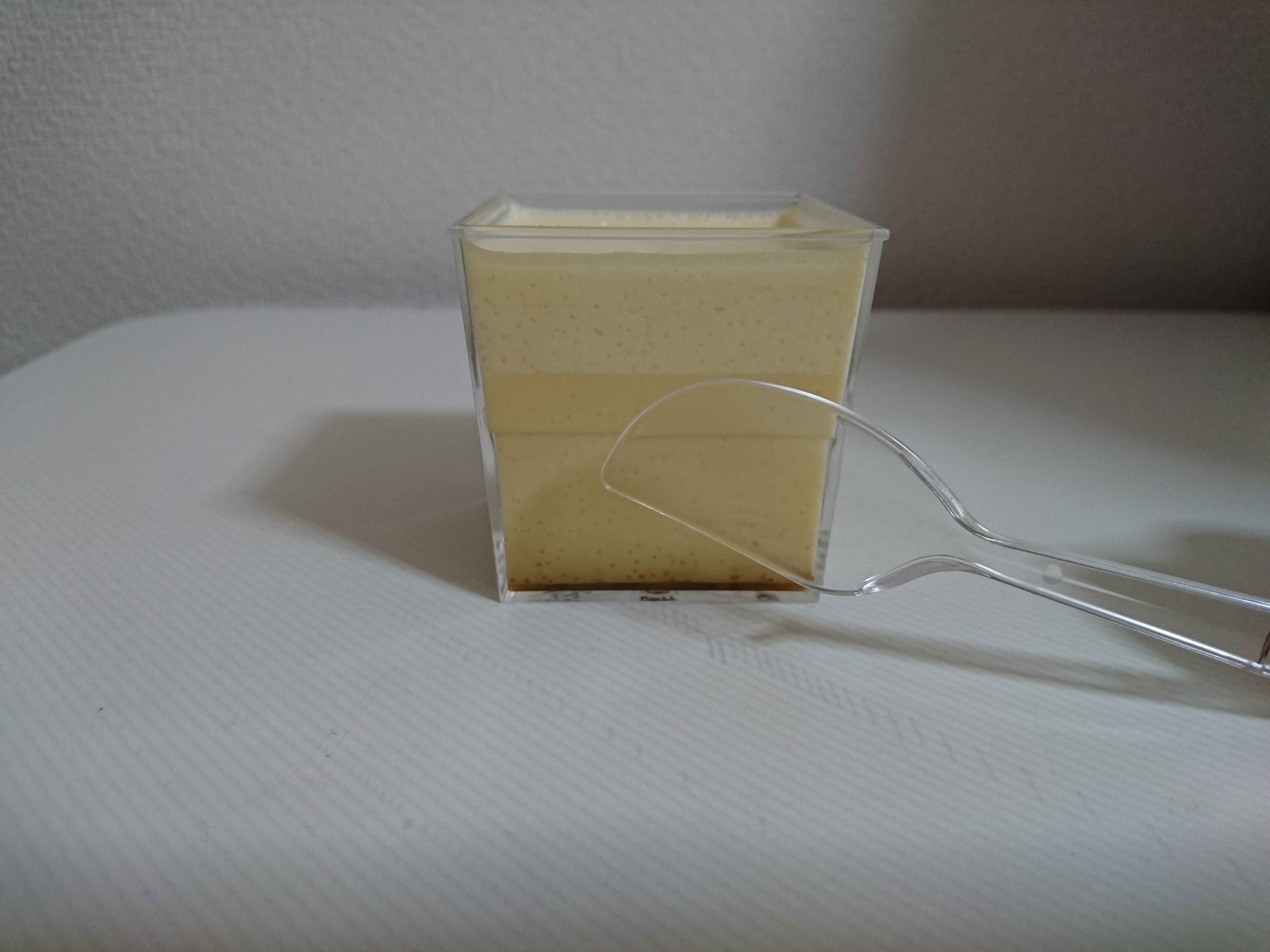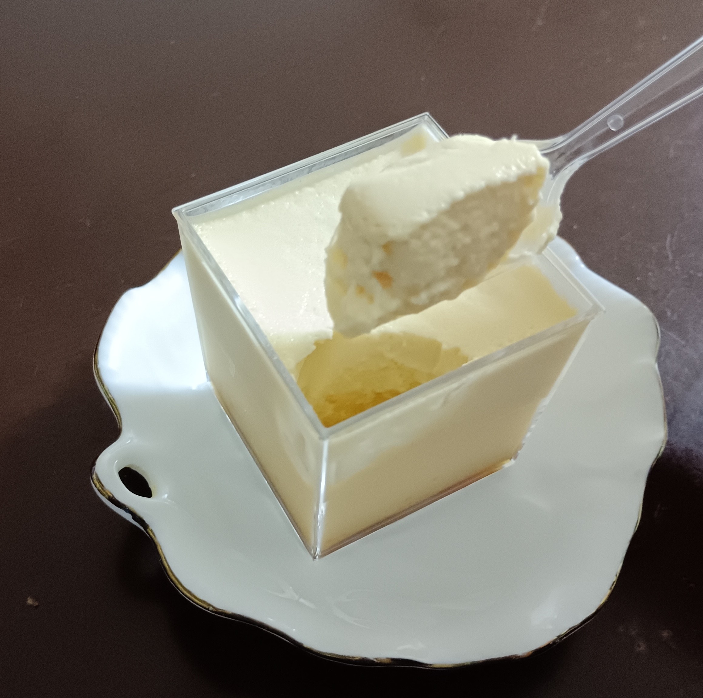 この江戸流行婦凛ならではの四角いプラ容器がとても素敵です。付属のスプーンはリーフ型スプーンと言って、このプリンの四角い容器の特殊な形の角までしっかりすくって食べられる仕様になっています。