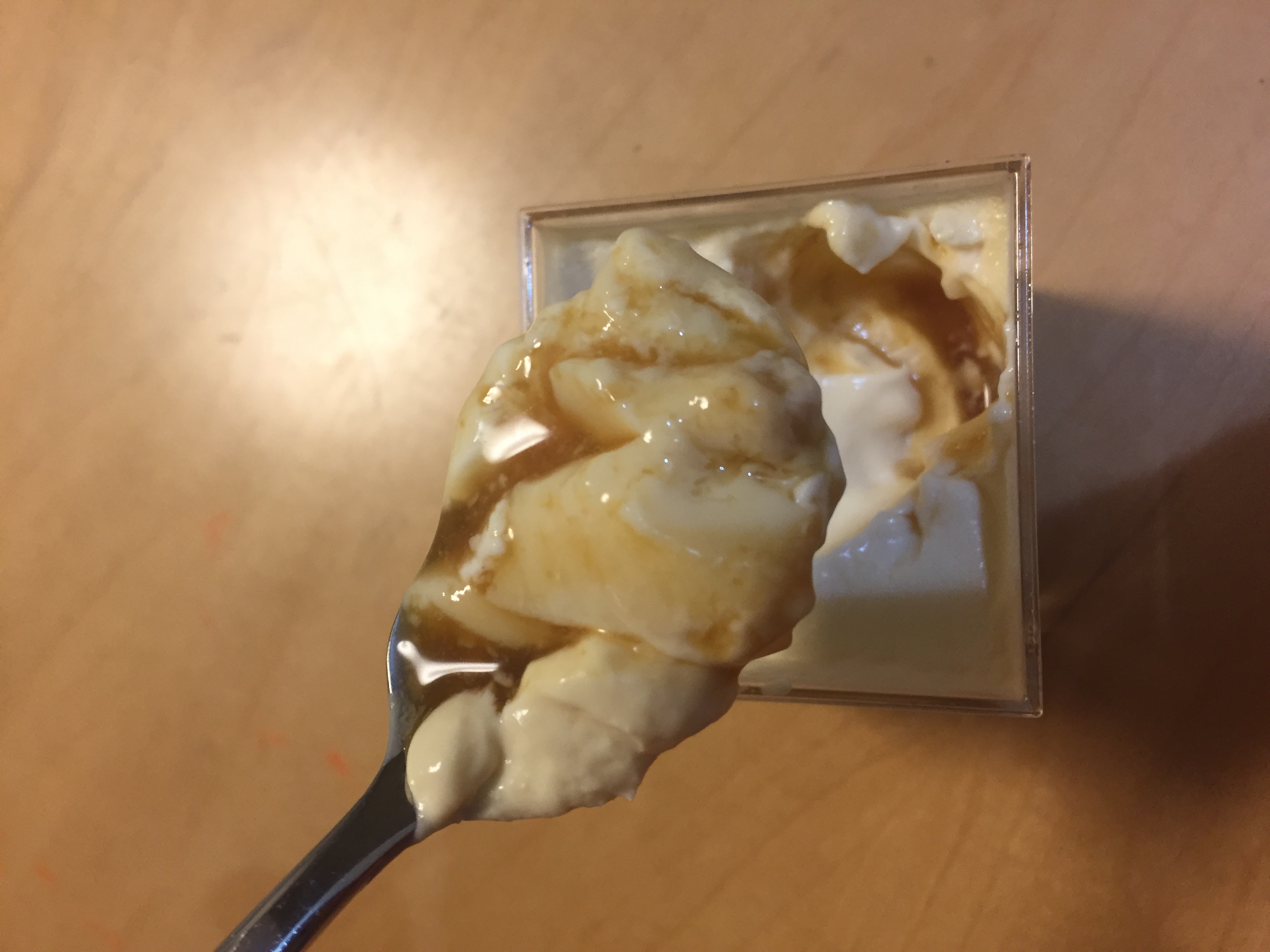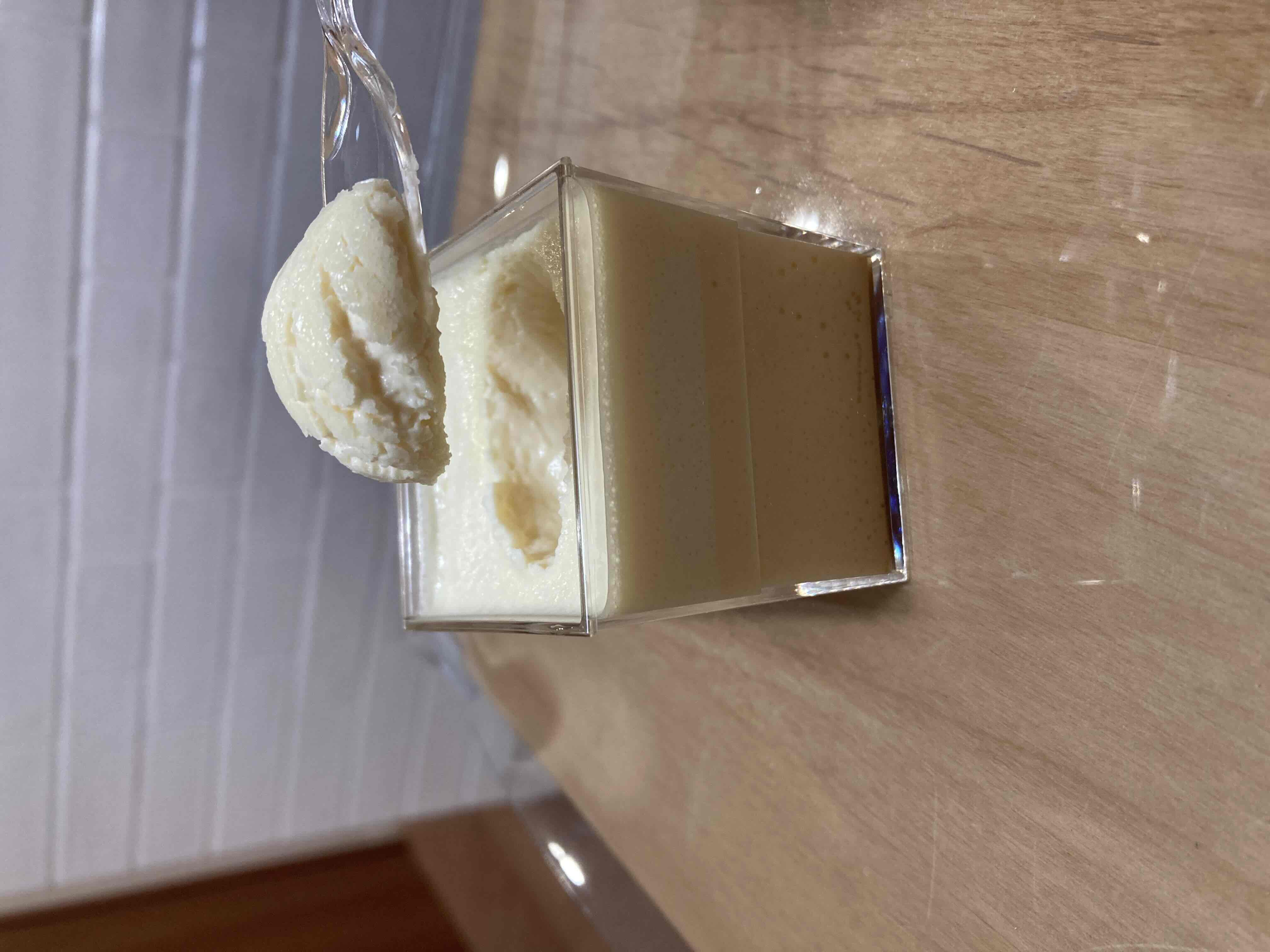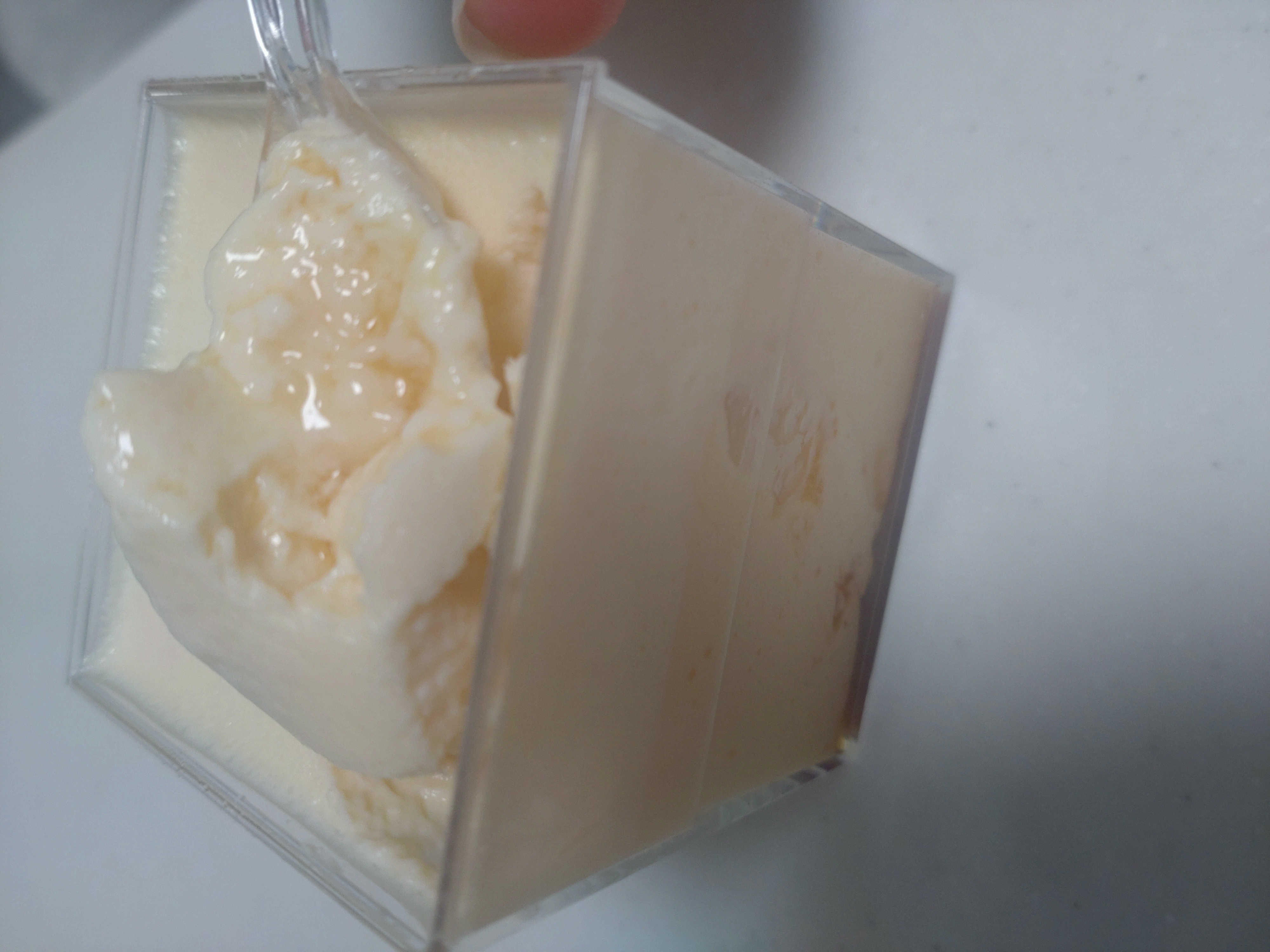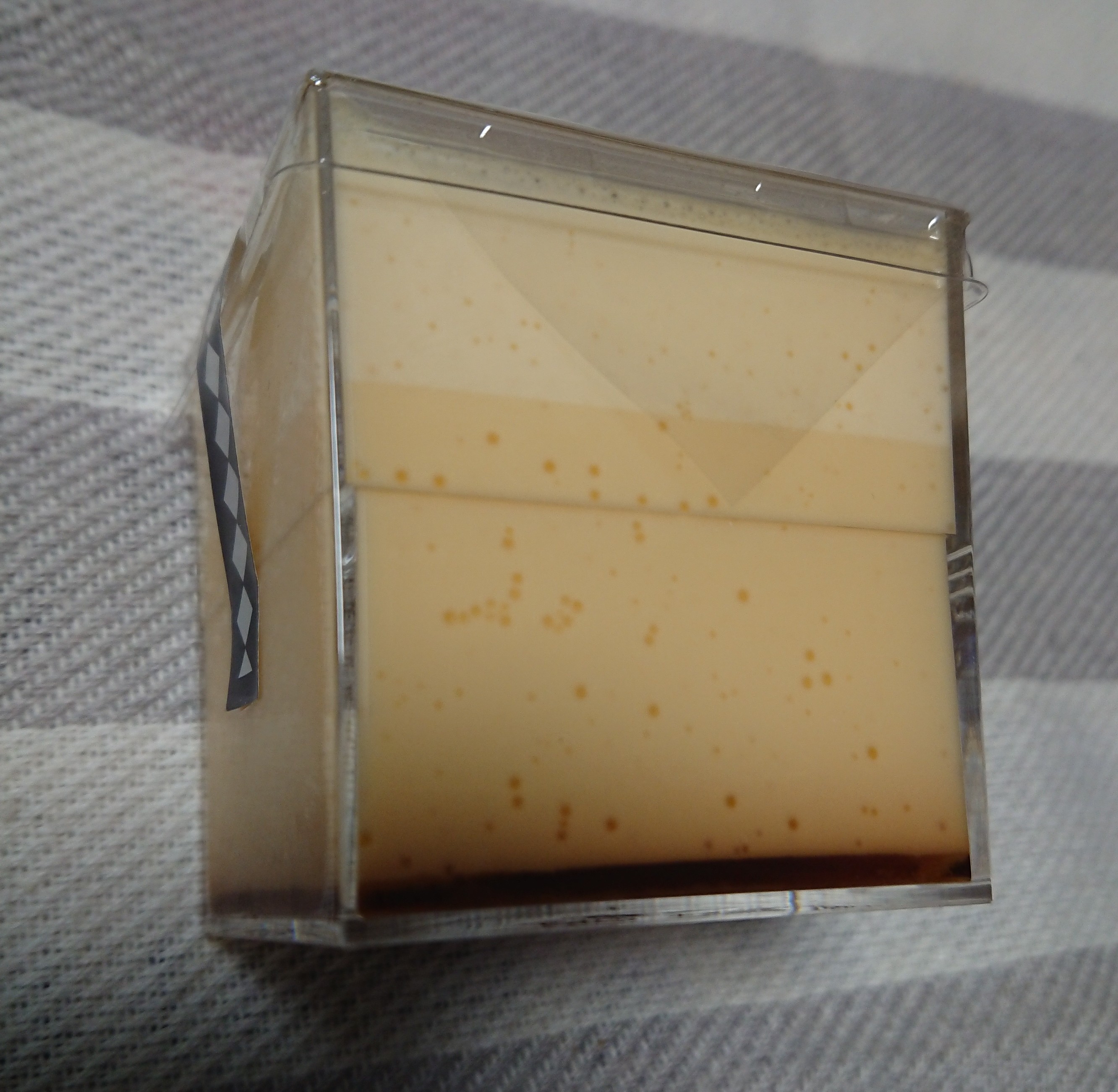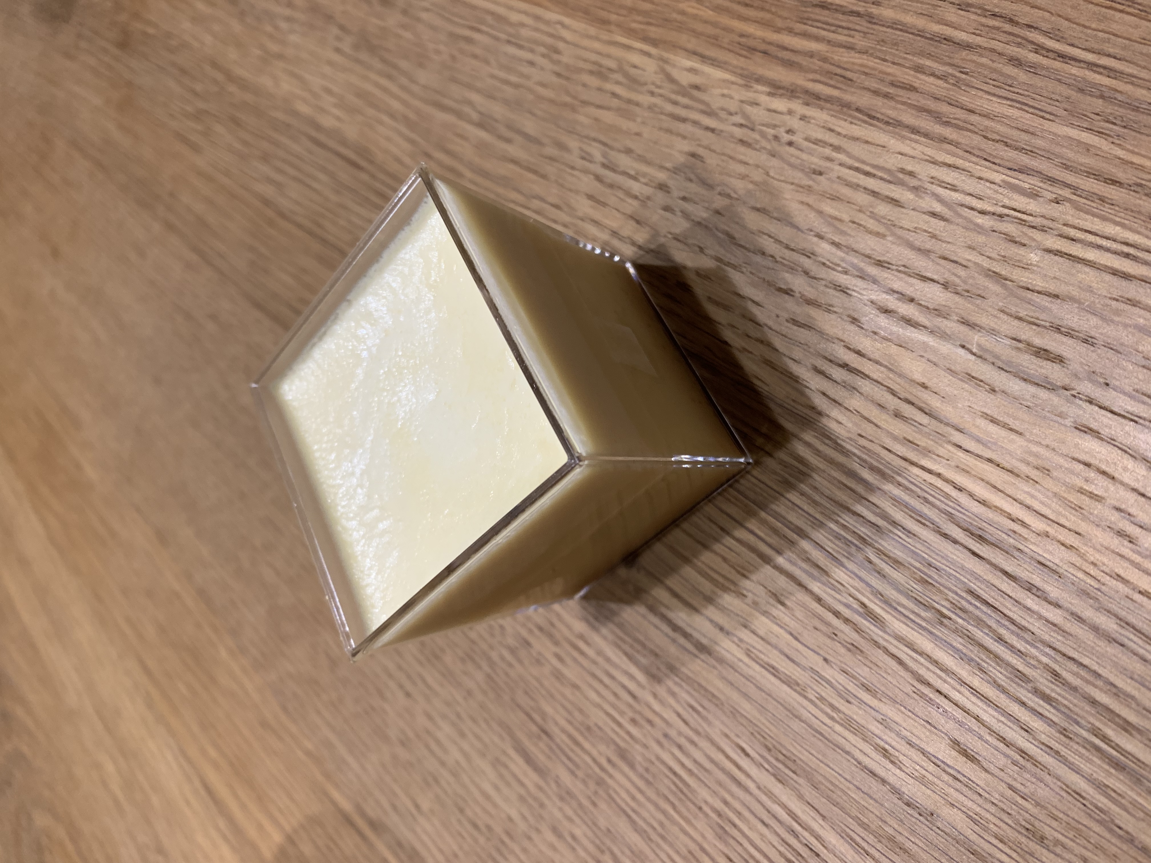 この江戸流行婦凛ならではの四角いプラ容器がとても素敵です。付属のスプーンはリーフ型スプーンと言って、このプリンの四角い容器の特殊な形の角までしっかりすくって食べられる仕様になっています。