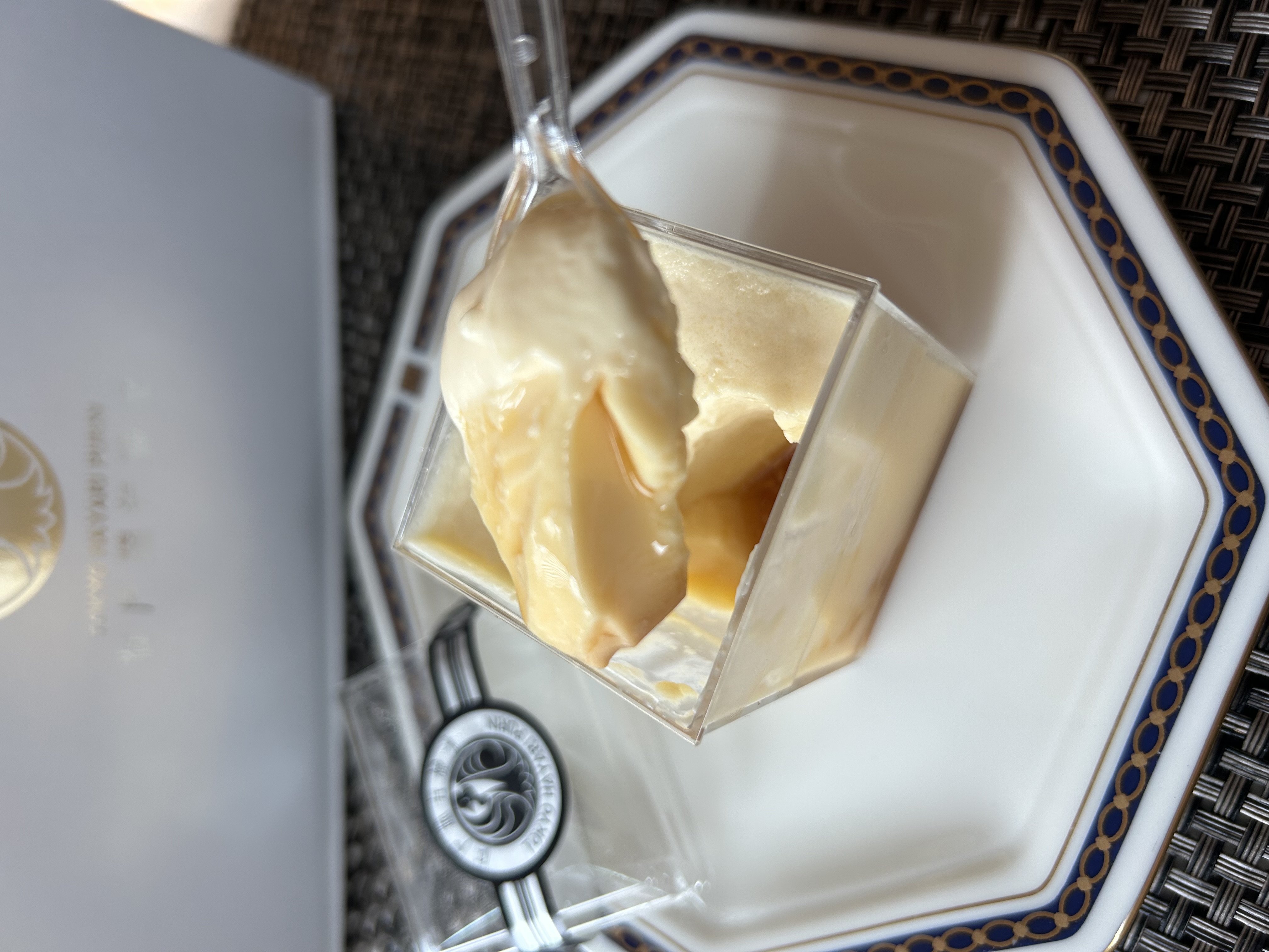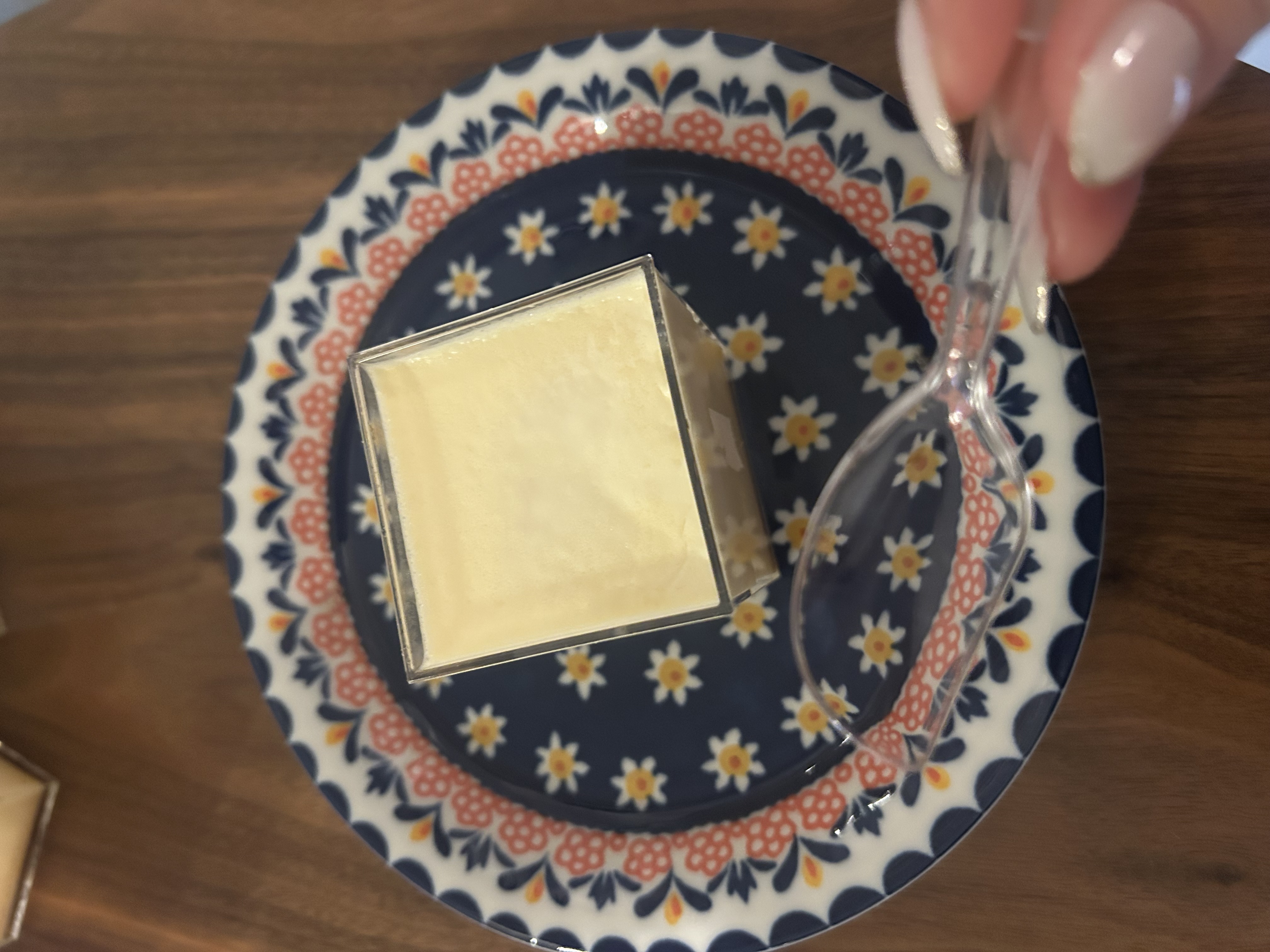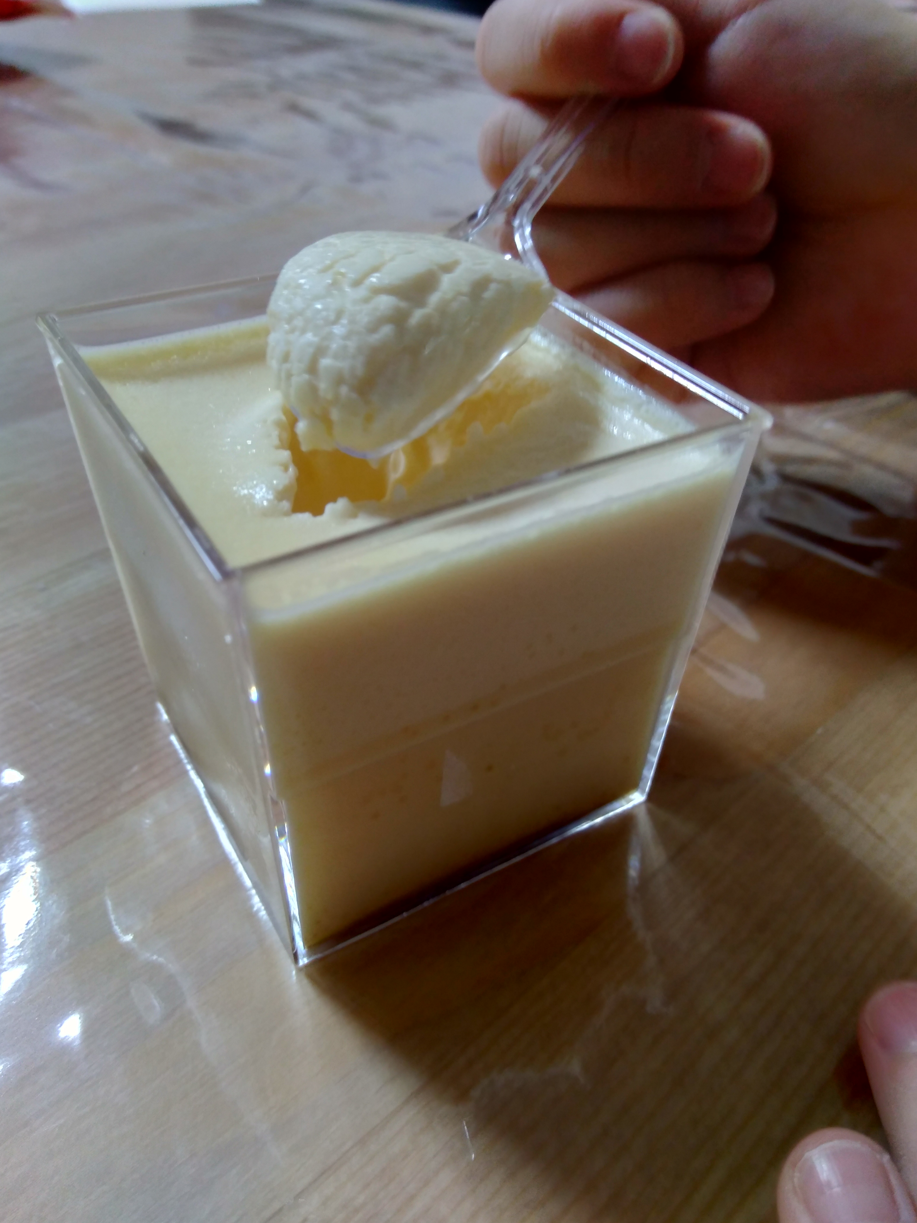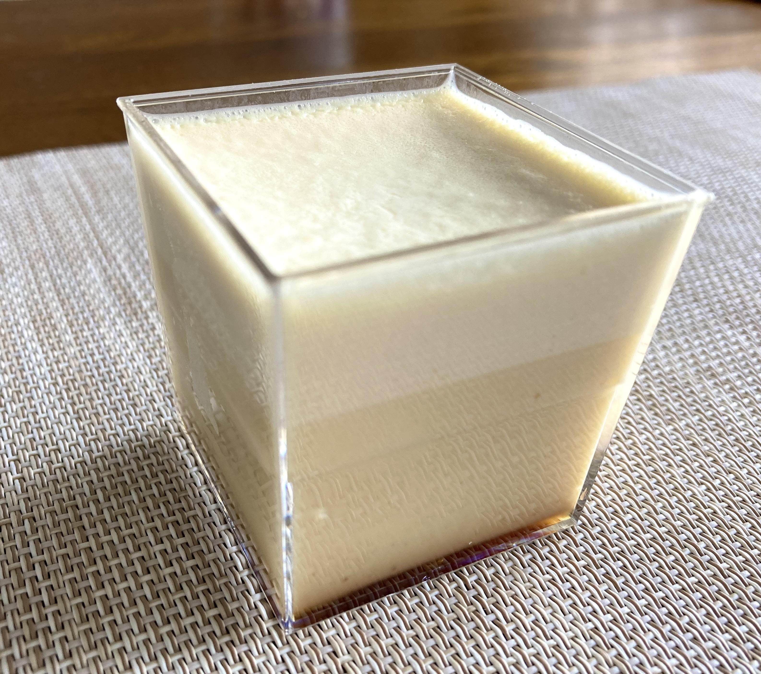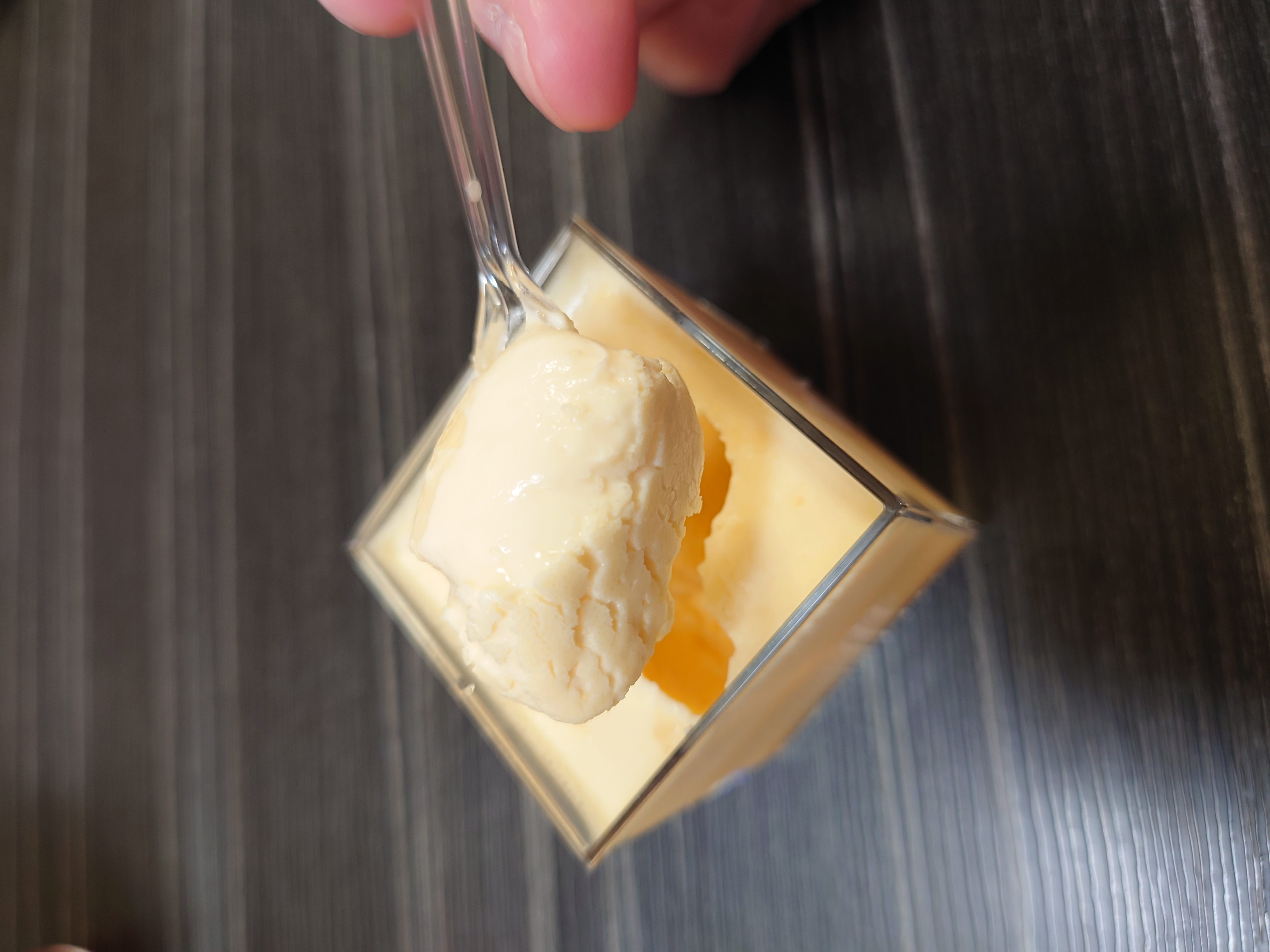 この江戸流行婦凛ならではの四角いプラ容器がとても素敵です。付属のスプーンはリーフ型スプーンと言って、このプリンの四角い容器の特殊な形の角までしっかりすくって食べられる仕様になっています。
