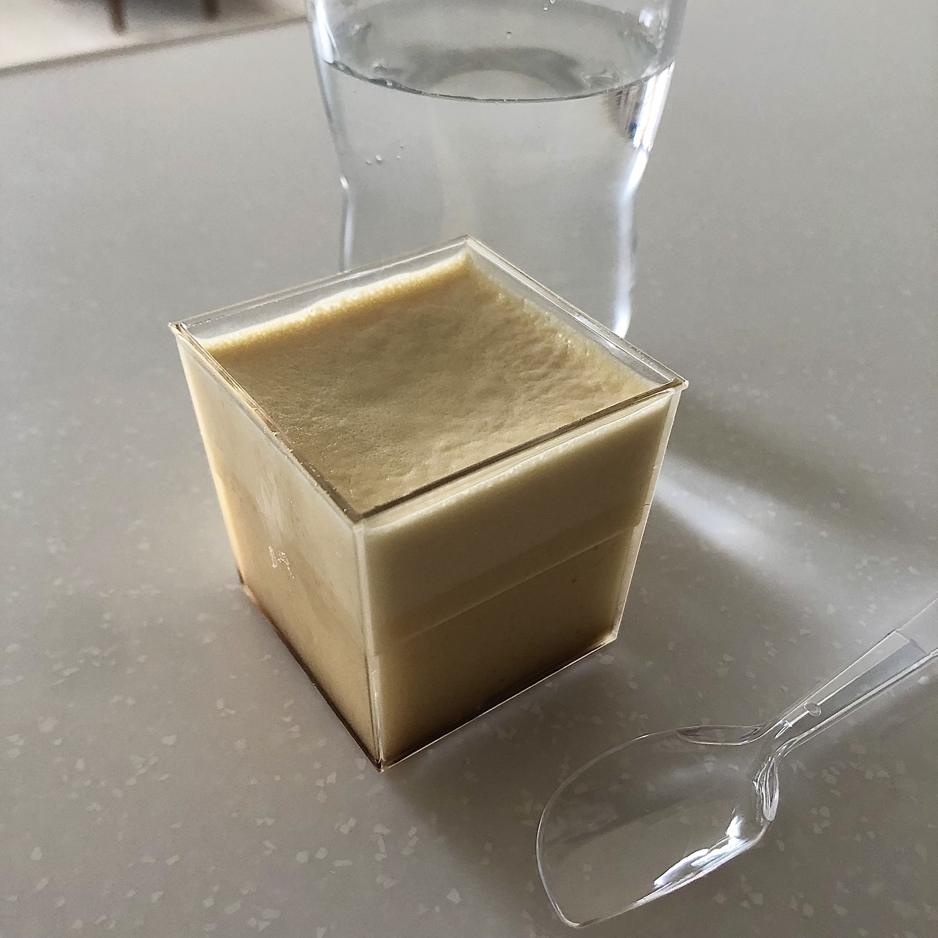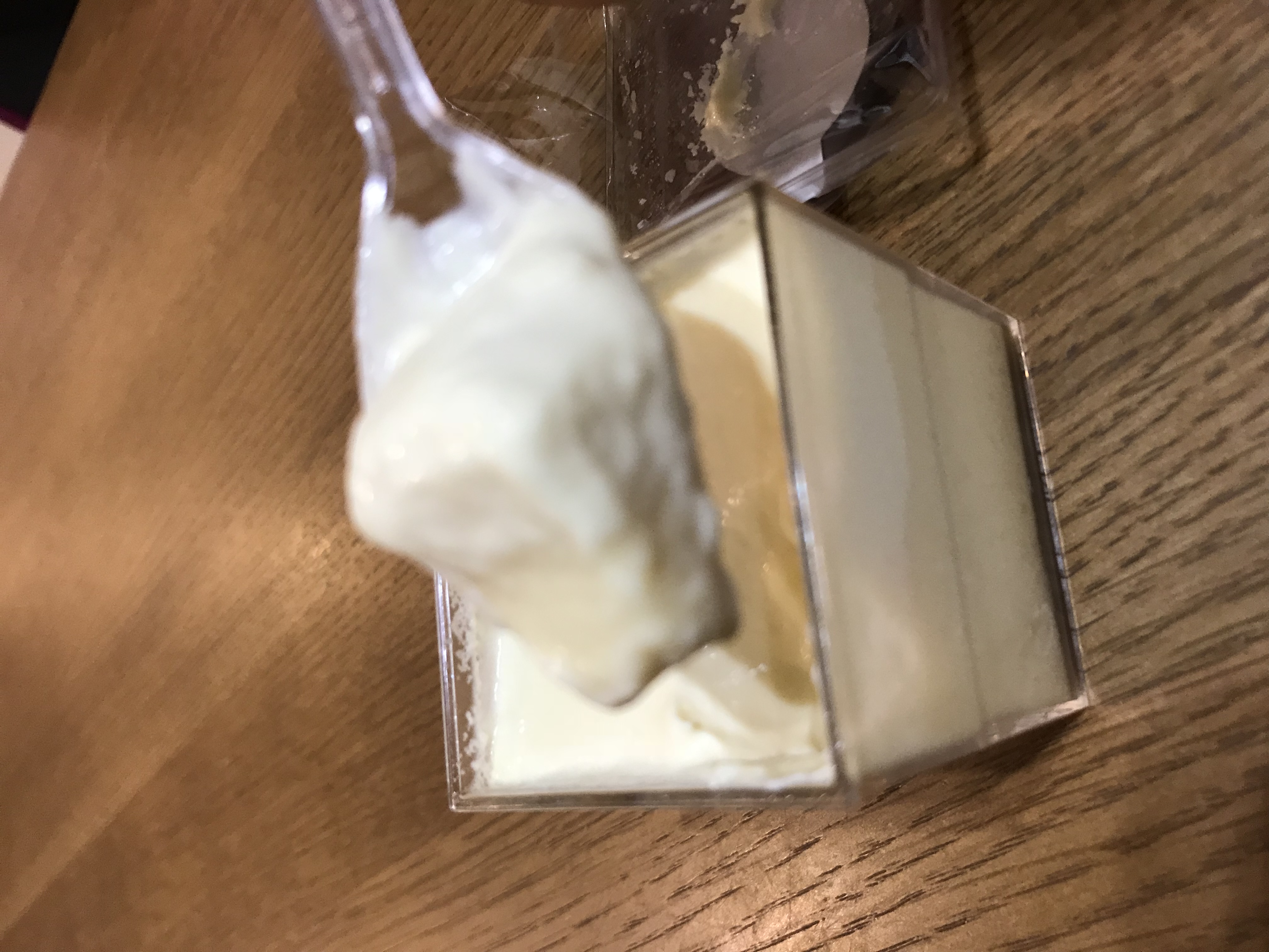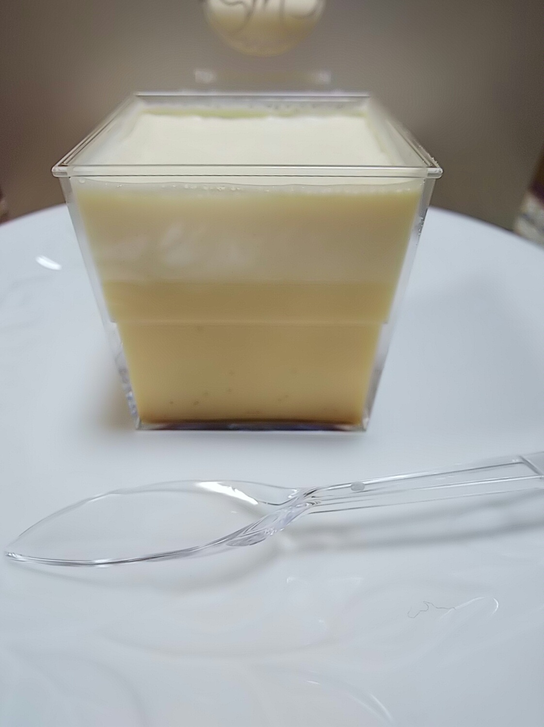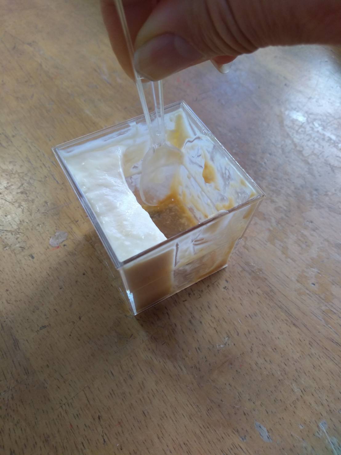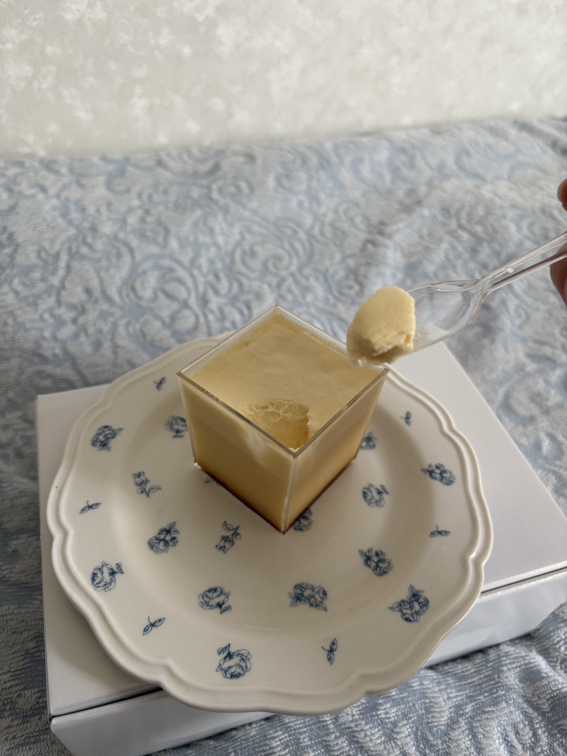 この江戸流行婦凛ならではの四角いプラ容器がとても素敵です。付属のスプーンはリーフ型スプーンと言って、このプリンの四角い容器の特殊な形の角までしっかりすくって食べられる仕様になっています。
