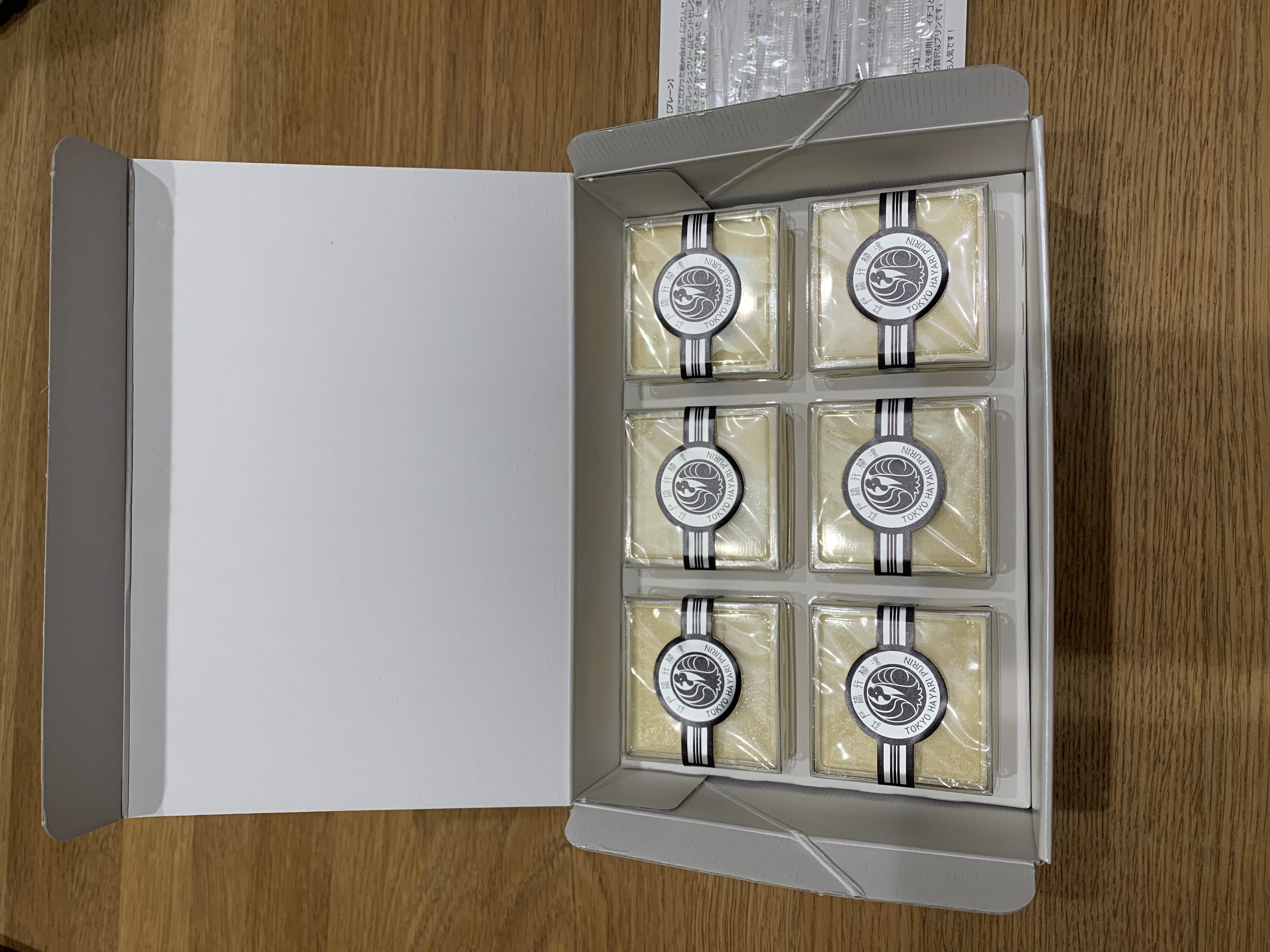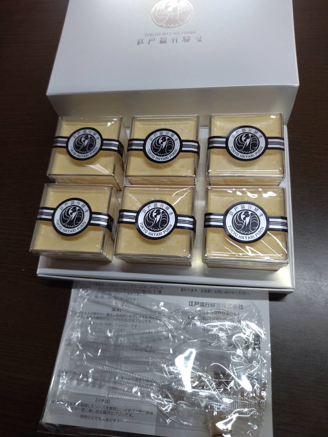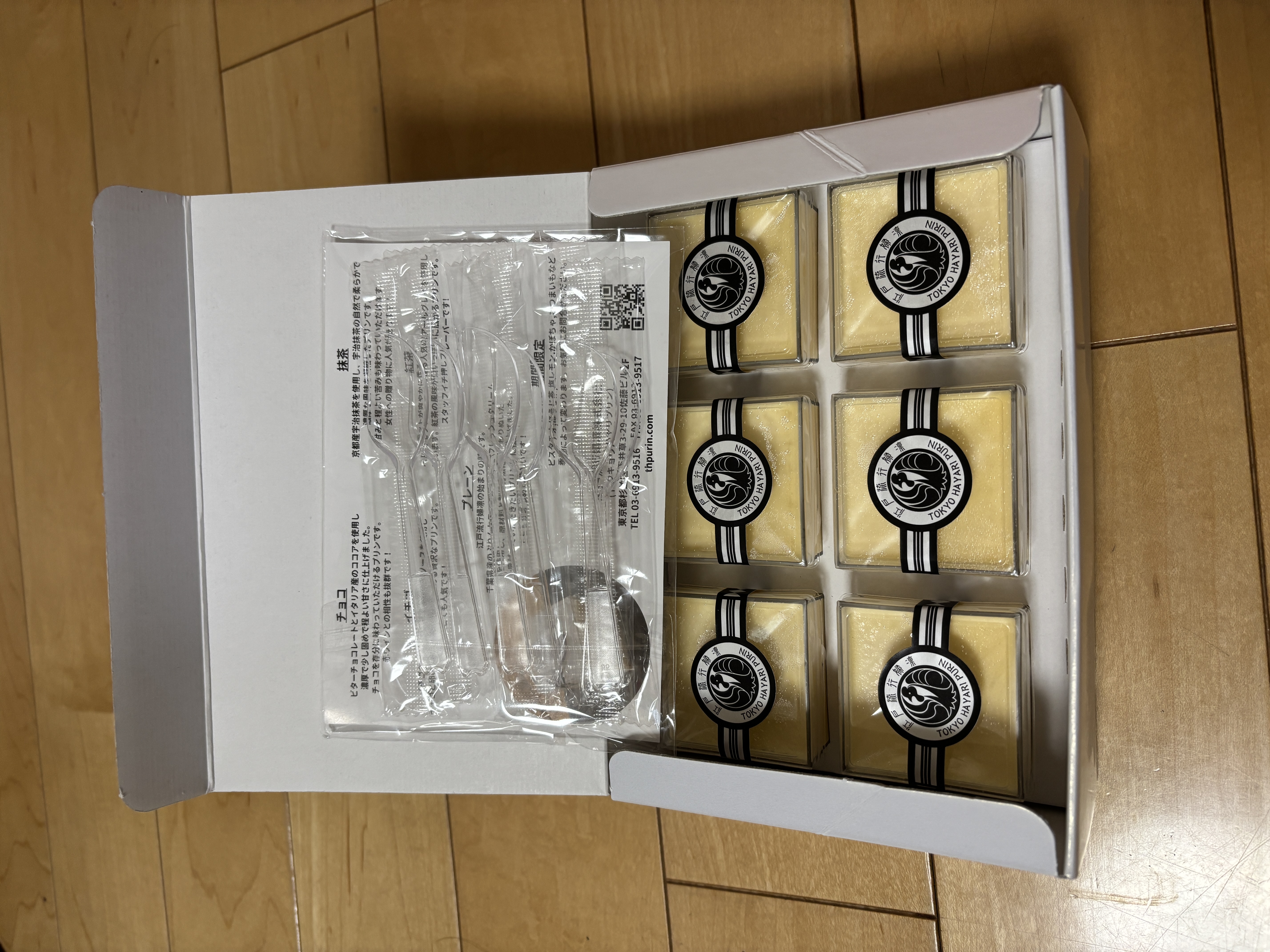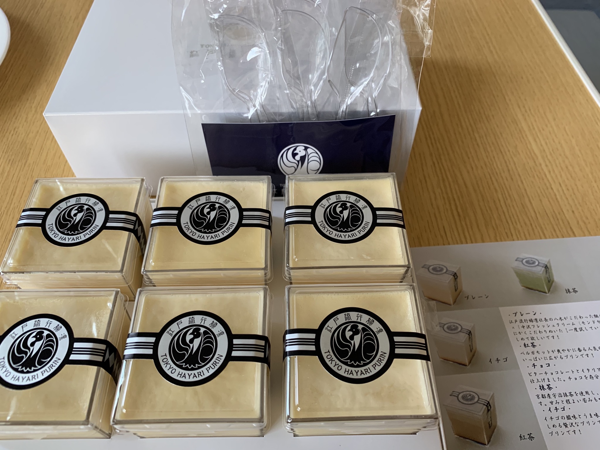 箱の中身は、プリンのプレーン6個、プラスチックのスプーン6個、商品紹介のリーフレット1枚が入っています。
