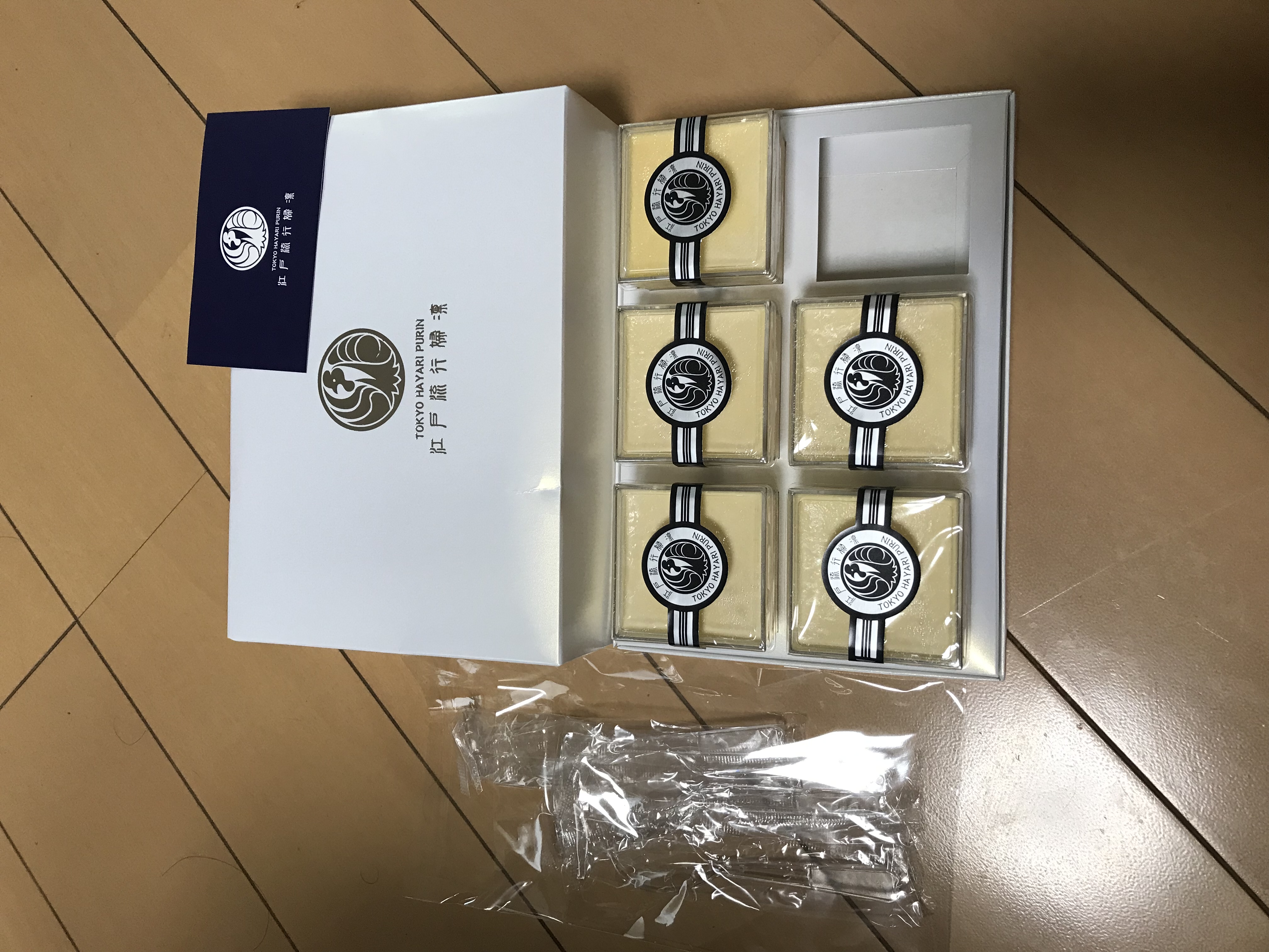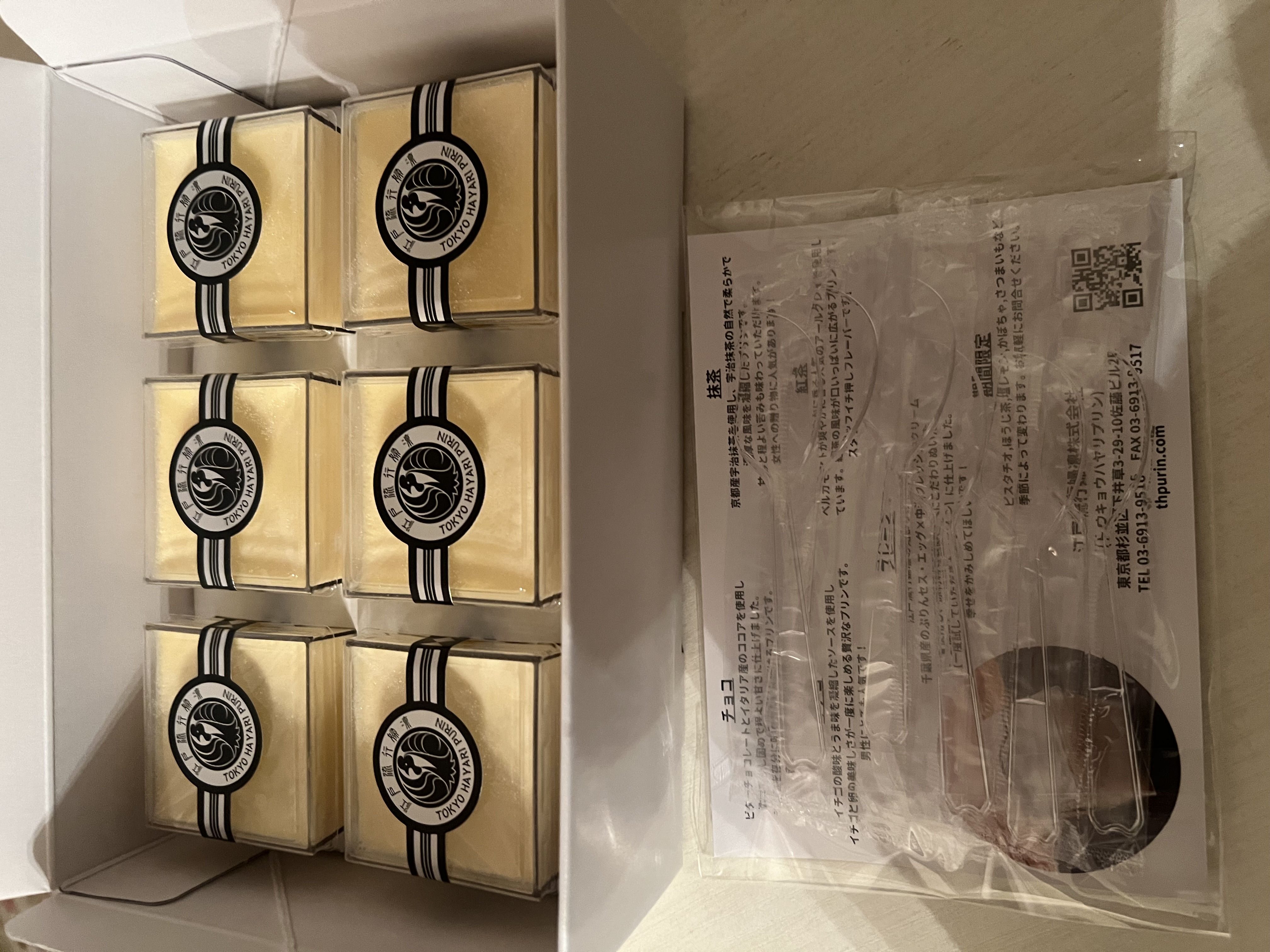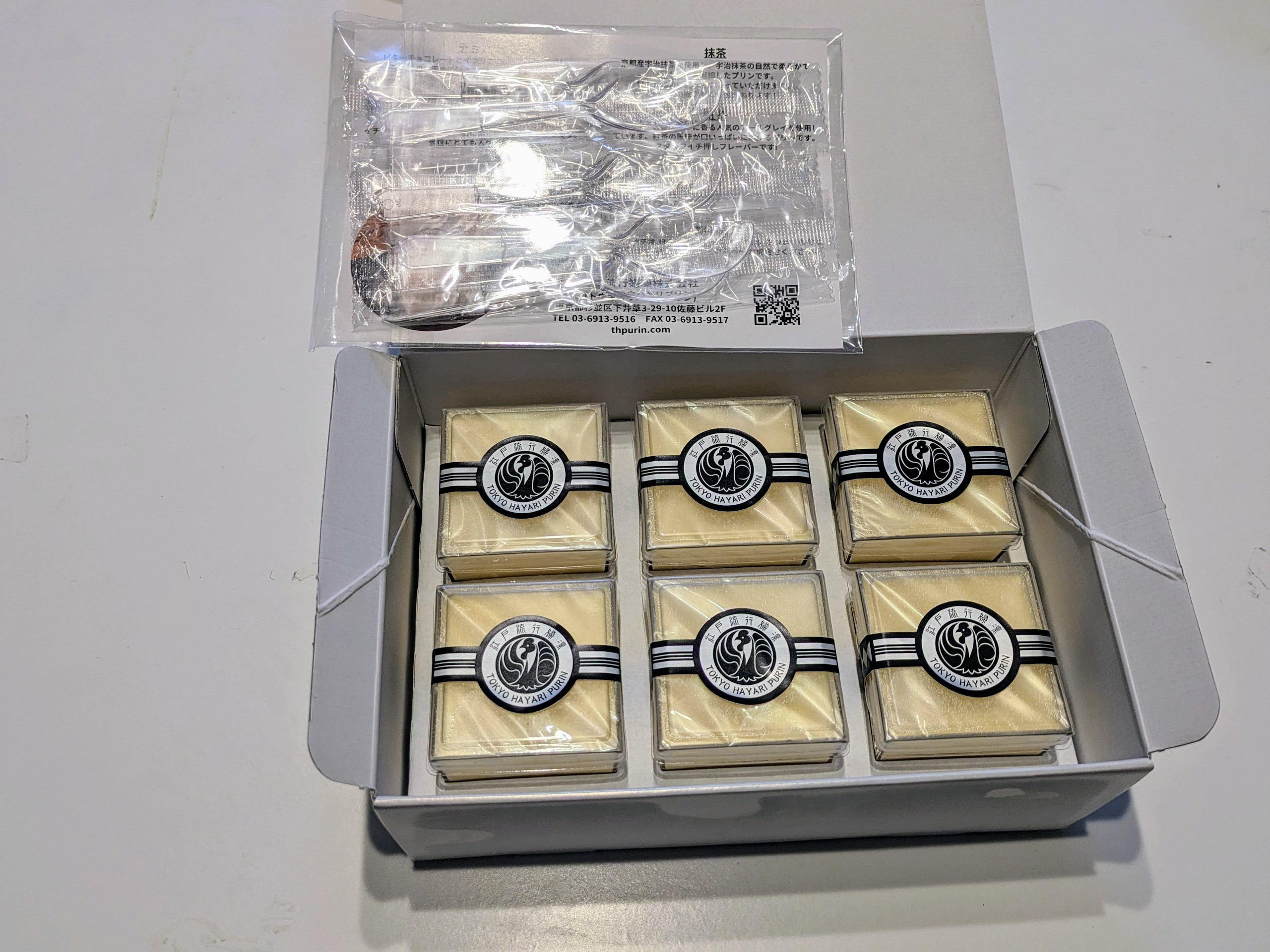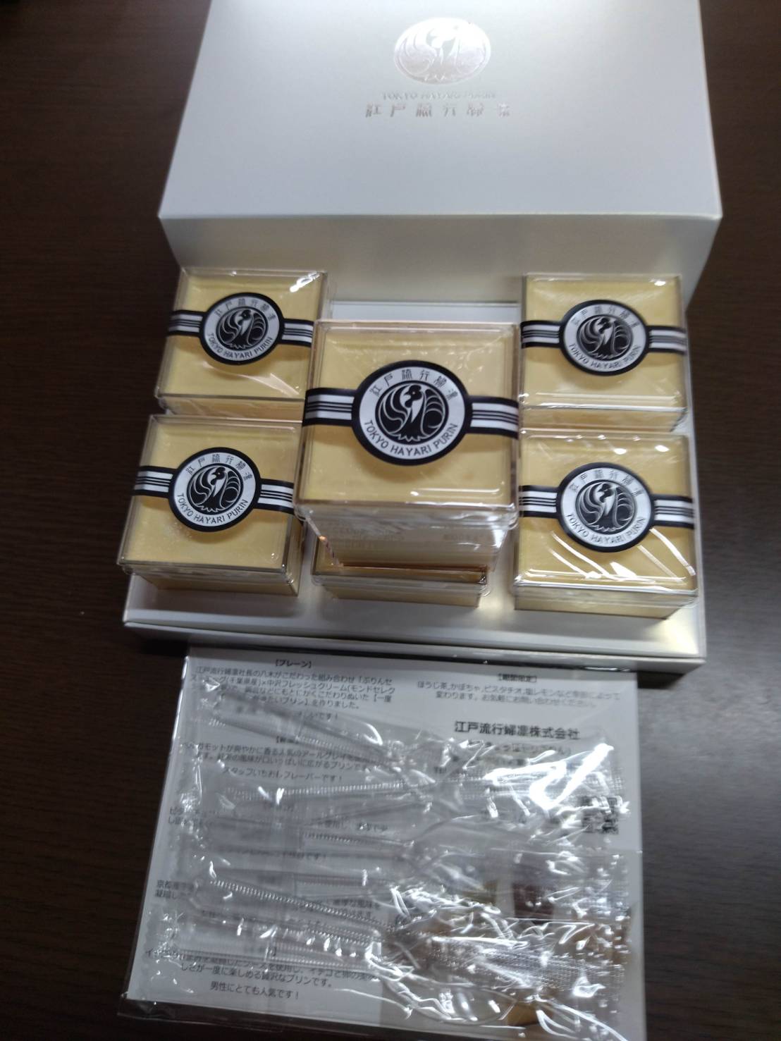 箱の中身は、プリンのプレーン6個、プラスチックのスプーン6個、商品紹介のリーフレット1枚が入っています。