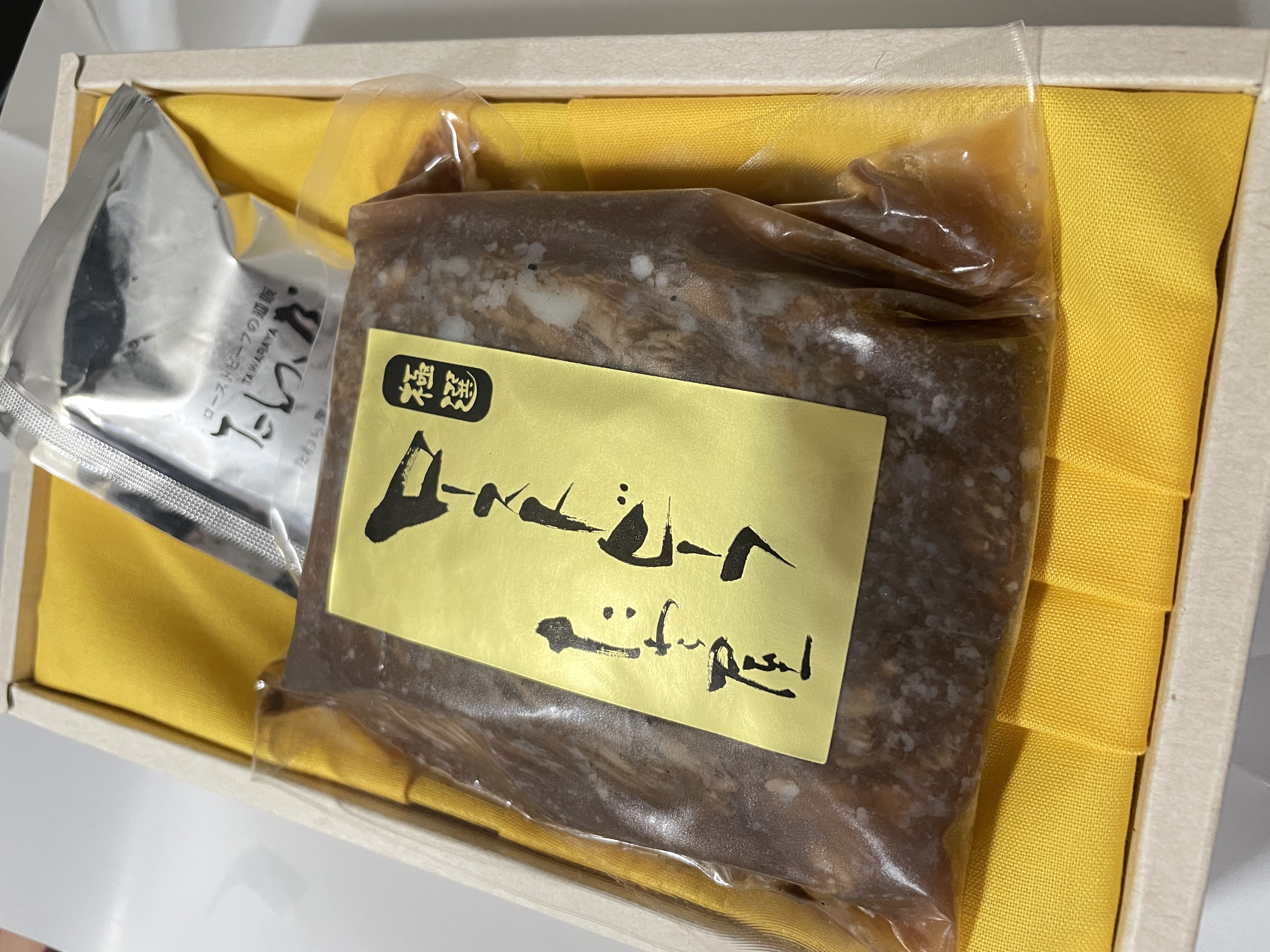次に添付のたれをかけてみました。原材料を見てみると赤ワインが入っていてさらに深みのある芳醇な大人の味に。