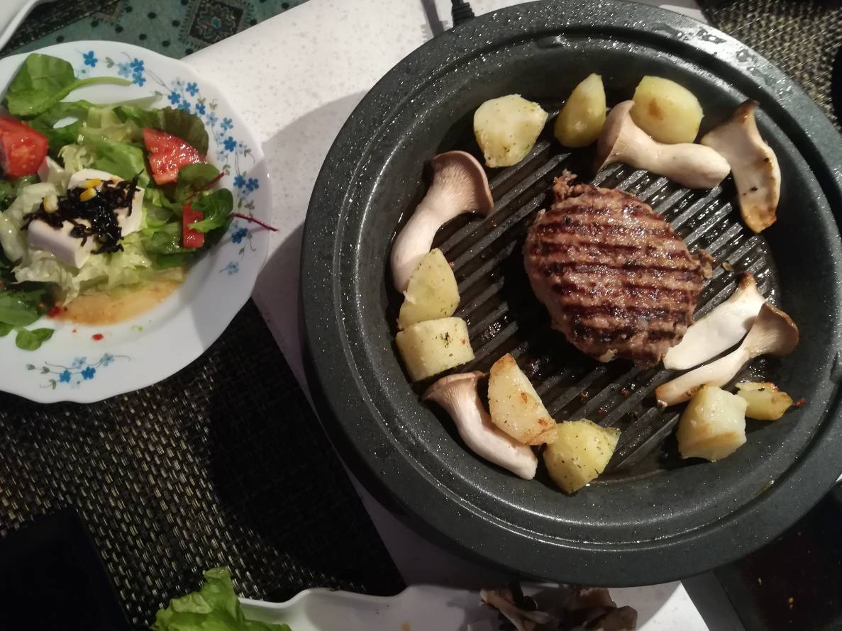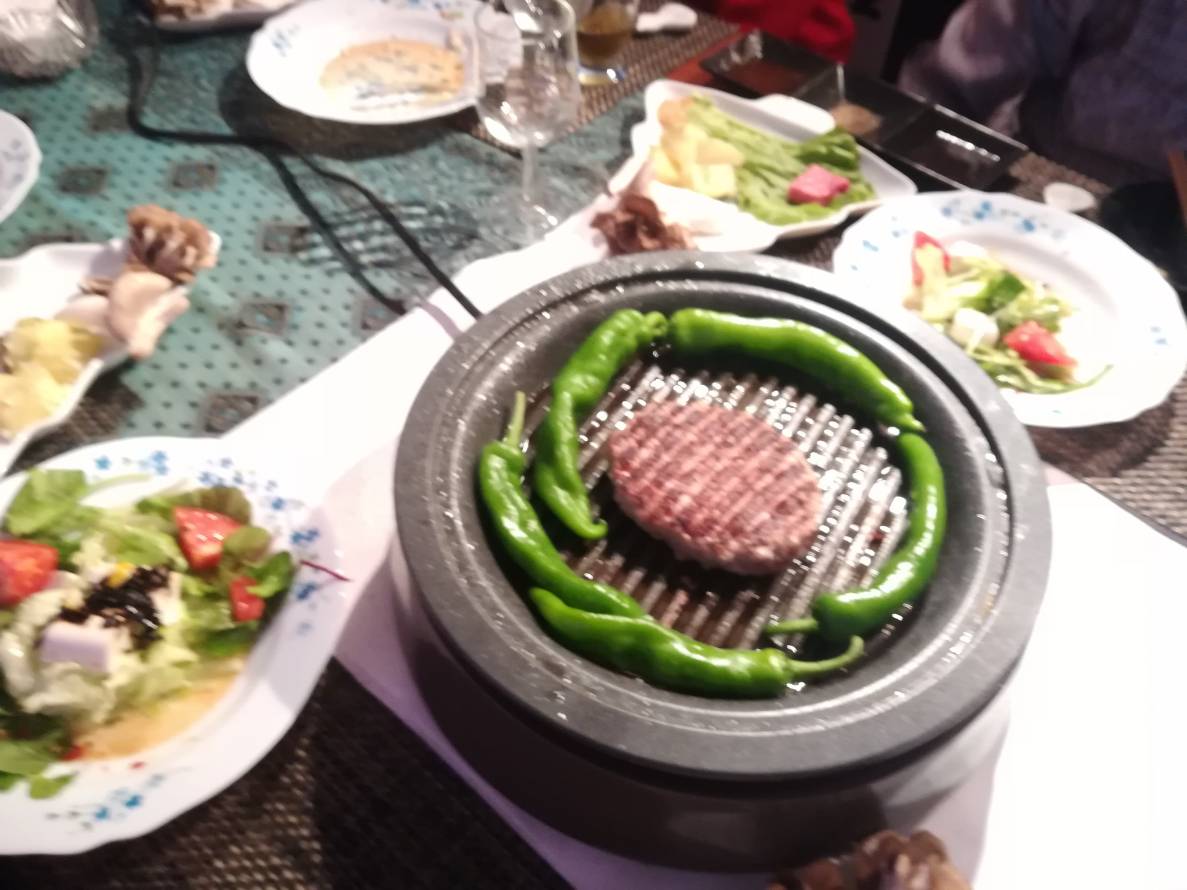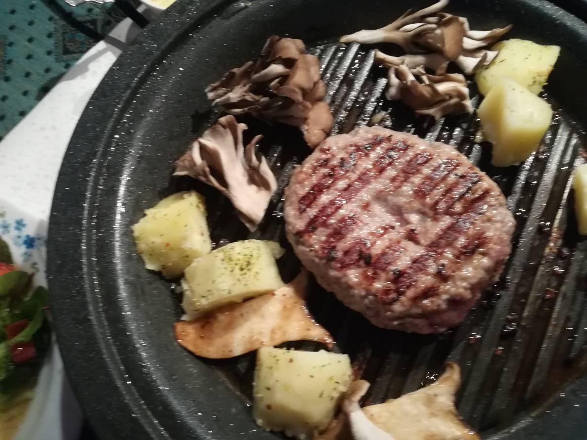 なので、今回は、肉汁を閉じ込めたくて、あえてオーブンの両面グリル機能を駆使して焼くことにしました。結果、、膨らむ膨らむー!!ぱんぱんに膨れ上がって最高の仕上がりになり食卓にならべました。あえてシンプルに目玉焼きだけ添えて。