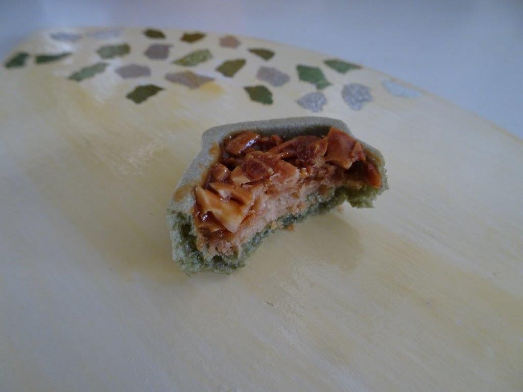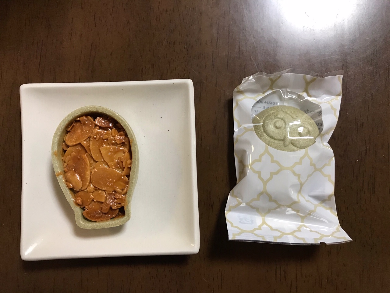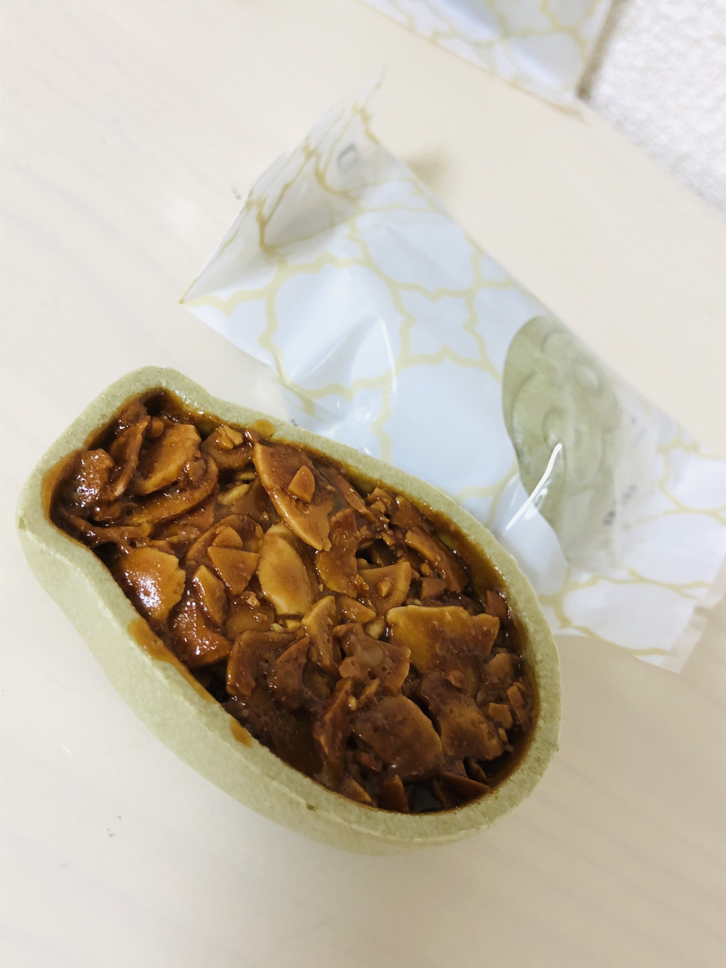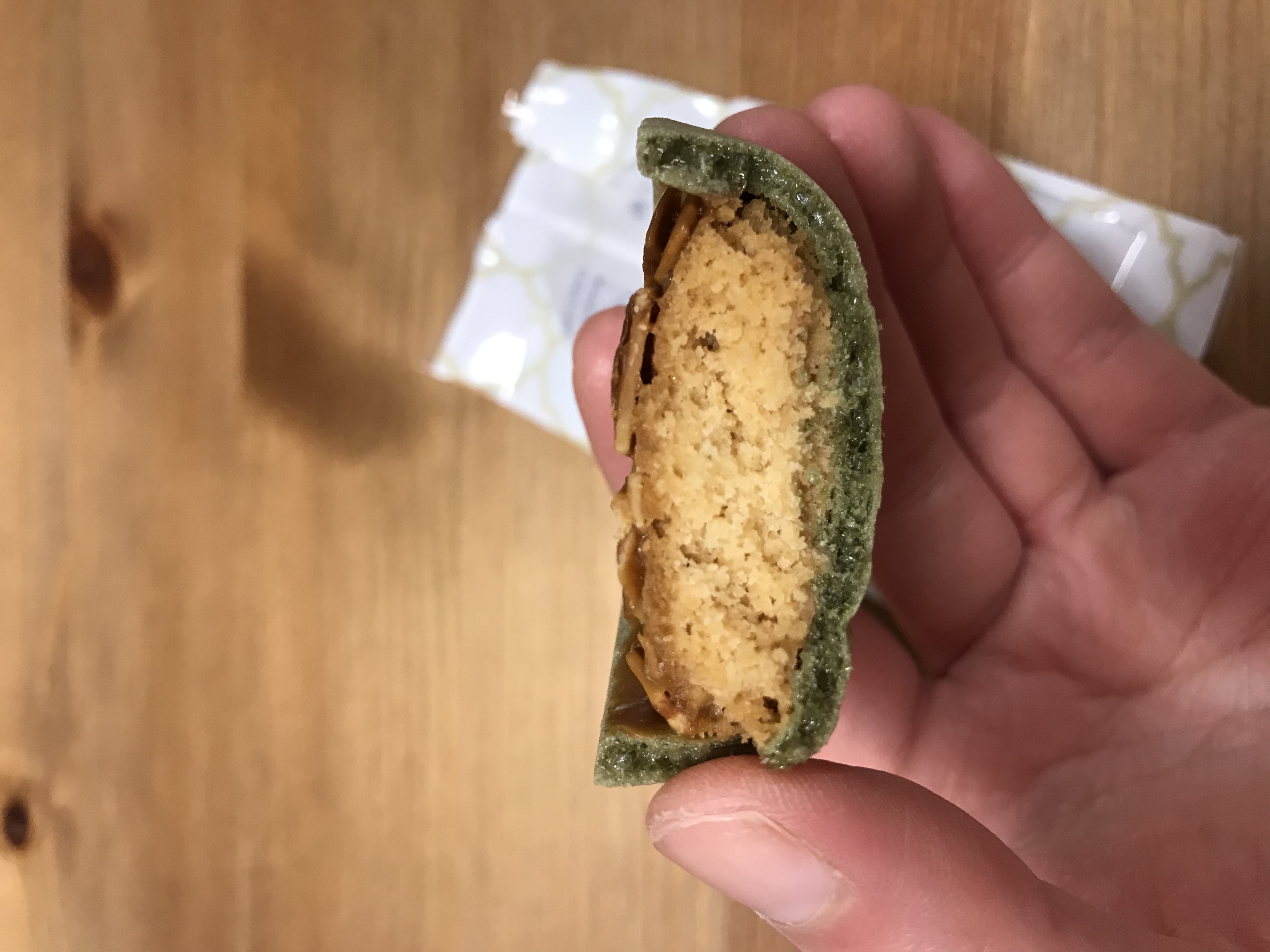 手のひらサイズのフロランタン、よもぎ最中皮の中に入ったアーモンドのキャラメリゼが濃厚な甘さで1個食べると小腹が充分満たされます。