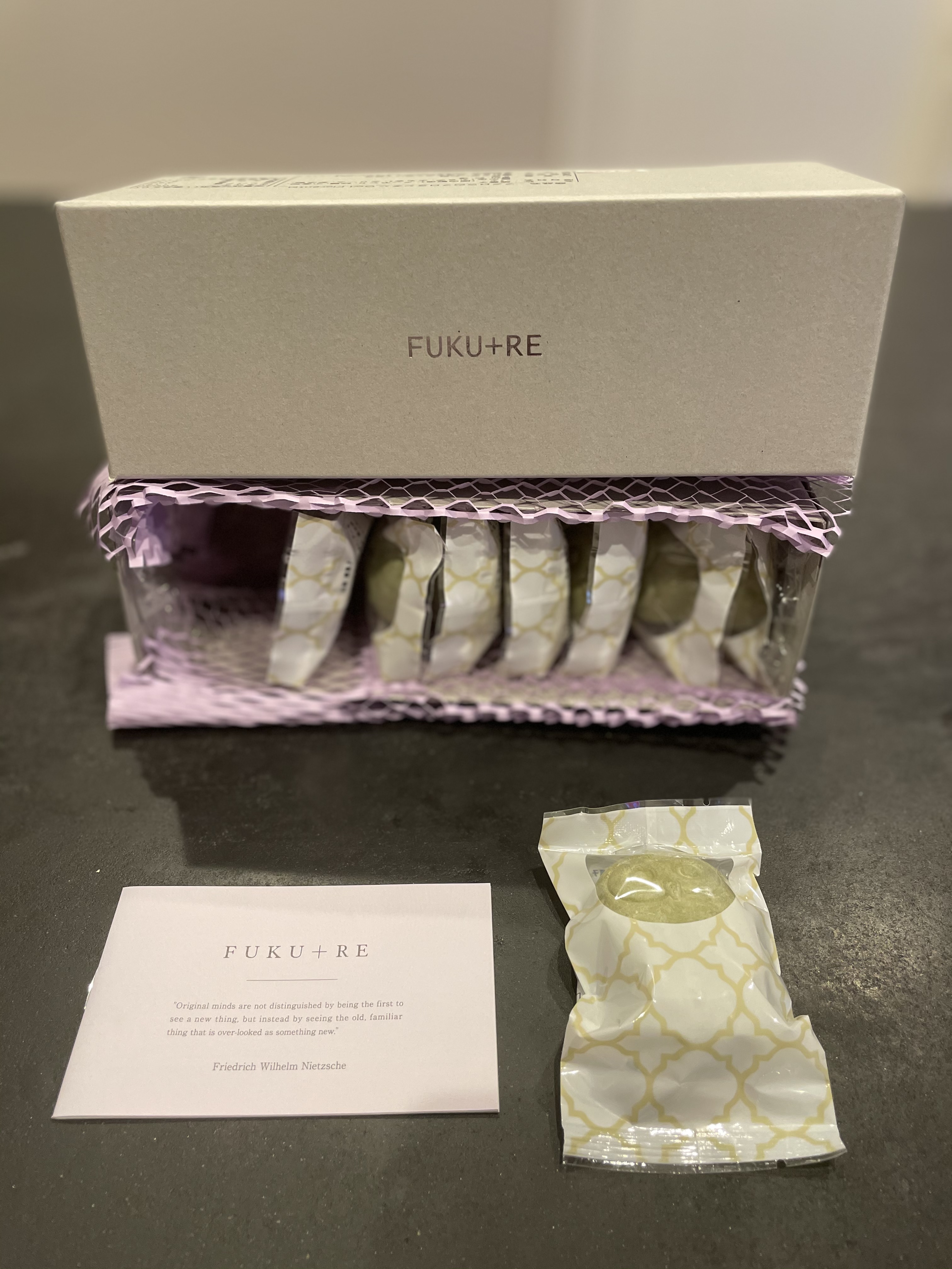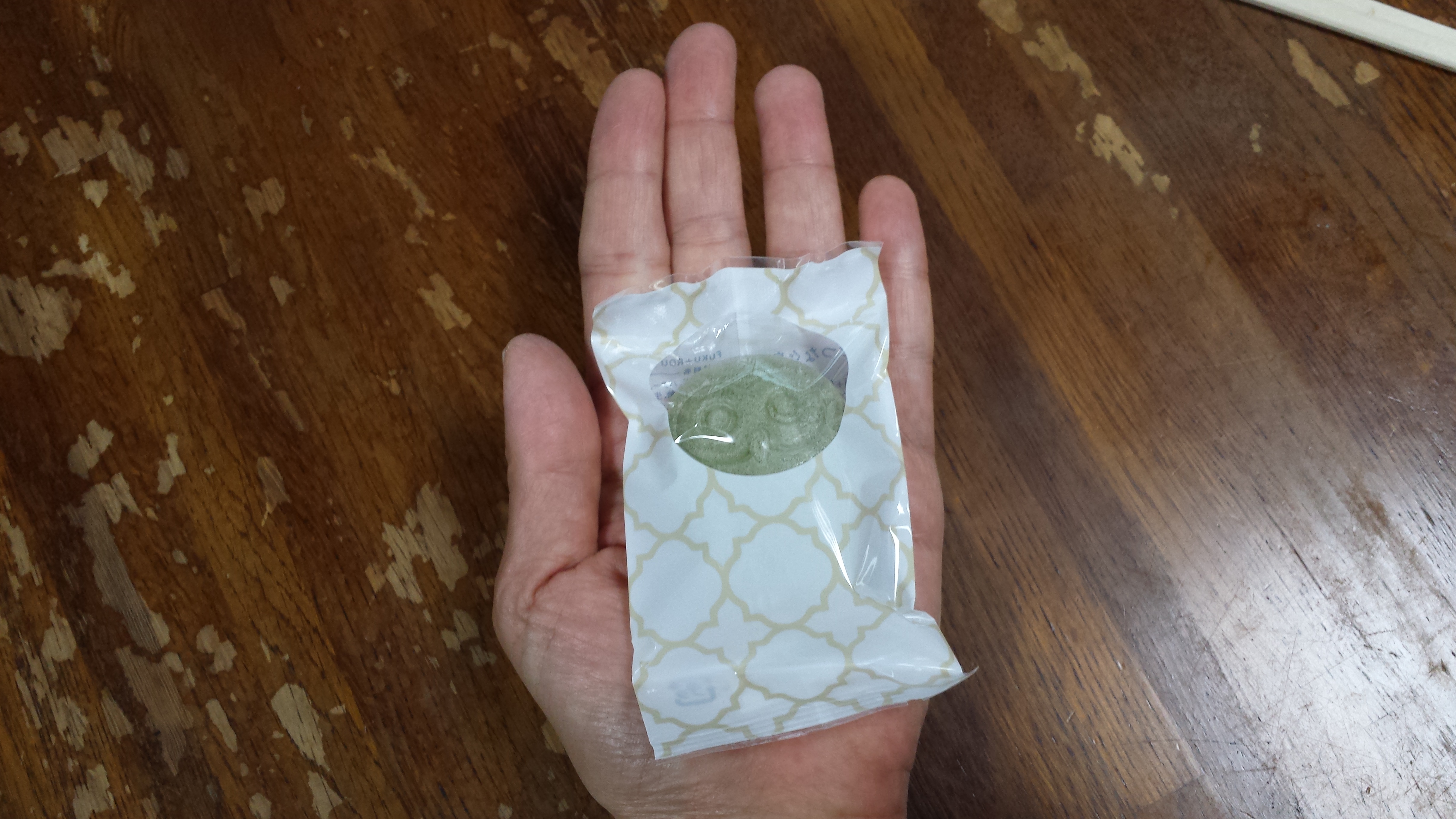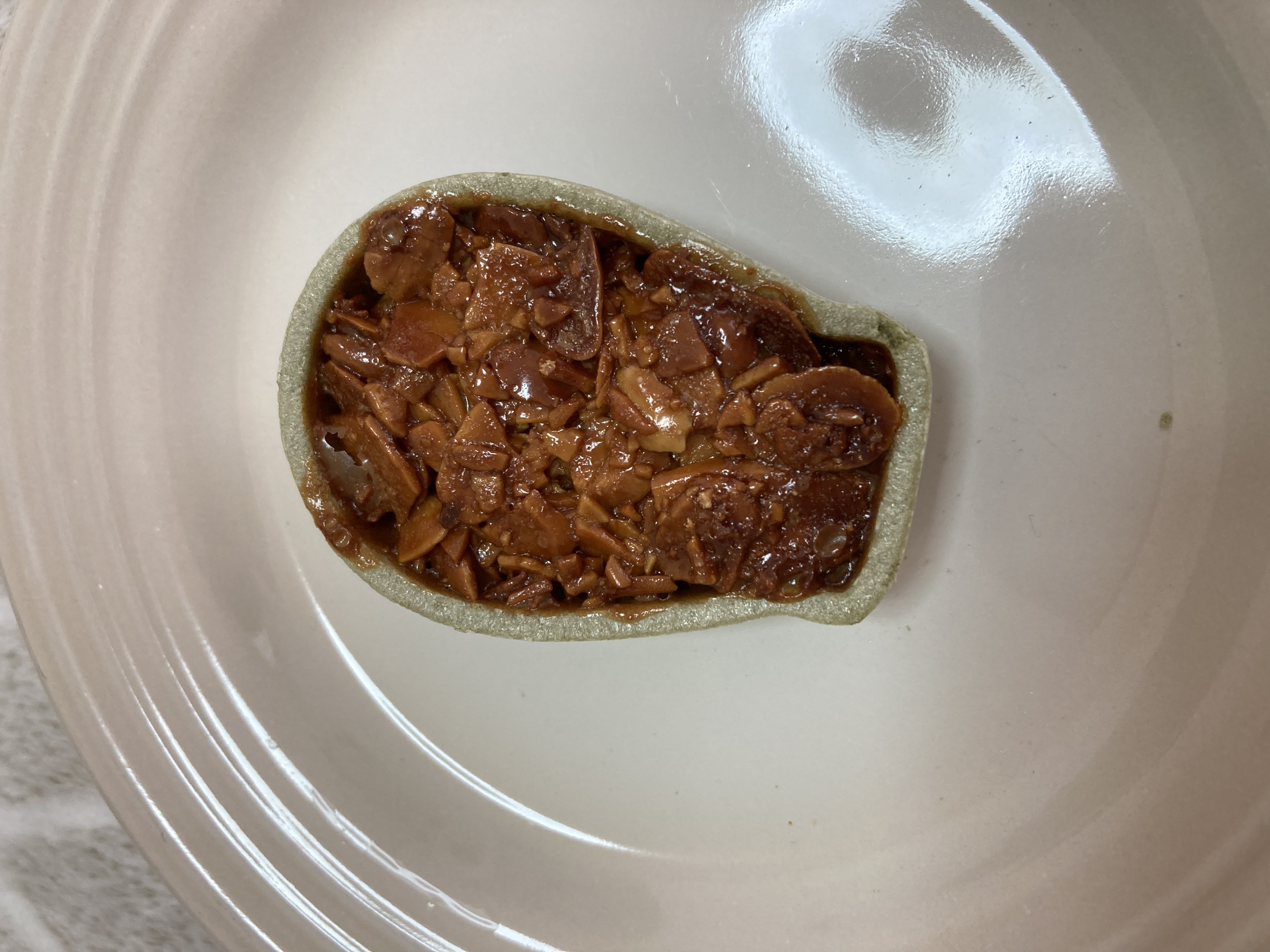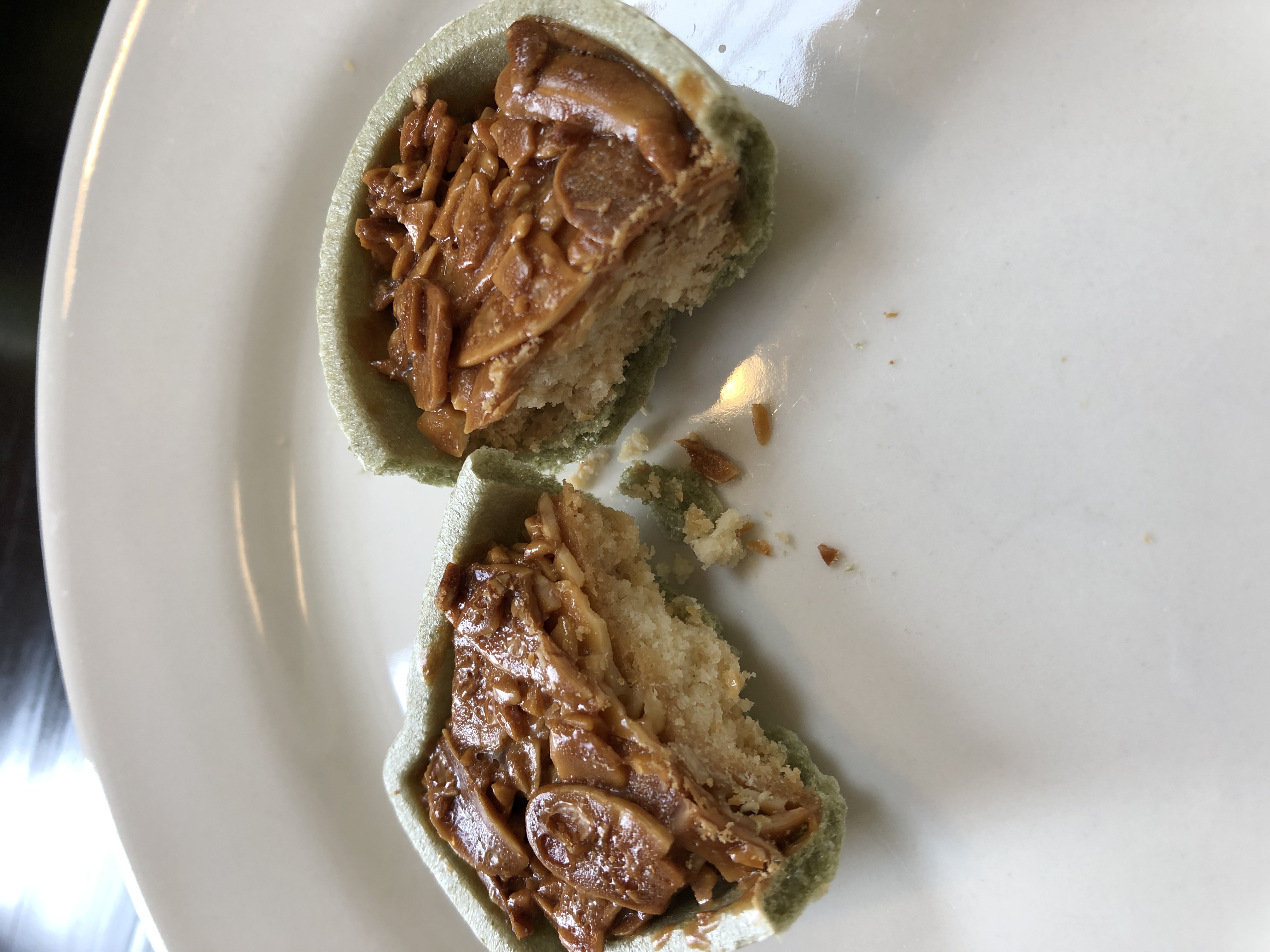 手のひらサイズのフロランタン、よもぎ最中皮の中に入ったアーモンドのキャラメリゼが濃厚な甘さで1個食べると小腹が充分満たされます。