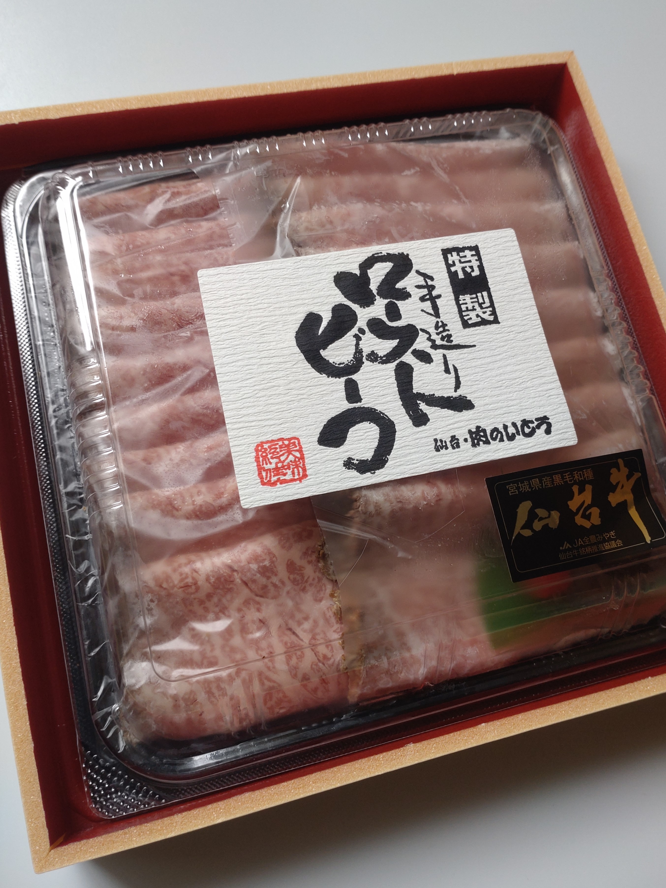 開けた瞬間「1枚1枚が大きい!」と驚きました。既にカットされた状態で届くって嬉しいですね^ ^分厚さを調整しながらスライスするのは意外と難しい為、助かりますし、作っている方のおすすめの分厚さでいただけるのが1番です。解凍は、冷蔵庫で一日かけて行いました。解凍後のお肉の断面の美しさにもうっとり。この絶妙なレア加減がたまりません。今回は、そのまま、丼、オリジナルソースの3つの食べ方でいただきました。まずはそのままでお塩とワサビをつけていただきます。お肉一枚をお箸で持ち上げ、その大きさに夫が「これ半分にカットしようかな?」と言うほどの大きさ。ずっしりのボリュームがあります。「でもせっかくだから一口でいこうよ!」と....食べて、その柔らかさと旨みの強さに衝撃を受けました。きめ細かく、口の中でとろけていきます。仙台牛ってこんなに柔らかいんですね!旨みがぎゅううと閉じ込められています。そのまま食べても下味がついている為、美味しくいただけます。仙台牛本来の味を楽しめるこの食べ方、おすすめです。それにしても一枚一枚が大きい!一枚での満足感が半端無いです。でも美味しすぎて、一枚じゃ足りない!