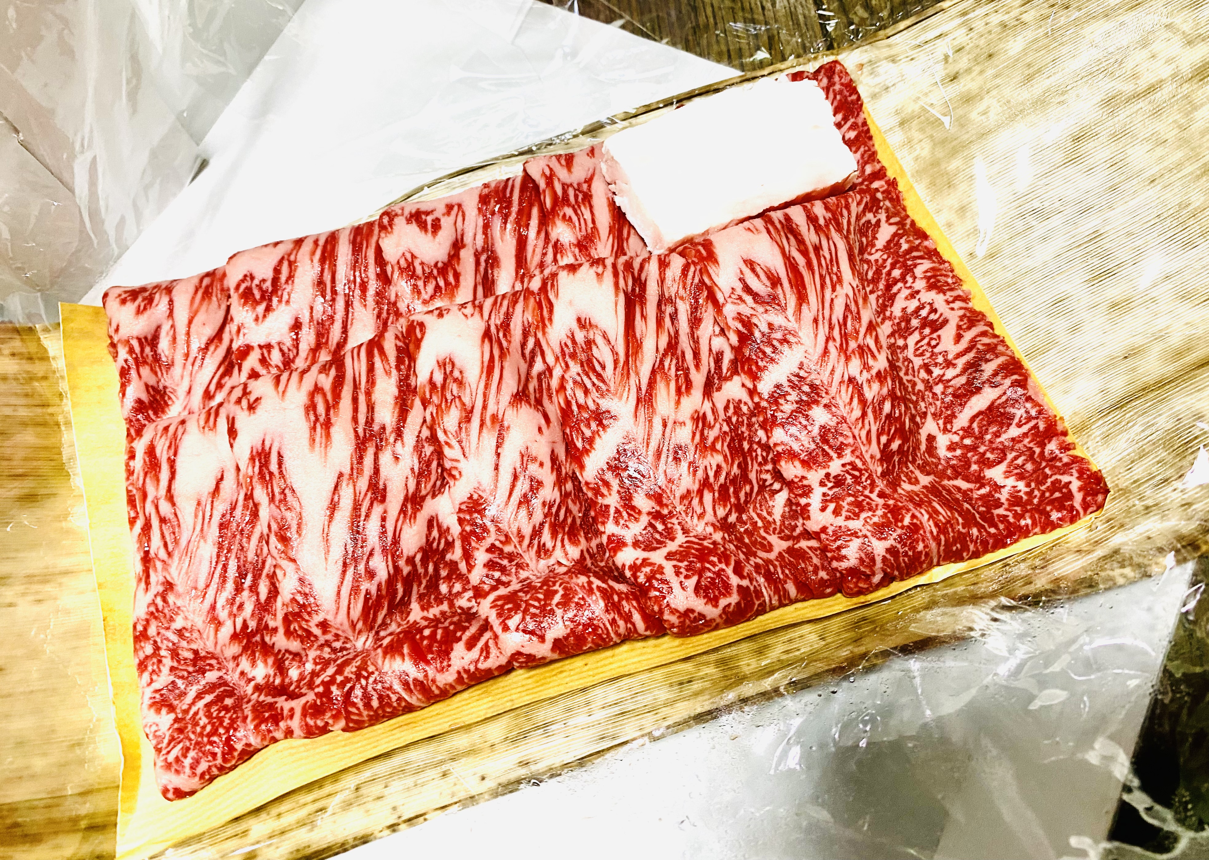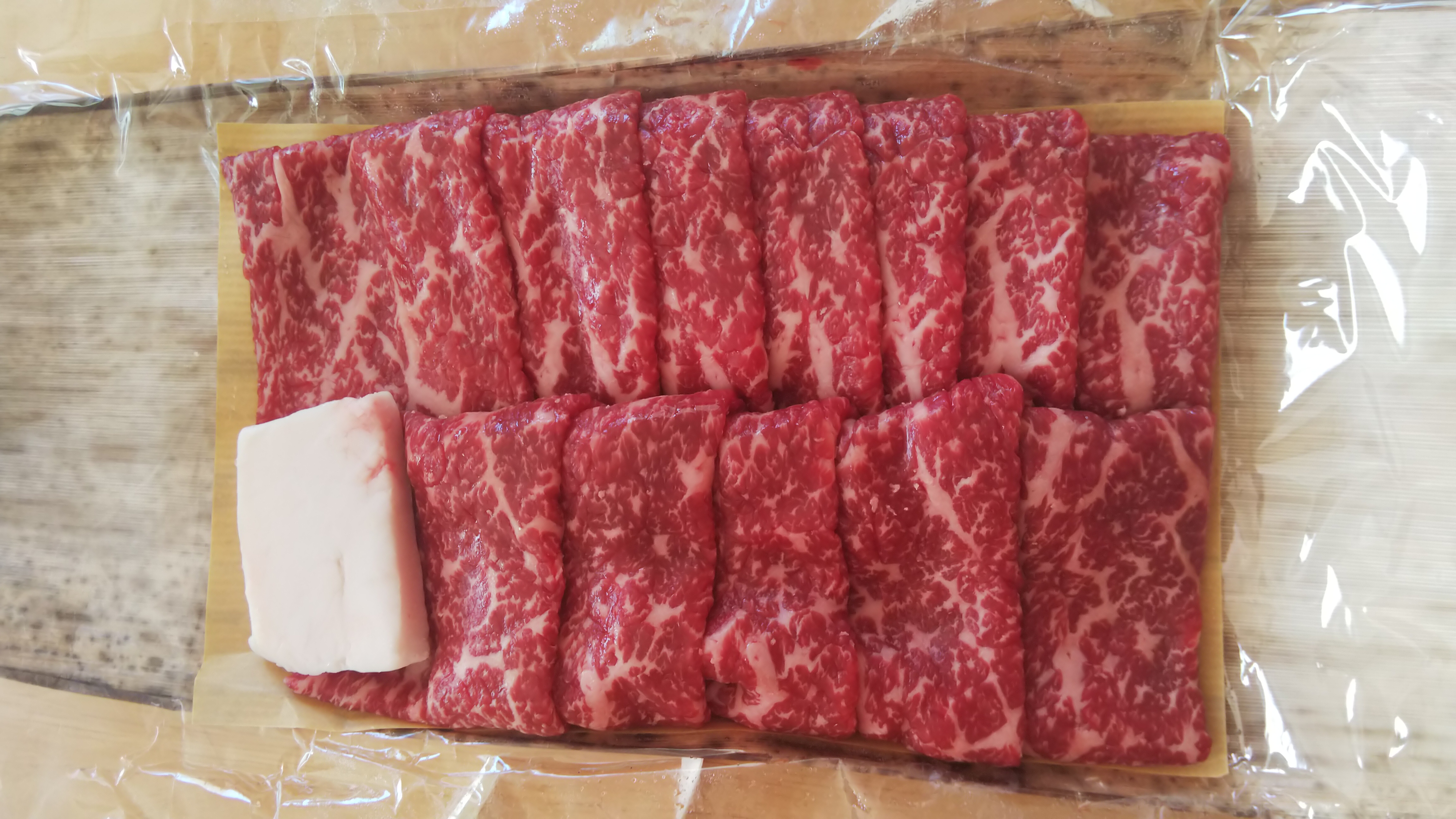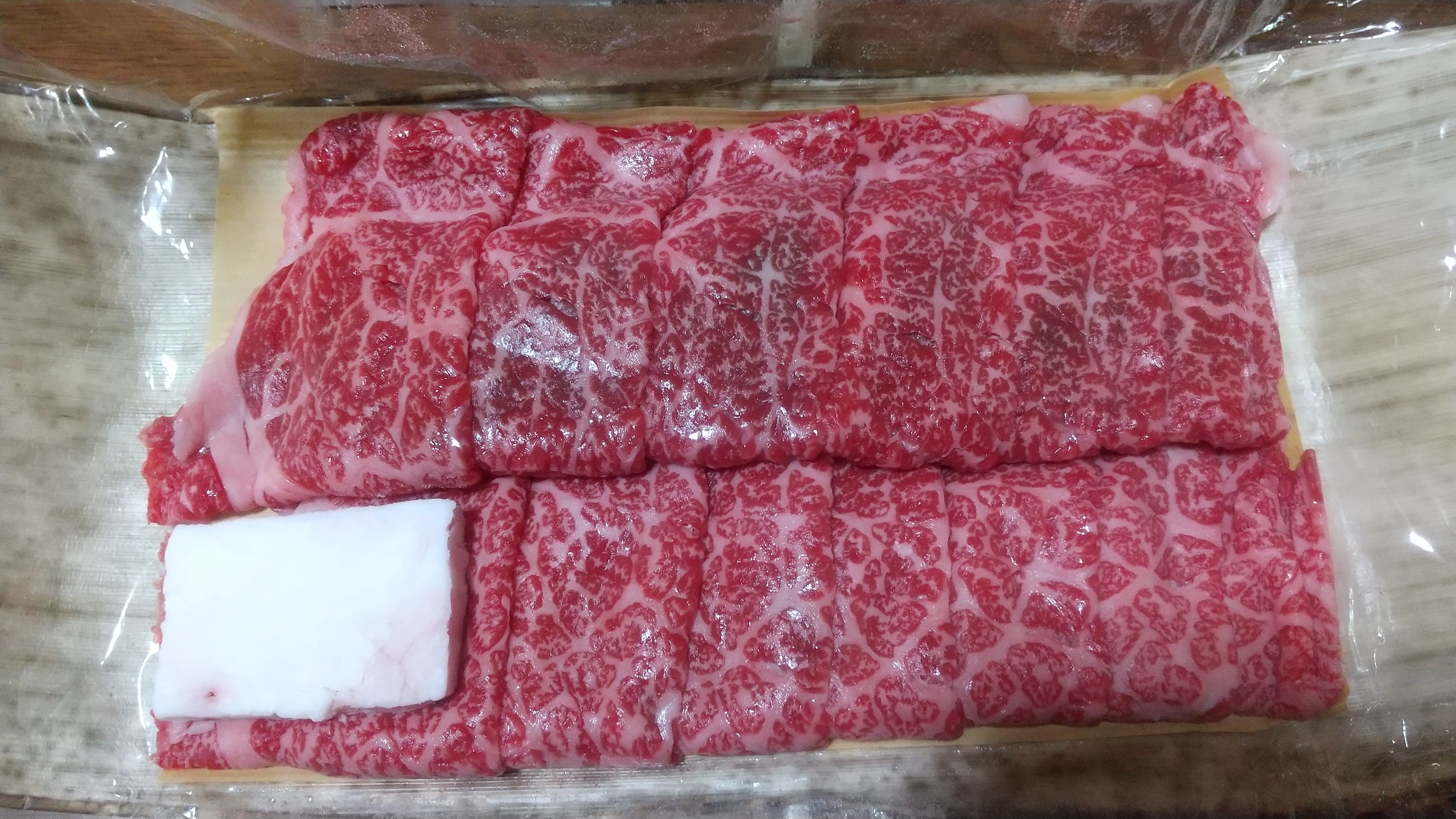 そして、その包みを開くと、鮮やかな赤い色にほどよくサシが入った美しいお肉が登場。牛脂もついてます。