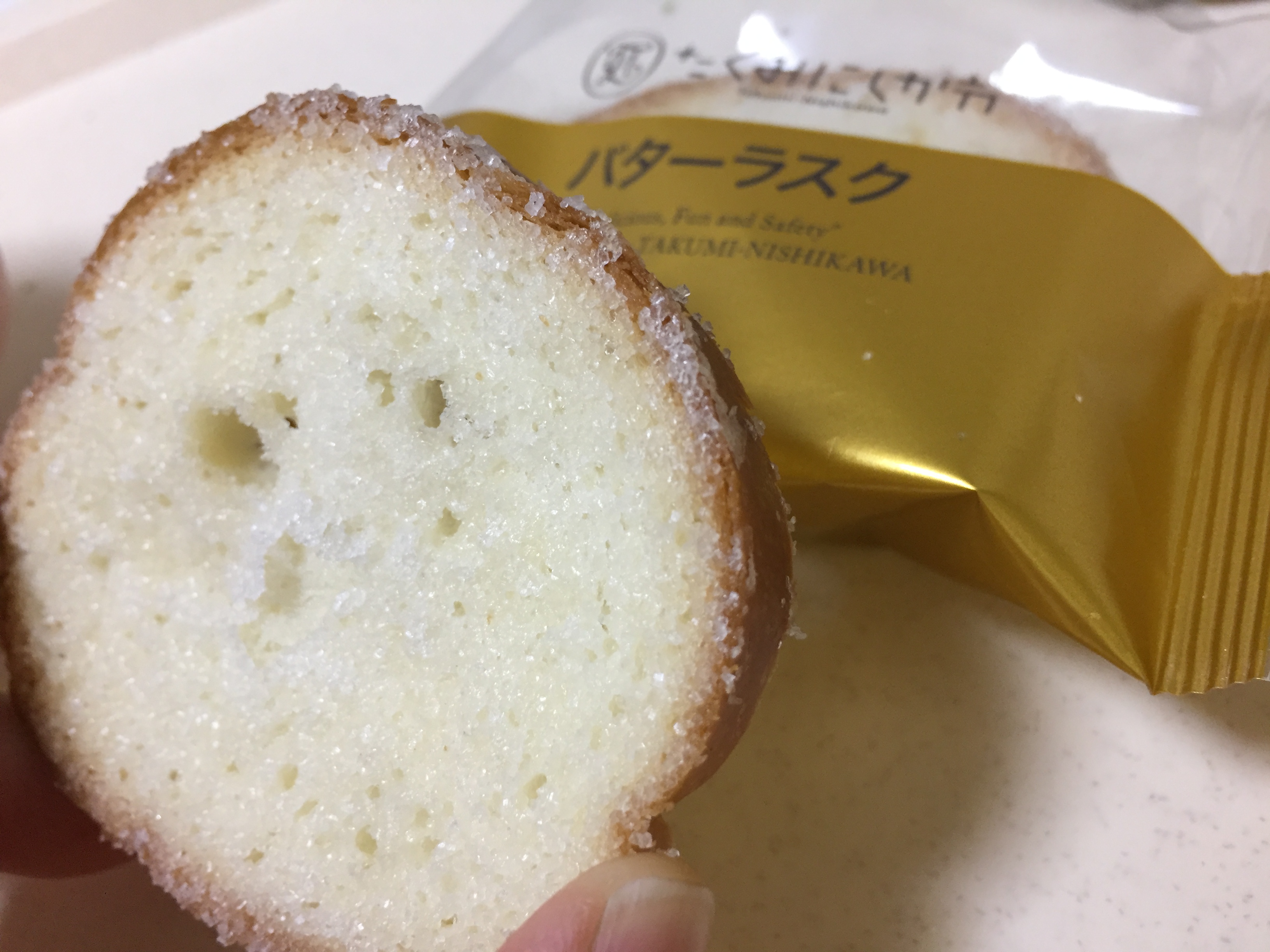 バターラスクという事で、バターの濃度が気になっていましたが、ベタついたり、パンの食感が柔らかくなっていたりすることは全くなく、程よいシュガーの量とバターのほんのり香る甘みがちょうどよく、サックサック食感のラスクが頂けます。