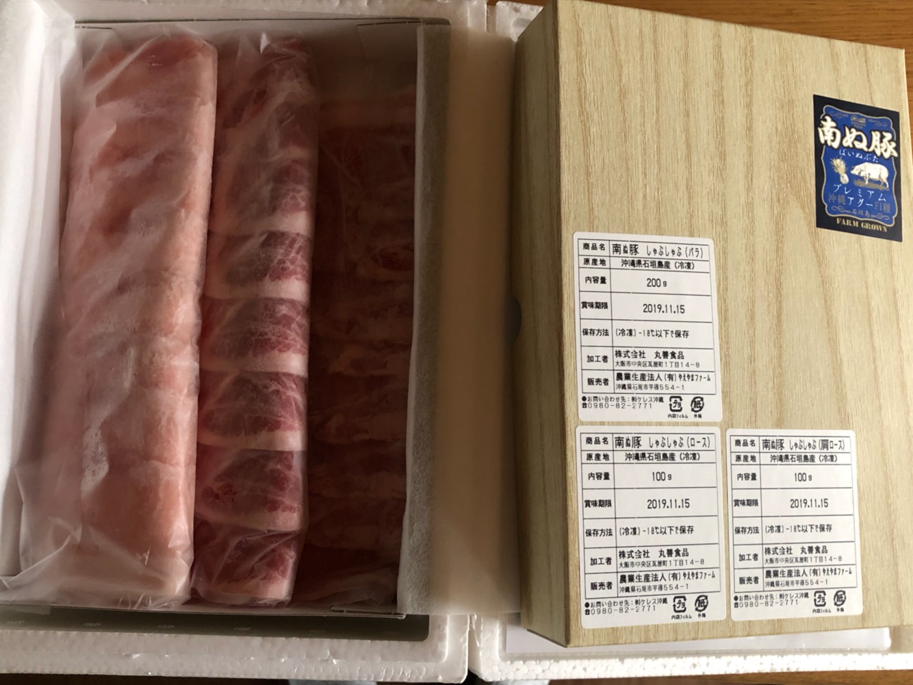 冷凍便で届いた箱を開けると、3種(バラ・ロース・肩ロース)の南ぬ豚がそれぞれシートに挟まれて取り出しやすかったです。