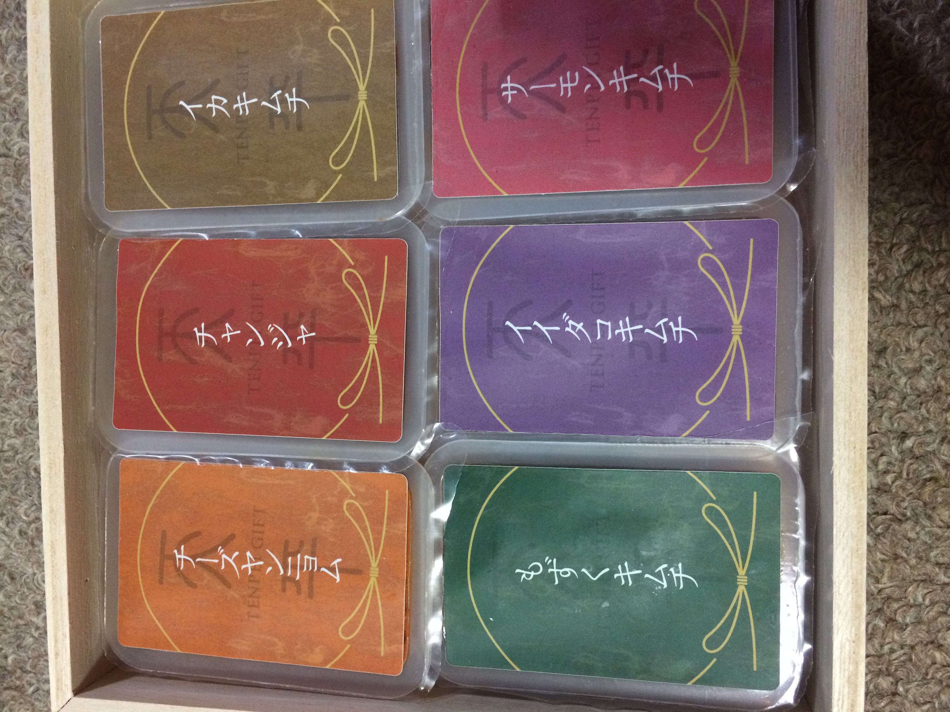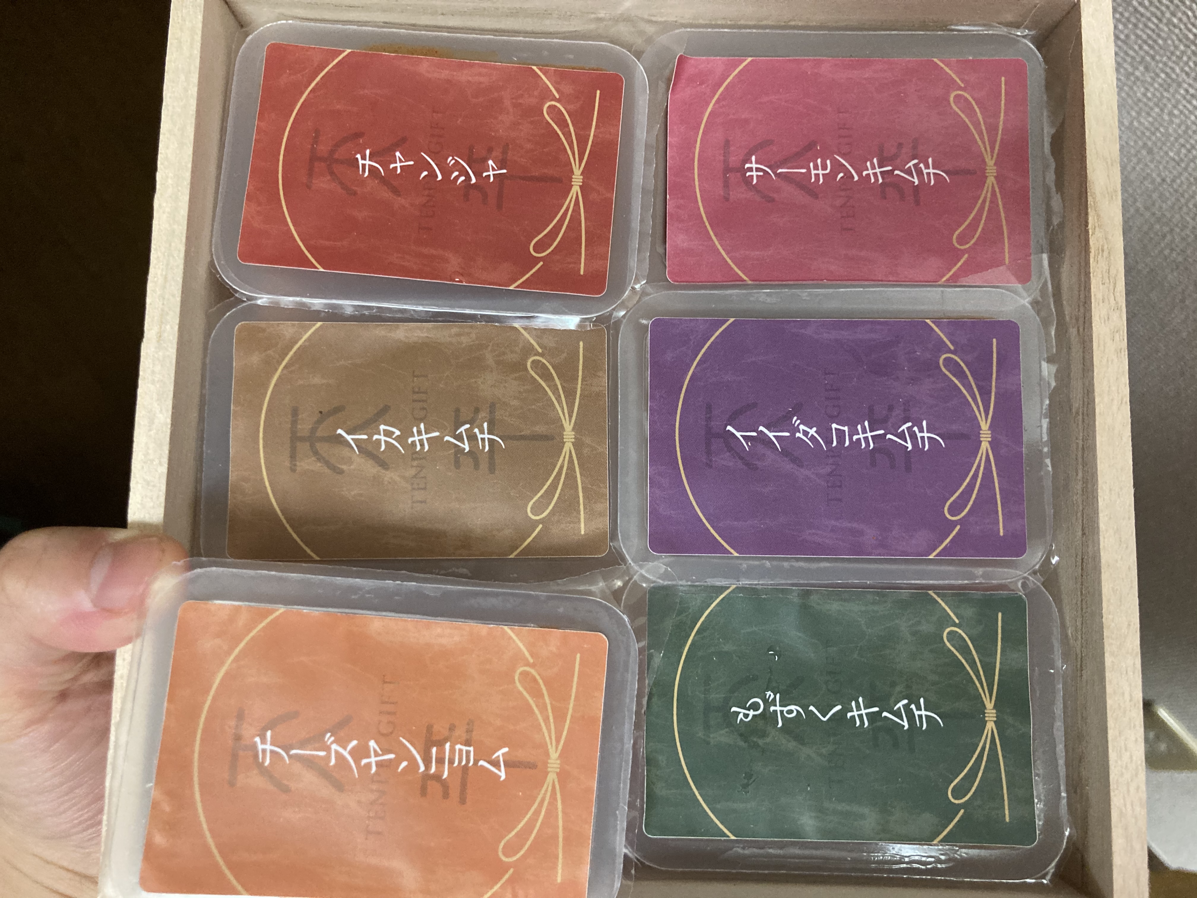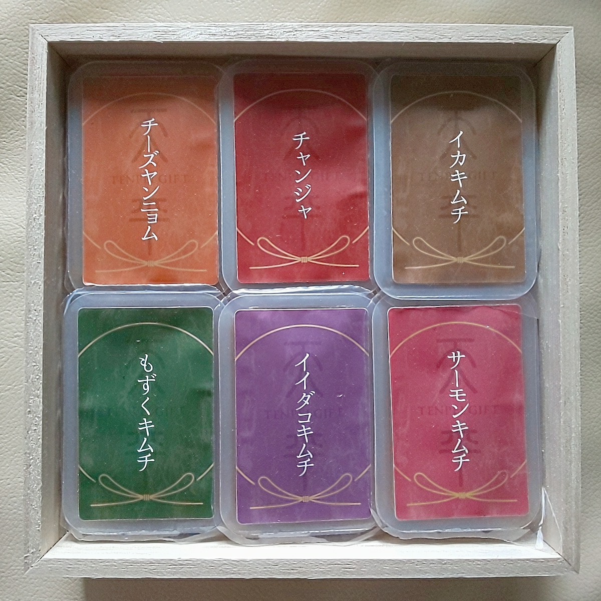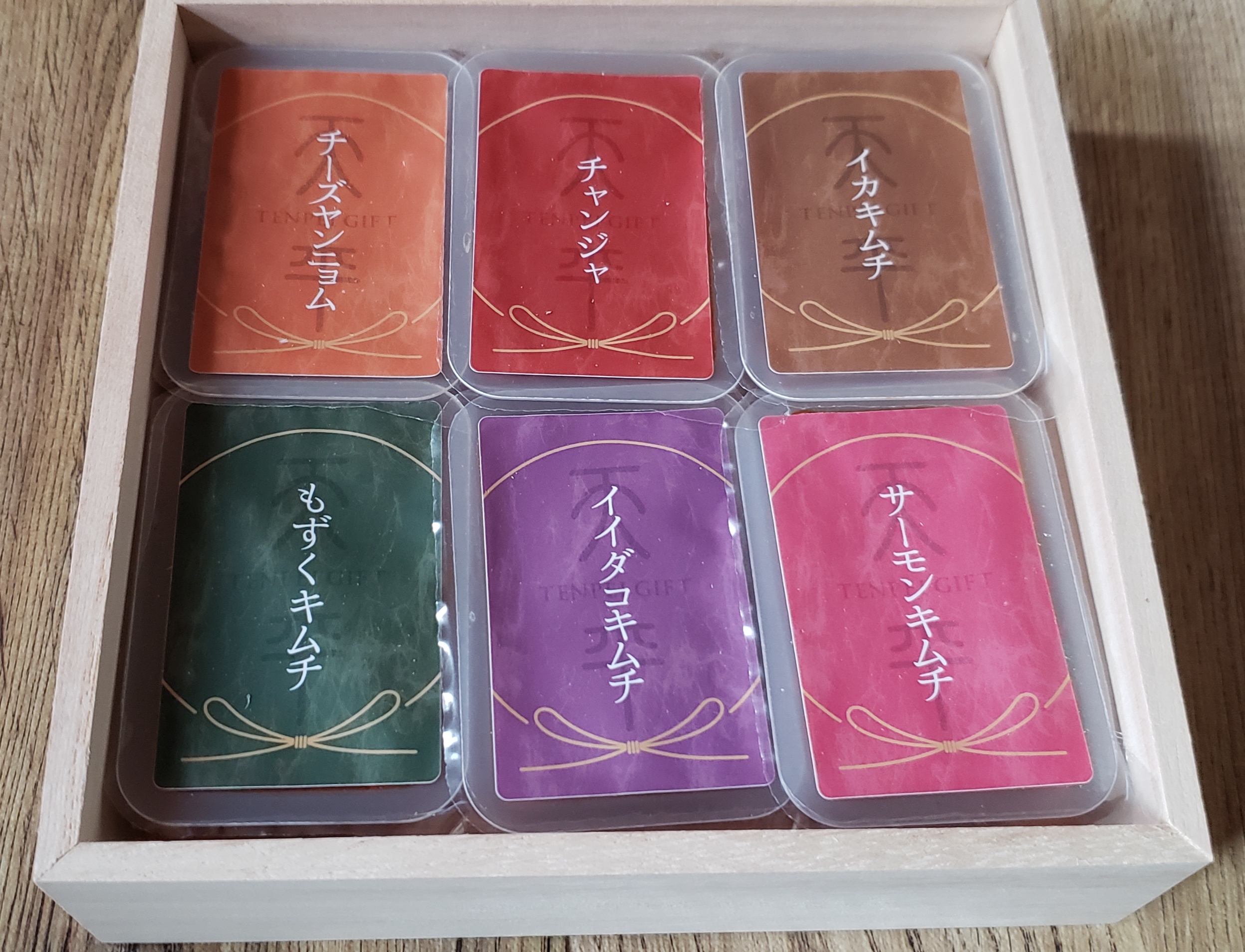 その木箱を開けると個包装のキムチが6種類、サーモンキムチ、チャンジャ、タコキムチ、チーズキムチ、イカキムチとモズクキムチが入っていました。