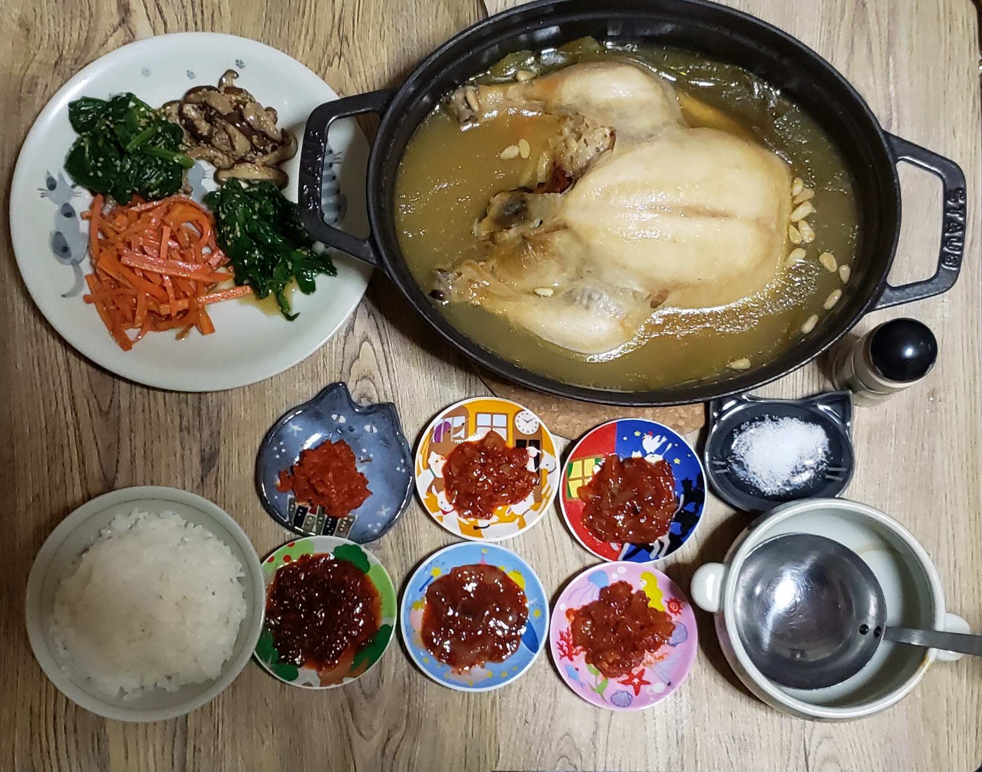 次に、作っておいたナムルと参鶏湯とご飯も用意して、韓国料理屋さんっぽい夕飯にしてみました。どのキムチもご飯がよく進んだんですが、唯一、もずくキムチだけは、ご飯と食べるより、キムチだけを食べた方が美味しく感じました。チーズヤンニョムですが、参鶏湯の味に変化を出すのに鶏肉につけながら食べたんですけど、とても美味しかったです。チーズヤンニョム、いくらでも使い方の可能性が広がりそうな、本当に素敵な商品だと思いました。
