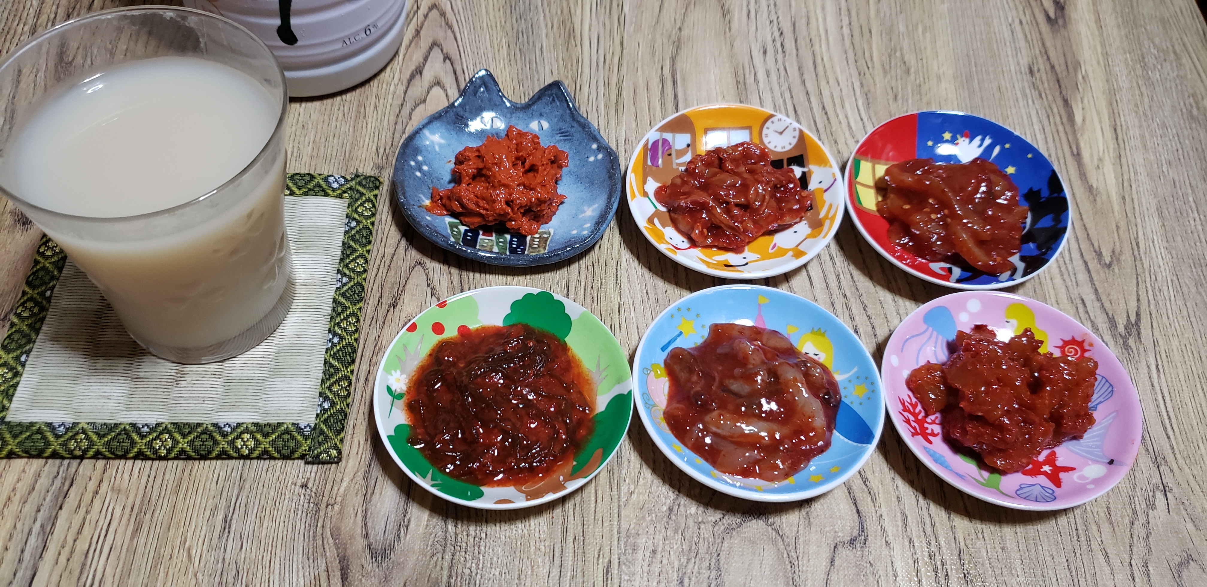 開封し、最初はマッコリのおつまみとしてそれぞれ食べてゆきました。