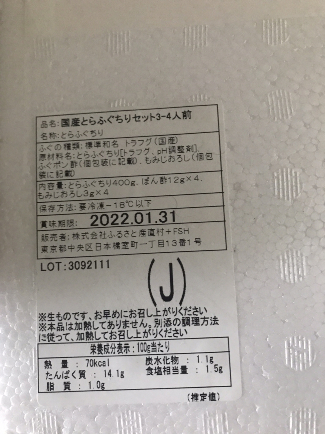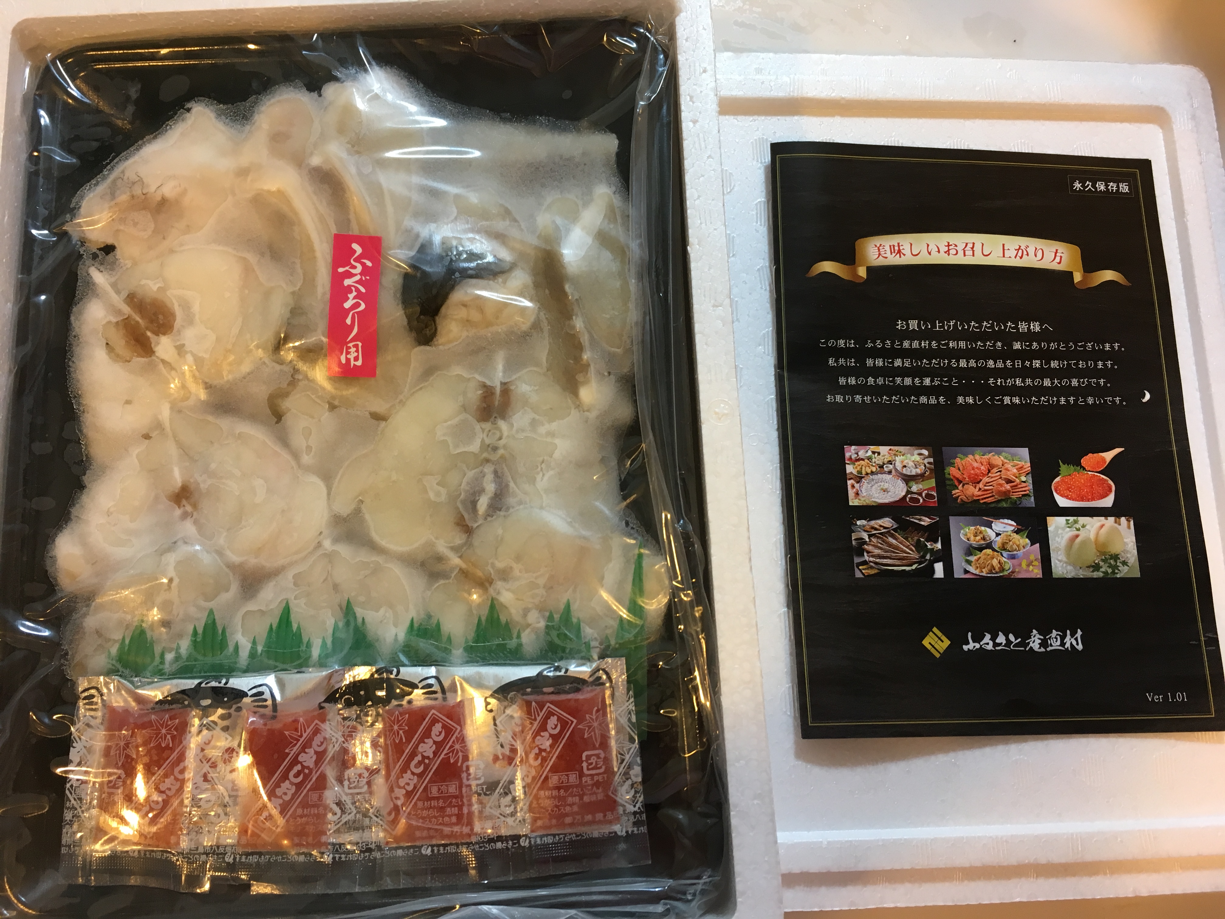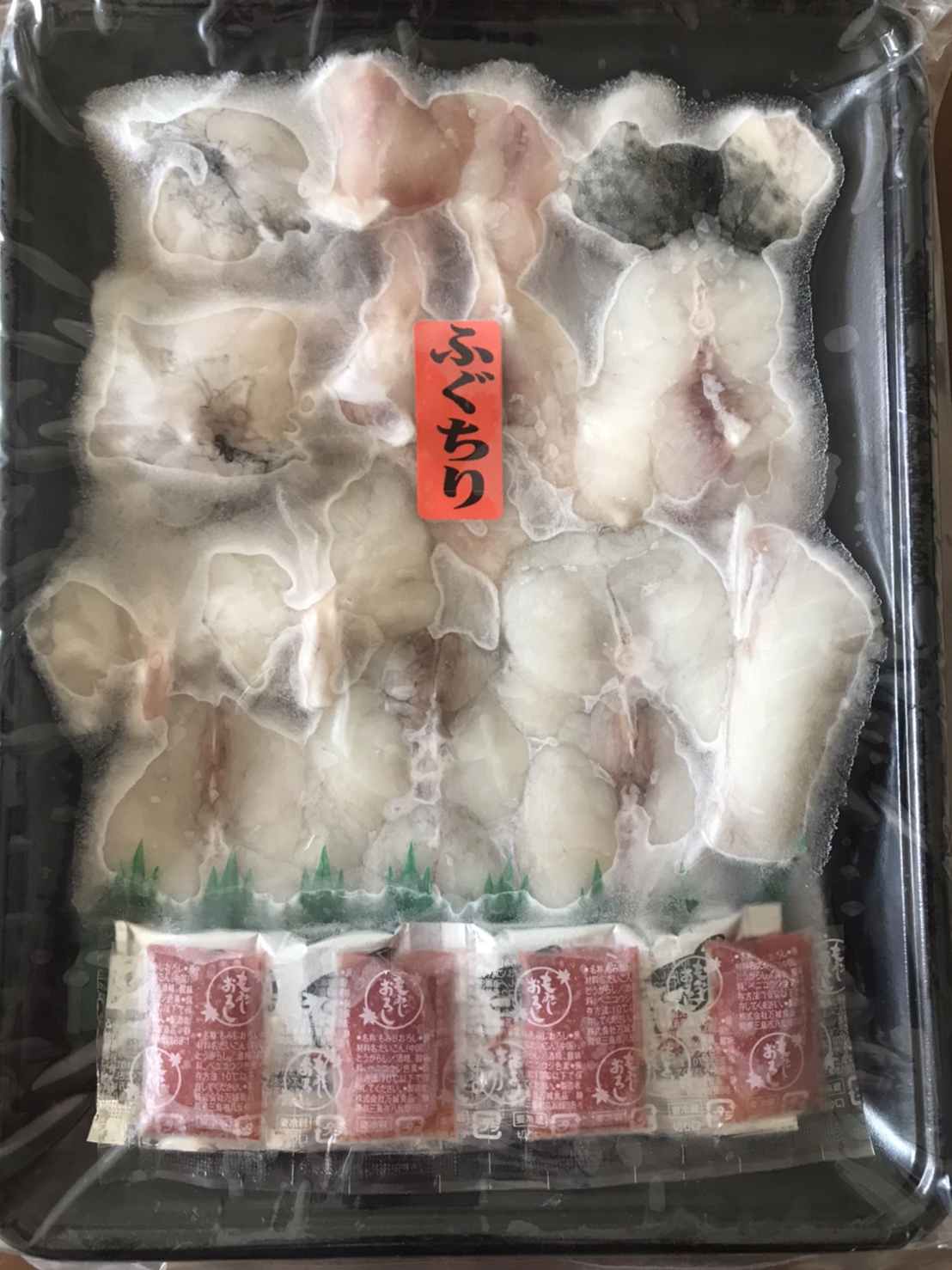 指定日通りに届いたとらふぐちりセットは、しっかりと発泡スチロールのケースに入れられて冷凍された形で届きました。今回のセットはとらふぐの切り身が200g、そしてアラの部分が200gの、とっても食べ応えがあるふぐちりセットです。