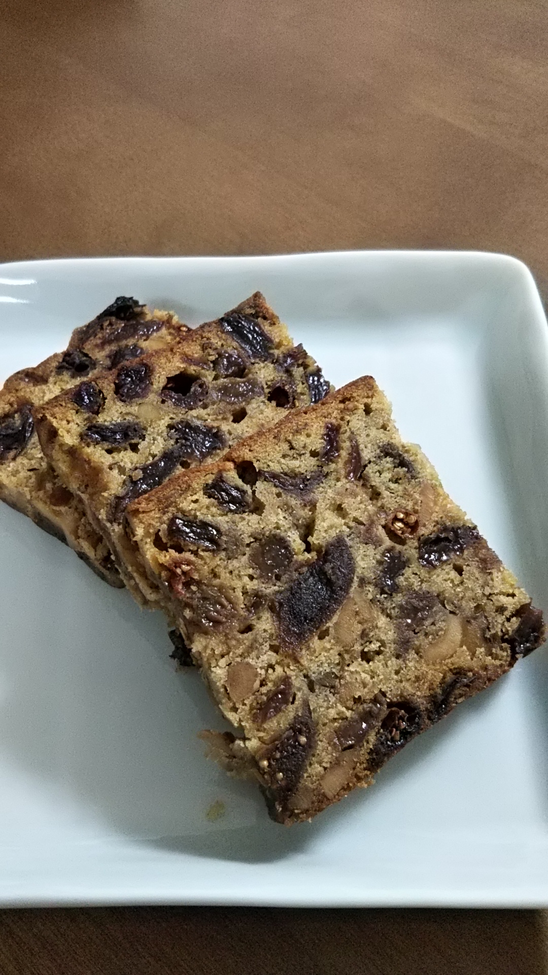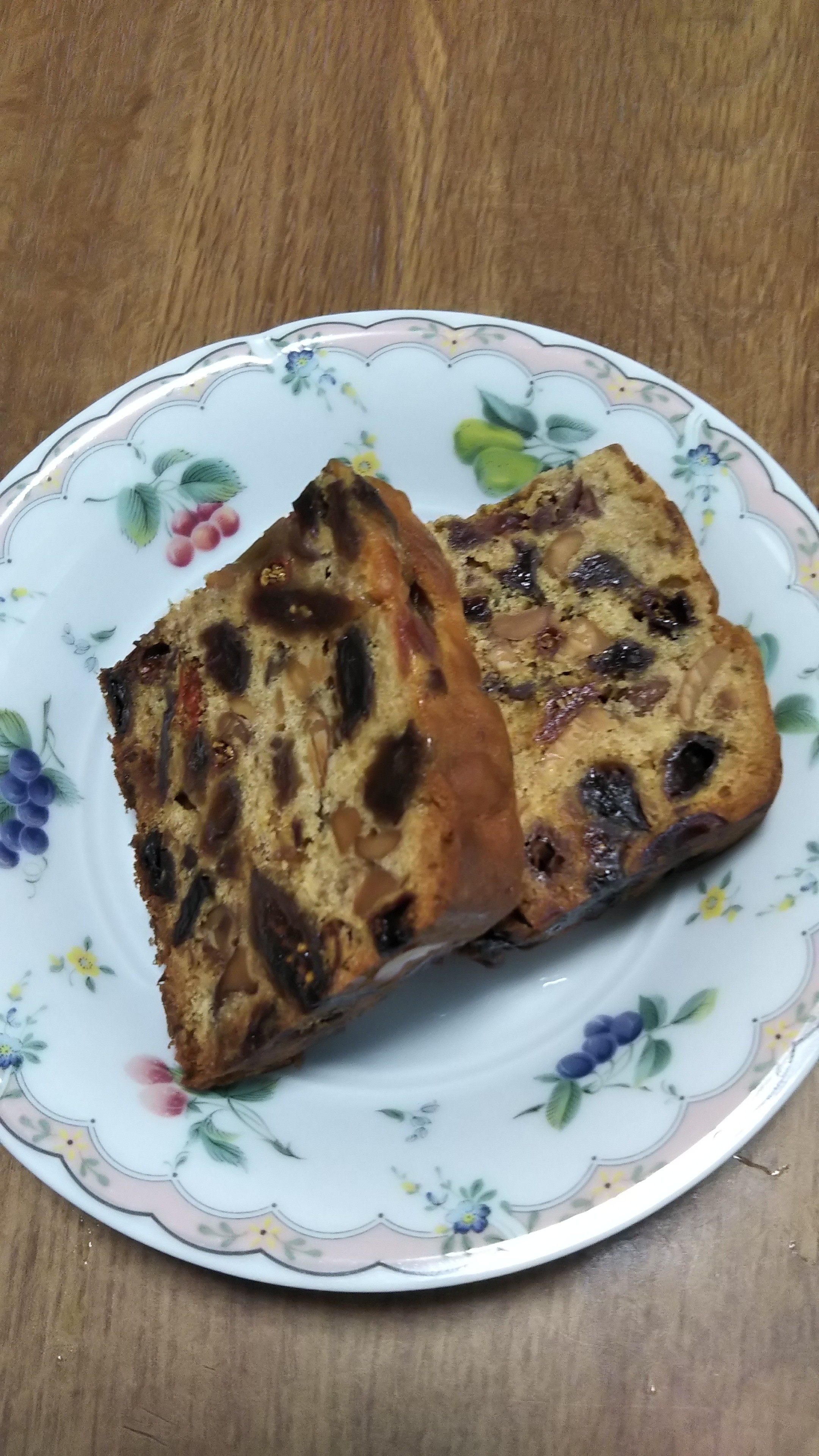 英国式フルーツケーキを食べることは初めてでしたのでワクワクしながら冊子を読み、冊子にはフルーツケーキは冷蔵庫で冷やしてからカットすると綺麗に切れると書いてありました。しっかり冷やしてからペティナイフでカットするとフルーツが崩れることなく簡単に綺麗に切れました。ケーキの中には想像以上にずっしりとフルーツが。そしてラム酒のいい香り。カットの段目からしてすでに美味しそう。いざ家族でケーキを頂いてみました。