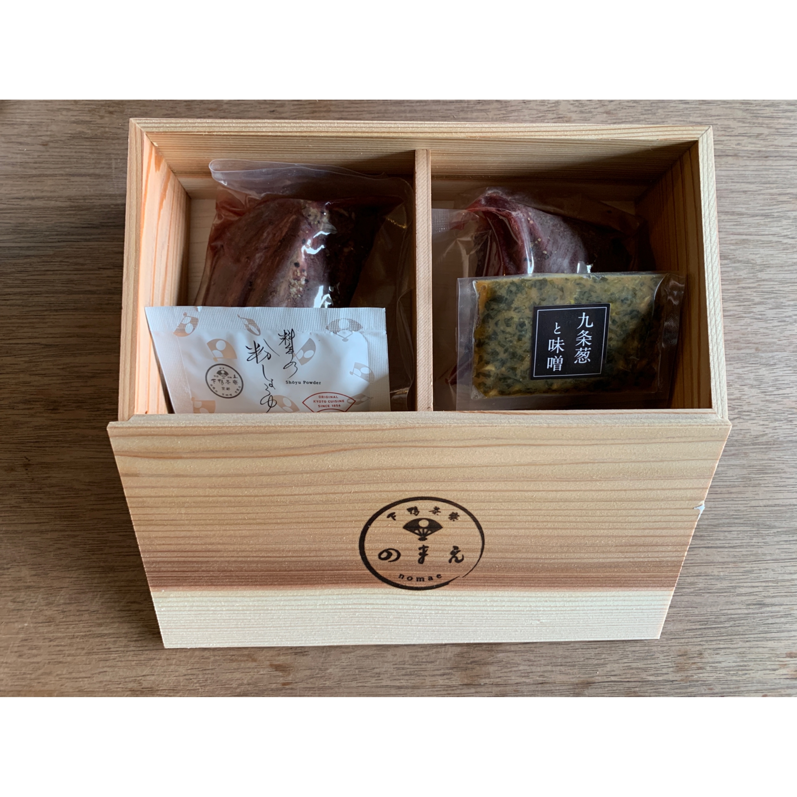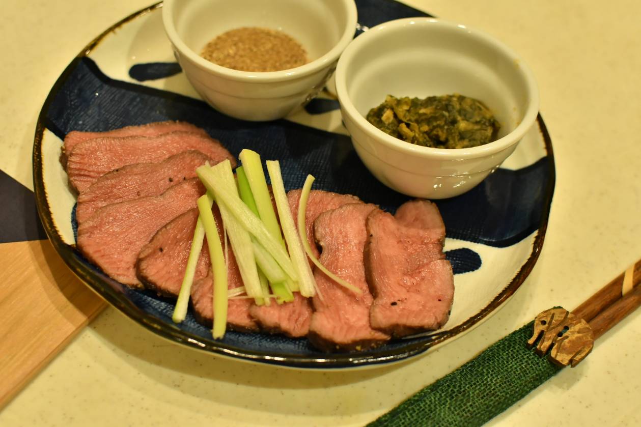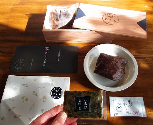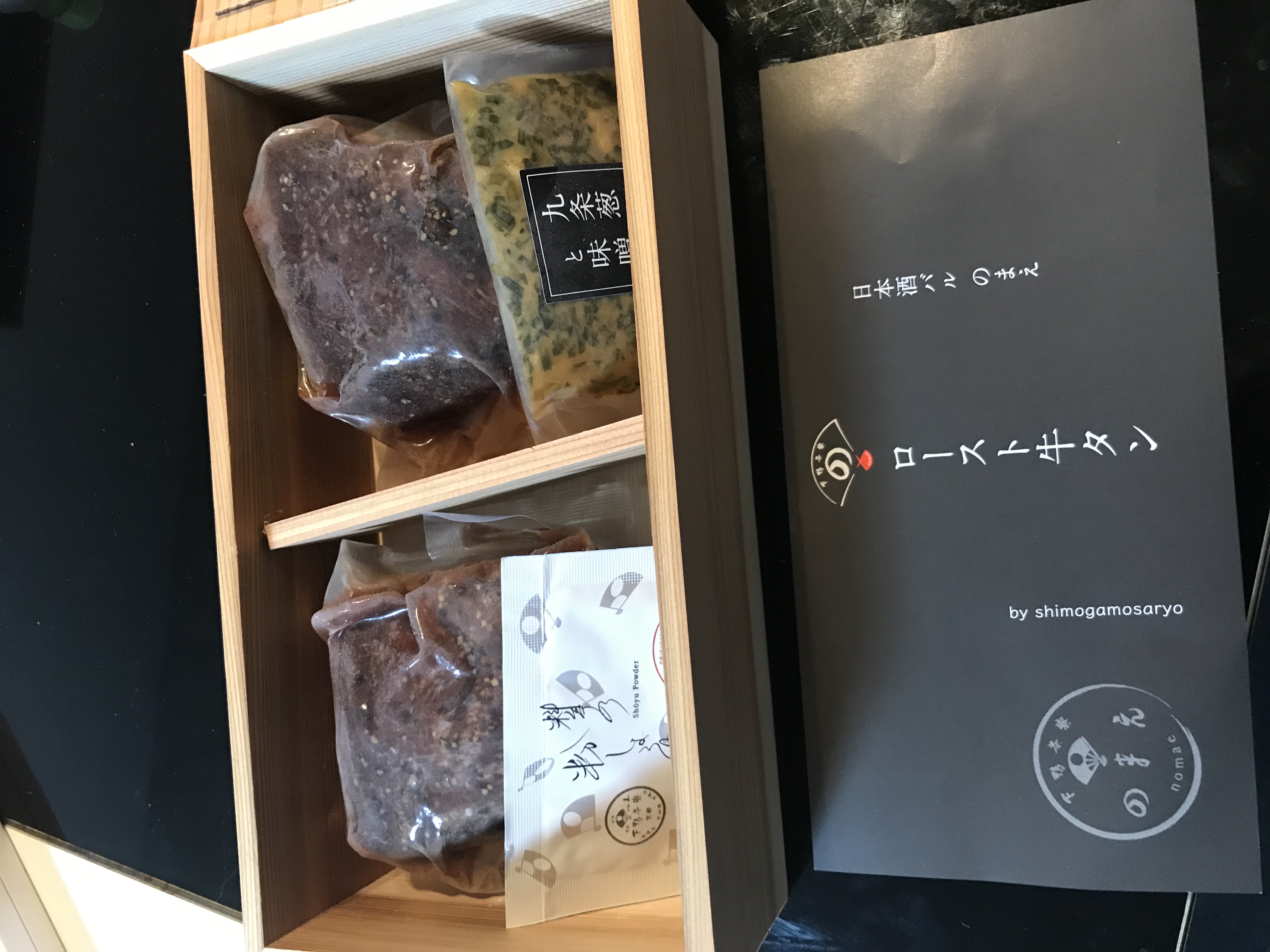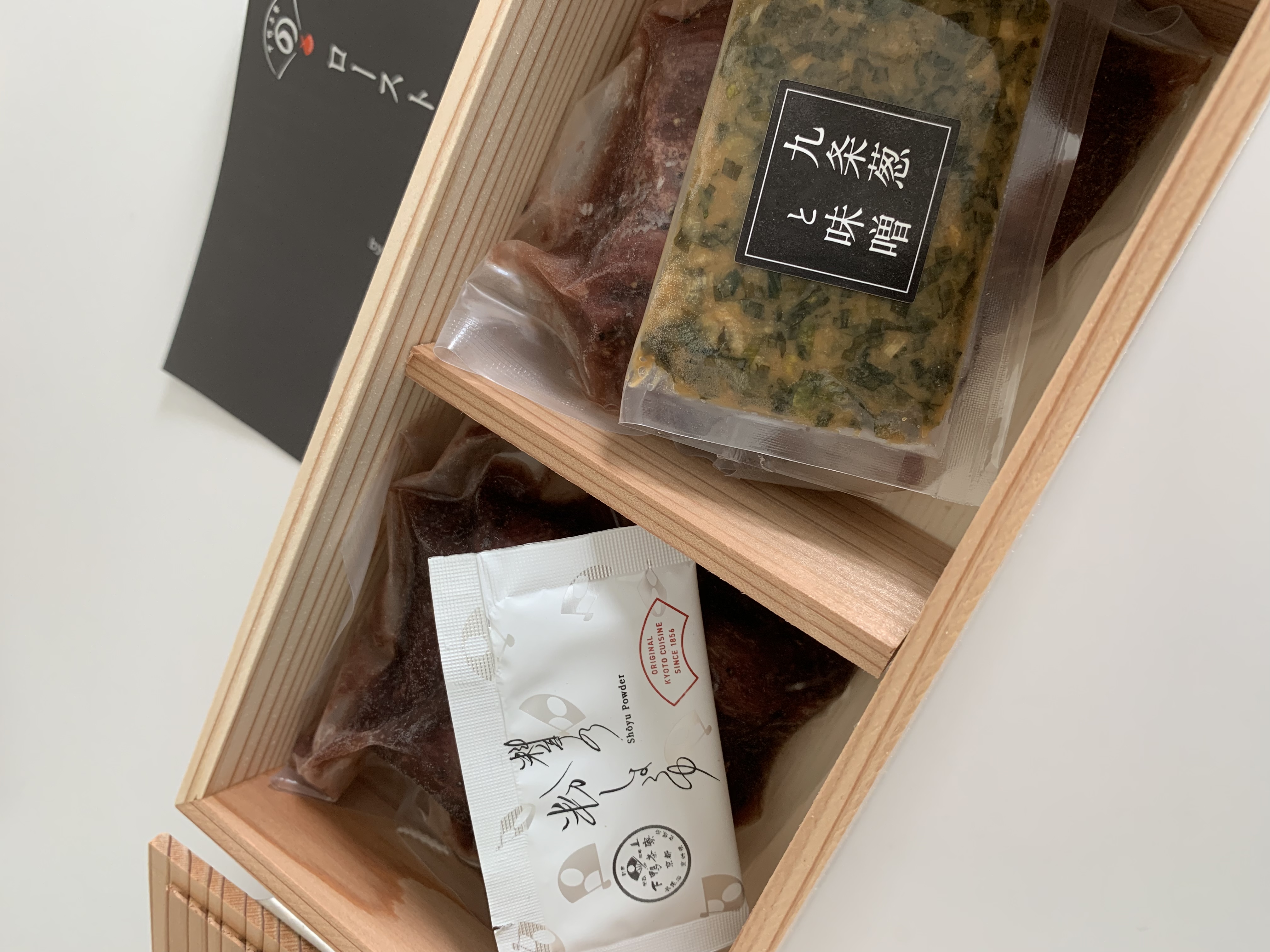 中には真空パックされた牛タンローストが2つ、薬味の九条ネギと味噌、粉醤油。