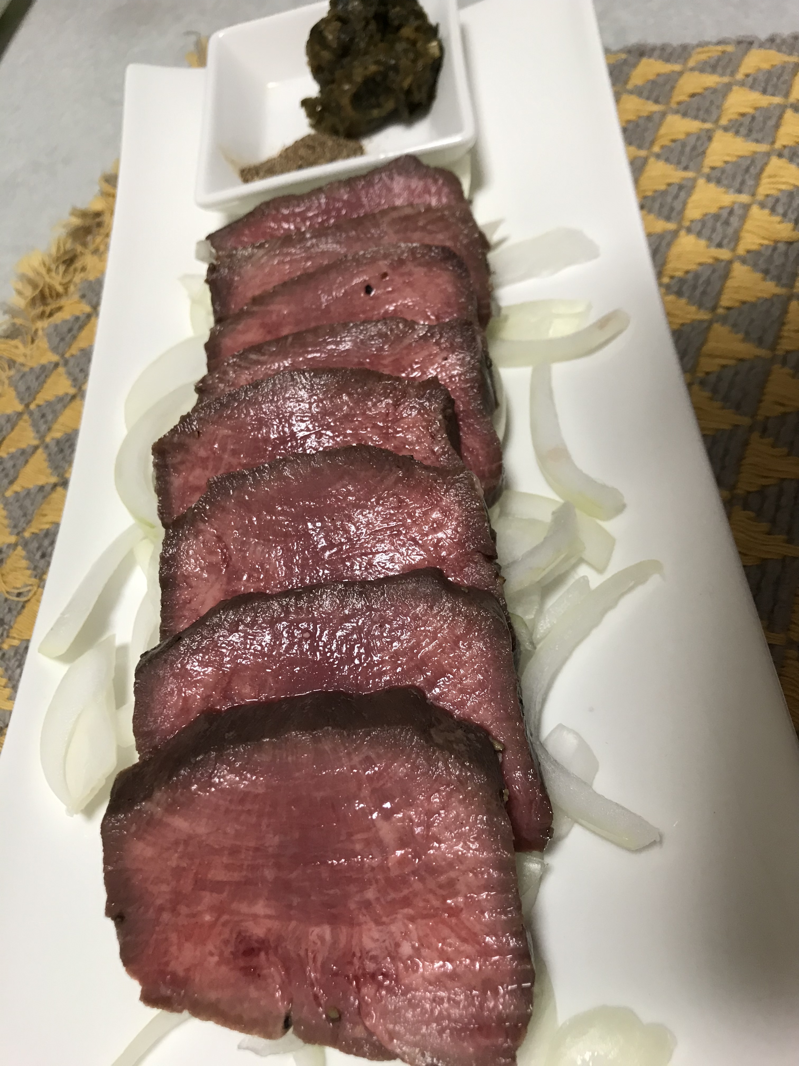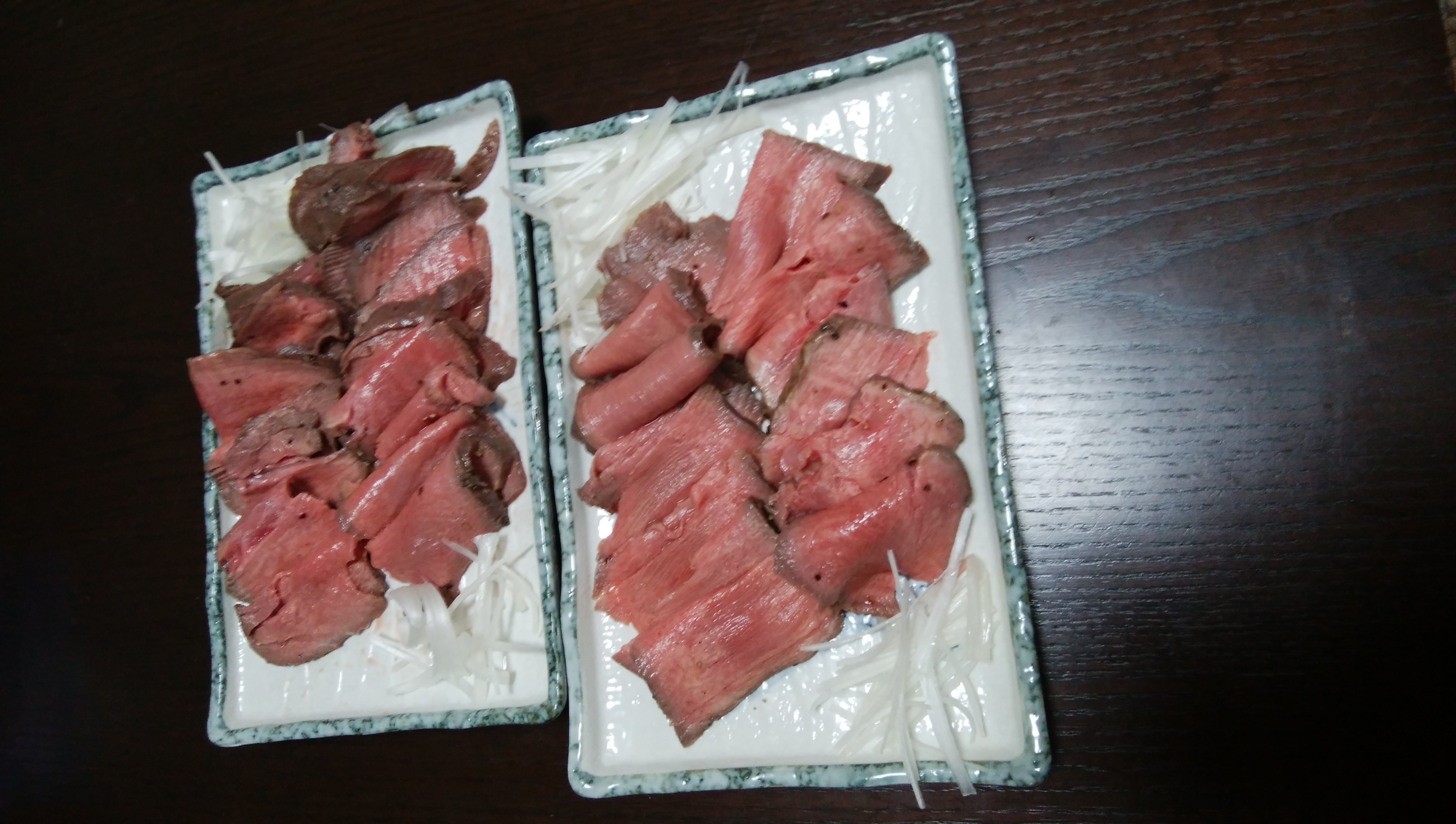 包丁で切っていきますが、思っていたよりもずっと柔らかい!!牛タンローストと言うくらいだから、結構硬いのを想像していたのですが、スっと包丁が入っていきます。