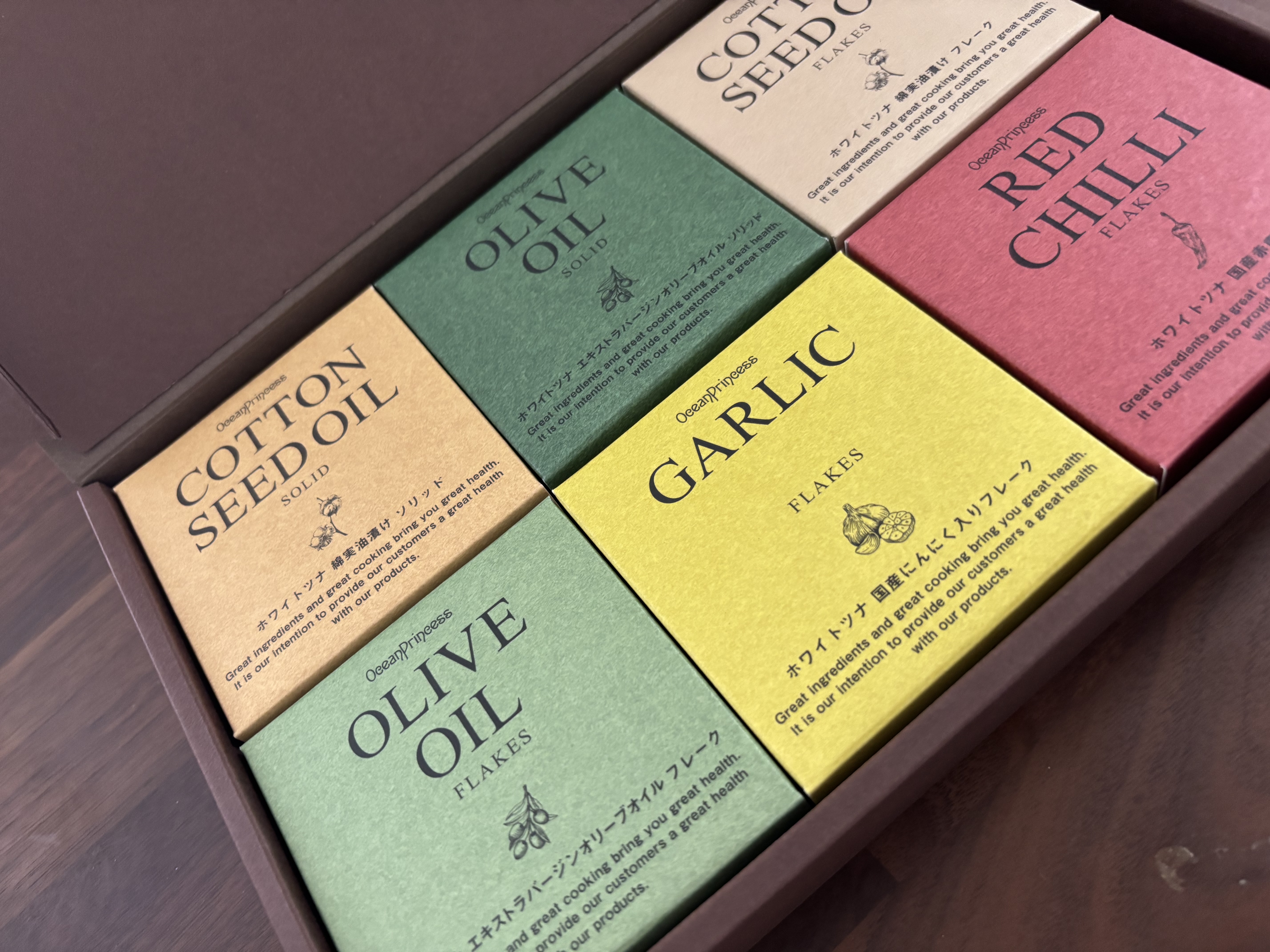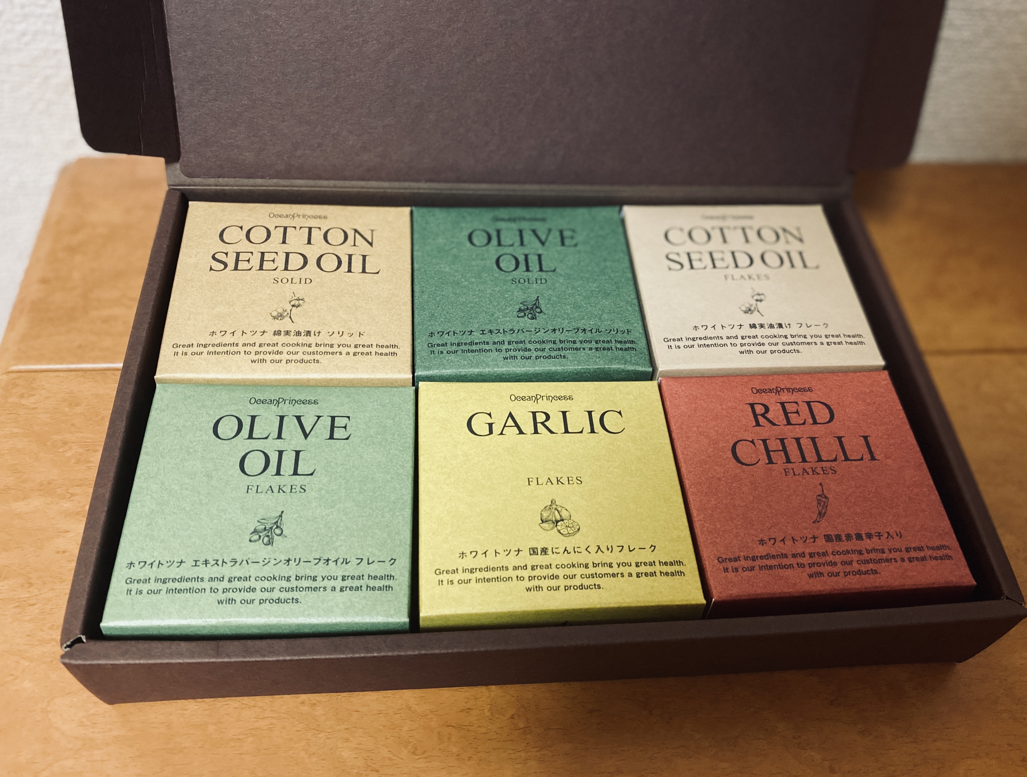 三陸沖水揚げの一本釣りの夏びん長まぐろのツナ缶で、塊りタイプのソリッド・フレーク。オリーブオイル・綿実油。国産赤唐辛子入り。国産にんにく入り。の6種類入っています。