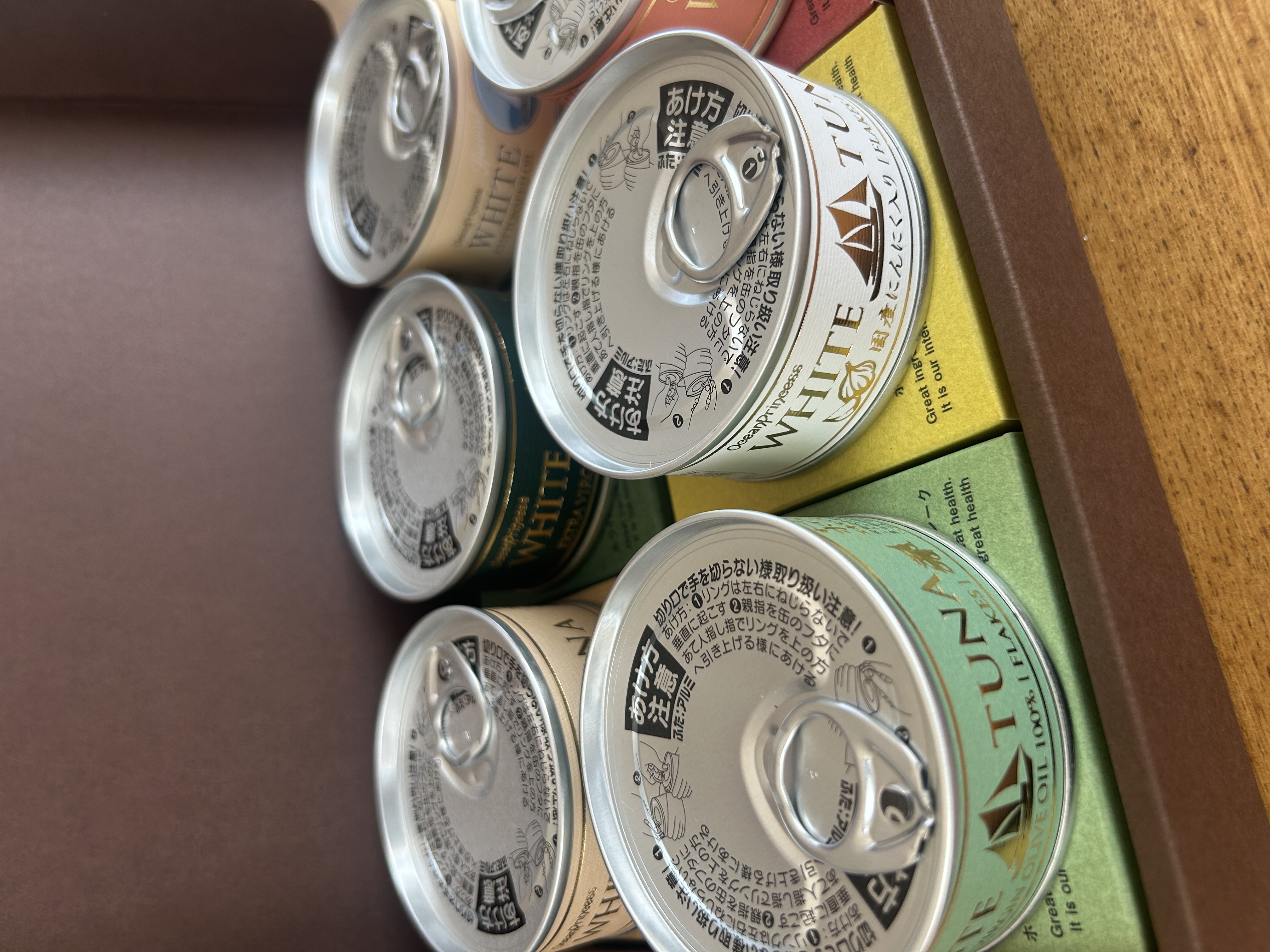 箱を開けると、6種類のカラフルでおしゃれな箱に1缶ずつツナ缶が入って、並んでいました。ツナ缶のラベルもおしゃれで、高級感があります。