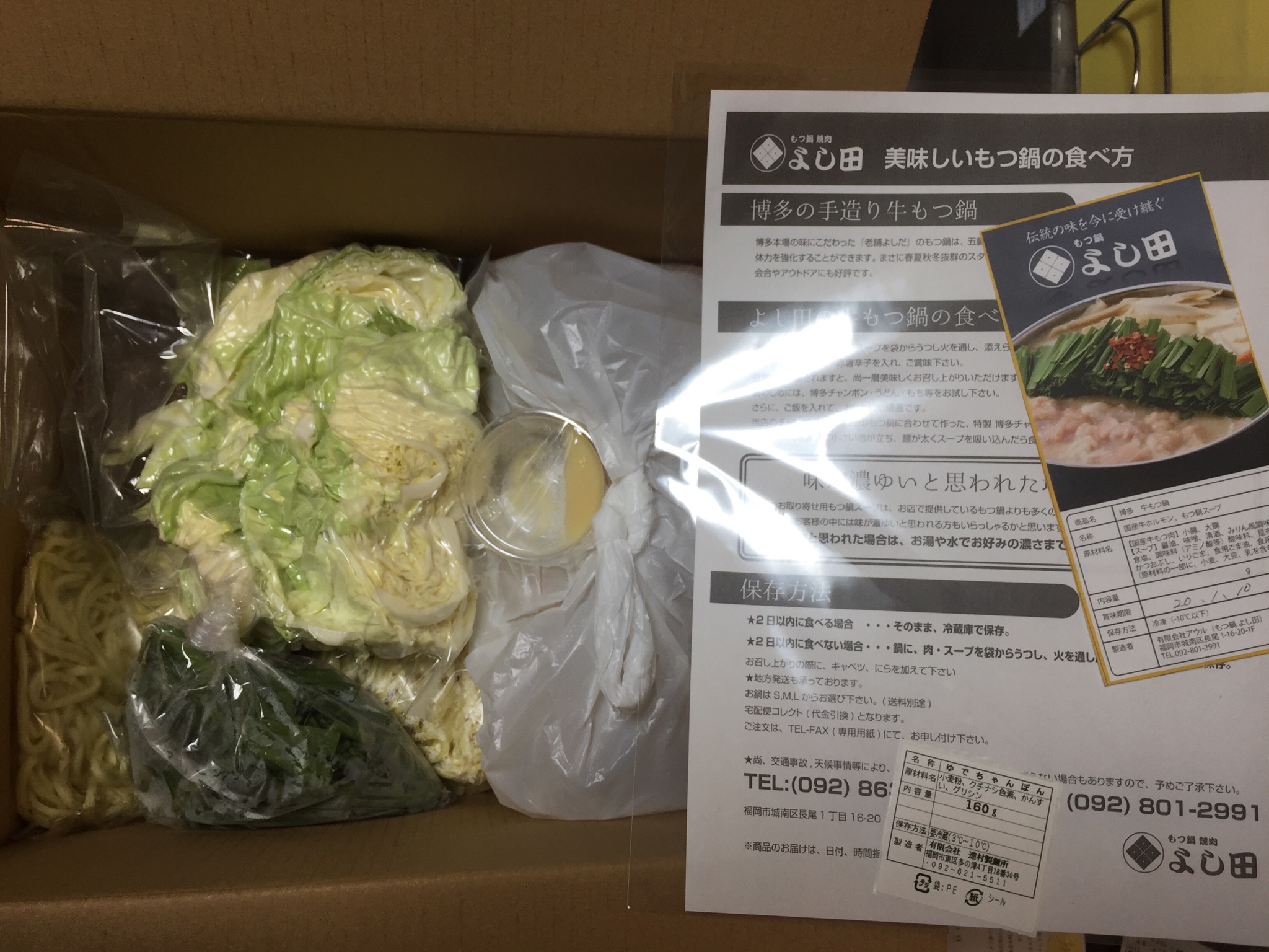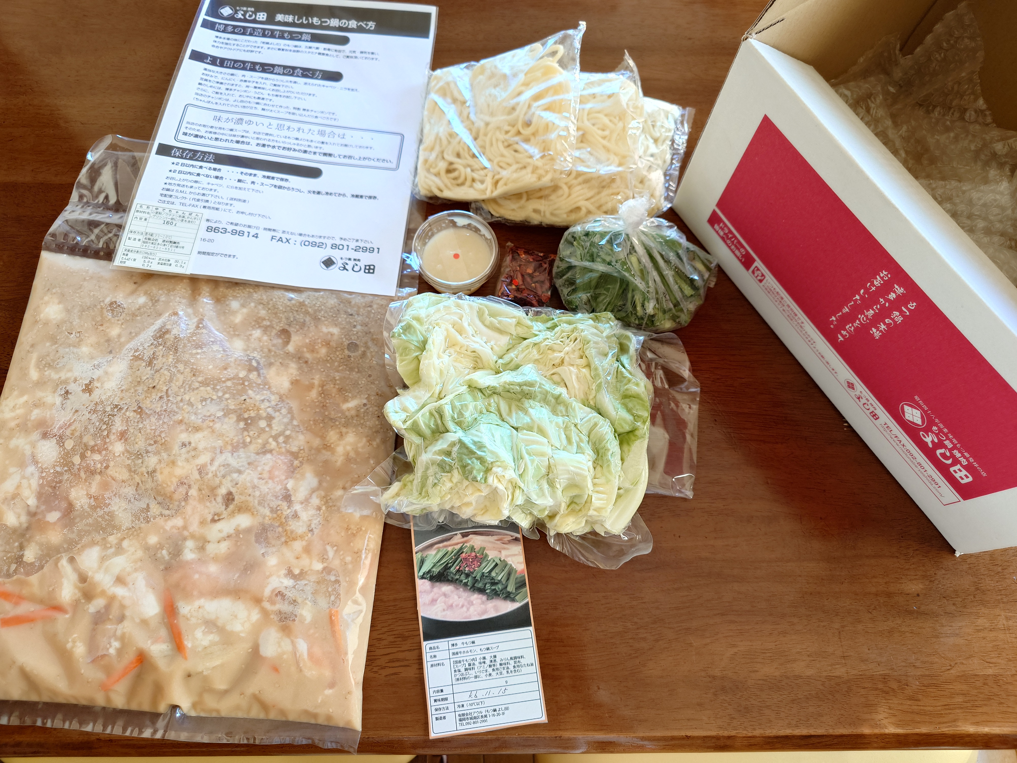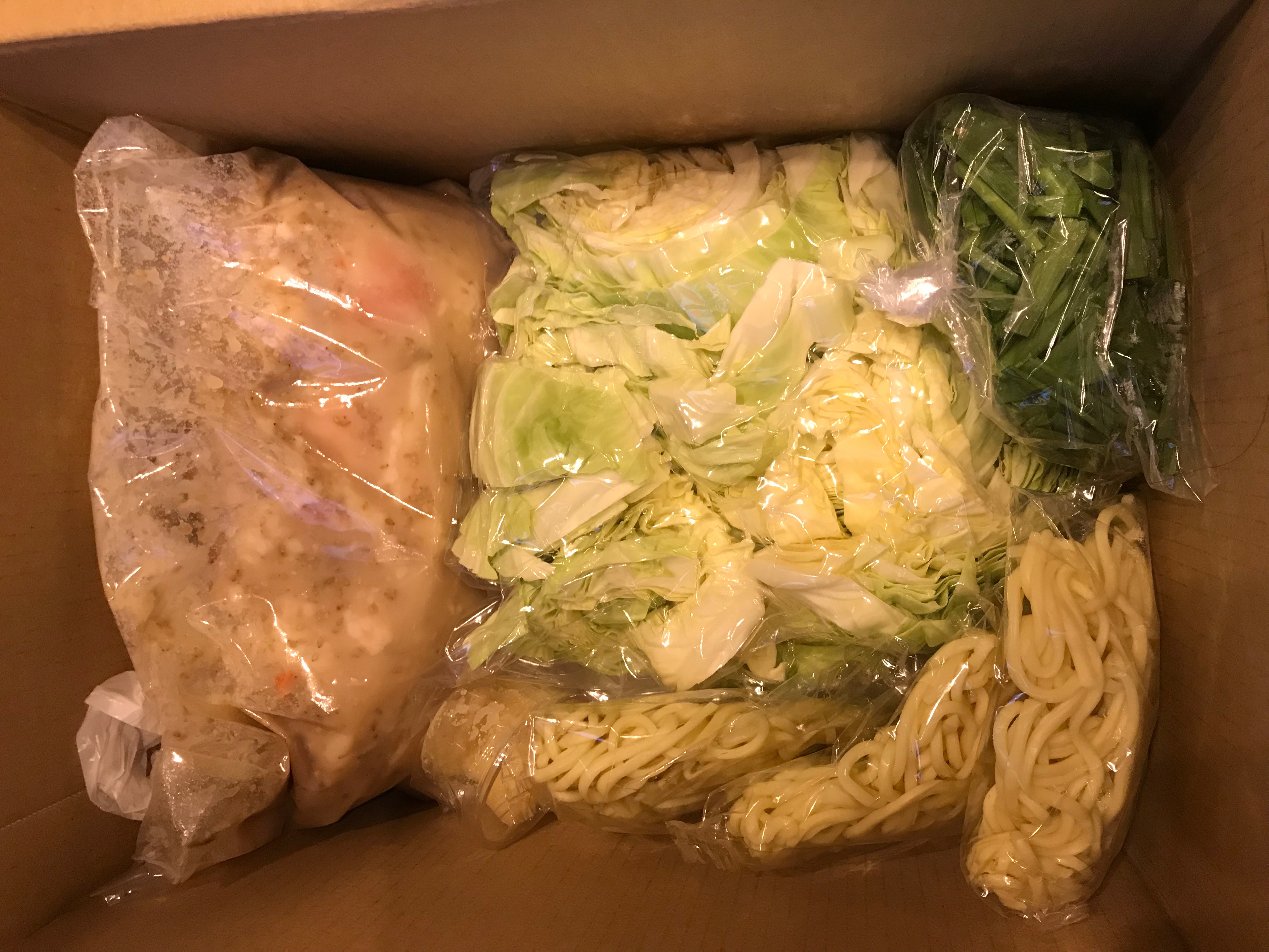 ずっしりと重たい段ボールを開けると、真空パックされたスープ、お野菜、麺、唐辛子、にんにくが入っていました。