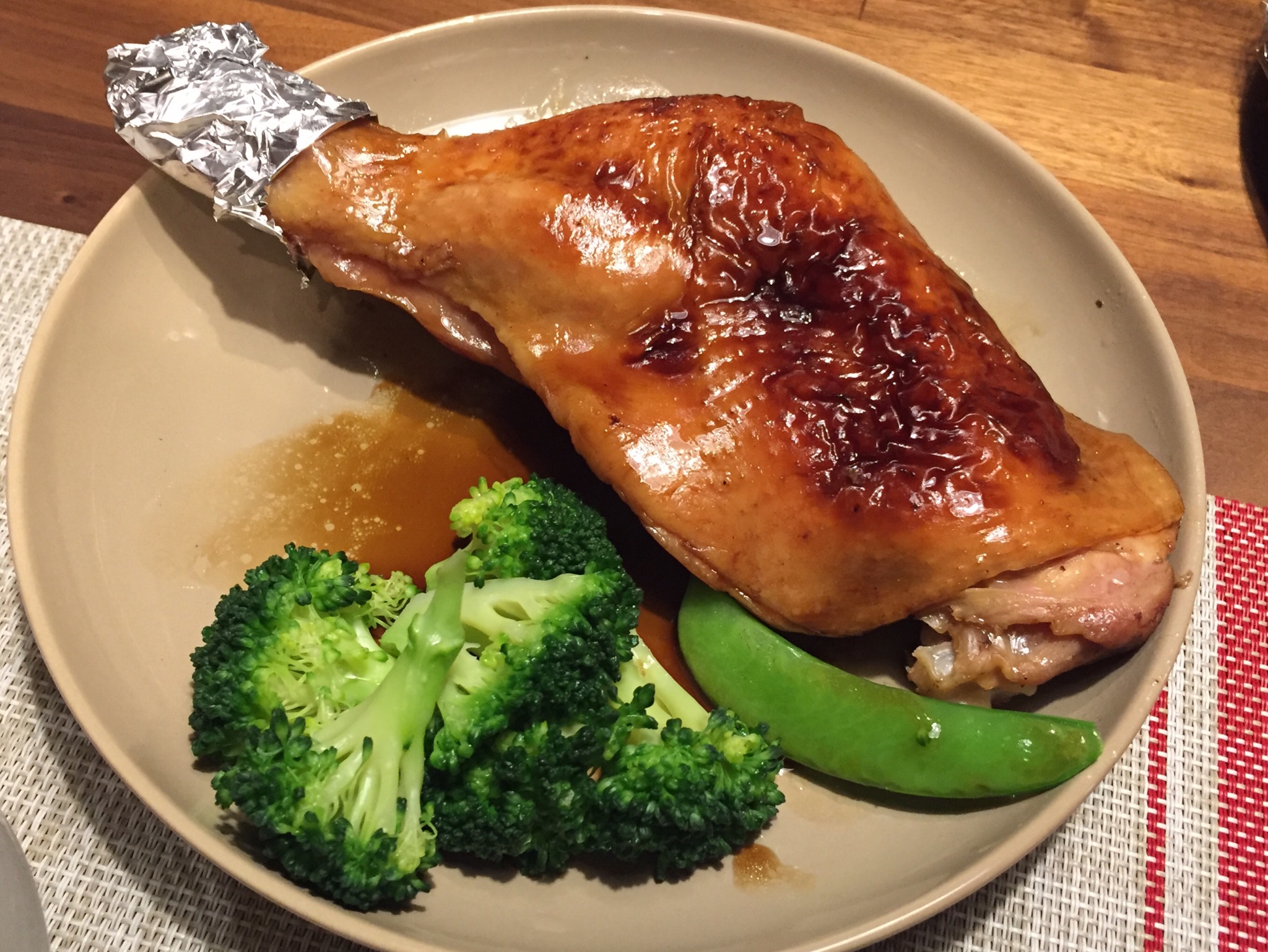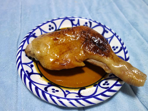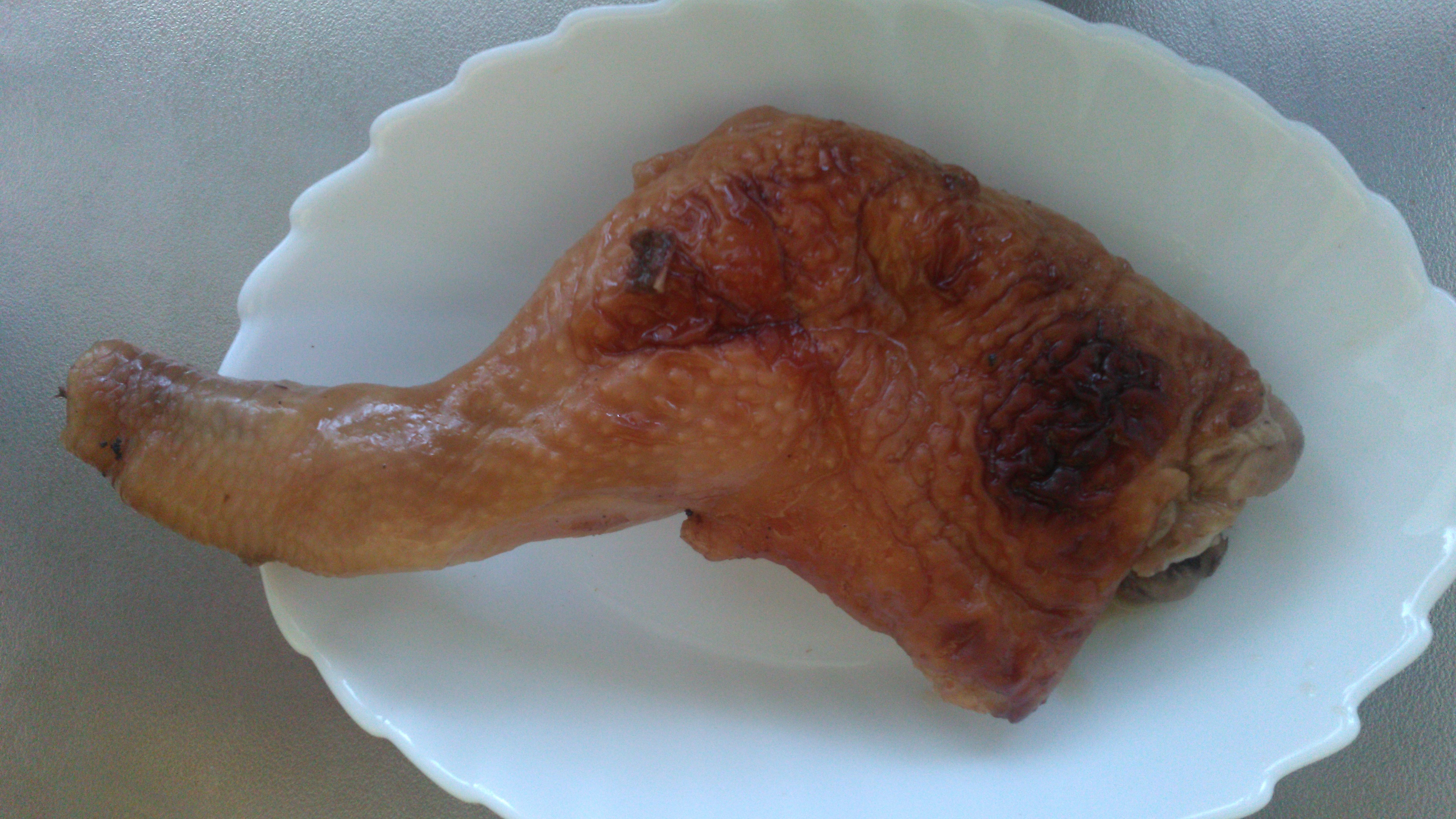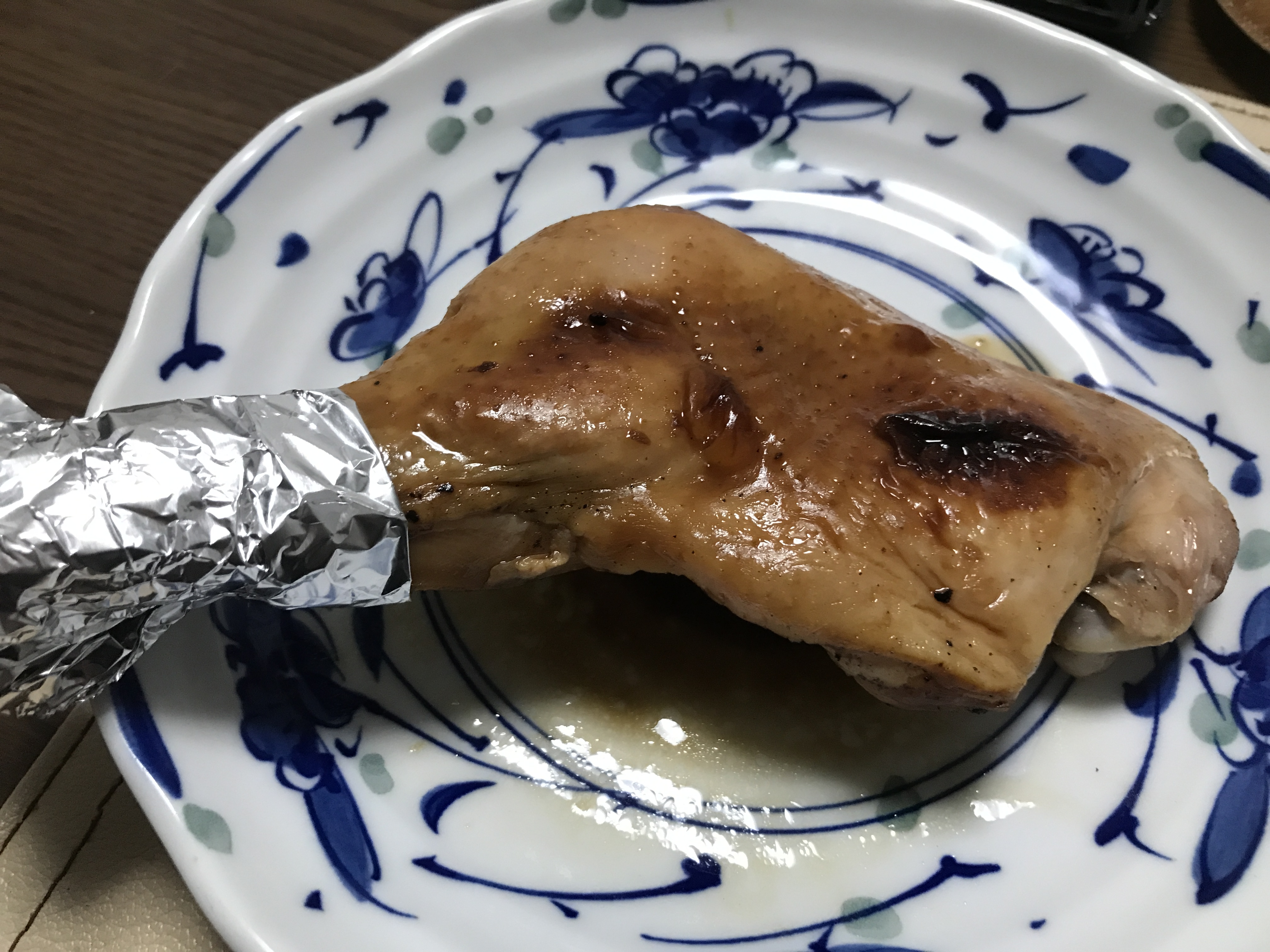 最初はナイフで切ってからいただこうかと思いましたが、この形のローストチキンはやっぱり齧り付きたい!と思い、チキン片手に大きく一口いただきました。