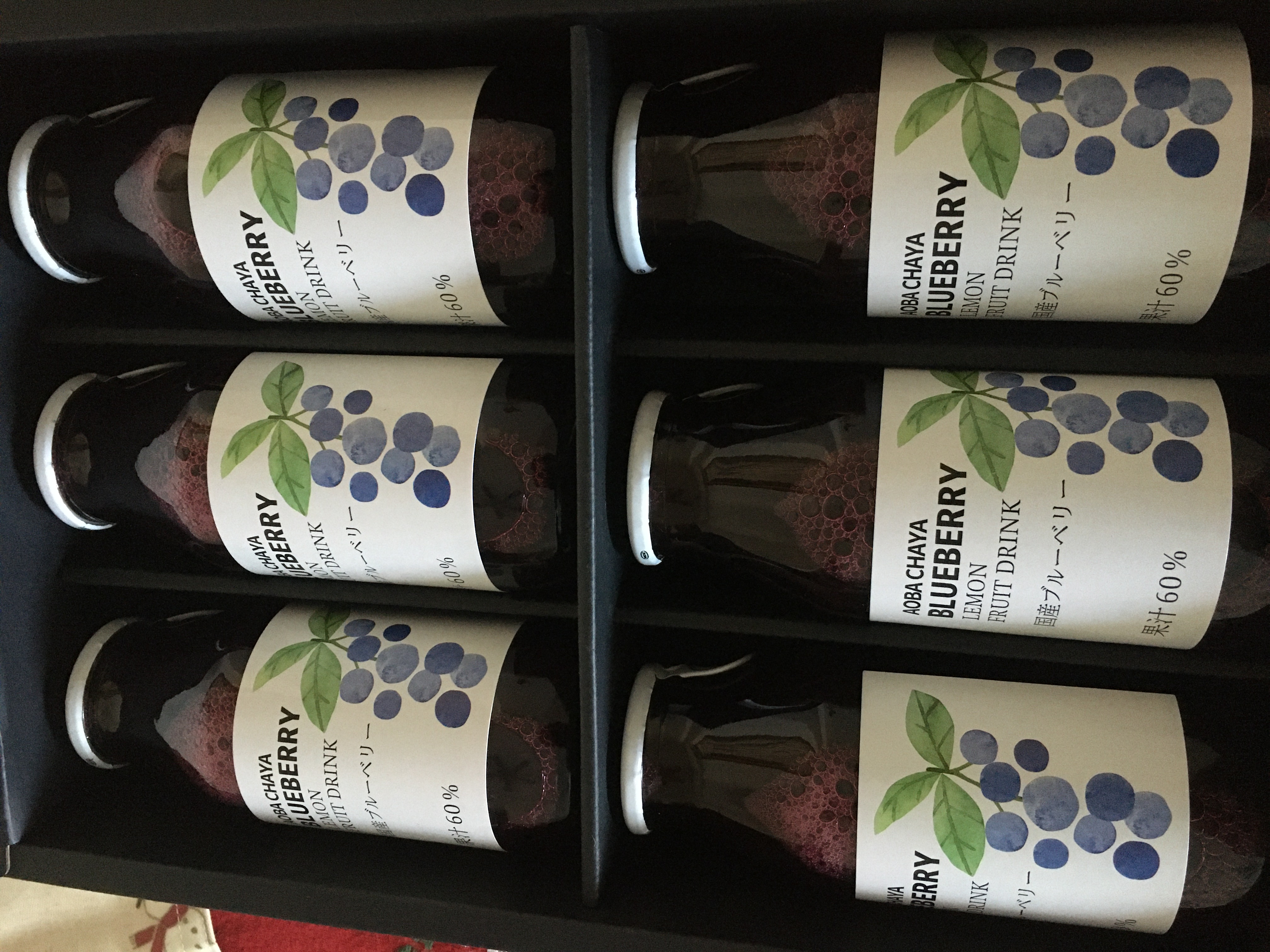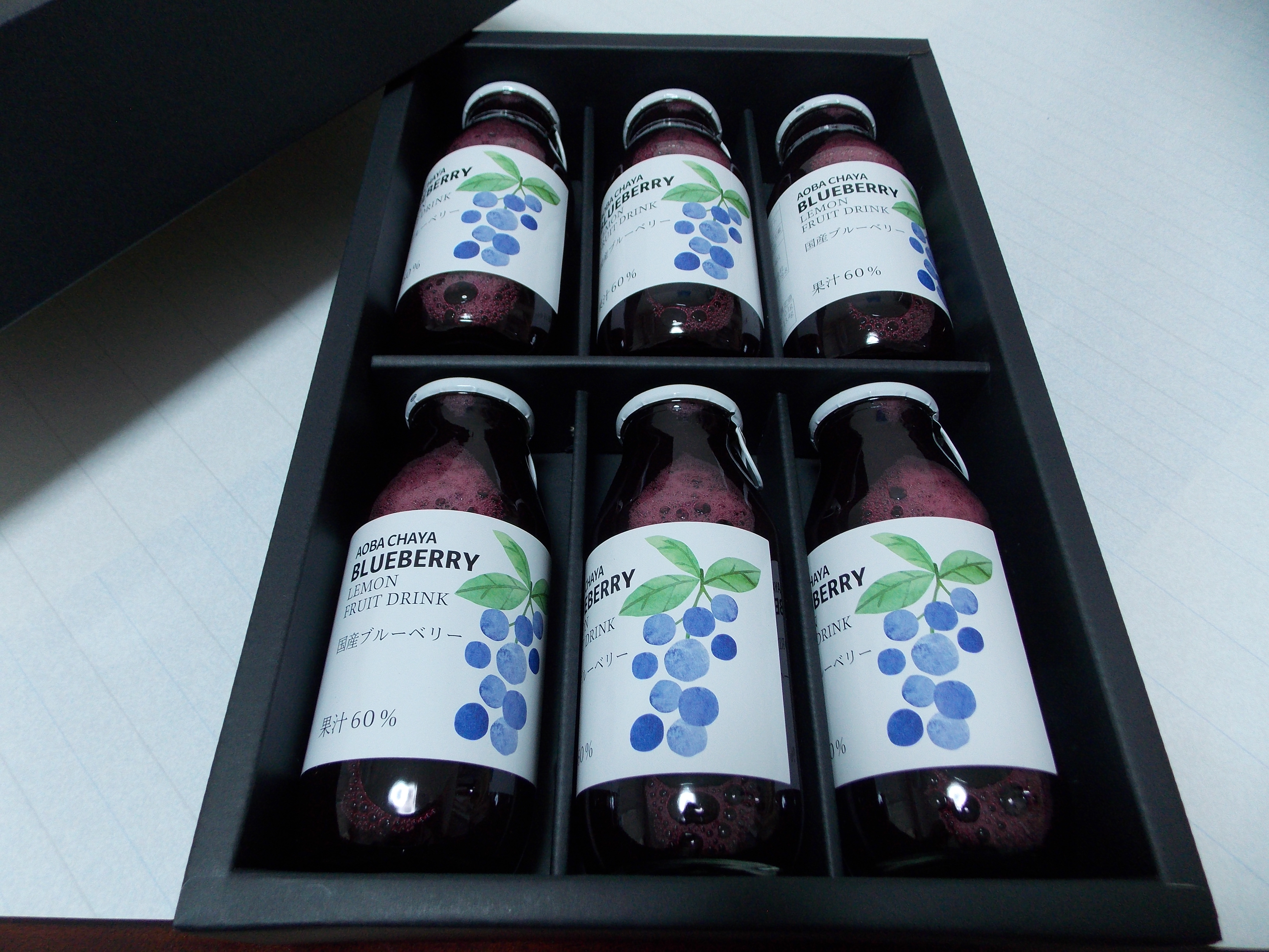 指定の日付と時間帯にきちんと届き、開けてみると高級感のある黒い箱が現れました。箱の中には上品なブルーベリーのイラストが描かれたボトルが6本入っていて、さっそく飲ませて頂きました。