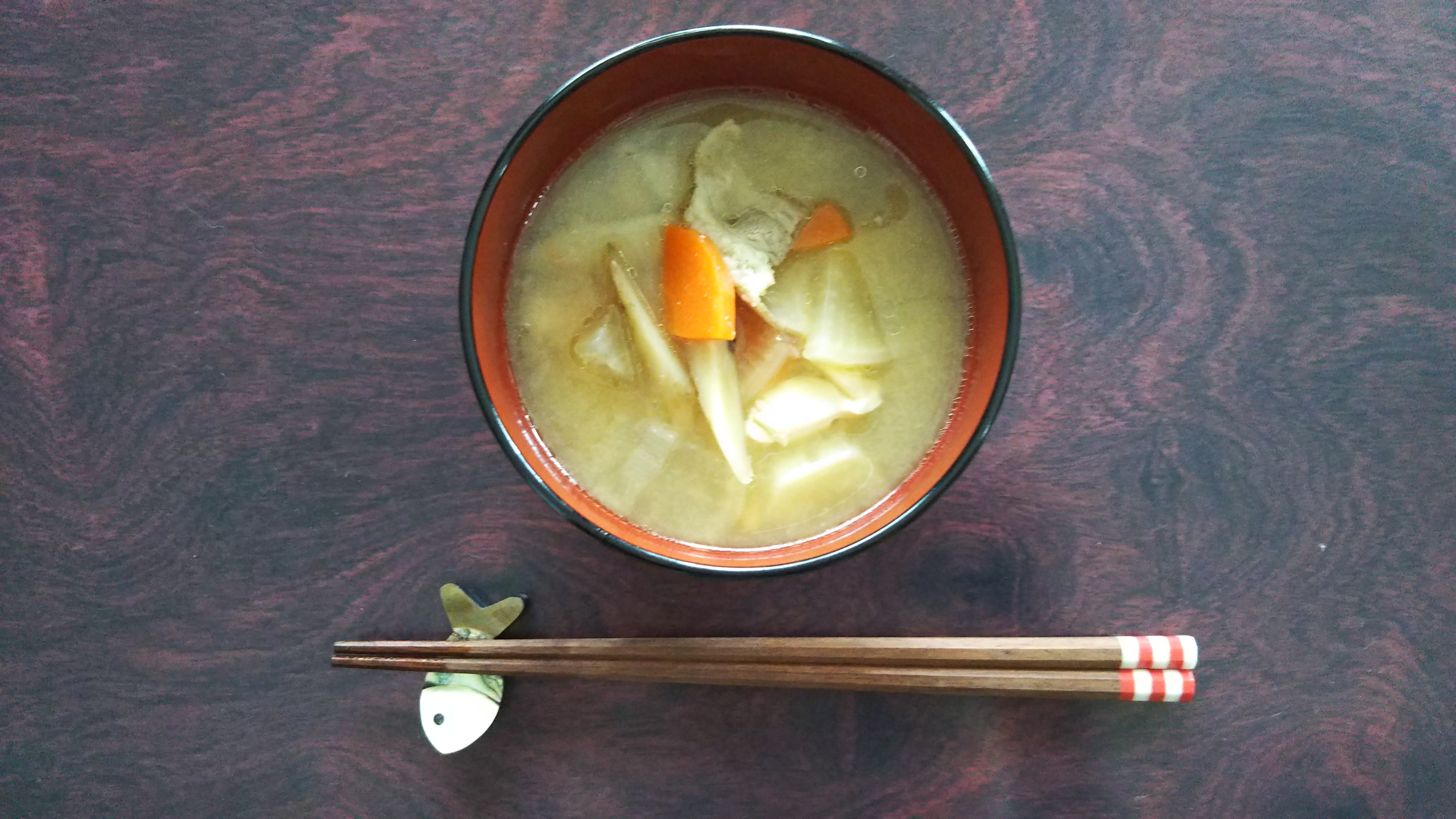 赤だしのお味噌汁:鰹と昆布でお出汁をとり、お野菜とワカメを入れ、あえてお酒とみりんを少しにしましたが、お味噌の深い味わいがよく出ていて美味しかったです。