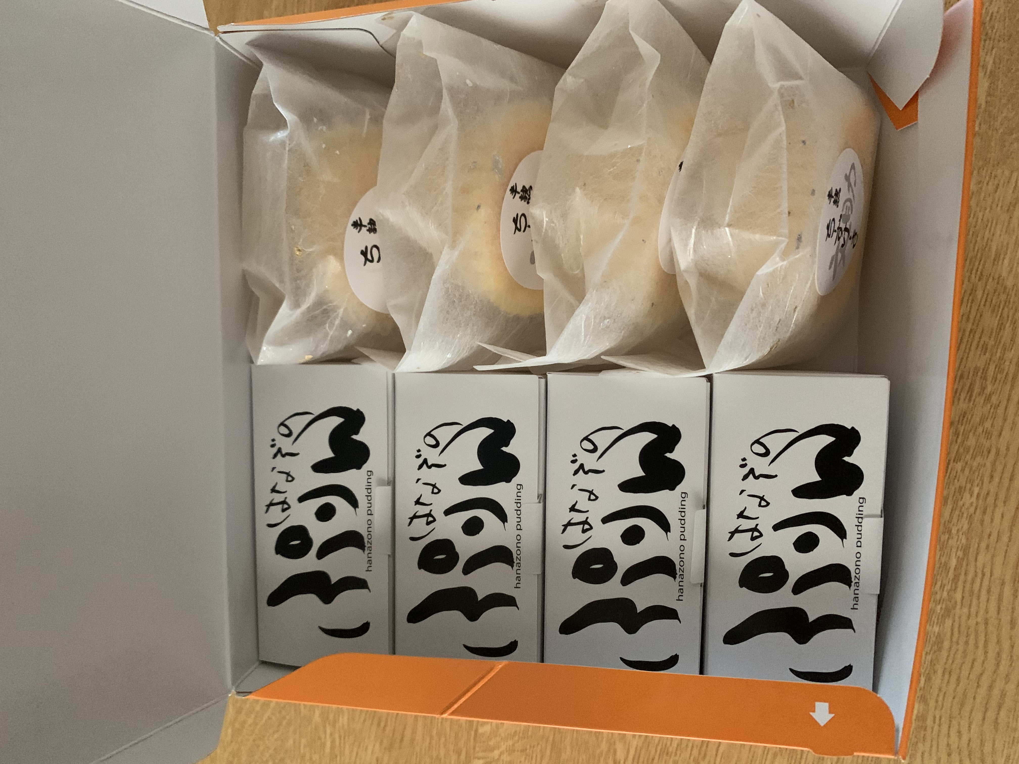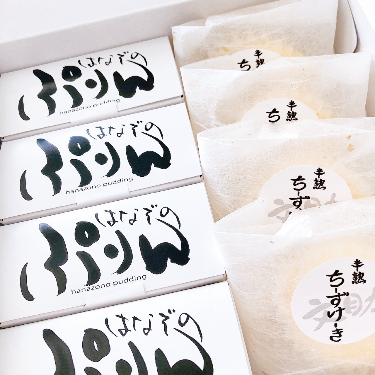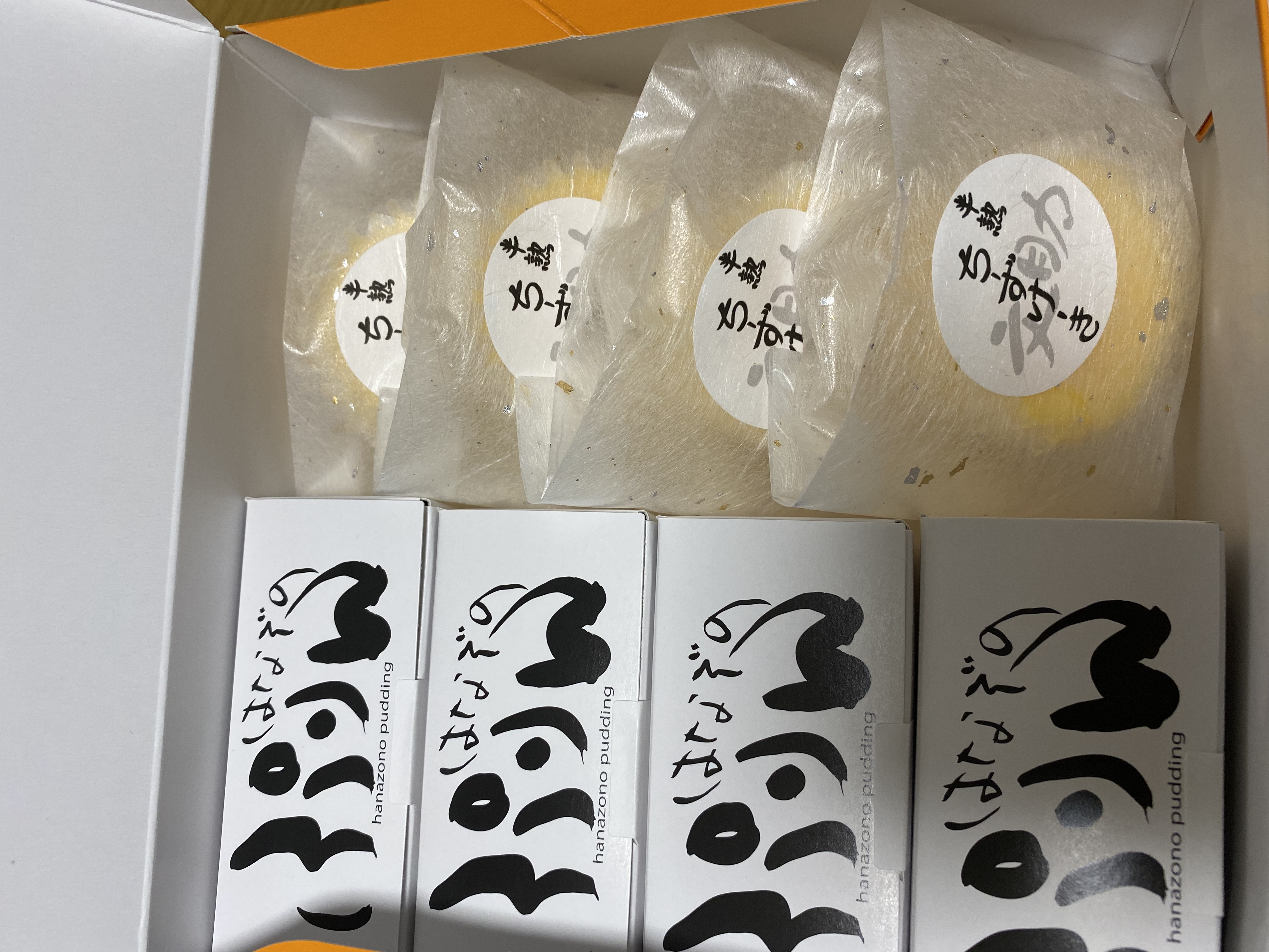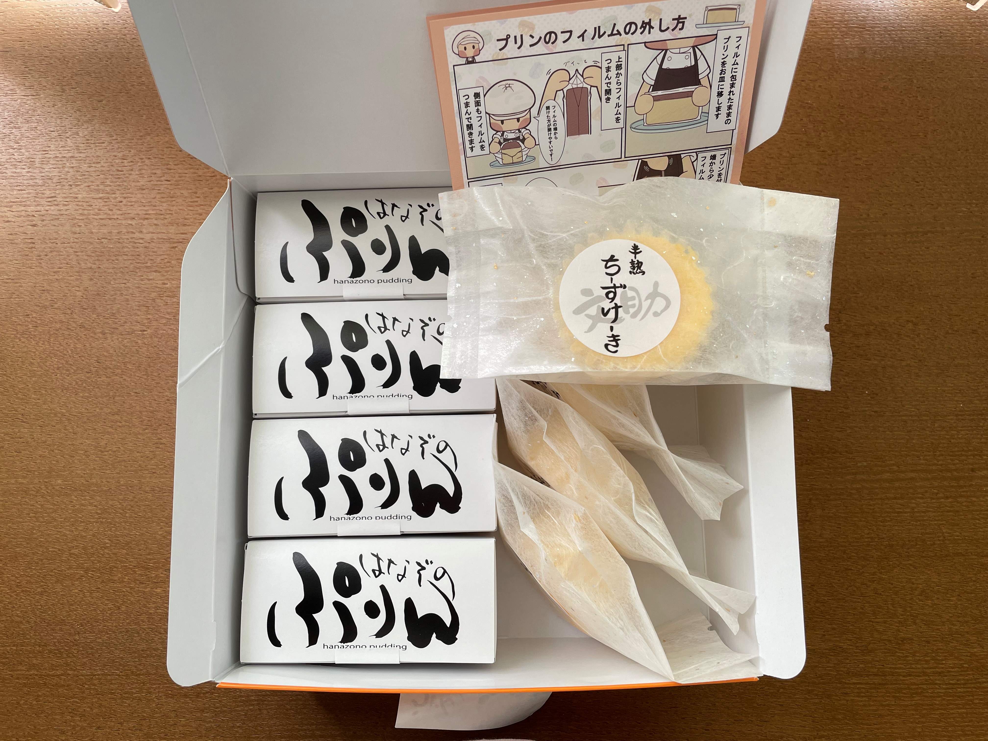 化粧箱の蓋を開けると、サイトで紹介されていた通り、「はなぞのぷりん」が入った長方形の箱が4個、「文助の半熟チーズケーキ」がこれも個包装で4個、計8個が入っていました。