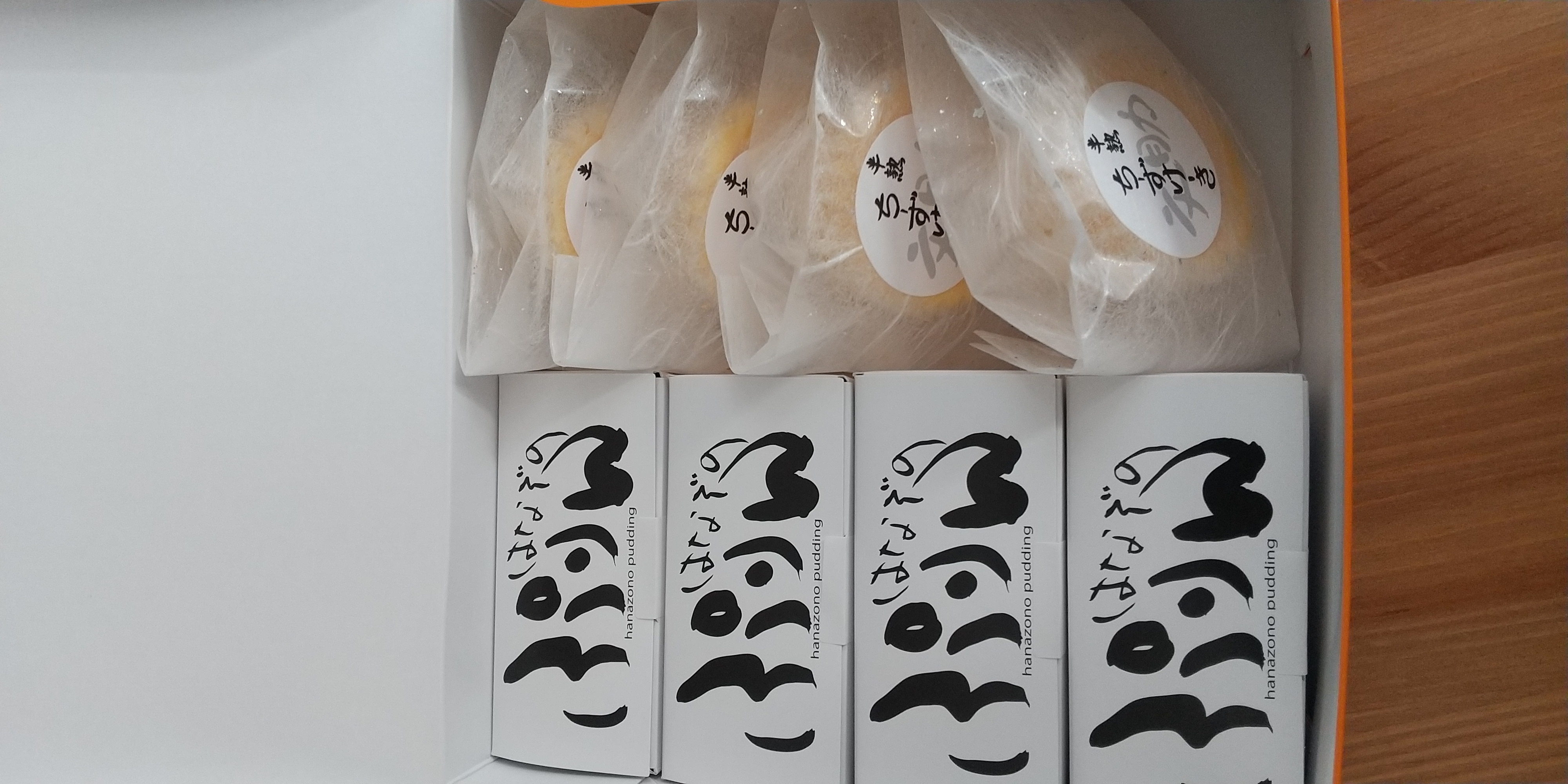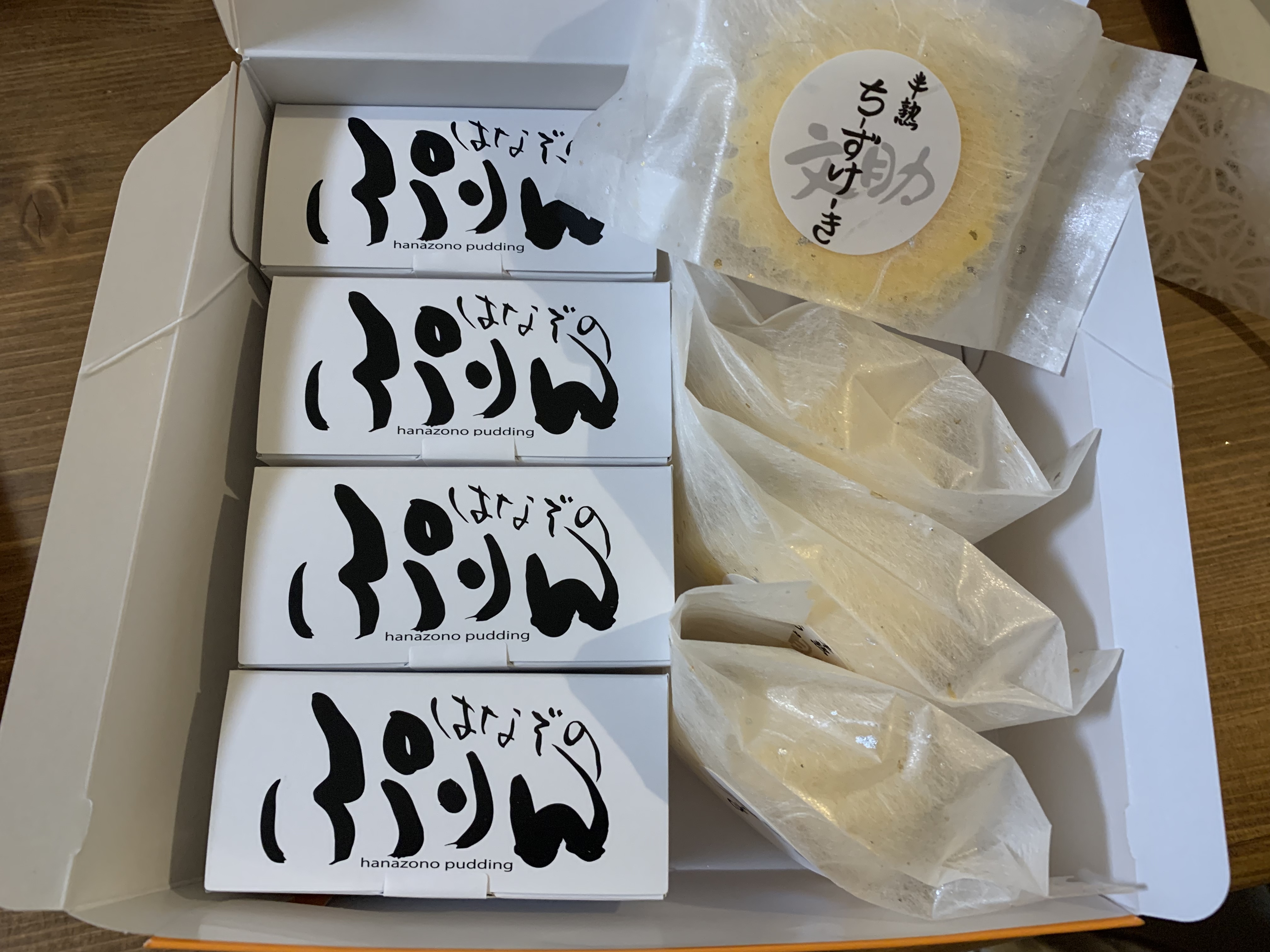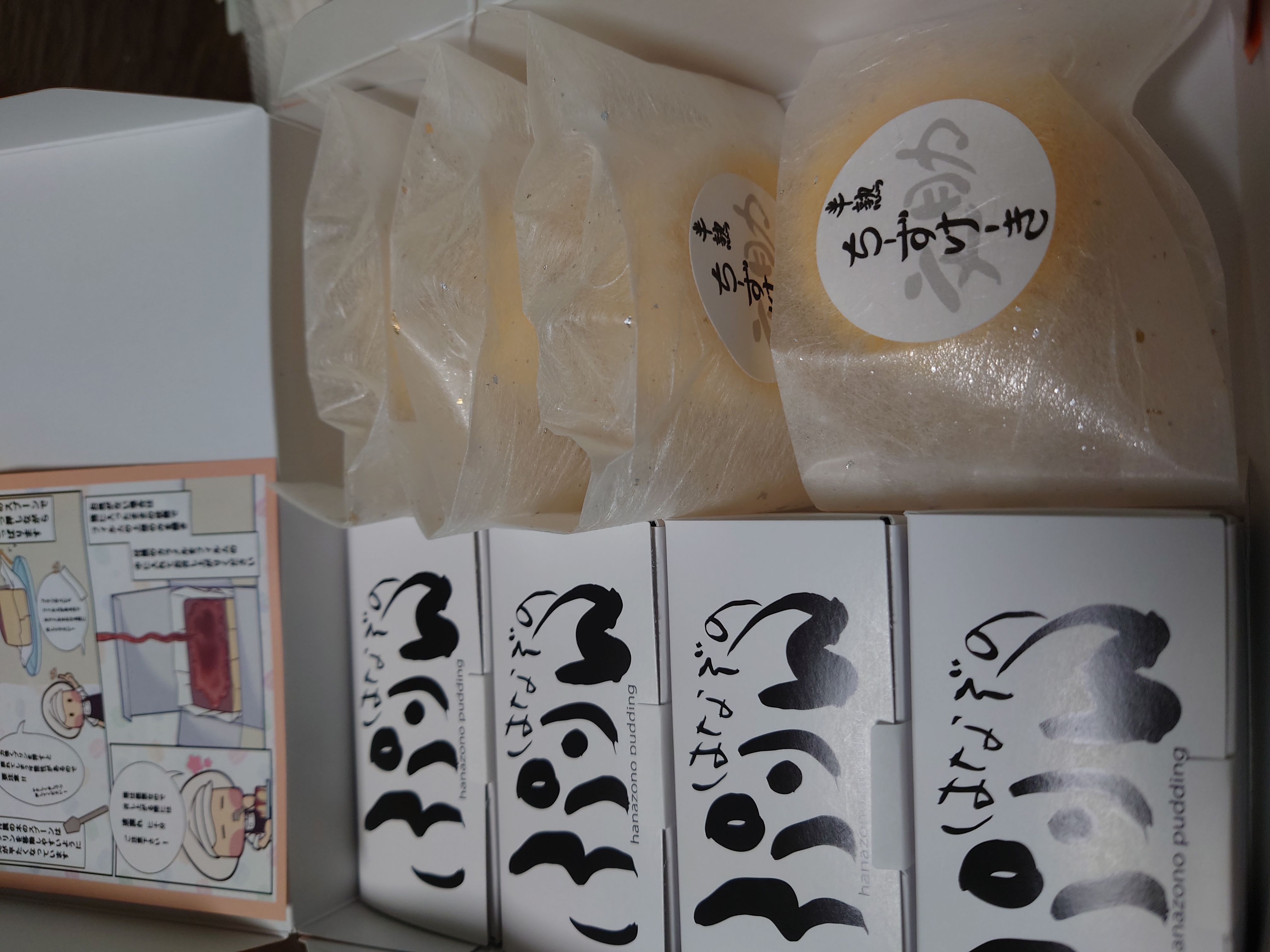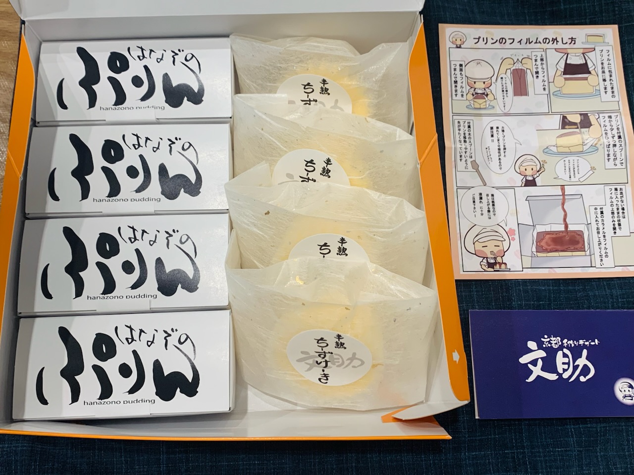 化粧箱の蓋を開けると、サイトで紹介されていた通り、「はなぞのぷりん」が入った長方形の箱が4個、「文助の半熟チーズケーキ」がこれも個包装で4個、計8個が入っていました。