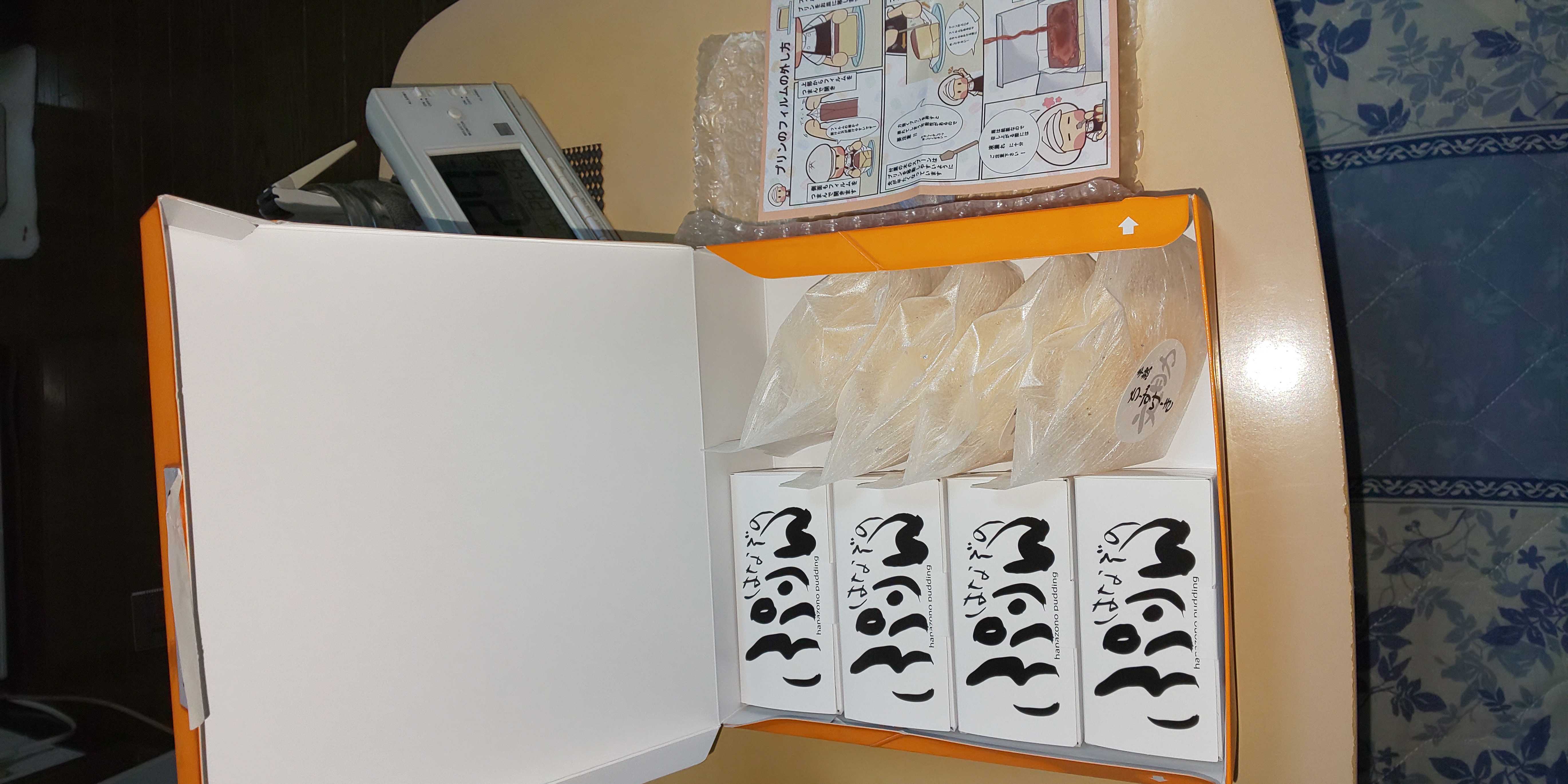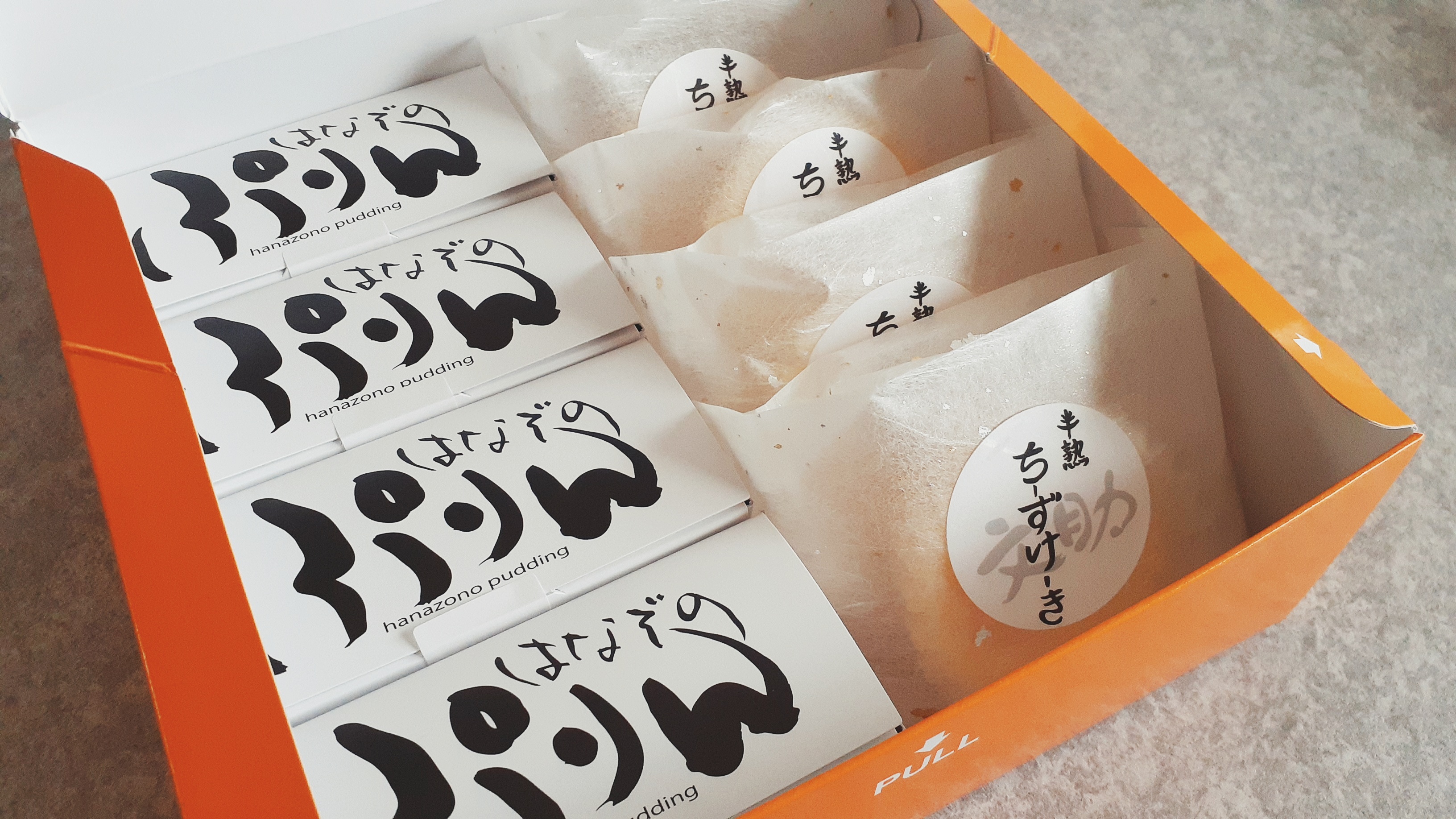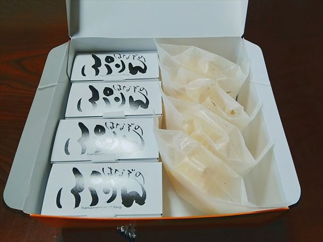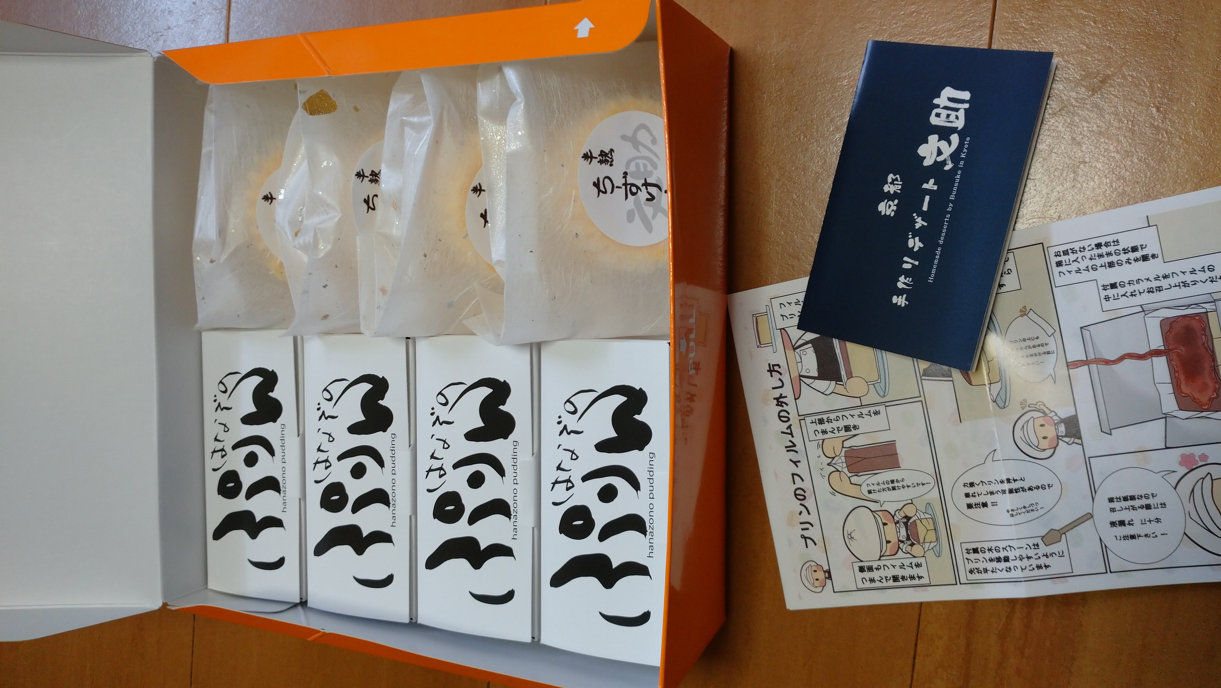 化粧箱の蓋を開けると、サイトで紹介されていた通り、「はなぞのぷりん」が入った長方形の箱が4個、「文助の半熟チーズケーキ」がこれも個包装で4個、計8個が入っていました。