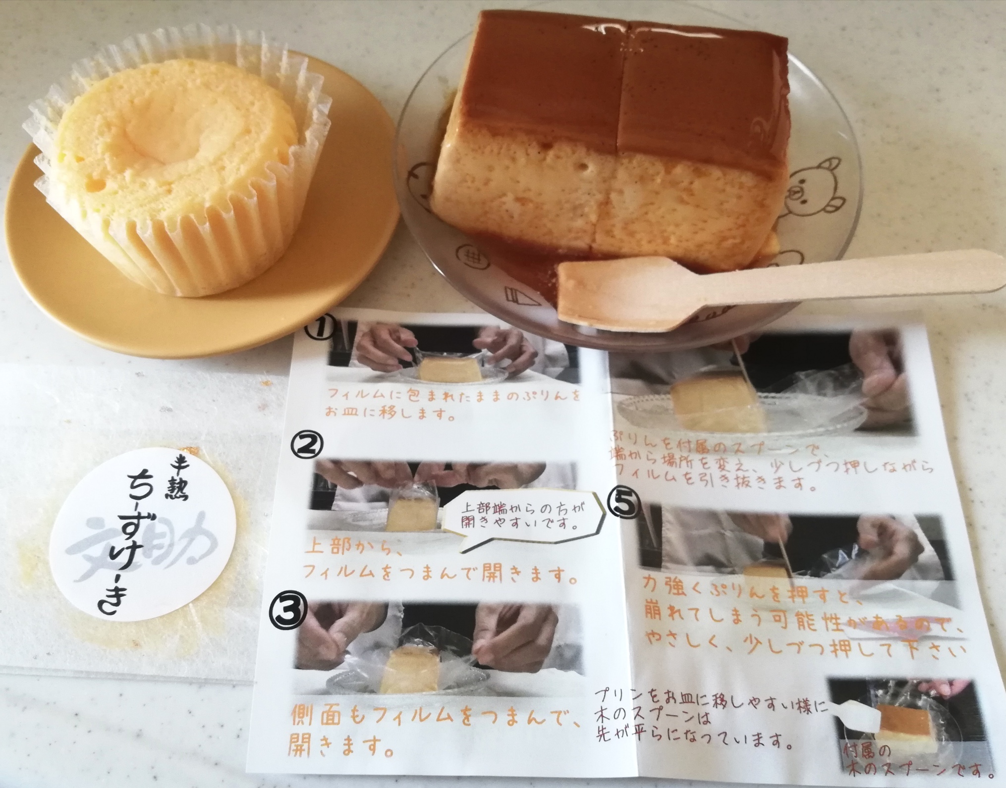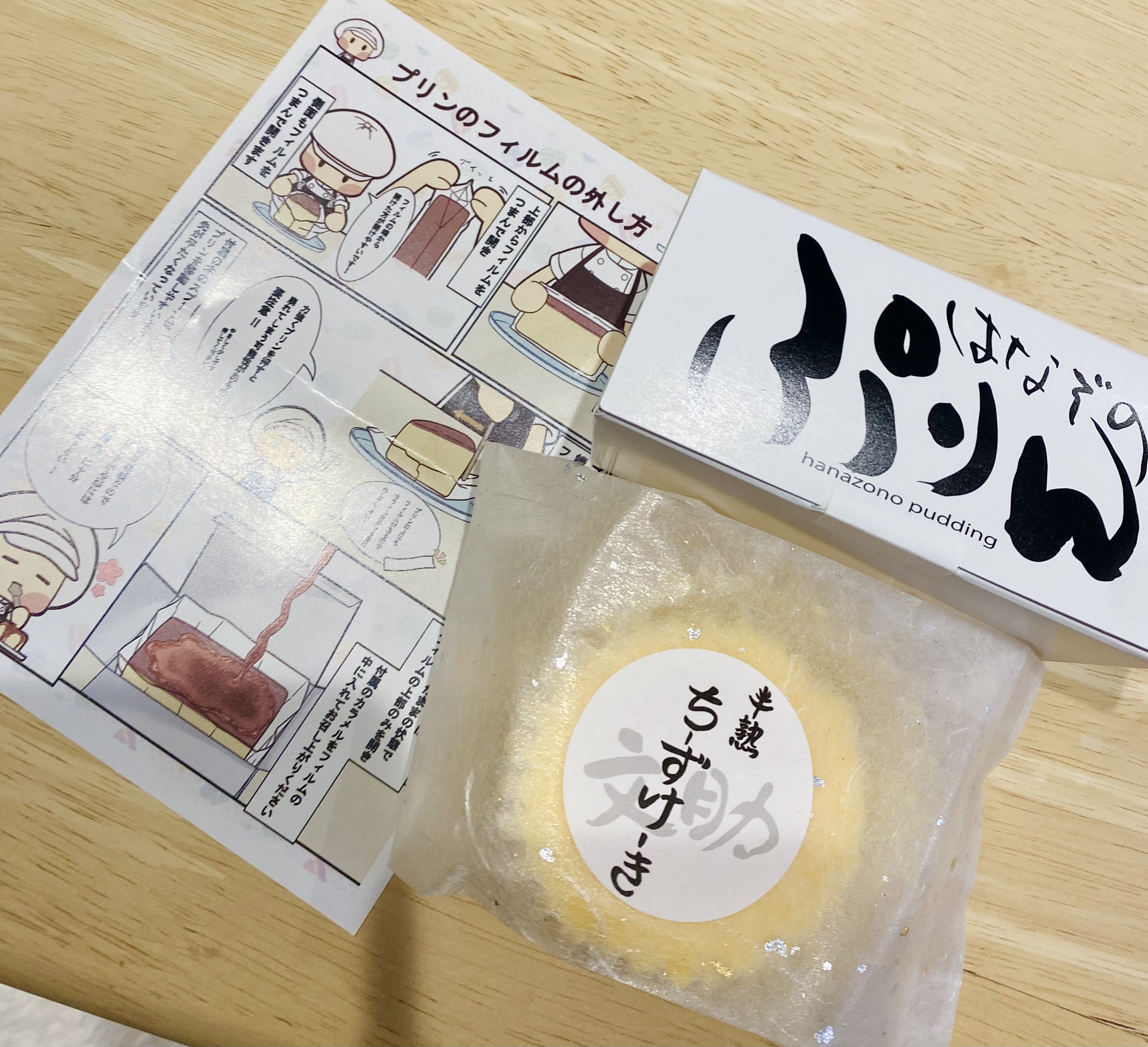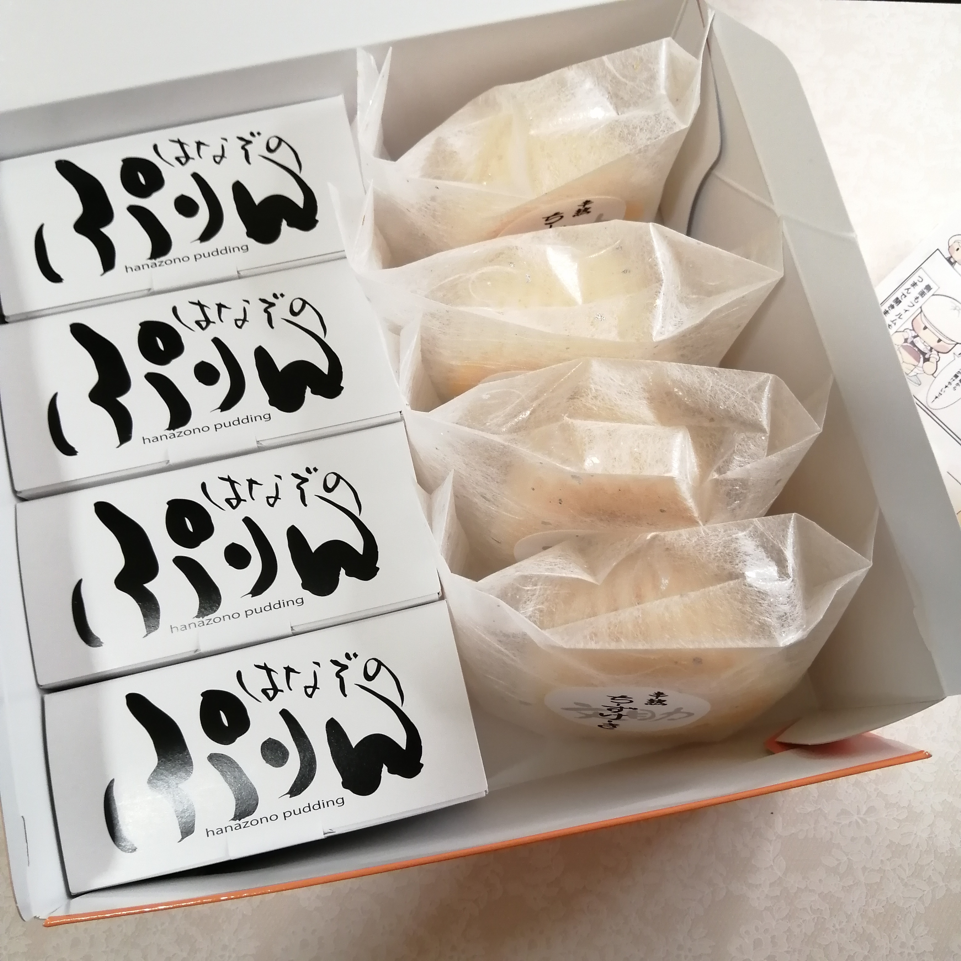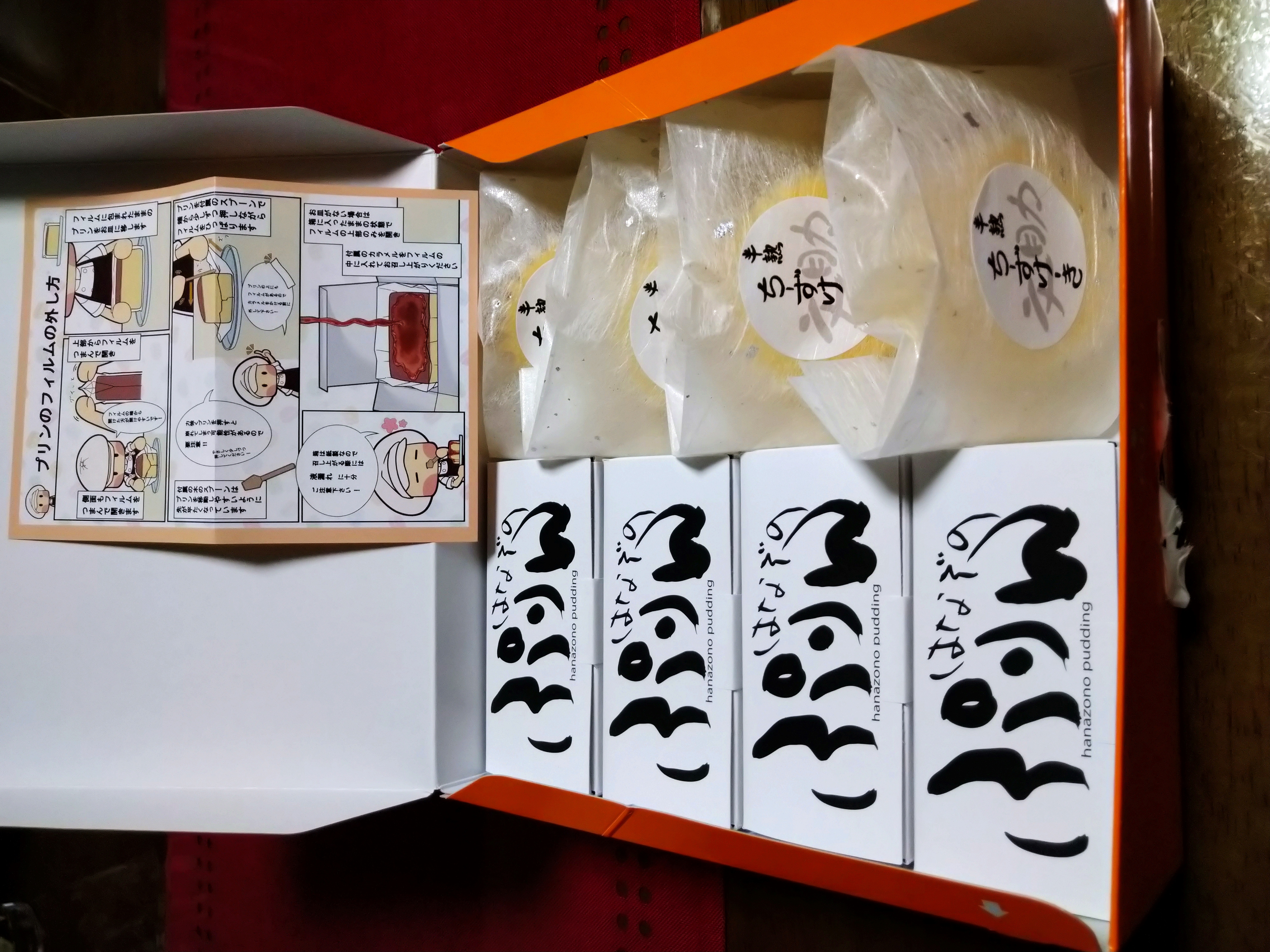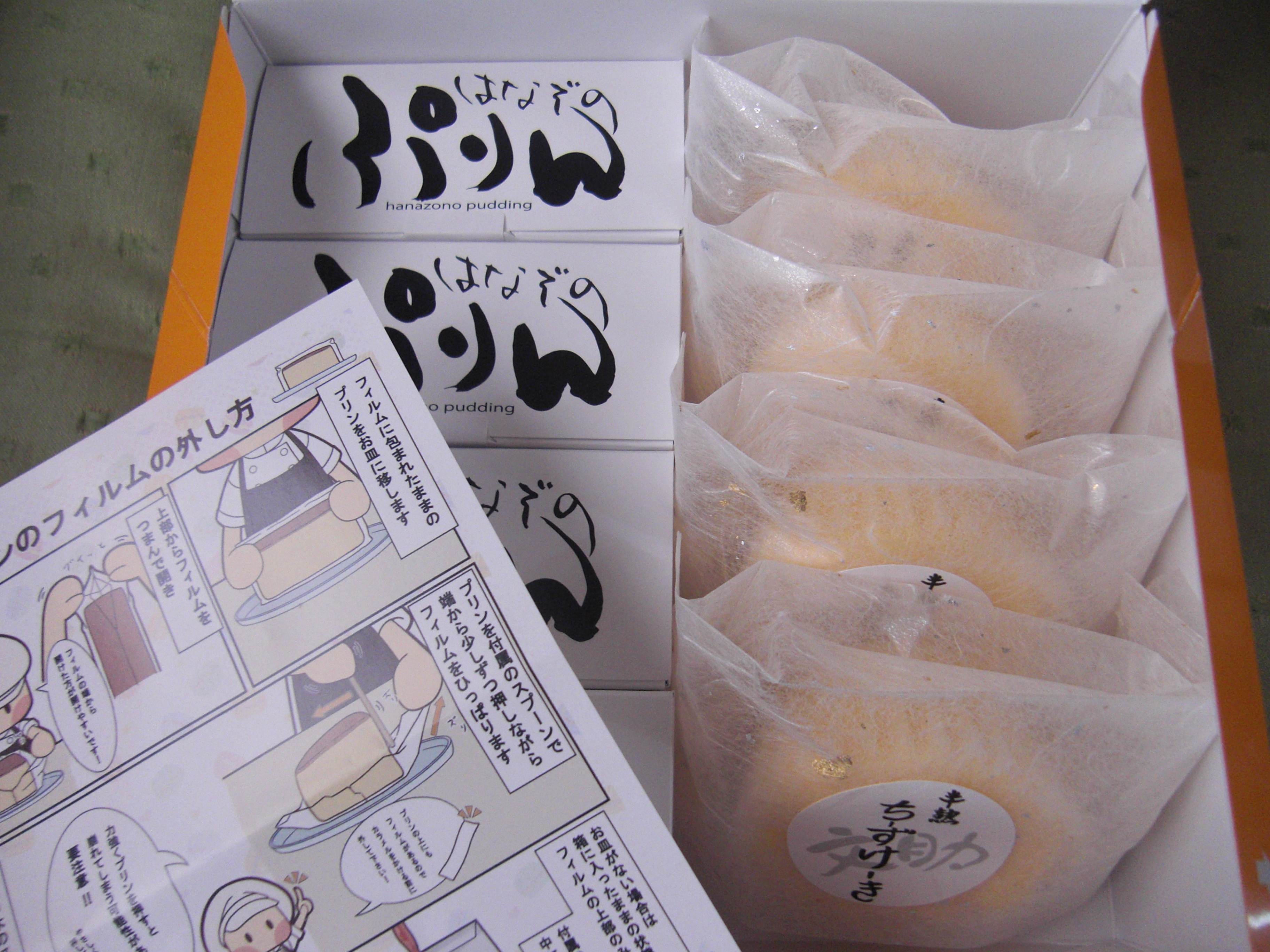 「はなぞのぷりん」のお皿への取り出し方、フィルムの外し方、お皿が無い場合 箱から出さずにそのままきれいに食べる方法などが、イラストや写真で丁寧に説明された、二つ折りのリーフレットも添えられていました。但し、これは一枚だけです。個別包装の各々のぷりんに添付されているわけではありません。