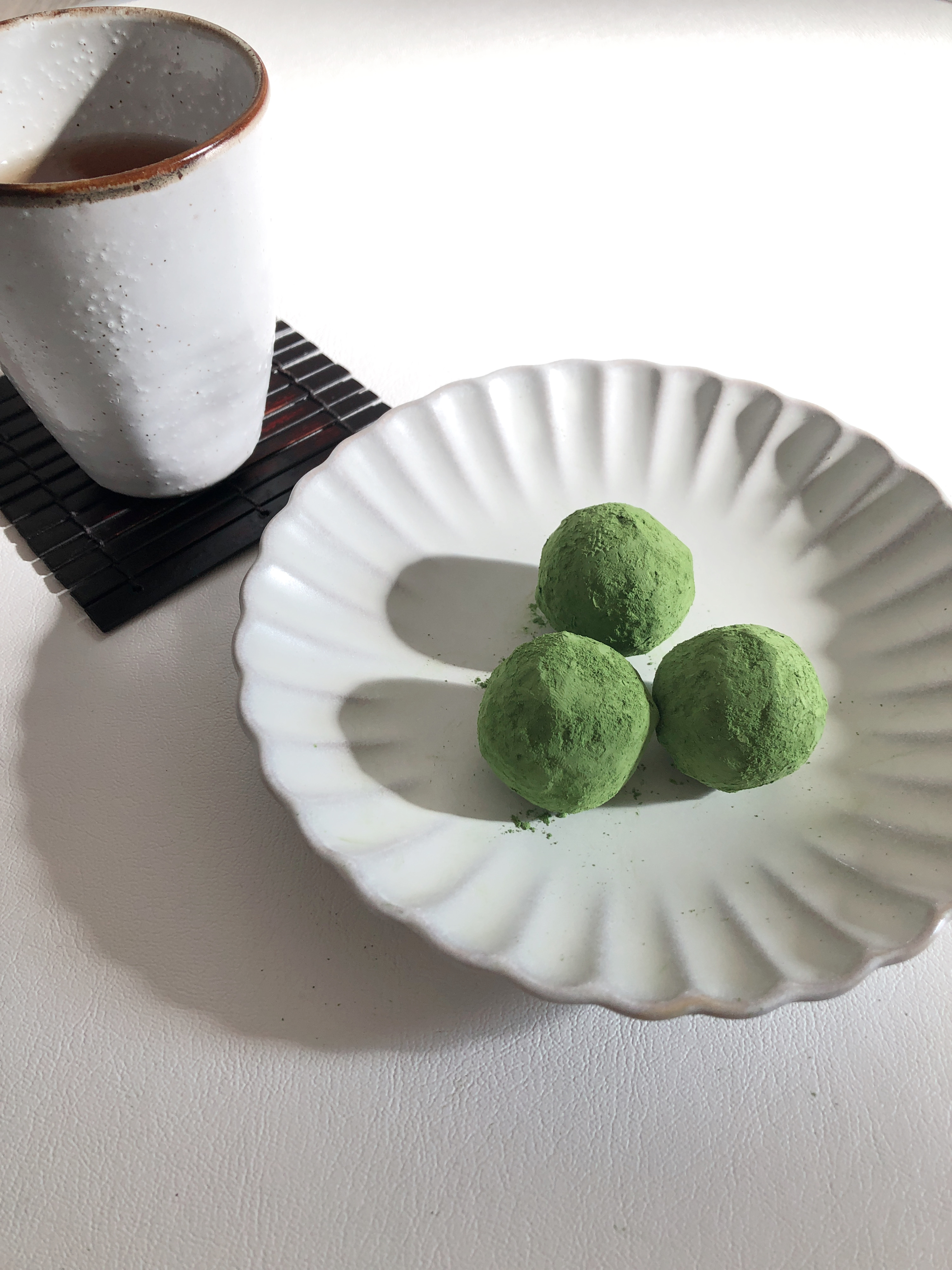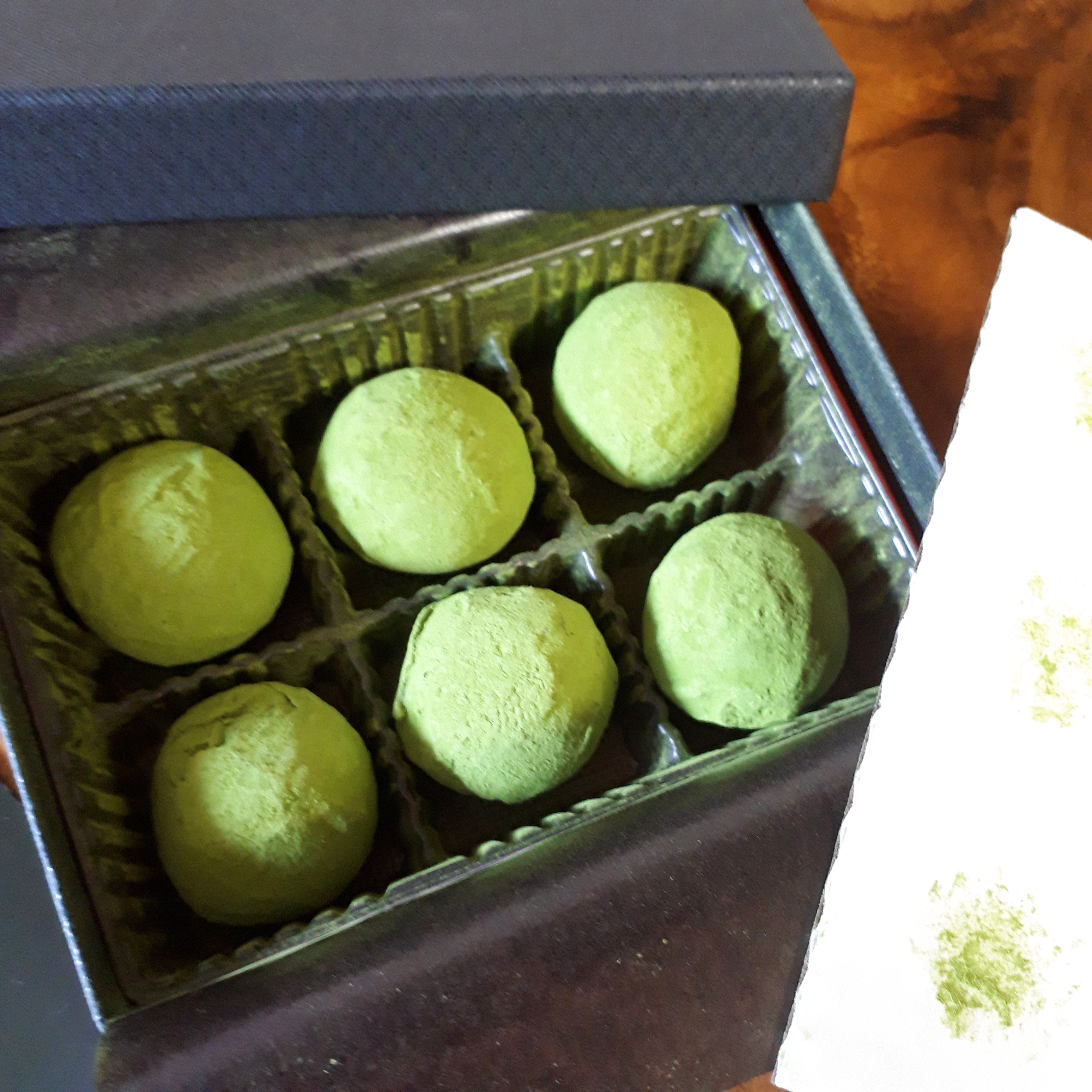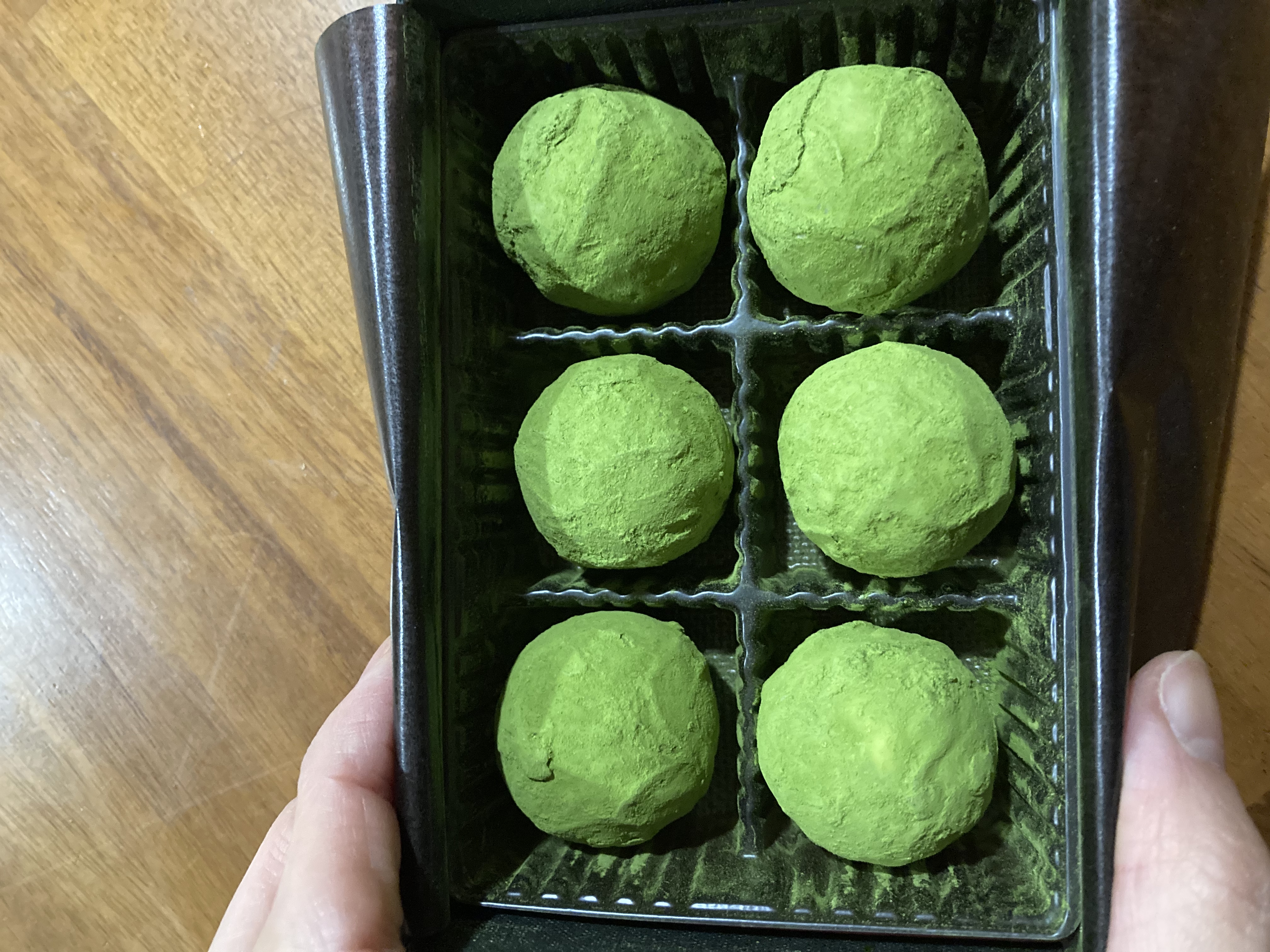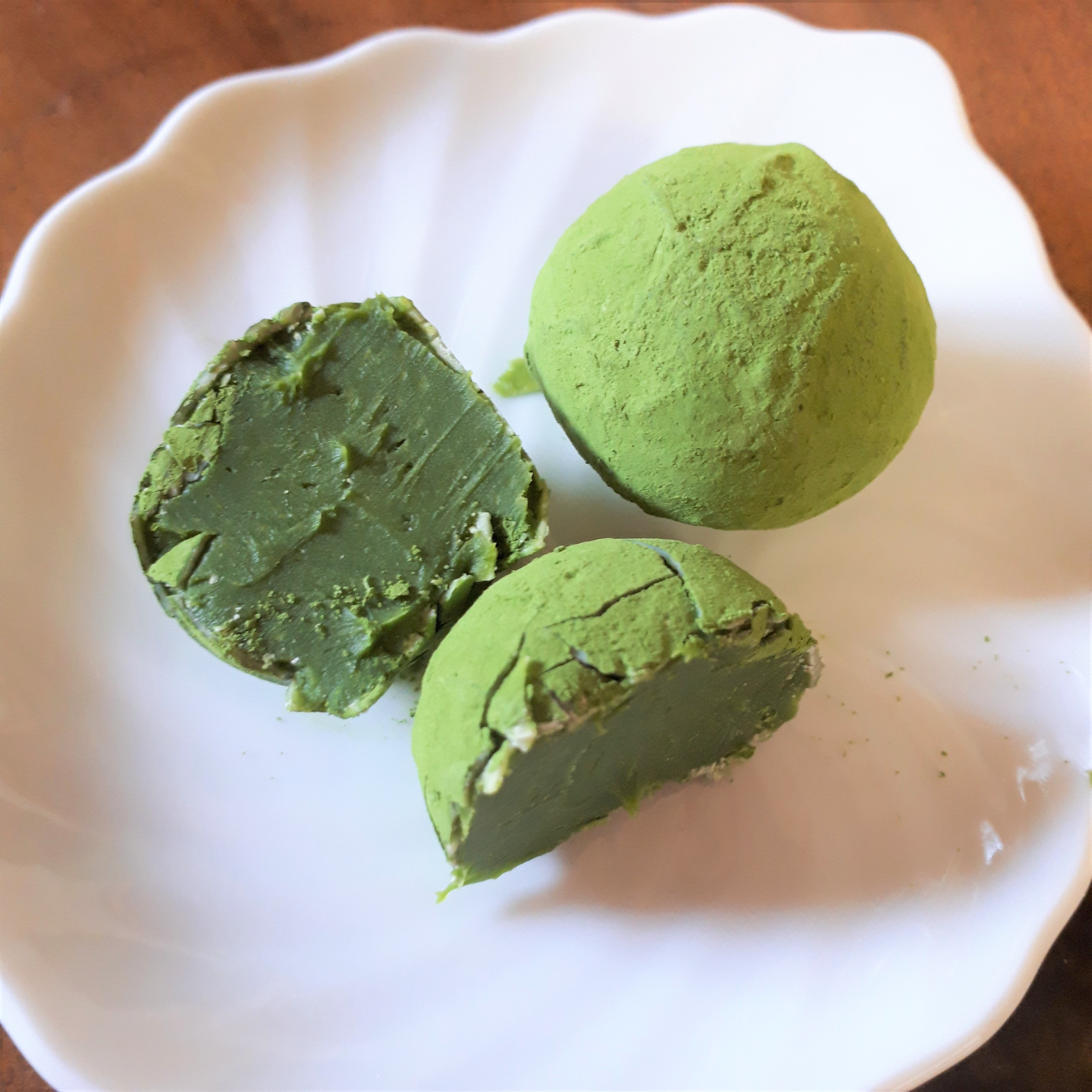 外側の抹茶パウダーと中の抹茶チョコレートの2種類の苦味が、中間のホワイトチョコレートの優しい甘さでマイルドに調和されているなと思いました。一粒を2〜3口で丁寧に味わいながらゆっくりとティータイムを楽しむ一品だと感じました。