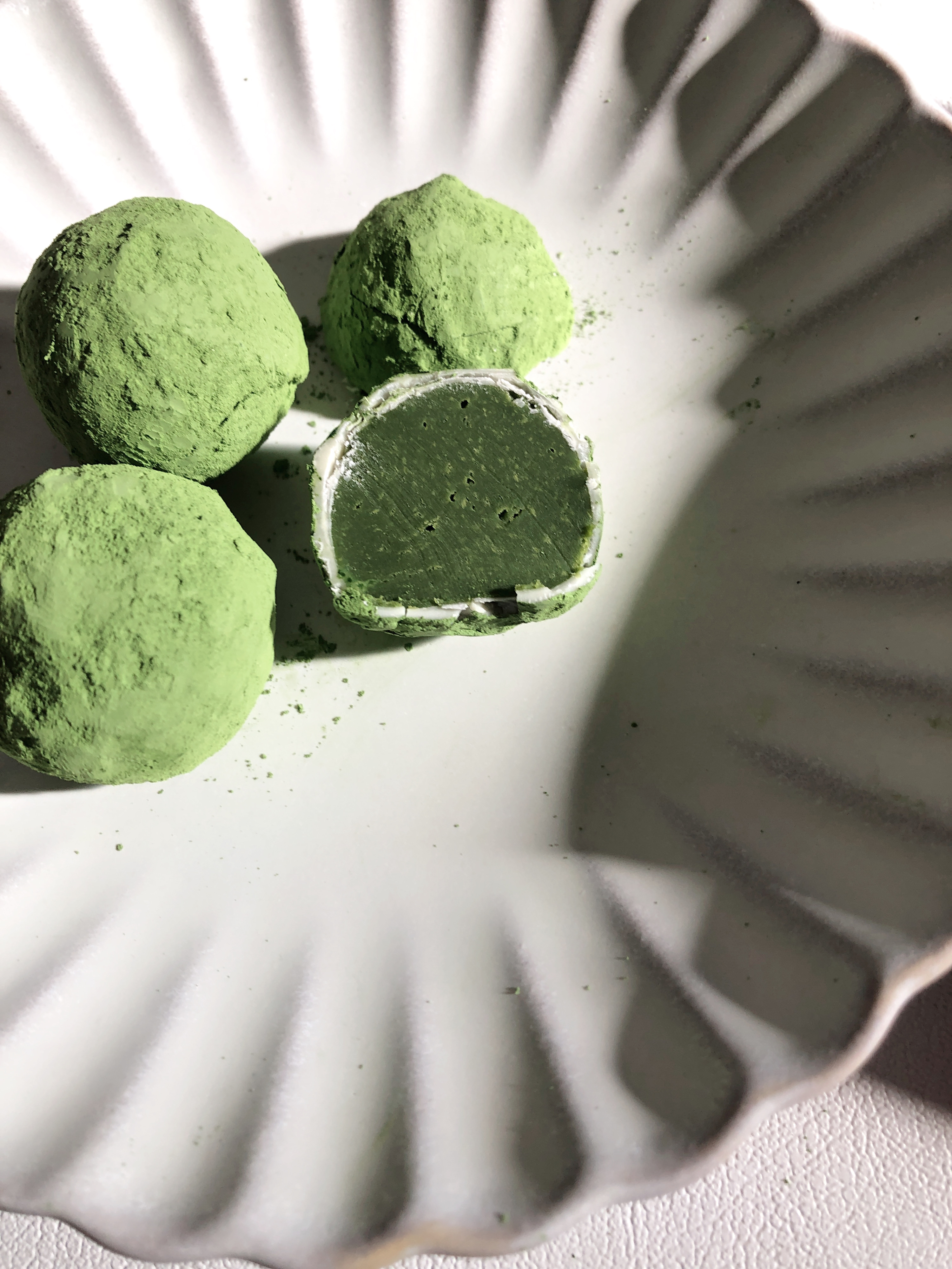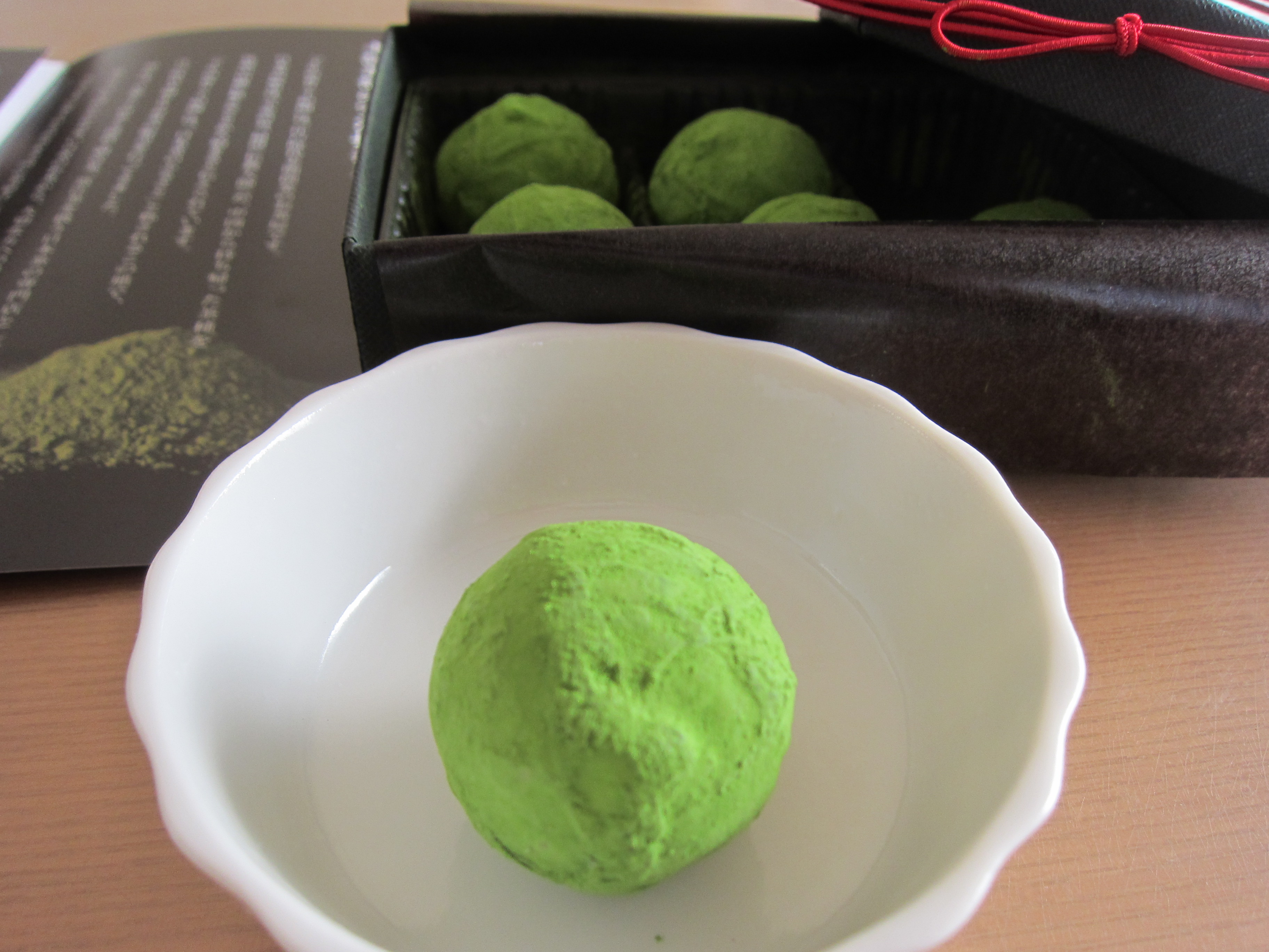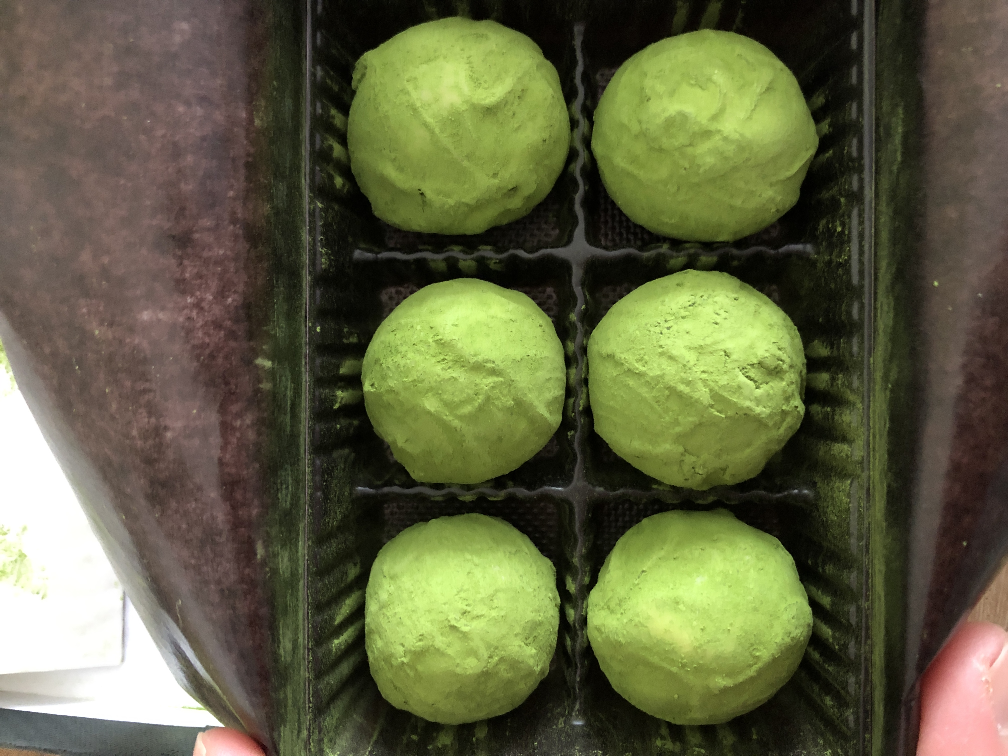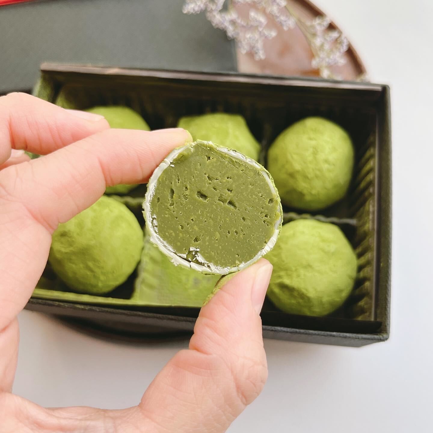 外側の抹茶パウダーと中の抹茶チョコレートの2種類の苦味が、中間のホワイトチョコレートの優しい甘さでマイルドに調和されているなと思いました。一粒を2〜3口で丁寧に味わいながらゆっくりとティータイムを楽しむ一品だと感じました。