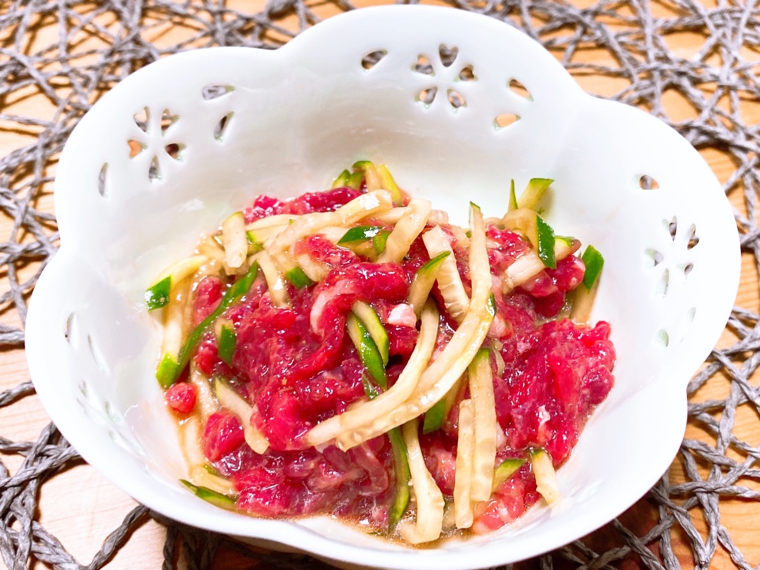 黄身を落としてユッケに!一口しか食べられなかったけど、千切りなので食べやすく、タレと絡んで最高!