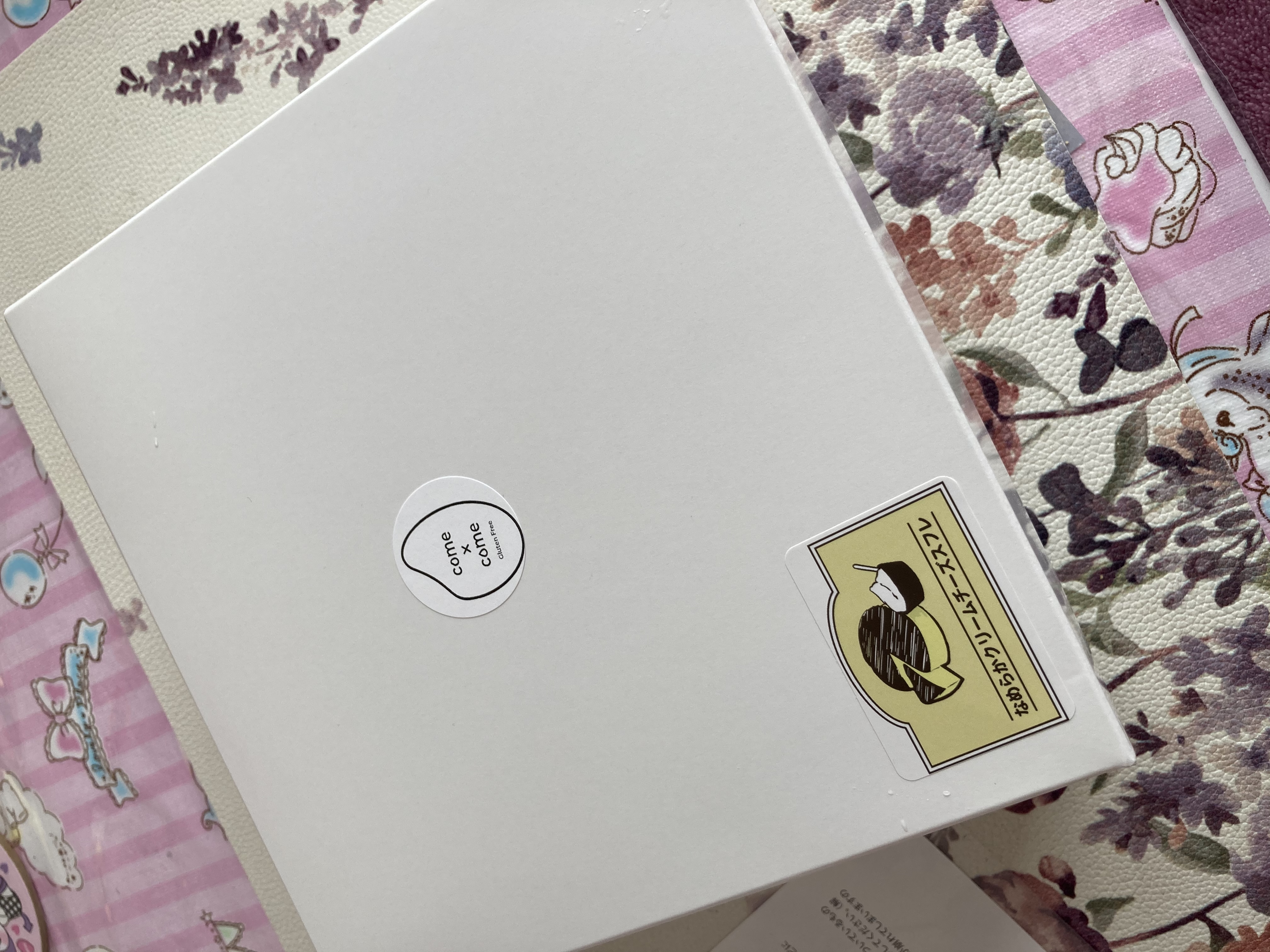 シンプルなパッケージ箱を開けるとcome×comeのお米の形のシールが。