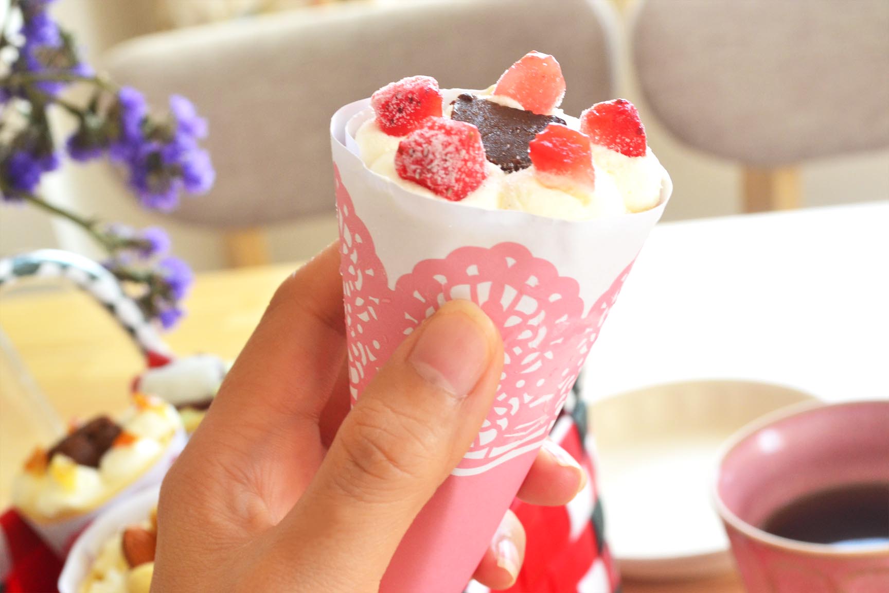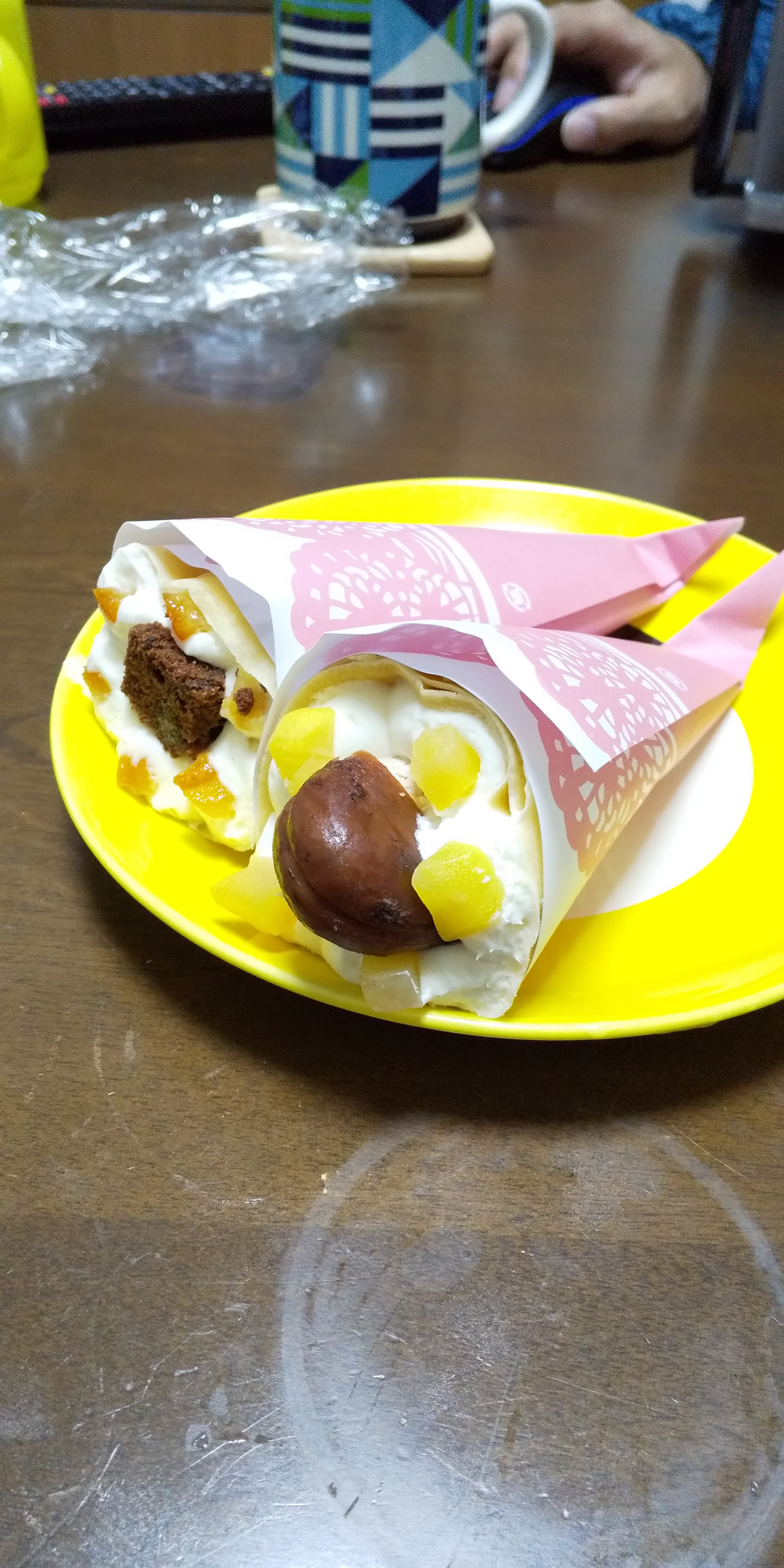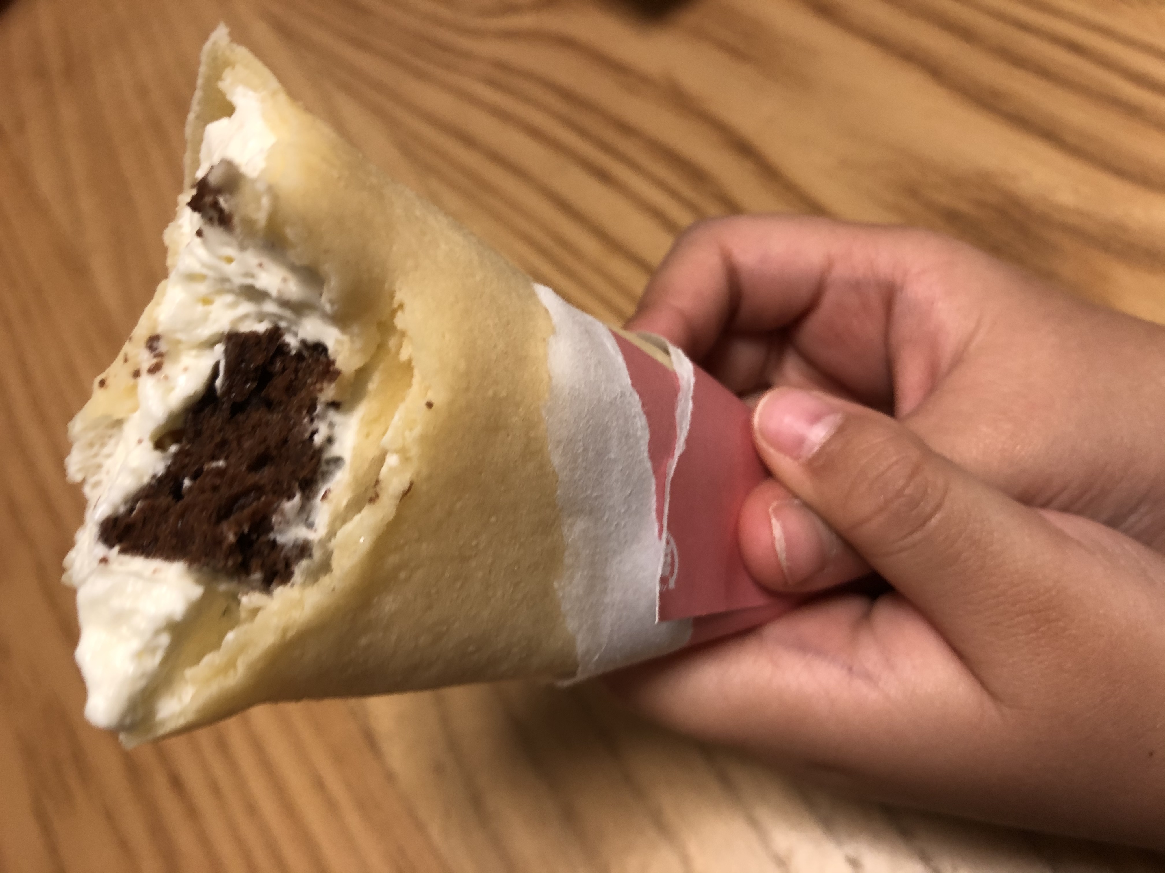 『アンヌクレープ』は、直径5cm高さ12cmの小さめサイズのクレープです。大きすぎないから最後まで美味しく食べられるし、子どもたちのおやつにもちょうどよかったです。