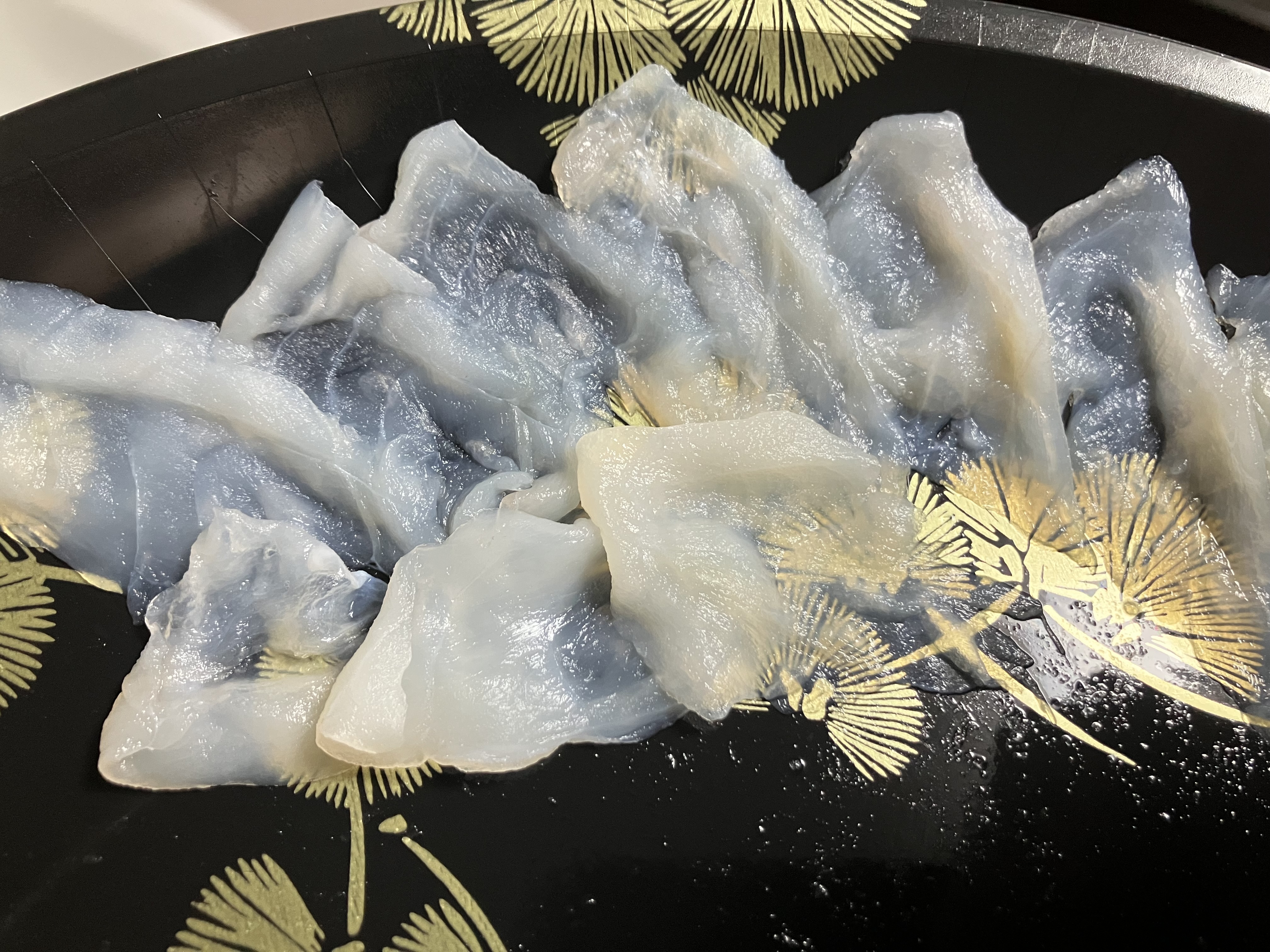 ヒレ酒用ふぐヒレはとても立派です。熱燗でふぐの旨み香りを堪能しながら、宅飲みを贅沢に楽しみました。